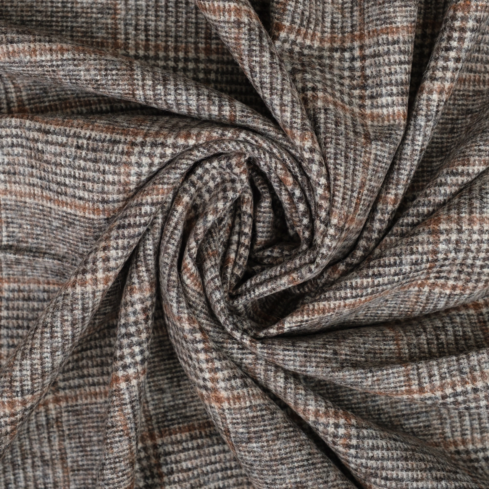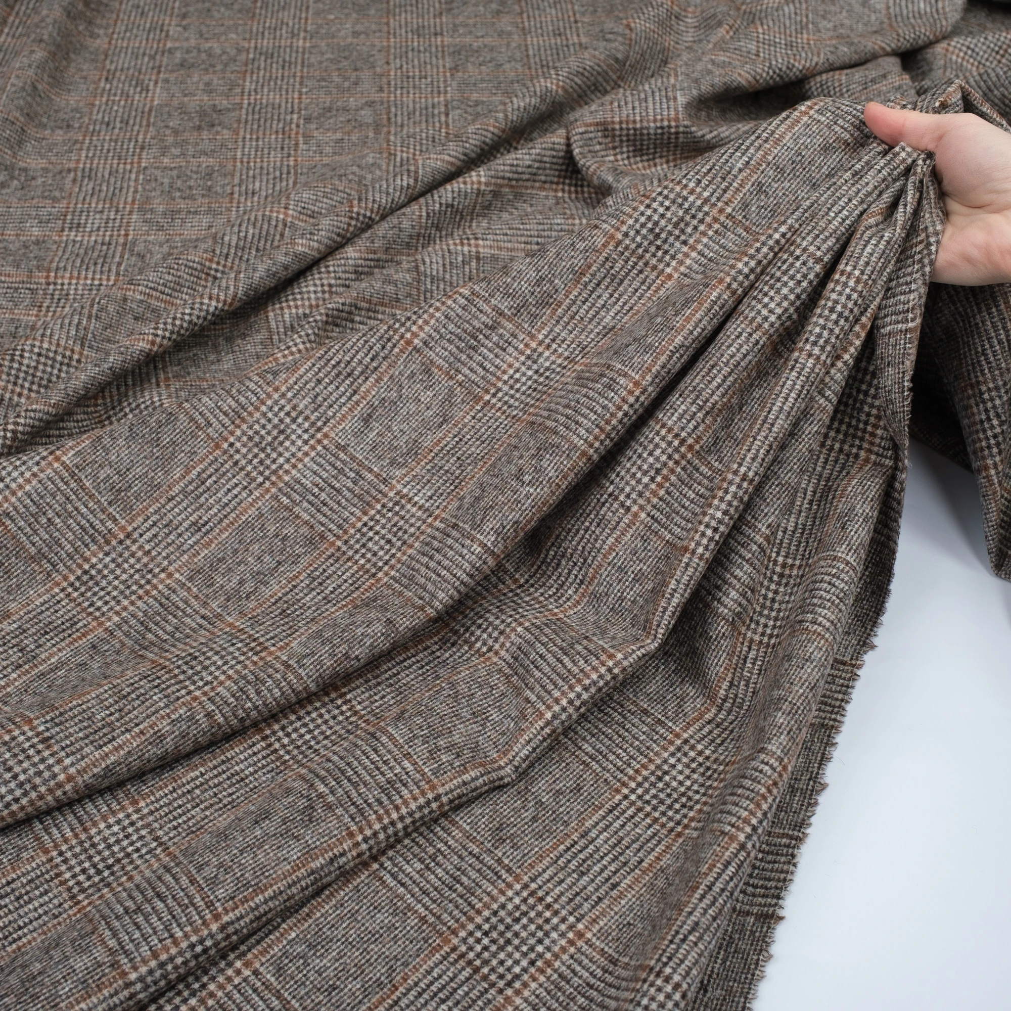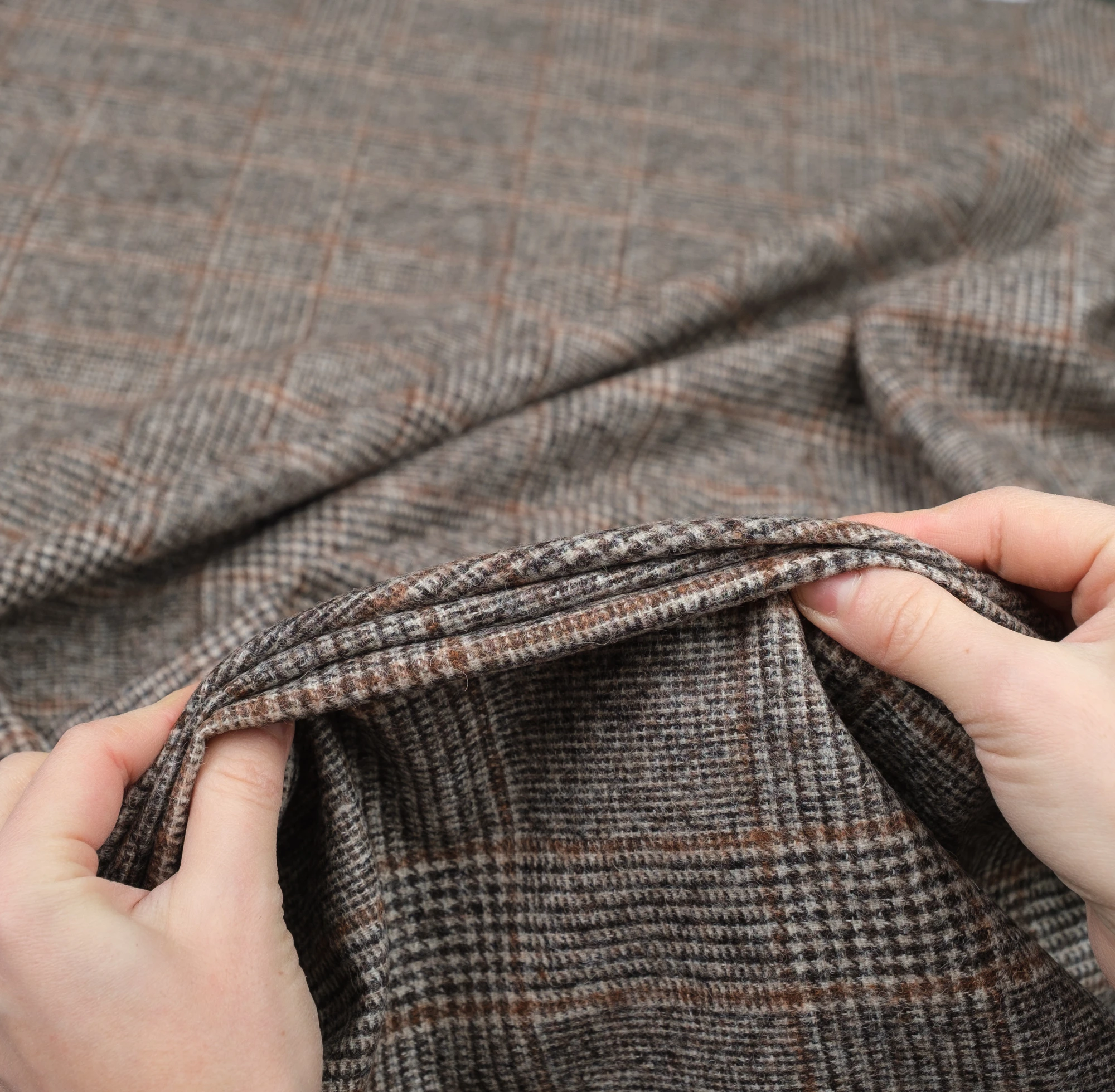 Elegancka włoska tkanina kostiumowo-płaszczowa z wzorem kraty w odcieniach beżu, brązu i rudej linii. Kostiumowa tkanina alpaka z wełną w kratkę jest jak piórko lekka i miękka. Klasyczna kratka na żakiet lub płaszczyk nie prześwituje oraz jest odporna na zagniecenia.
