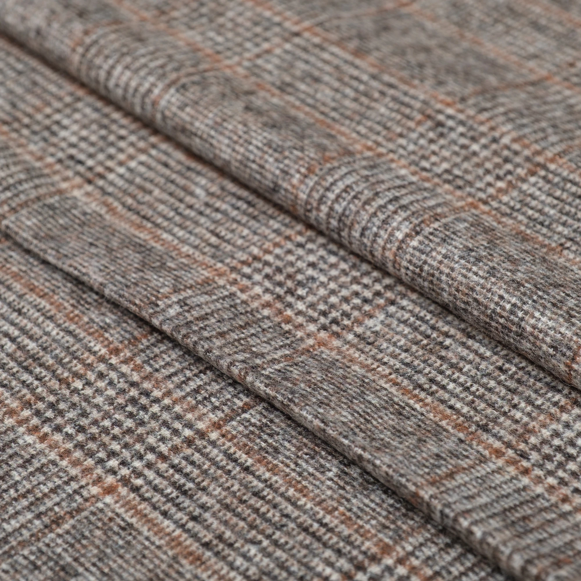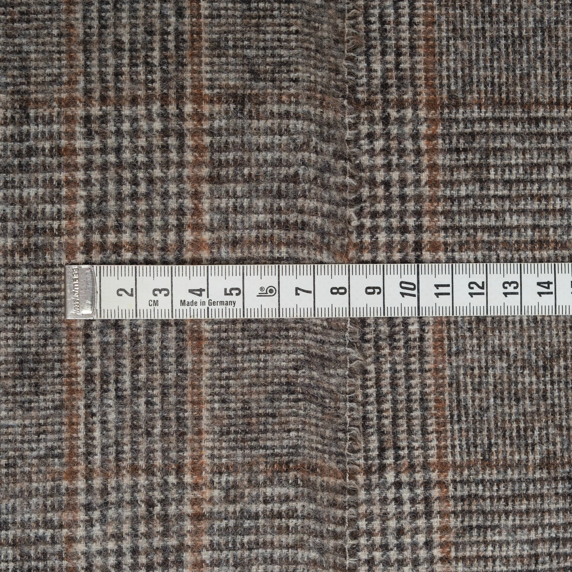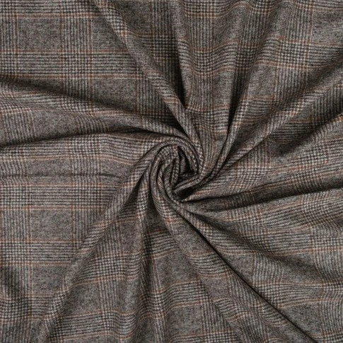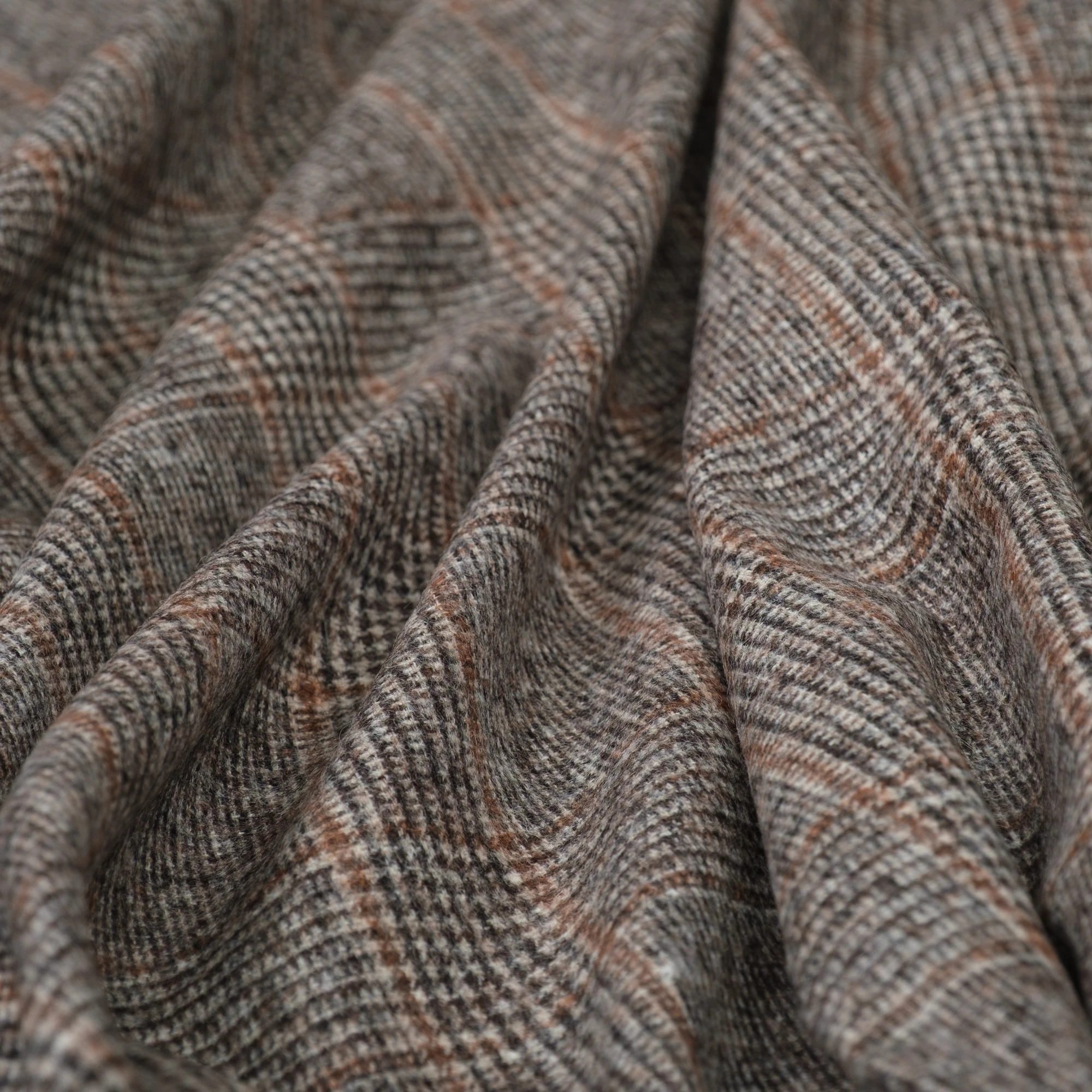 Elegancka włoska tkanina kostiumowo-płaszczowa z wzorem kraty w odcieniach beżu, brązu i rudej linii. Kostiumowa tkanina alpaka z wełną w kratkę jest jak piórko lekka i miękka. Klasyczna kratka na żakiet lub płaszczyk nie prześwituje oraz jest odporna na zagniecenia.