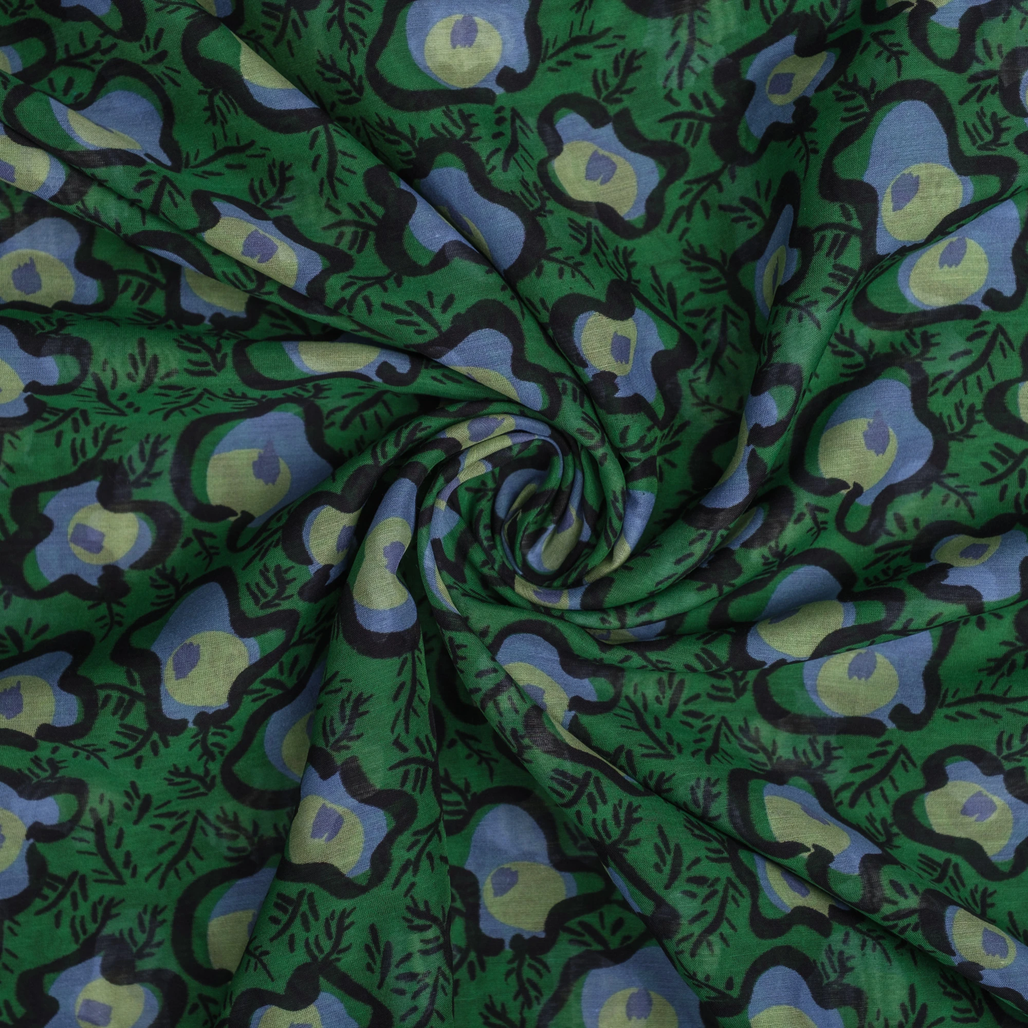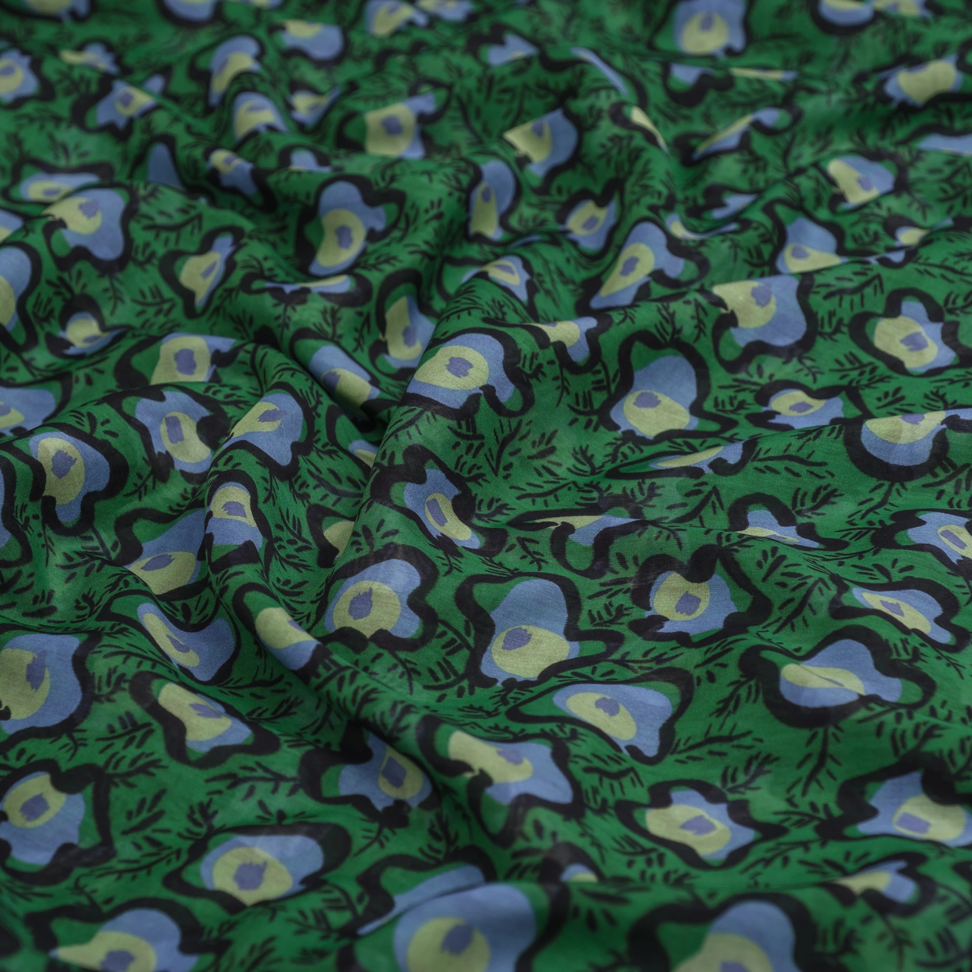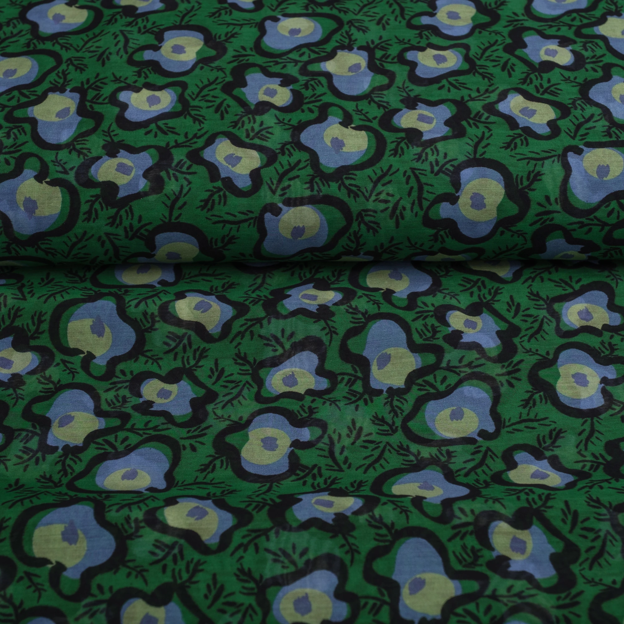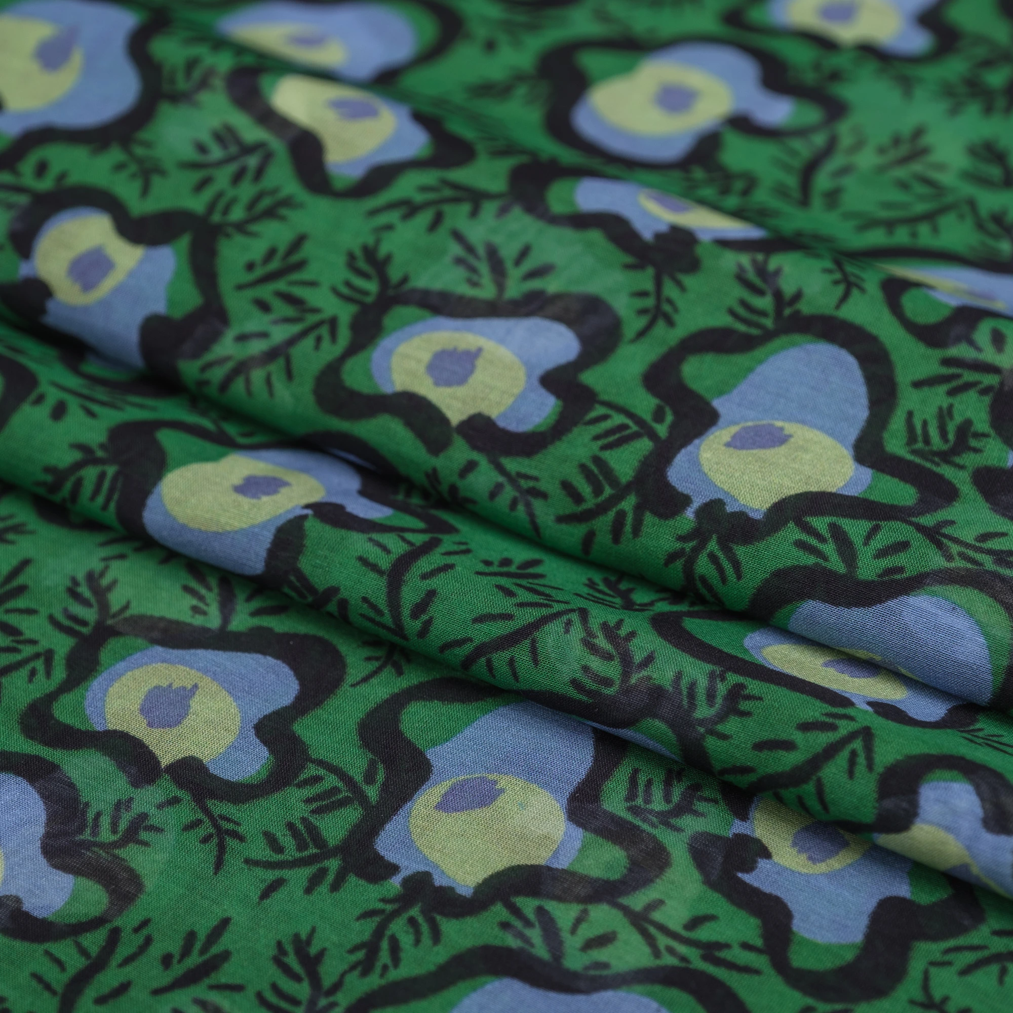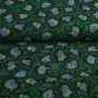 Na intensywnie zielonym tle widoczny jest wyrazisty, artystyczny wzór w odcieniach błękitu, limonki i czerni. Abstrakcyjne, organiczne formy przypominające stylizowane kwiaty i liście nadają tkaninie nowoczesnego, lekko retro charakteru.