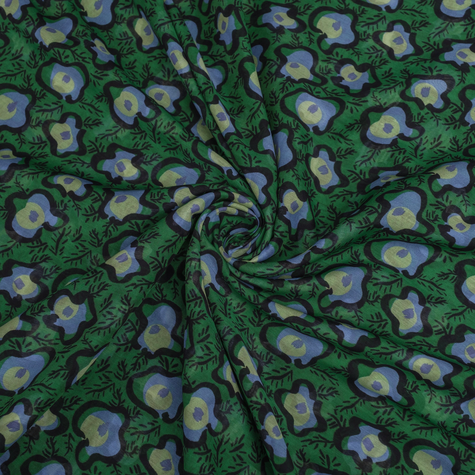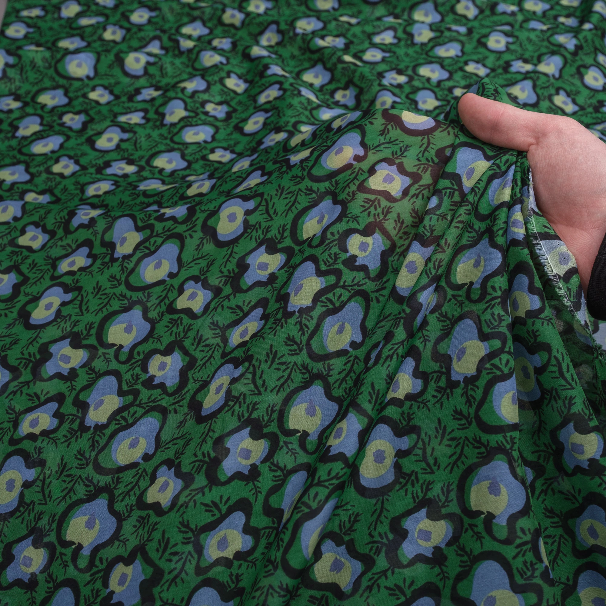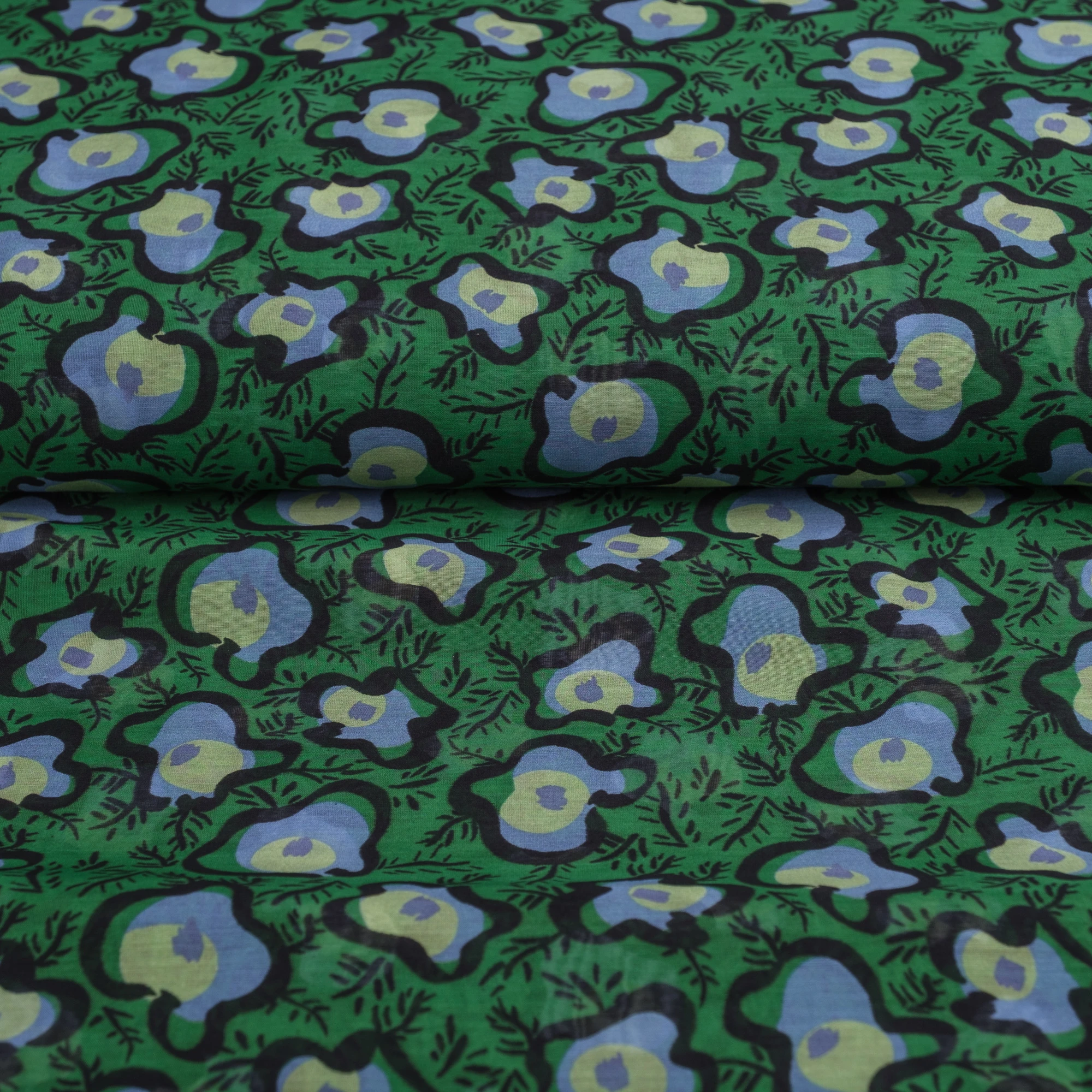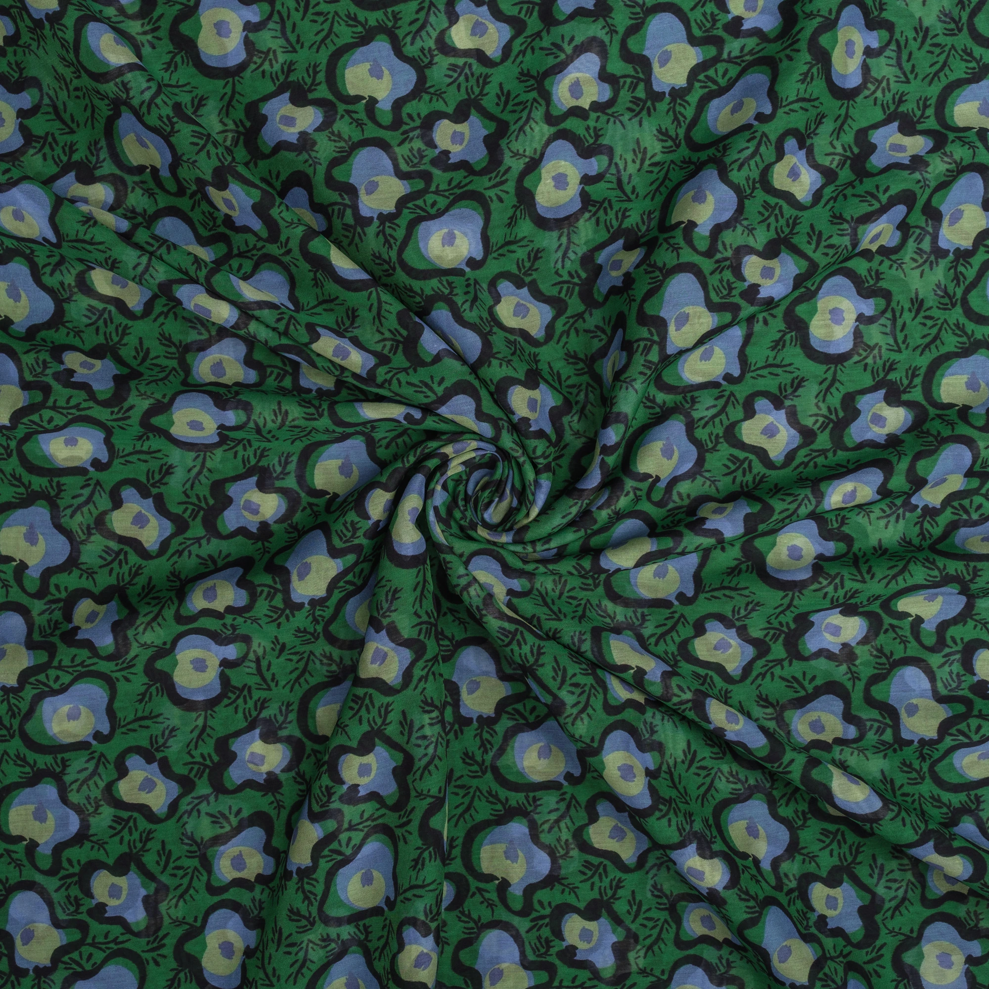 Na intensywnie zielonym tle widoczny jest wyrazisty, artystyczny wzór w odcieniach błękitu, limonki i czerni. Abstrakcyjne, organiczne formy przypominające stylizowane kwiaty i liście nadają tkaninie nowoczesnego, lekko retro charakteru.