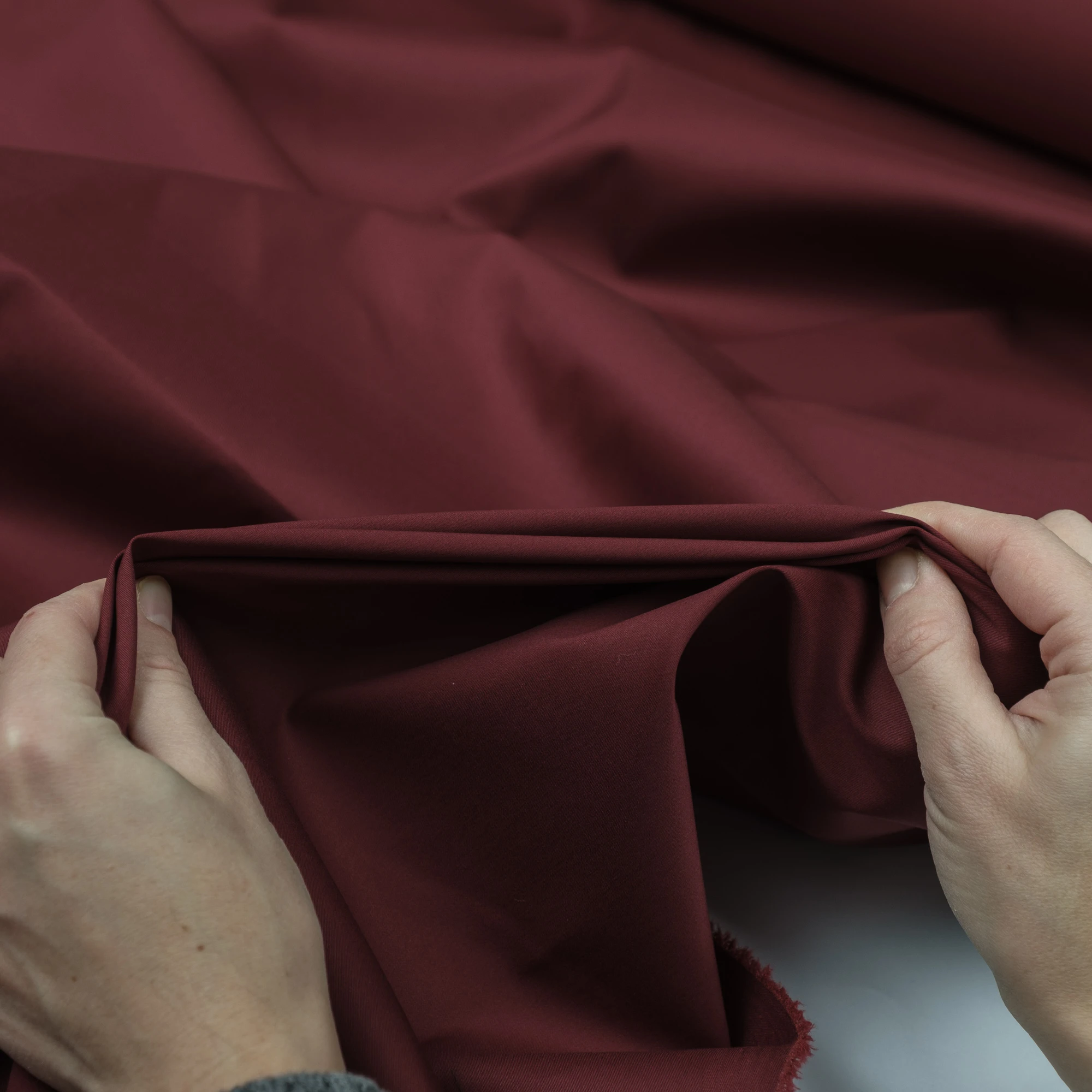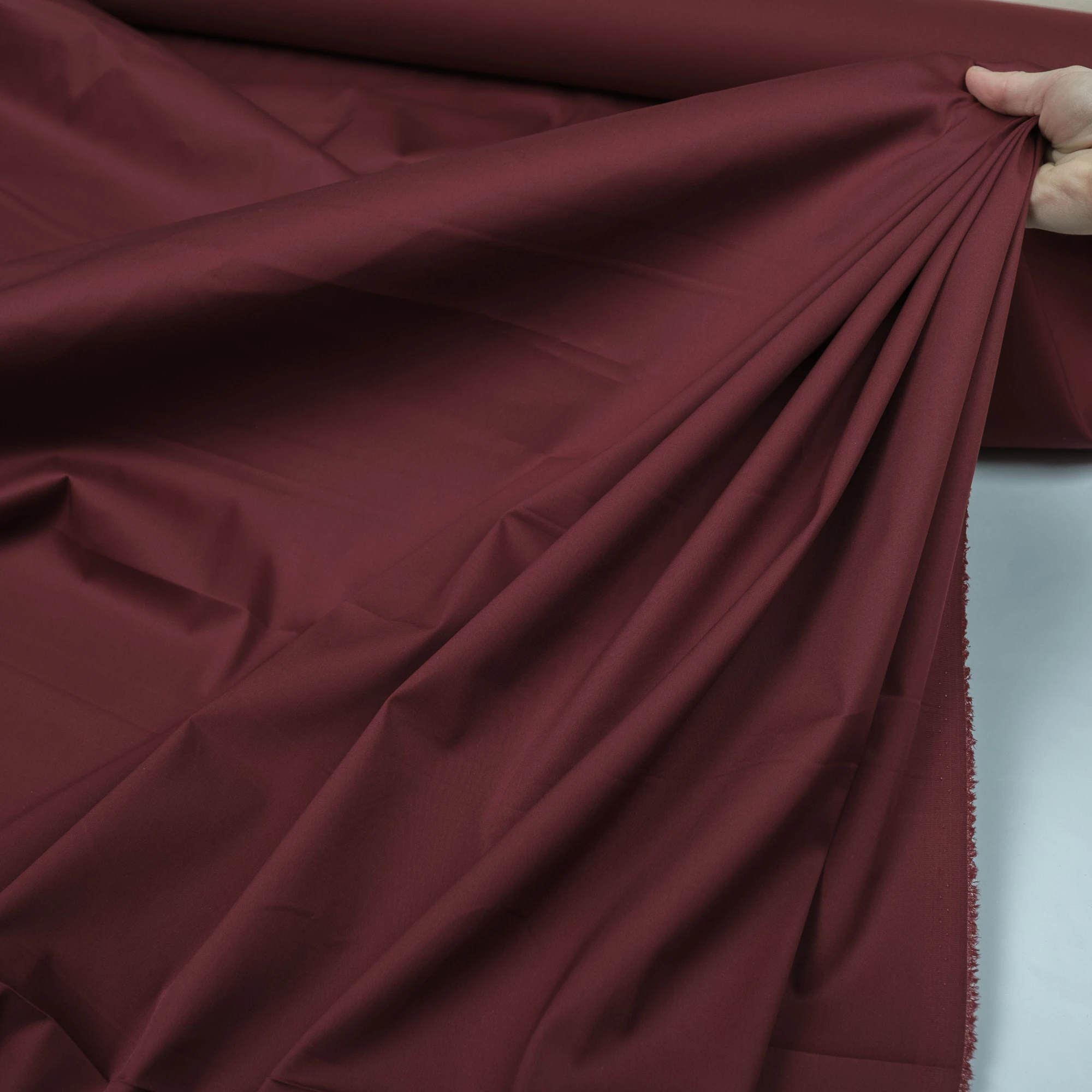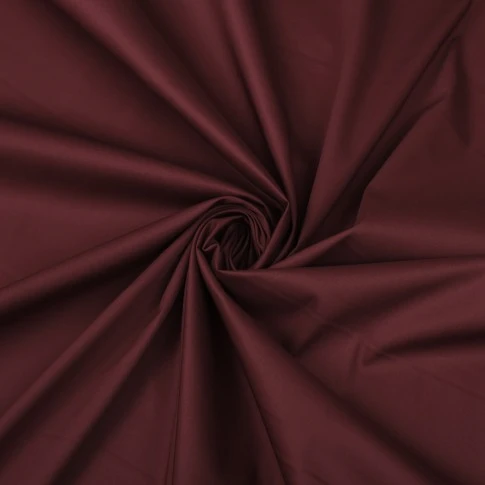 Uniwersalna włoska jednokolorowa tkanina bawełniana typu popelina z dodatkiem elastanu w kolorze bordowym to popularny materiał, który znajduje szerokie zastosowanie w krawiectwie. Bordowa popelina bawełniana jest nieprześwitujący i dzięki dodatkowi elastanu oraz nylonu doskonale się rozciąga, pozwalając na lepsze dopasowanie formy odzieży do sylwetki. Włoska cienka bawełna elastyczna jest plastyczna i dobrze trzyma formę odzieży. Bawełna koszulowa jest cienką, idealnie gładką tkaniną, która została wyprodukowana z zastosowaniem klasycznego, płóciennego splotu. Zaletą naszej bawełnianej tkaniny jest to, że ona mniej się gniecie odnośnie 100% bawełen.