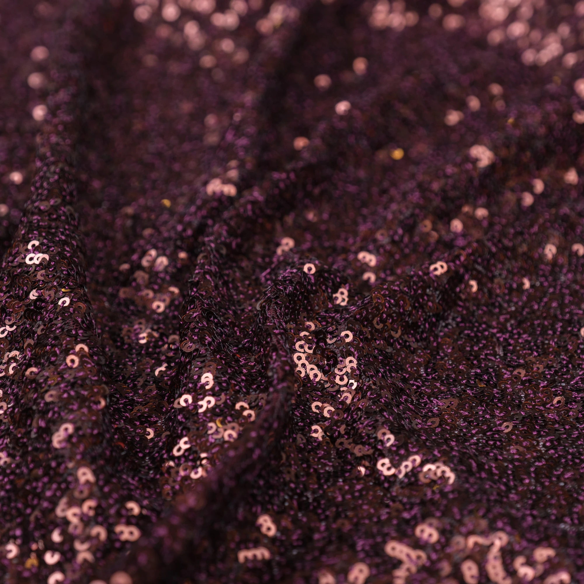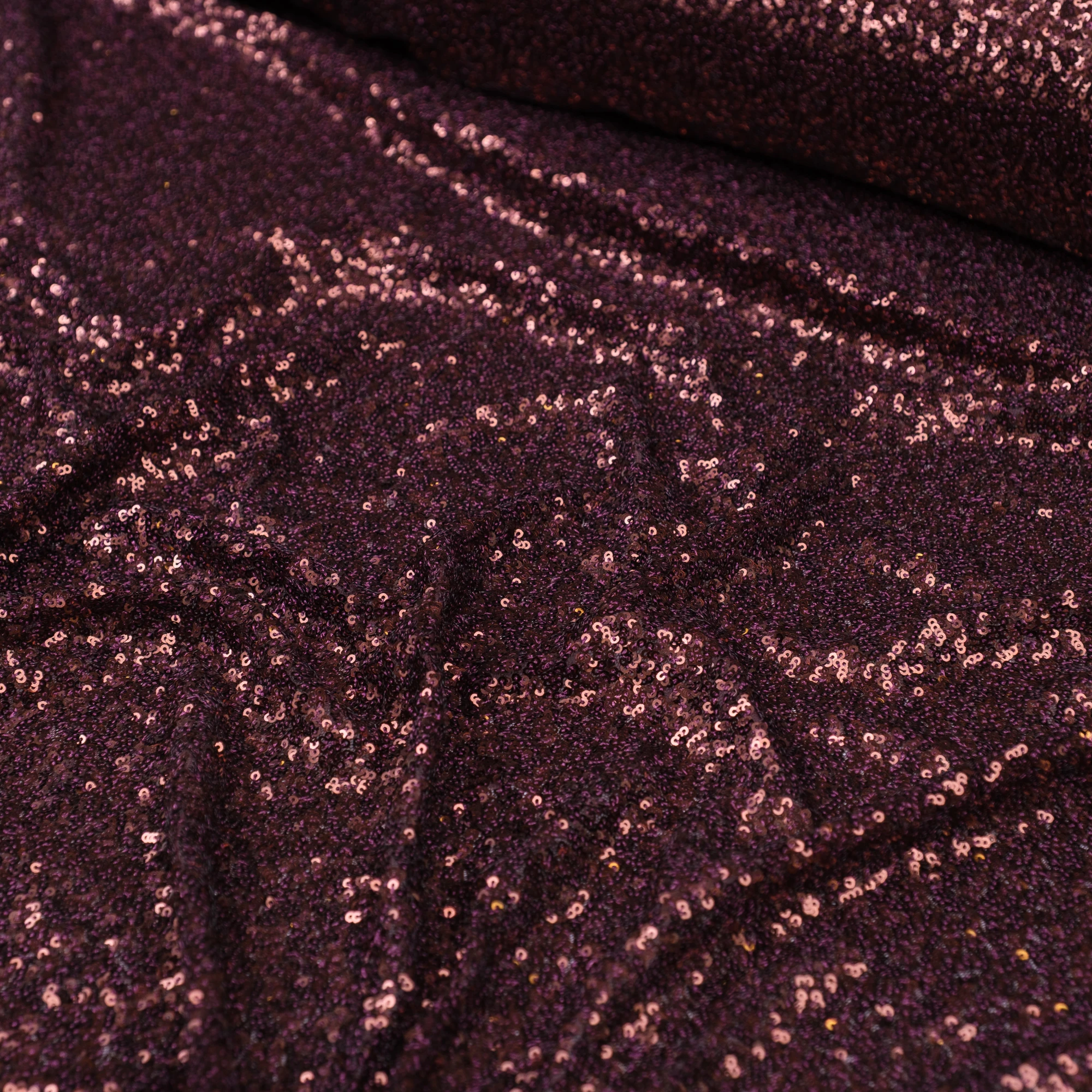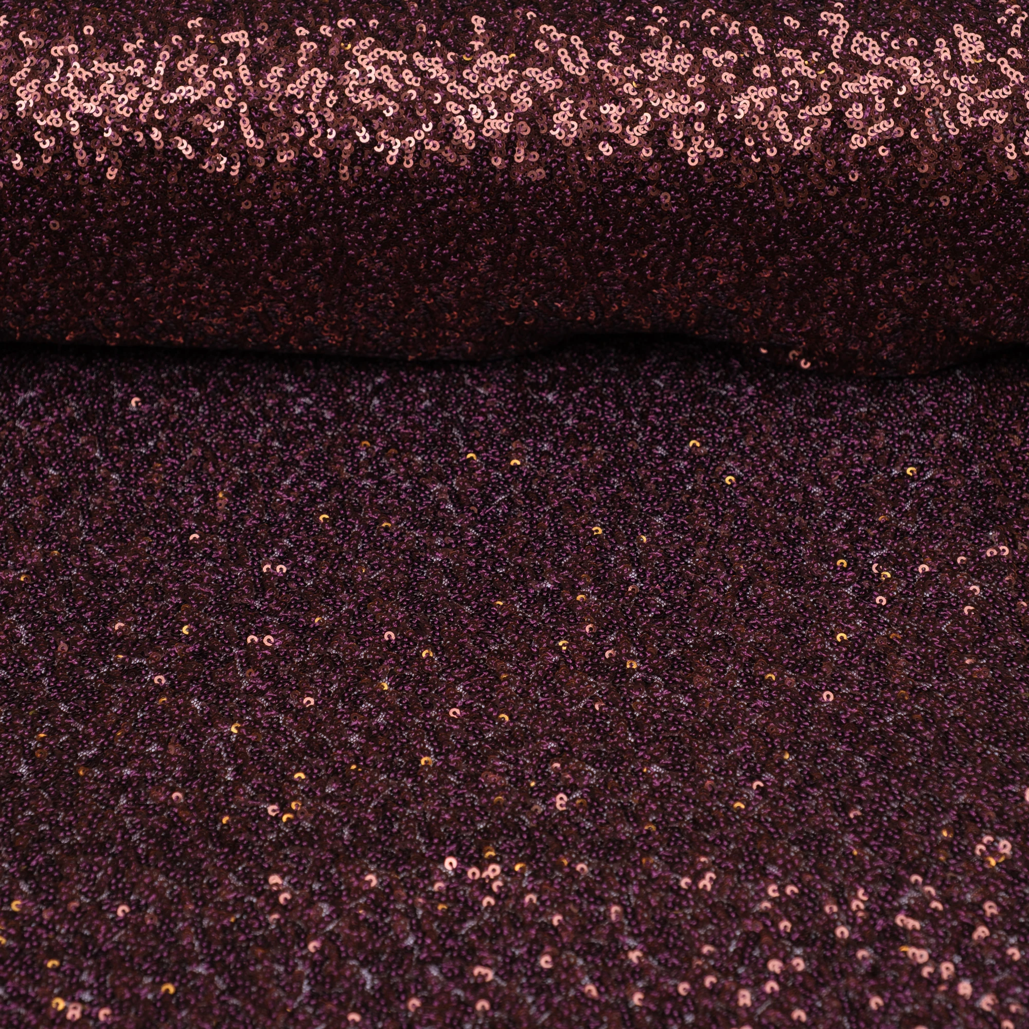 Ekskluzywna tkanina wieczorowa na elastycznej siatce, gęsto wyszywana drobnymi cekinami w kolorze bordowym. Powierzchnia pięknie odbija światło, tworząc efekt glamour idealny na wyjątkowe okazje.