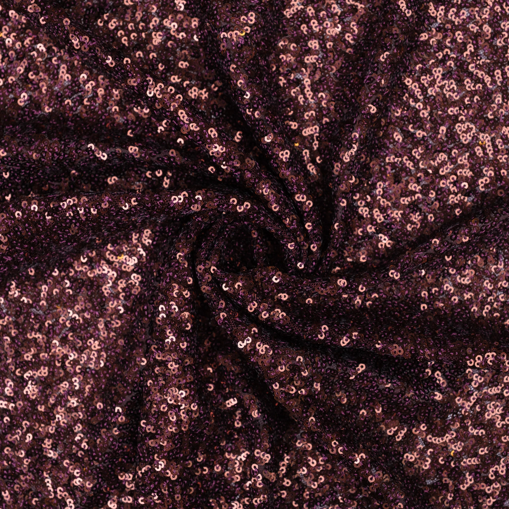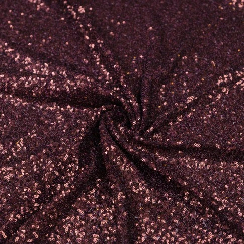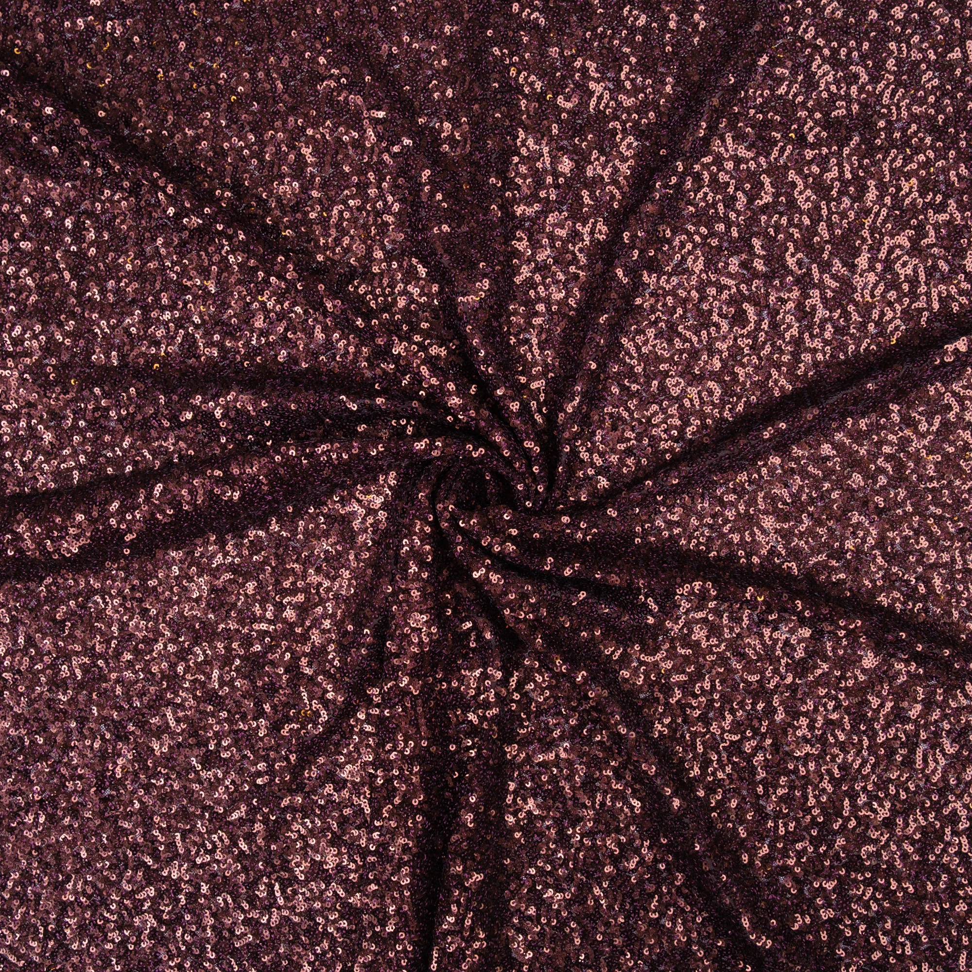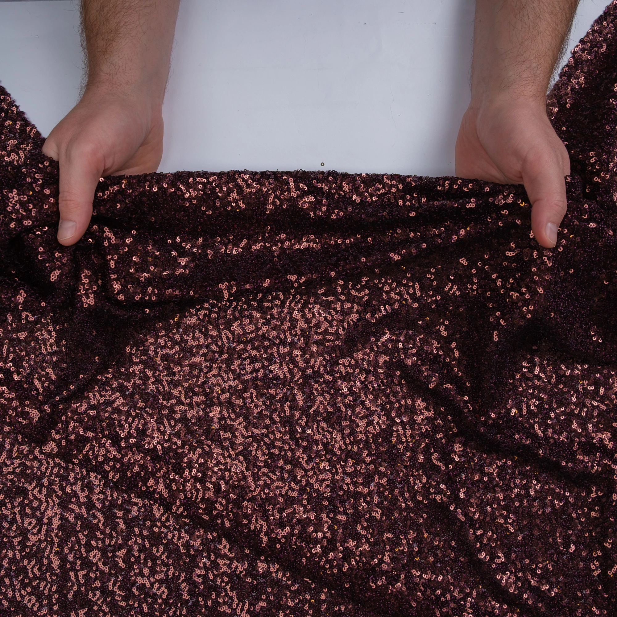 Ekskluzywna tkanina wieczorowa na elastycznej siatce, gęsto wyszywana drobnymi cekinami w kolorze bordowym. Powierzchnia pięknie odbija światło, tworząc efekt glamour idealny na wyjątkowe okazje.