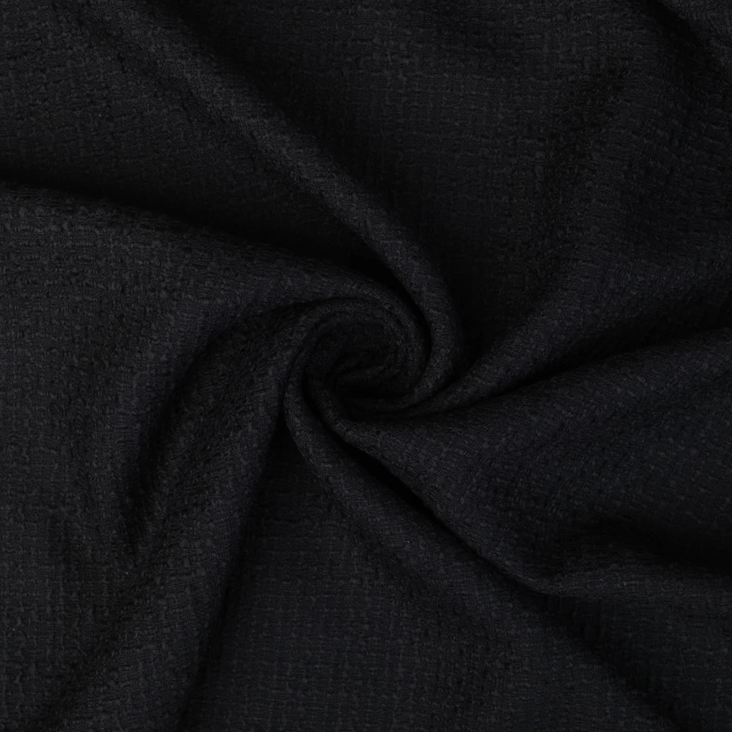 Włoska wysokogatunkowa chanelka wełniana w najbardziej klasycznym wariancie Noir to tkanina, która swoją nazwę zawdzięcza ikonie mody – Coco Chanel. Jednolity, uniwersalny kolor, wysokogatunkowa wełna i zjawiskowa faktura drobnej, strukturalnej kraty to cechy wyróżniające naszą tkaninę. Luksusowa tkanina posiada na krawędzi sygnaturę: „Alta Moda. Made in Italy”. Powstała z doskonałej jakości wełny, bez żadnych syntetycznych domieszek. Jest przyjemna dla skóry, pozwala jej oddychać i nie zatrzymuje wilgoci. Naturalne owcze przędze różnej grubości utkano za pomocą splotu płóciennego, uzyskując strukturalną fakturę. Włoska chanelka wełniana jest średniej grubości, miękka i przyjemna w dotyku. Plastycznie się układa, jest lejąca. Chanelkowe tkaniny są dość odporne na zagniecenia. Ze względu na luźny splot tkanina lekko przepuszcza światła. Pod naturalne tkaniny wełniane zalecamy zastosowanie przyjaznych dla skóry podszewek – jedwabnych lub wiskozowych. Tkanina elegancko jednostronnie wykończona, matowa. Od spodu nieco gładsza.