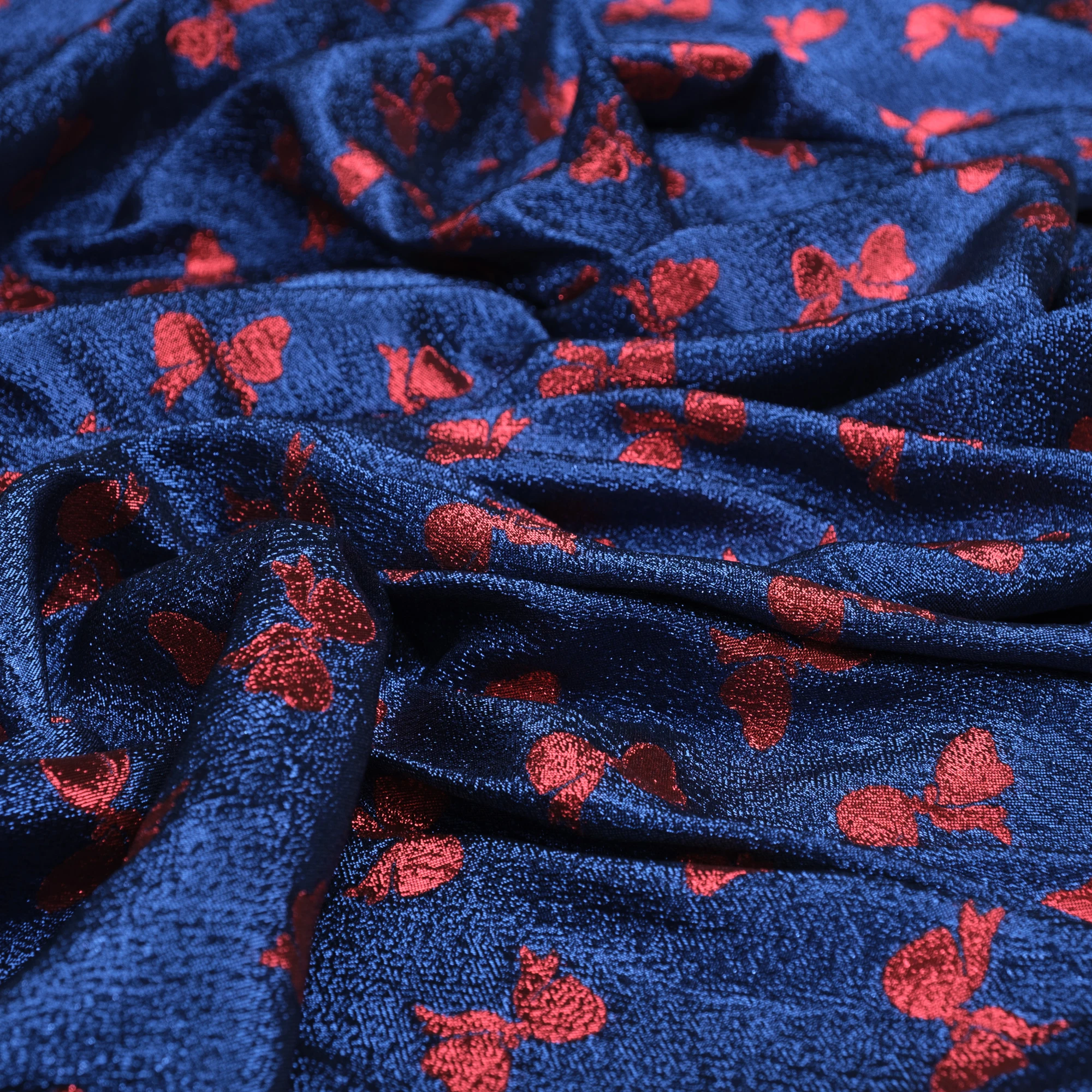 Włoski jedwab klasy Premium. Jedwab cechuje się niespotykaną lekkością i zwiewnością i jest tkaniną bardzo cienką. W dotyku jest raczej szorstki, z mocnym lureksowym połyskiem. Luksusowa tkanina plastycznie się układa, umożliwiając uszycie kreacji z ozdobami w postaci falban i marszczeń.