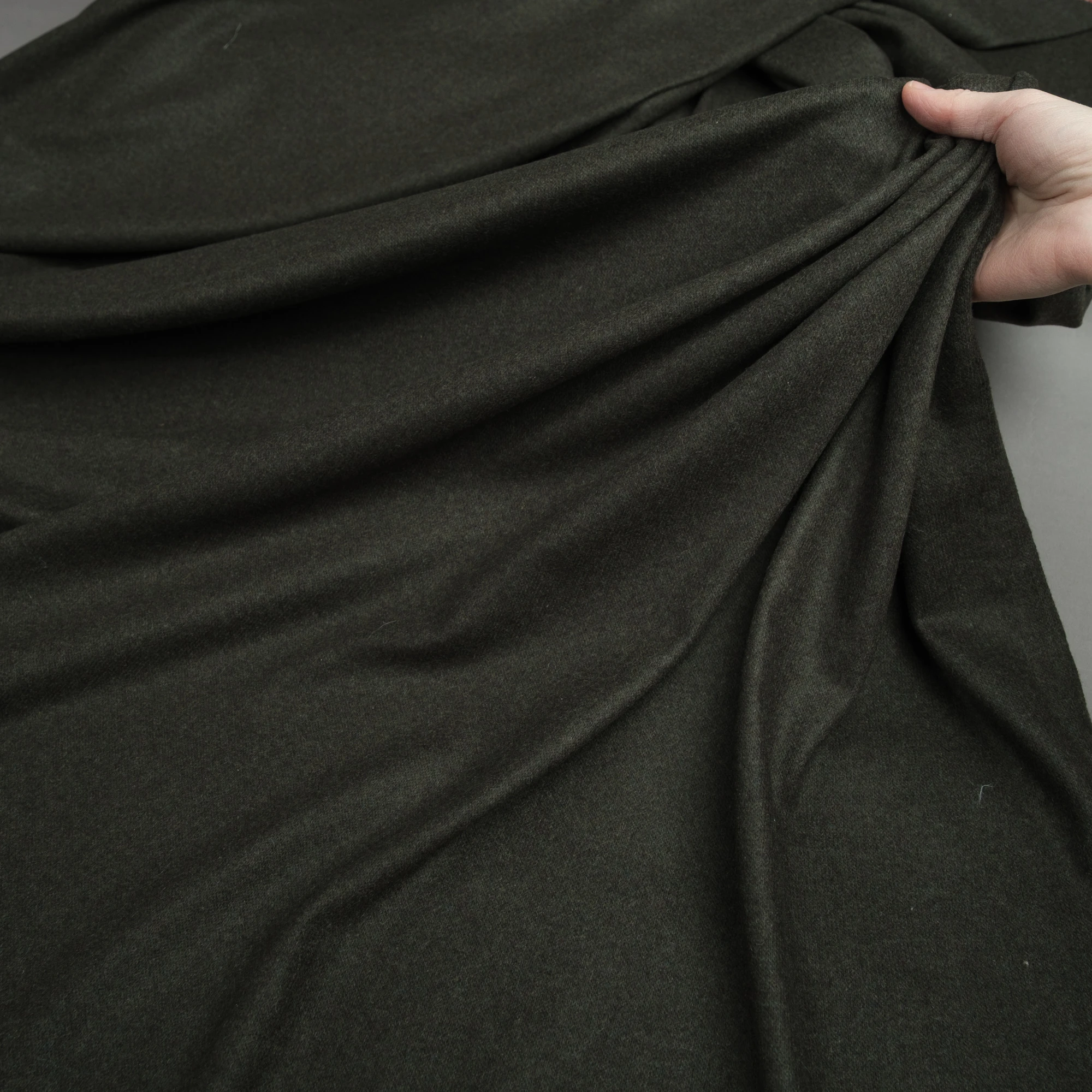 Luksusowa, niezwykle miękka dzianina wykonana w 100% z naturalnego kaszmiru w eleganckim, przygaszonym odcieniu khaki. Materiał zachwyca subtelną, lekko melanżową strukturą oraz delikatnym, szlachetnym meszkiem typowym dla wysokogatunkowego włókna kaszmirowego.
