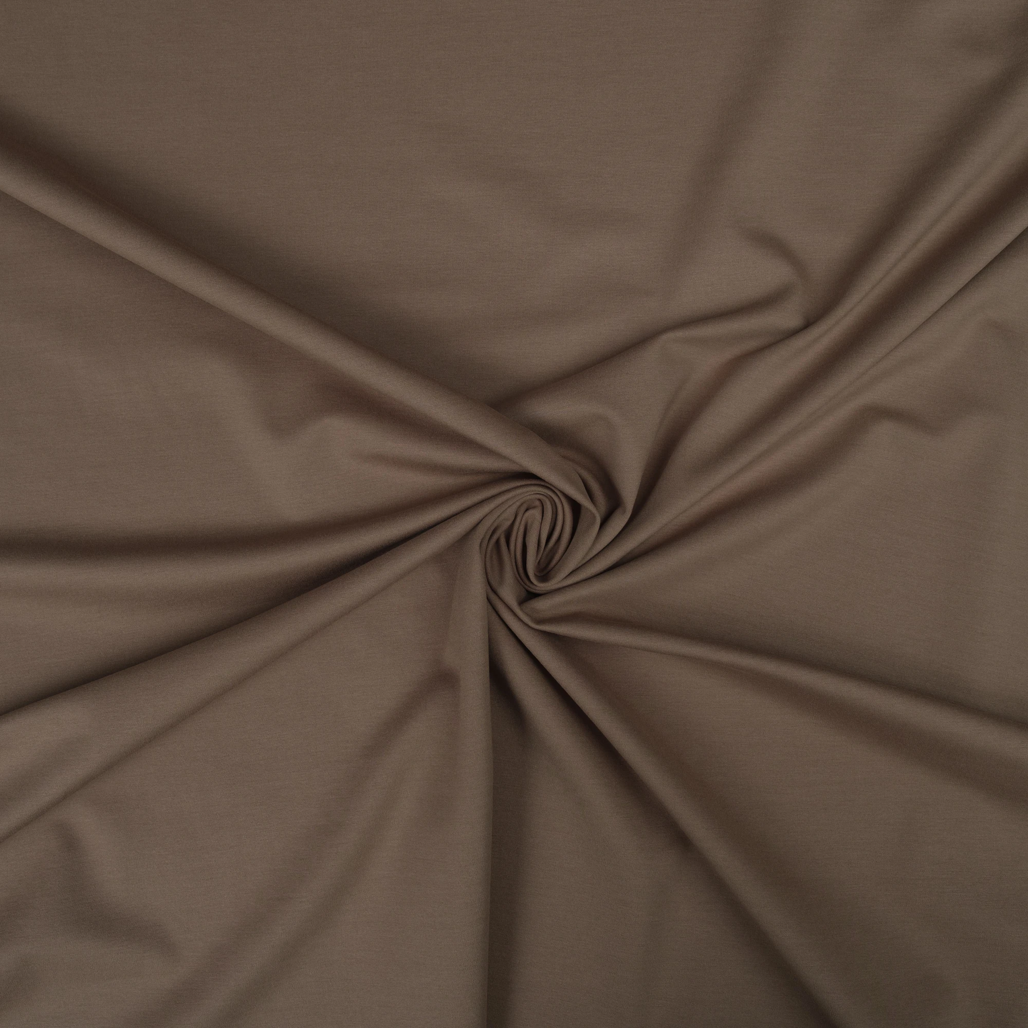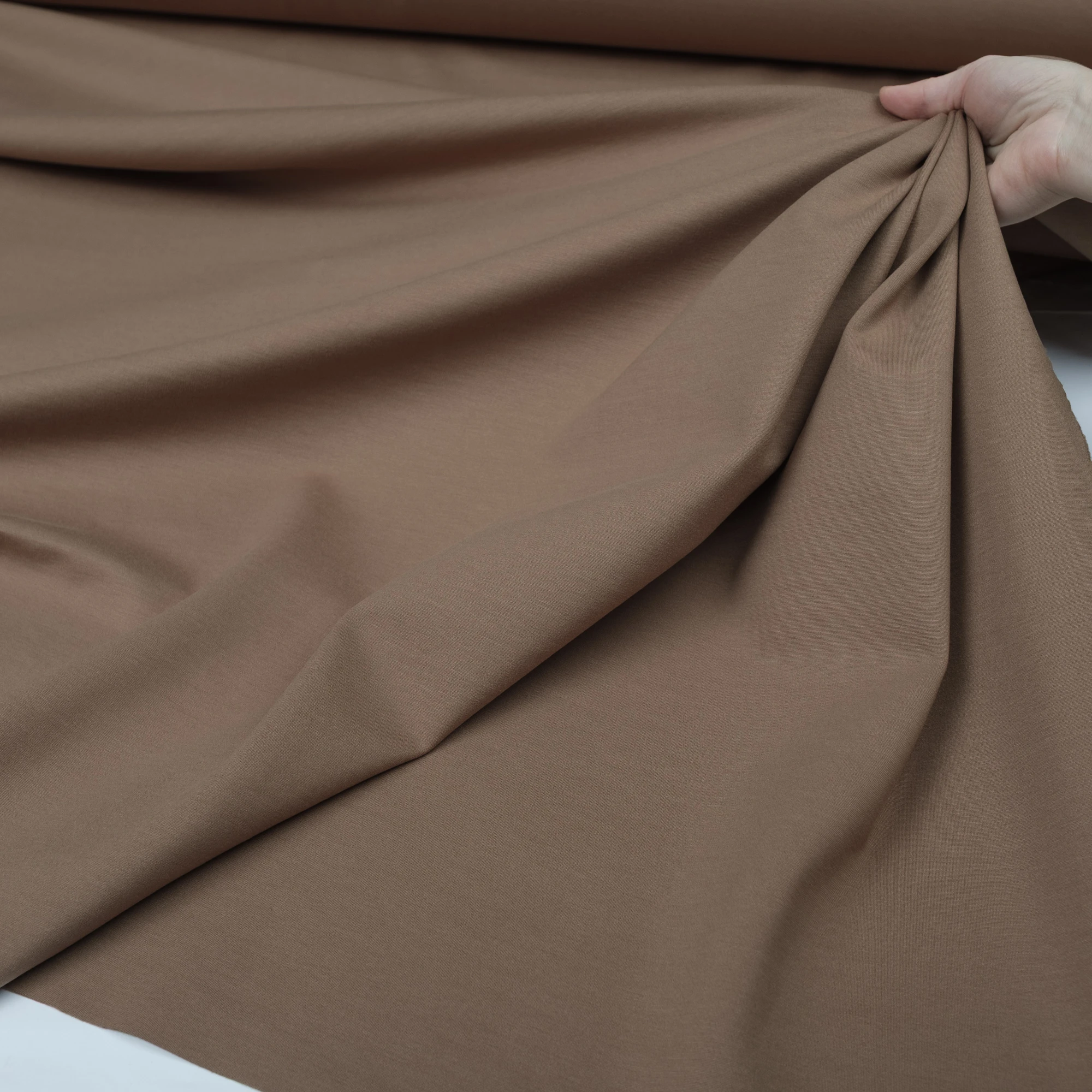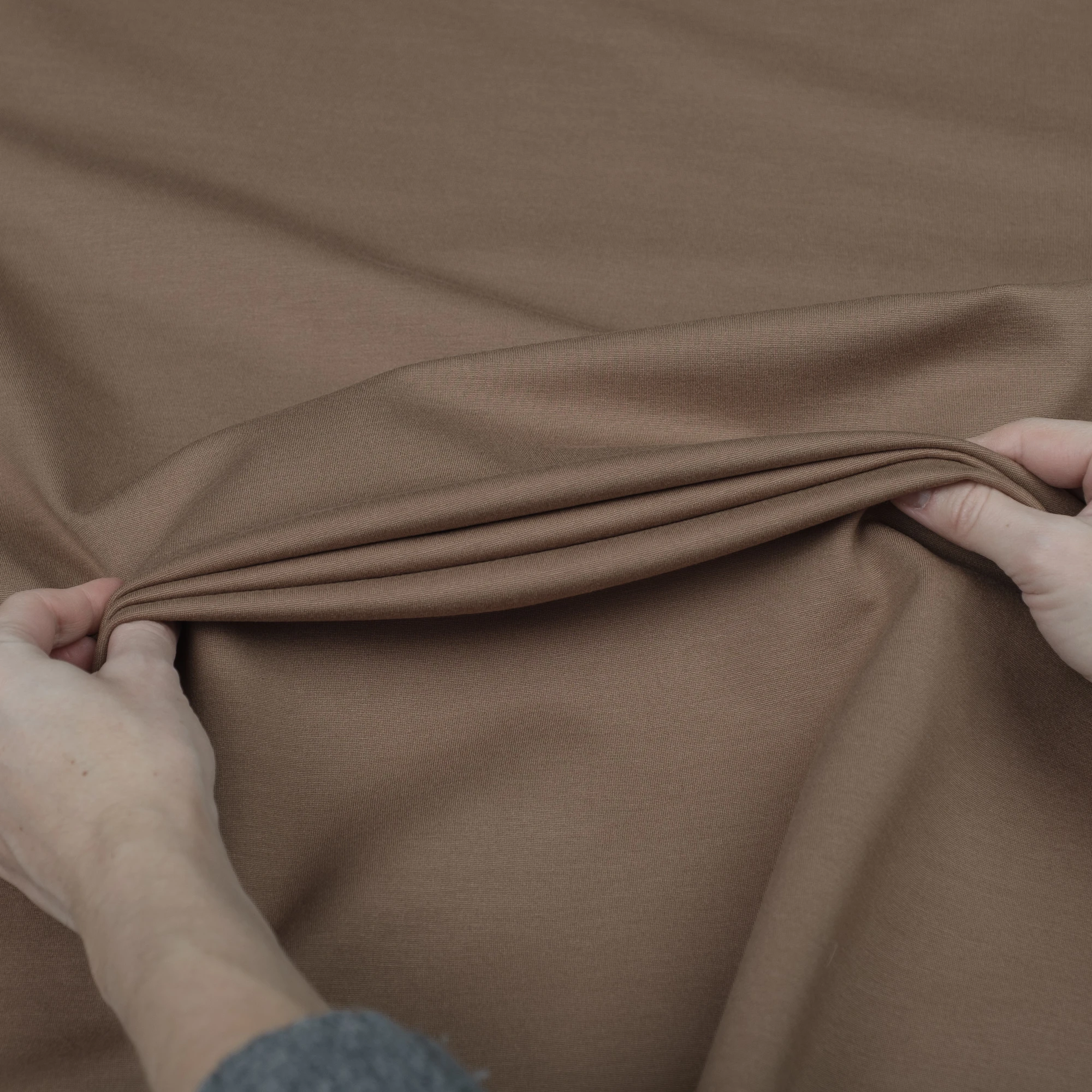 Elegancka włoska dzianina Punto Milano w odcieniu karmelowego brązu to wysokogatunkowy materiał wiskozowy, ceniony za swoją miękkość, elastyczność i trwałość. Gęsto tkana struktura sprawia, że dzianina zachowuje się jak tkanina, a jednocześnie pozostaje sprężysta i komfortowa w noszeniu.