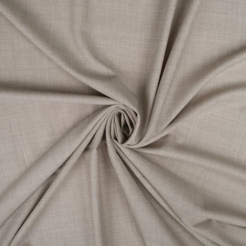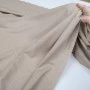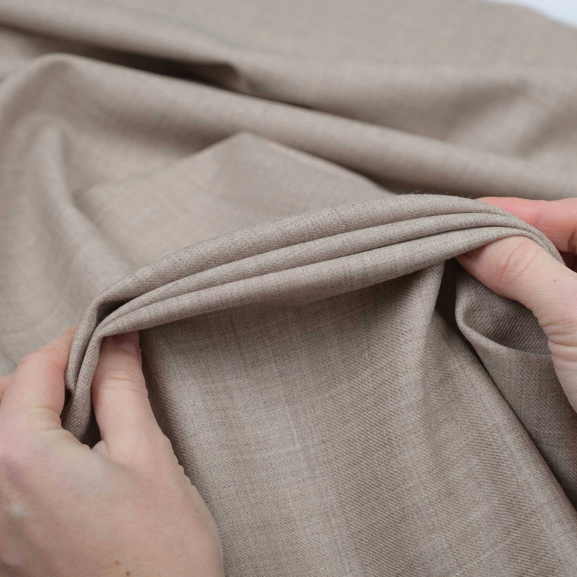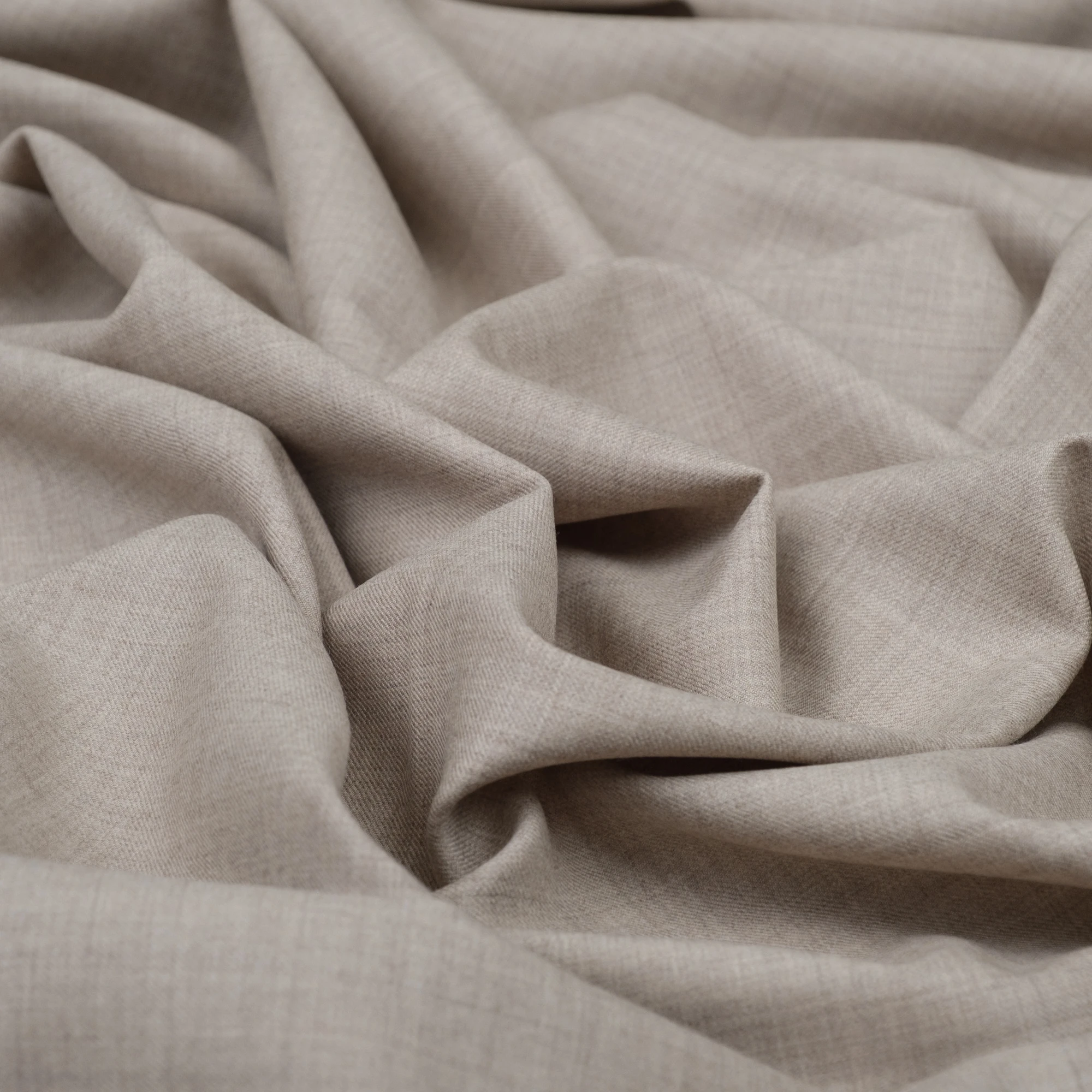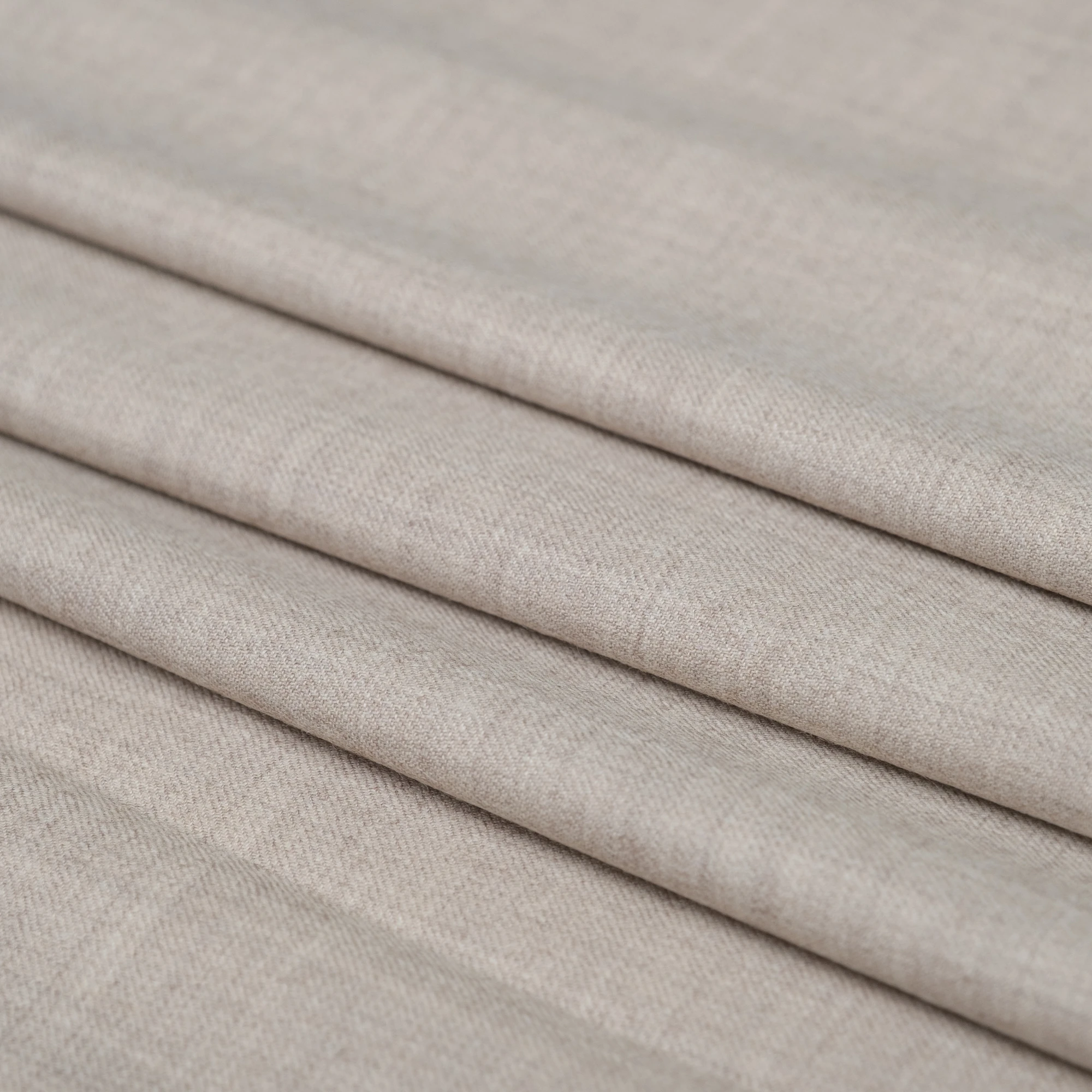Miękka flanela z wełny z dodatkiem elastanu w kolorze beżowym to luksusowa, włoska tkanina idealna na chłodne dni. Dzięki naturalnym właściwościom termicznym i oddychającym, doskonale sprawdzi się na żakiety, sukienki, spodnie lub spódnicy. Materiał jest sprężysty, odporny na zagniecenia i delikatny w dotyku, co zapewnia komfort noszenia. Flanela ma subtelną, drapaną powierzchnię, która dodaje jej wyjątkowej miękkości i elegancji.