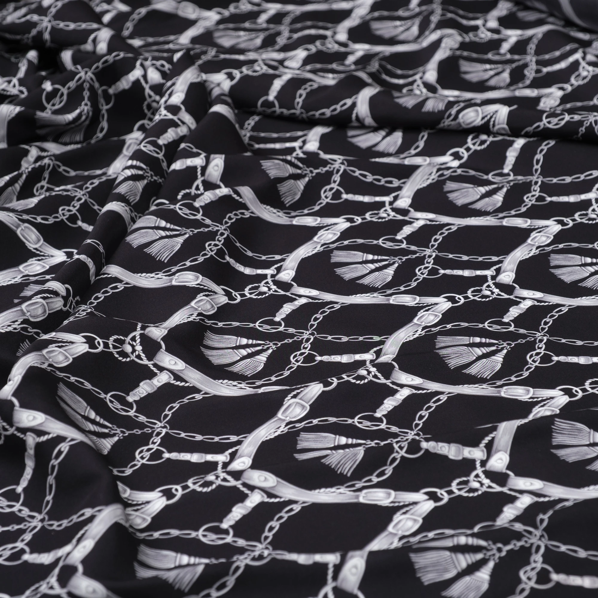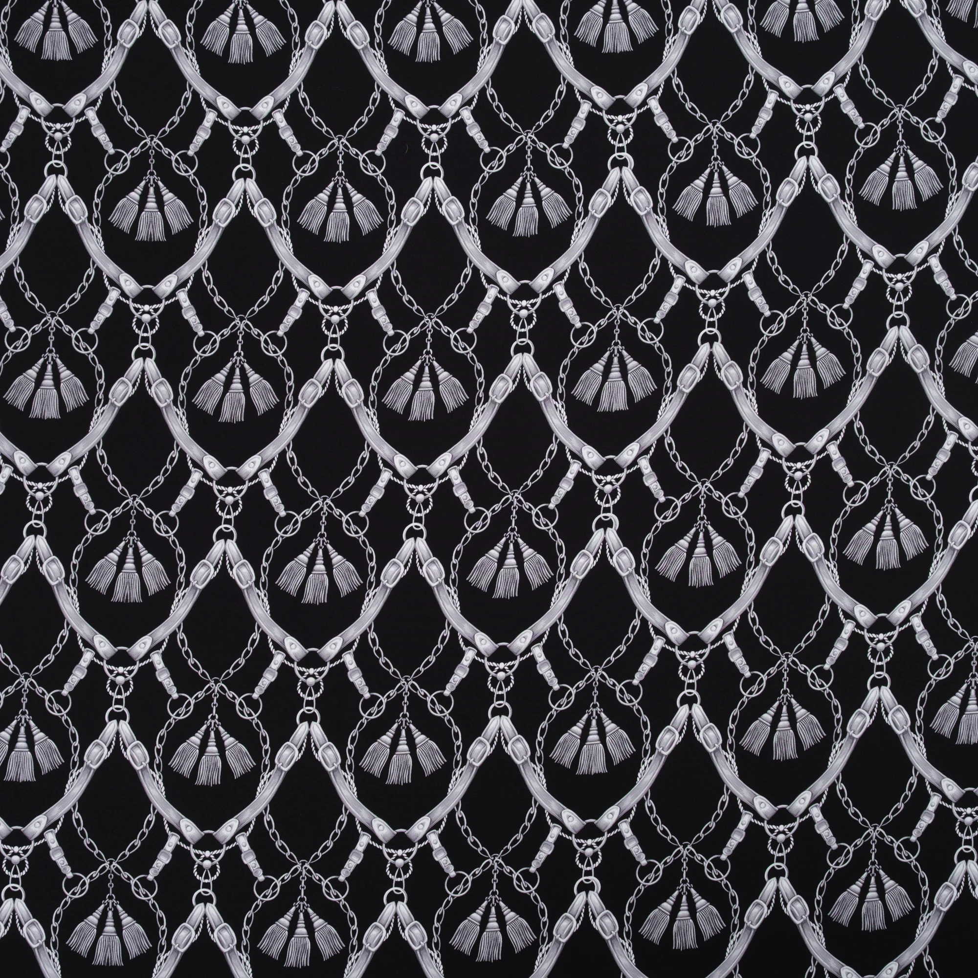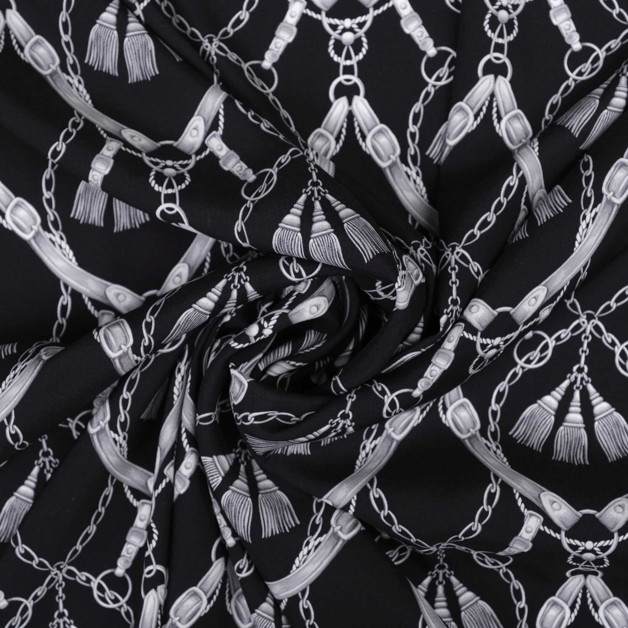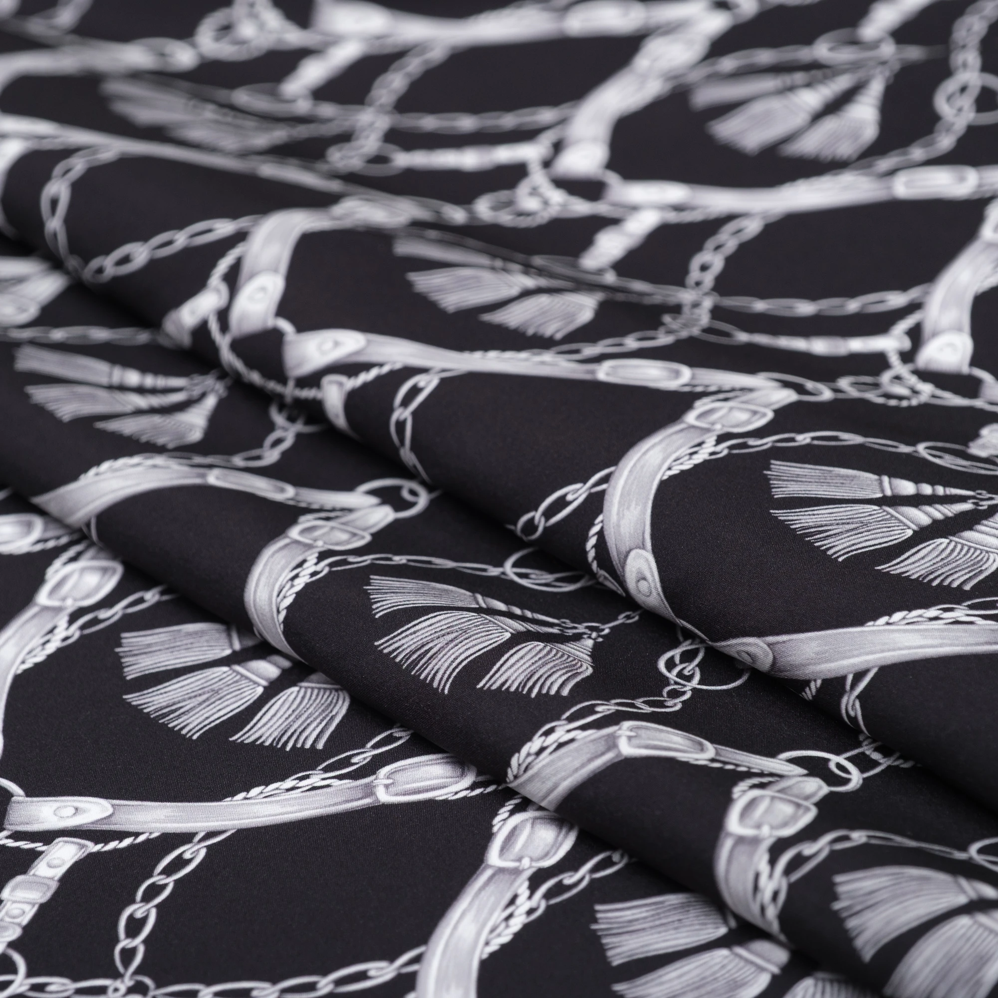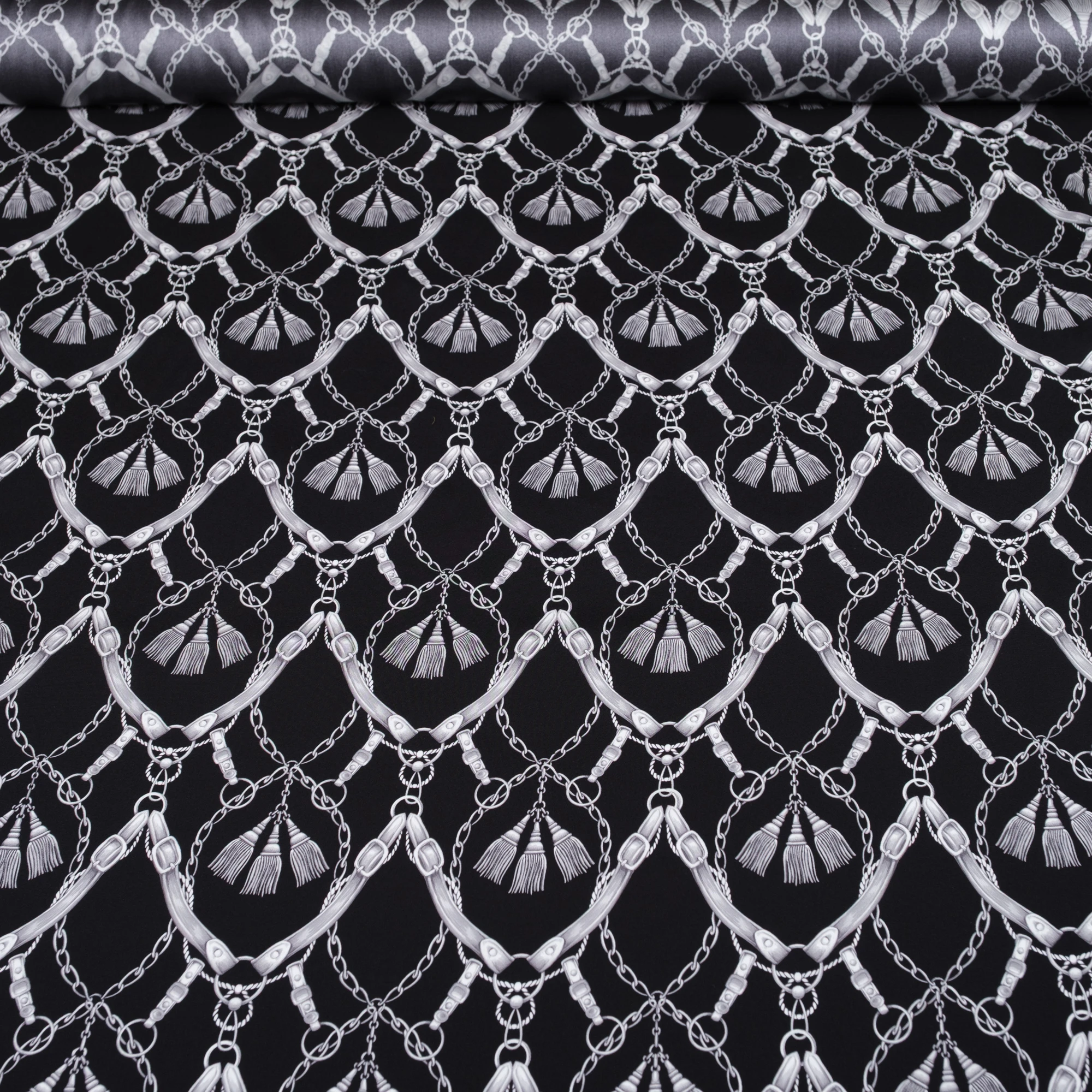 Wyjątkowy jedwab elastyczny w eleganckim, klasycznym wydaniu – czarna satyna ozdobiona białym markowym wzorem łańcuchów i chwostów na matowej stronie. To luksusowa tkanina jedwabna z Włoch, która zachwyca połyskiem, miękkością i płynnym układem. Dzięki dodatku elastanu, materiał delikatnie się rozciąga, co zapewnia idealne dopasowanie i komfort noszenia.