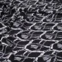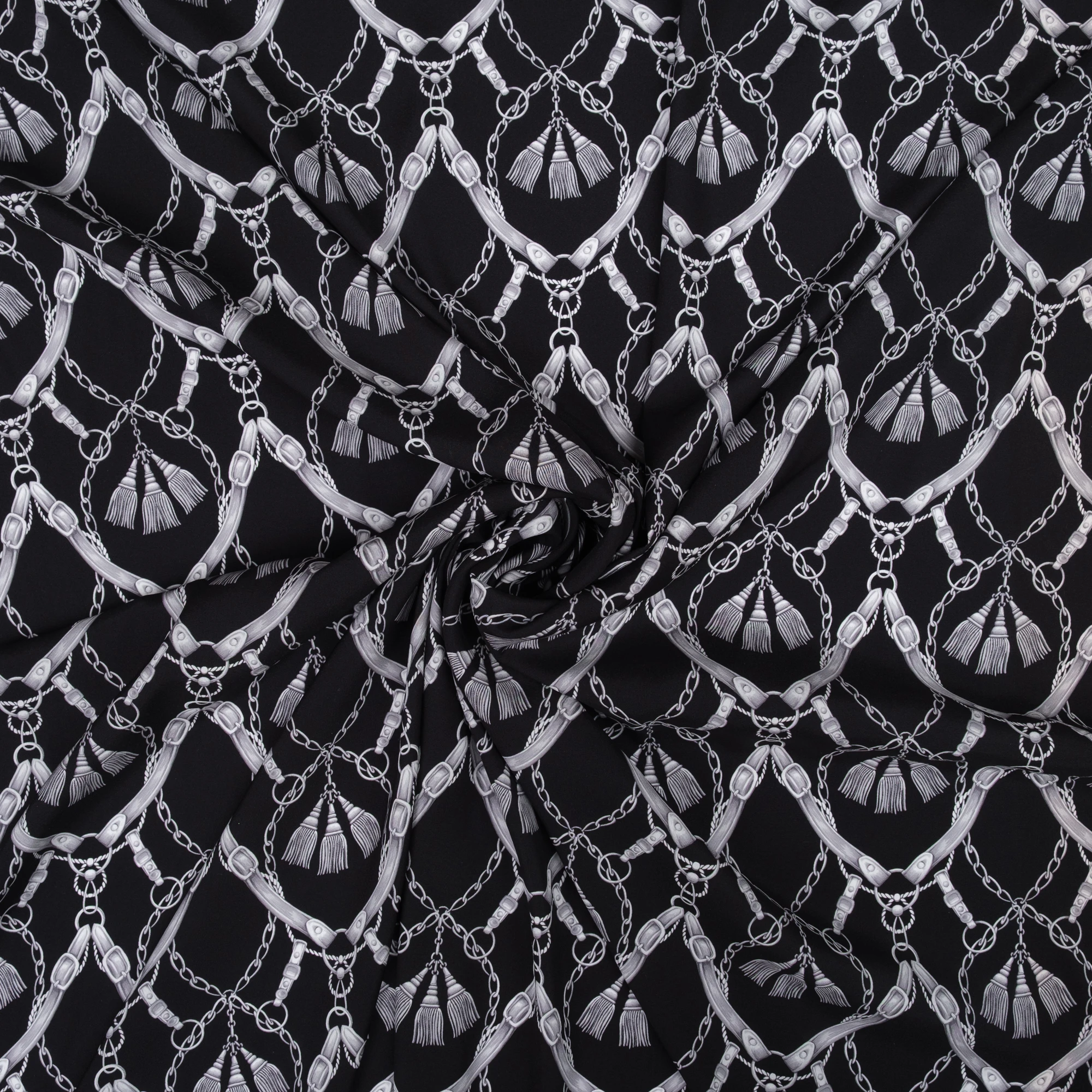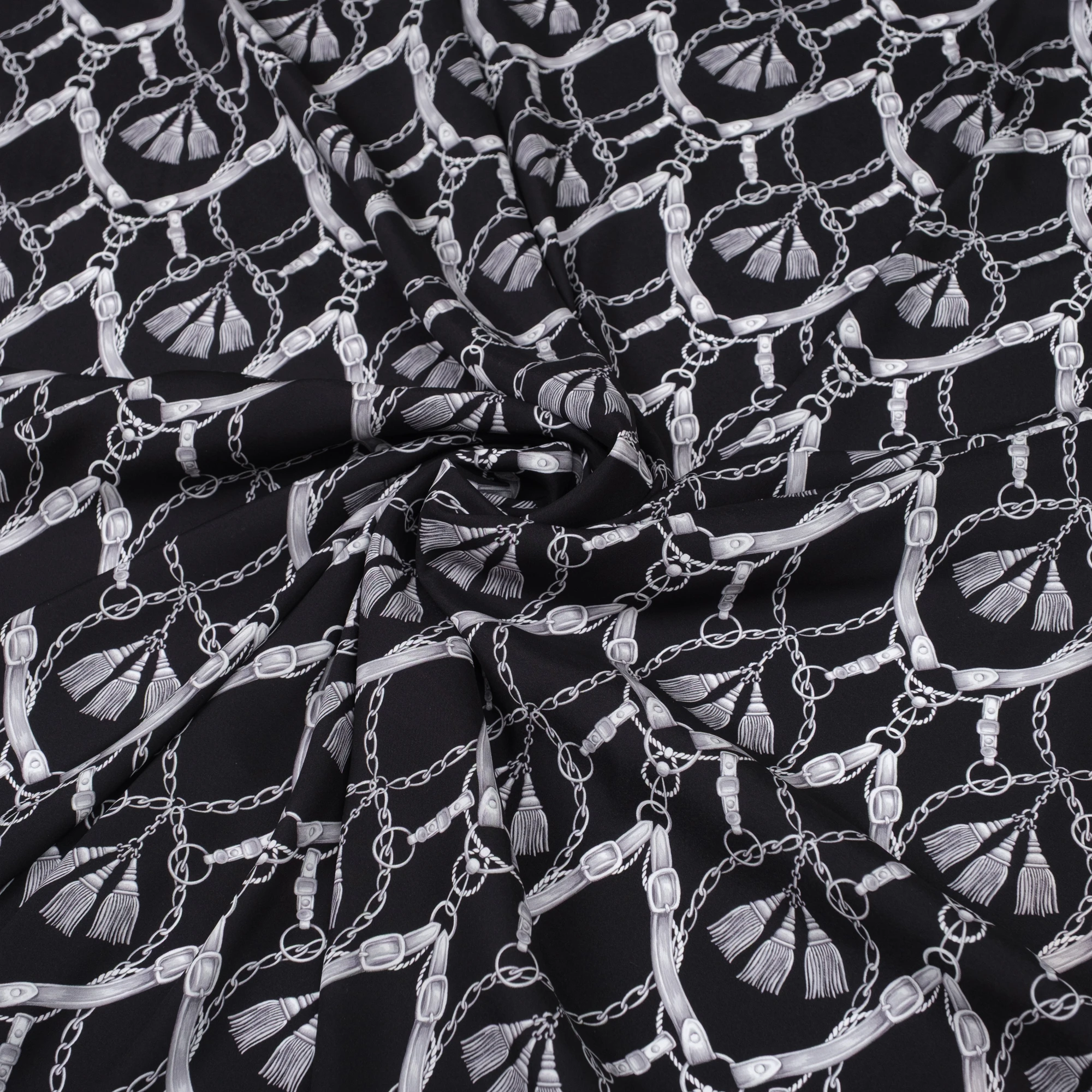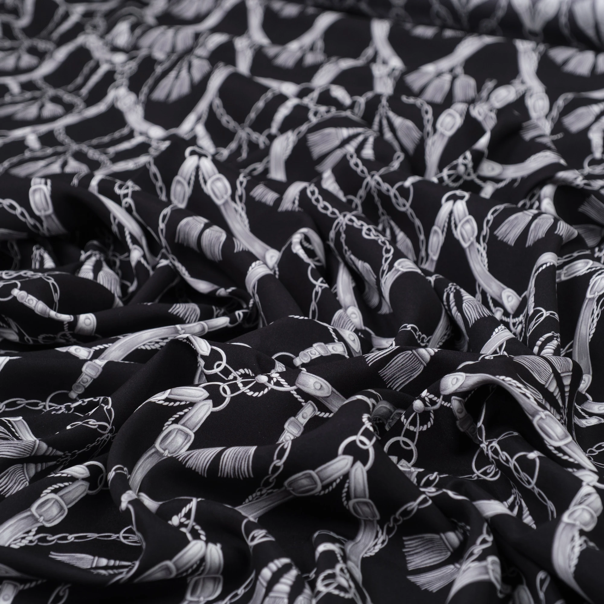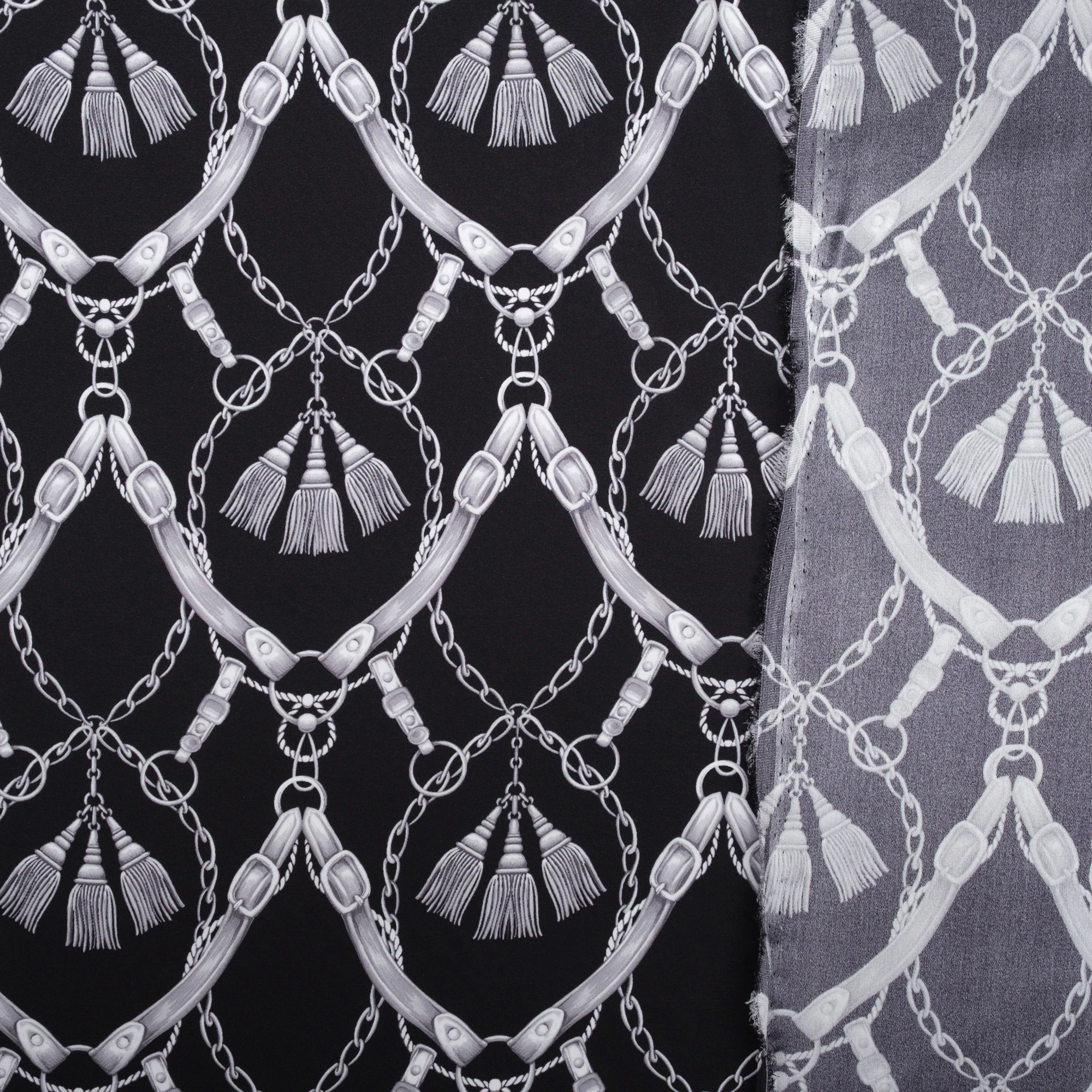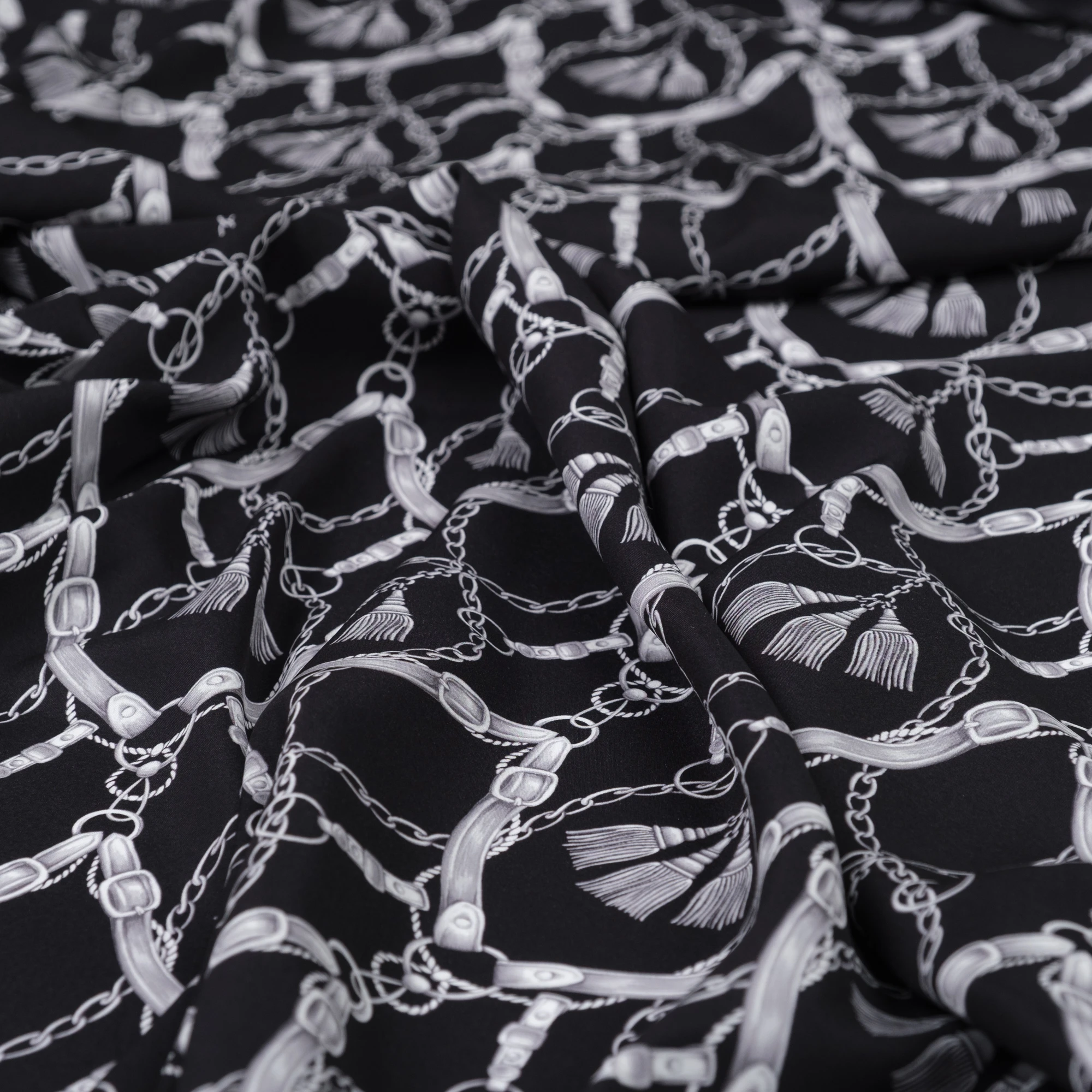 Wyjątkowy jedwab elastyczny w eleganckim, klasycznym wydaniu – czarna satyna ozdobiona białym markowym wzorem łańcuchów i chwostów na matowej stronie. To luksusowa tkanina jedwabna z Włoch, która zachwyca połyskiem, miękkością i płynnym układem. Dzięki dodatku elastanu, materiał delikatnie się rozciąga, co zapewnia idealne dopasowanie i komfort noszenia.