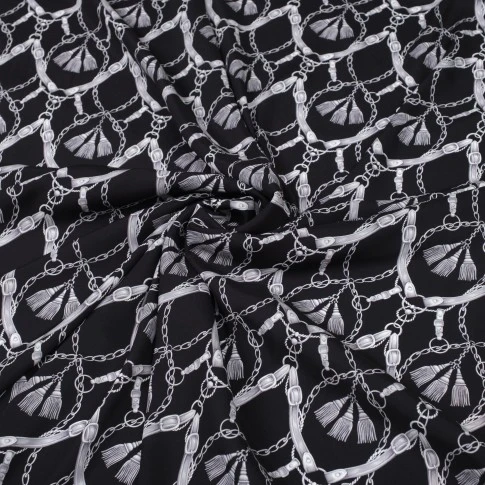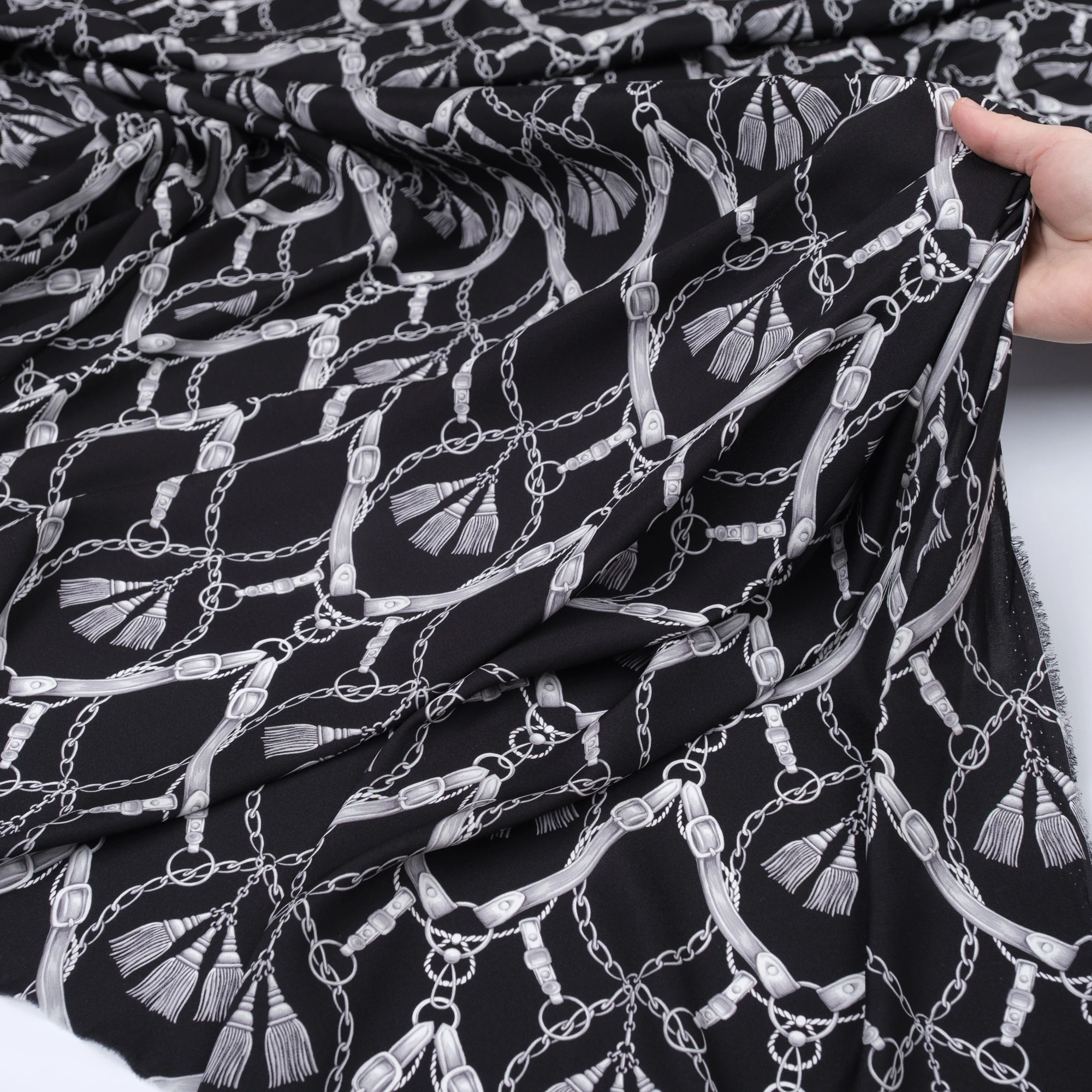 Tkanina doskonała na sukienki jedwabne, bluzki, koszule, spódnice i odzież wieczorową. Stylowy motyw łańcuchów przywołuje klimat włoskiego luksusu i mody premium — idealny dla osób ceniących ponadczasową elegancję i wyjątkową jakość.
