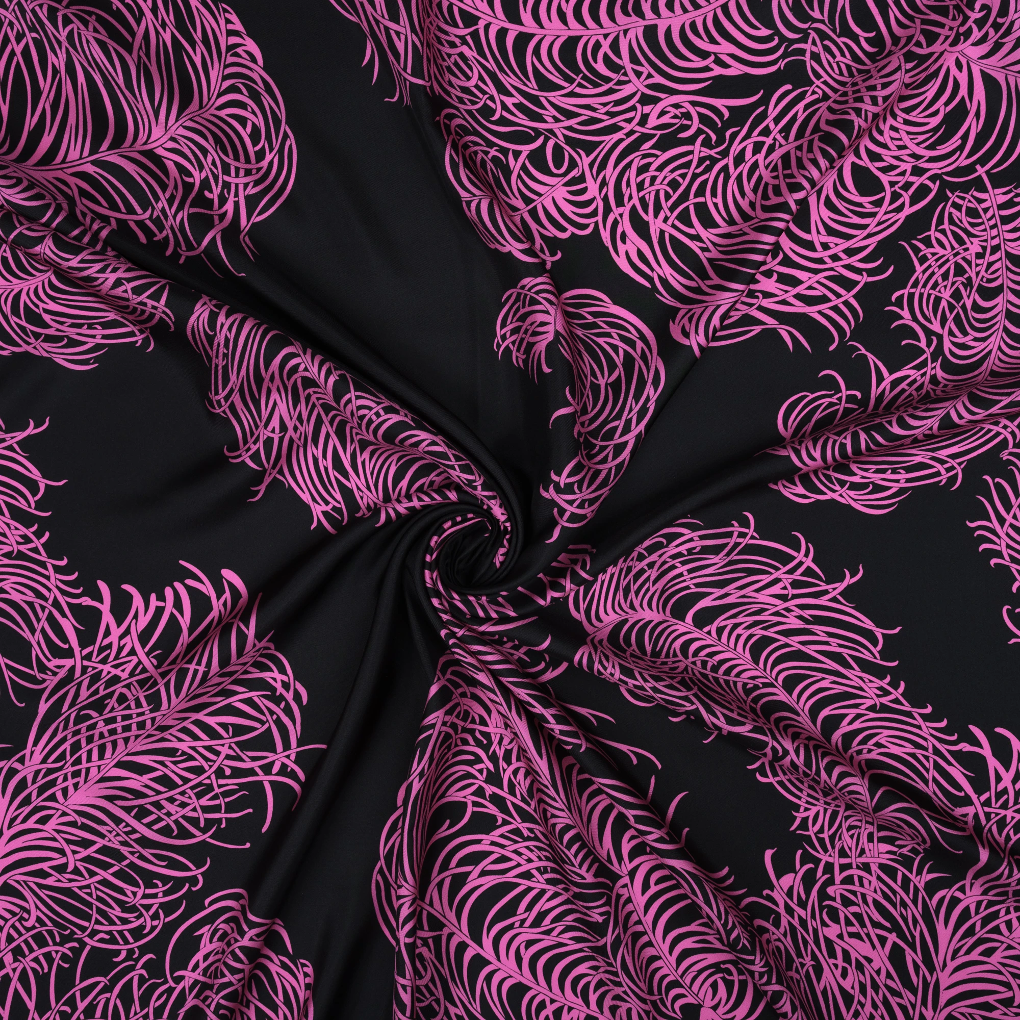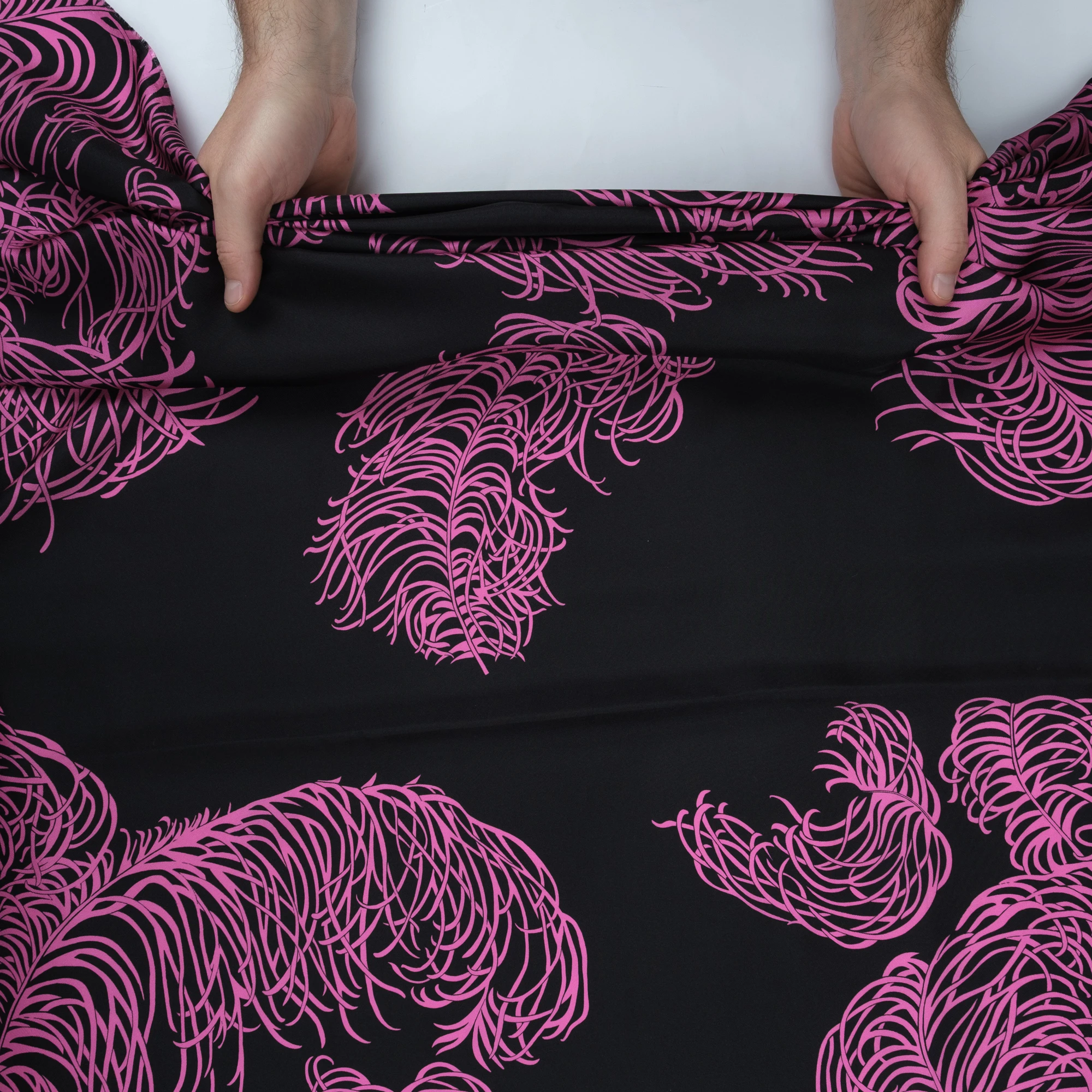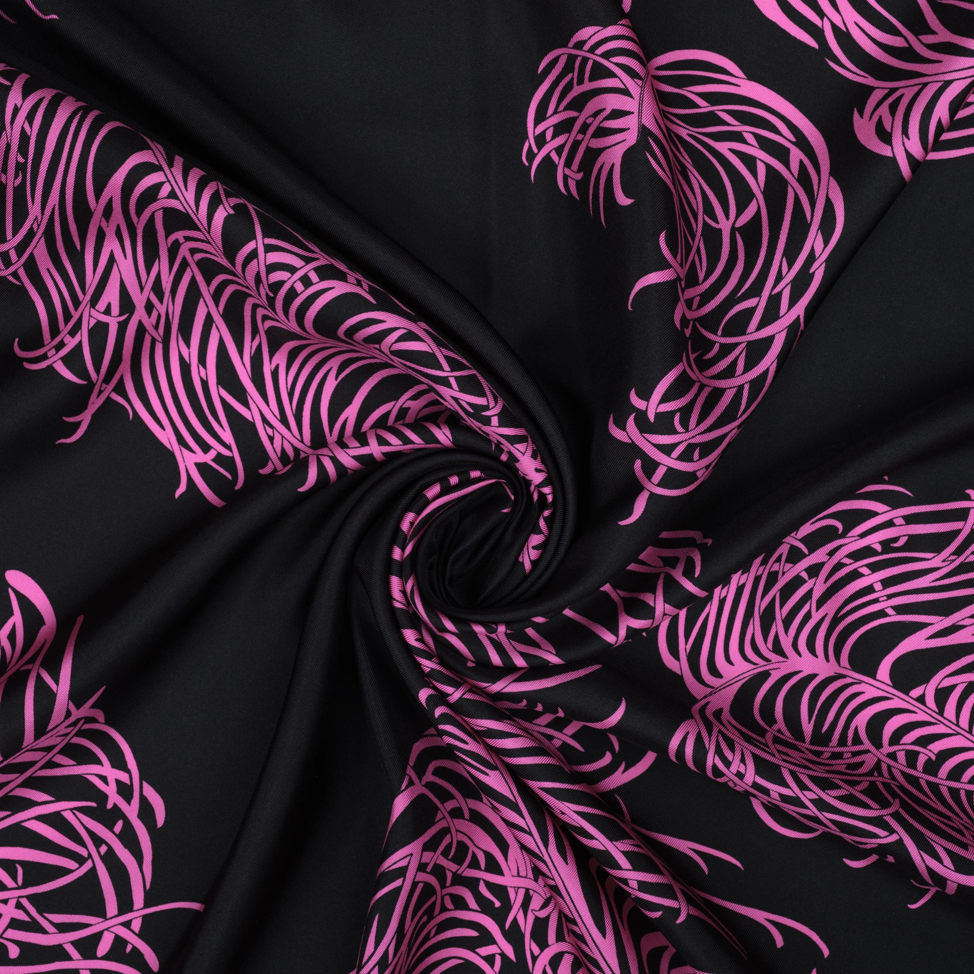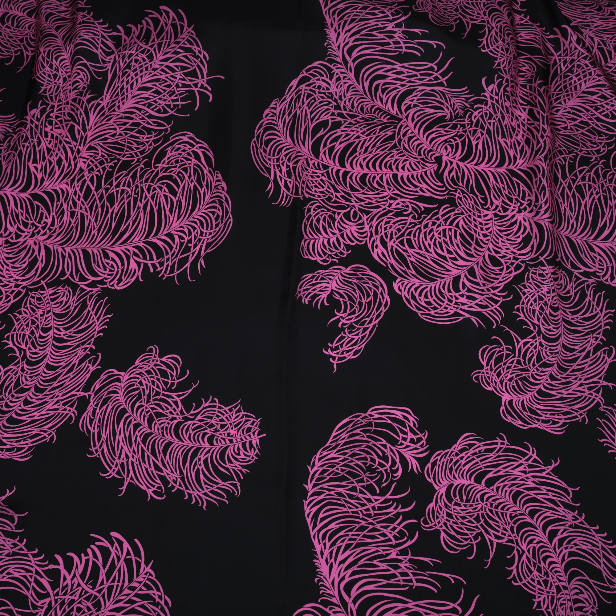 Poczuj luksus w dotyku z naszą wyjątkową tkaniną – markowy jedwab twill 100%, który łączy włoską elegancję z nowoczesnym, artystycznym designem. Na tle głębokiej czerni rozpościerają się ekspresyjne motywy piór w intensywnym odcieniu fuksji – dynamiczne, lekkie i niezwykle kobiece. To sygnowany jedwab, który przyciąga wzrok i emanuje klasą w każdym detalu.