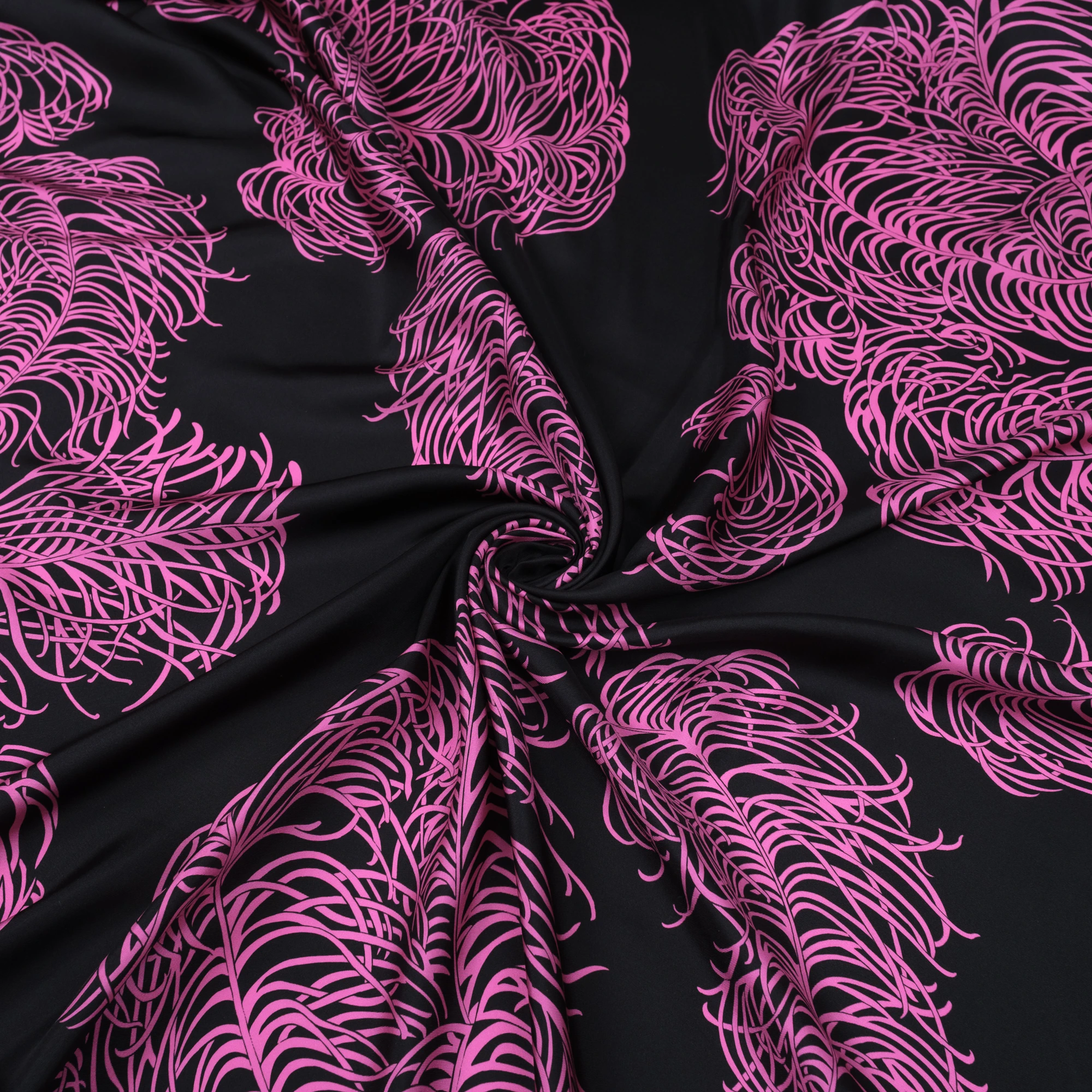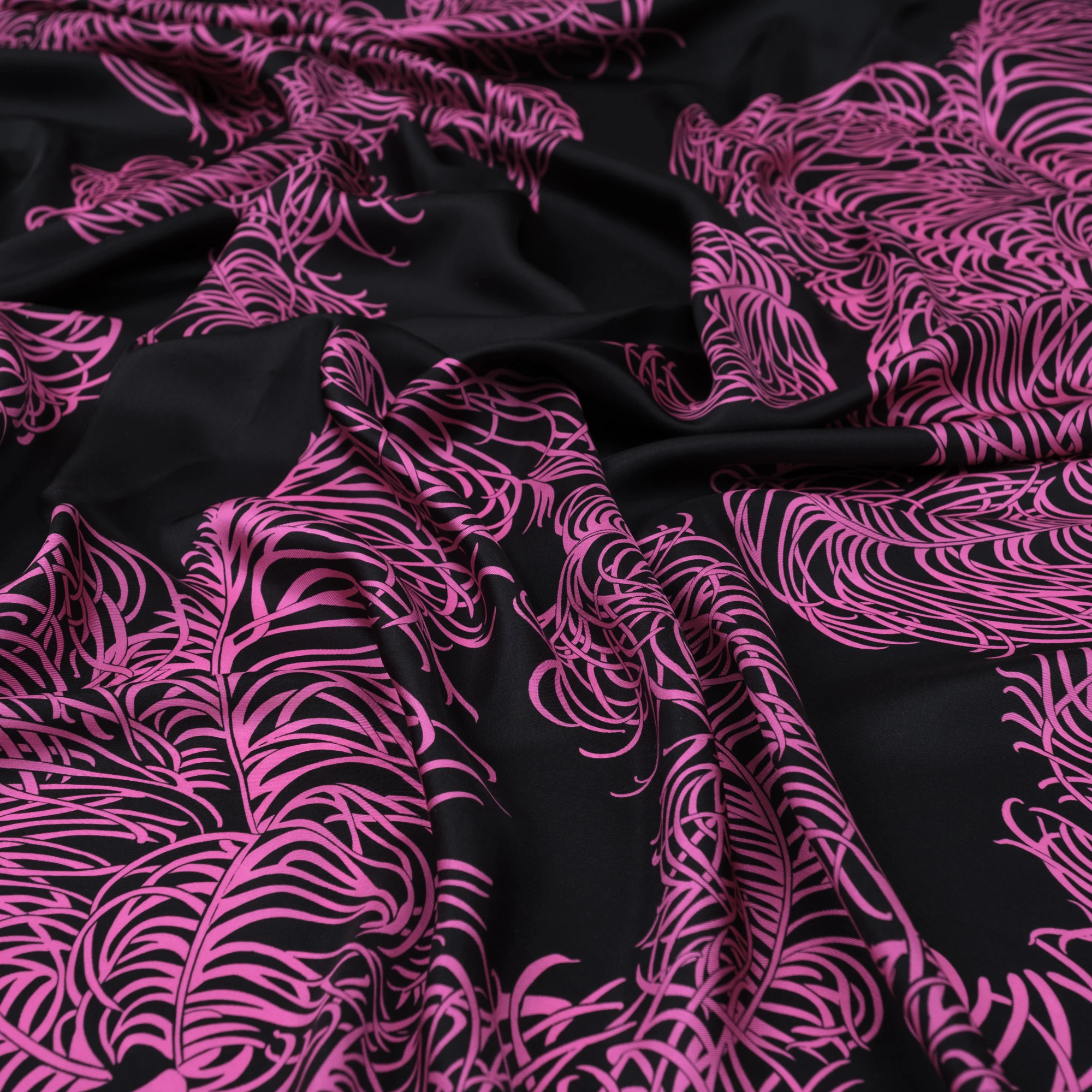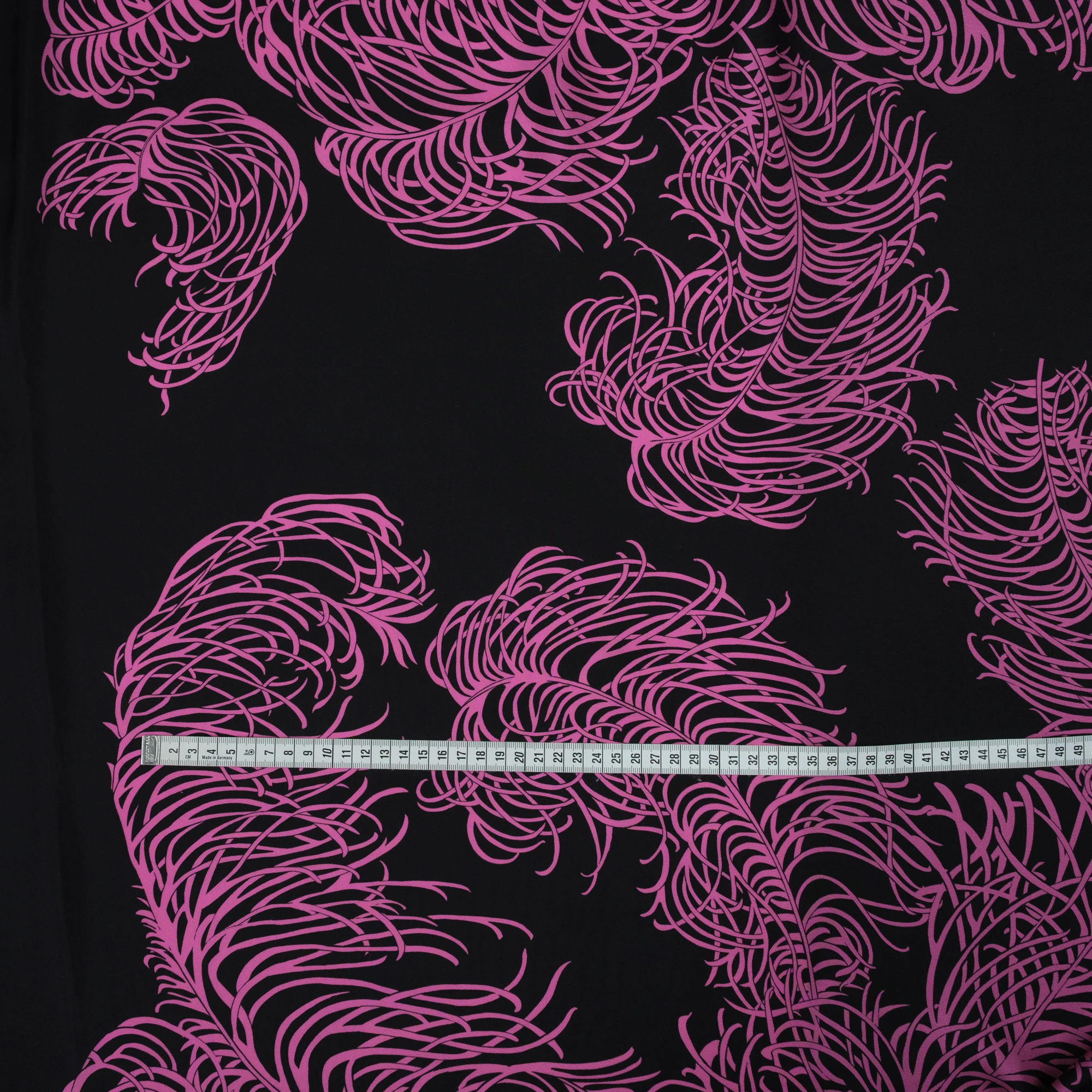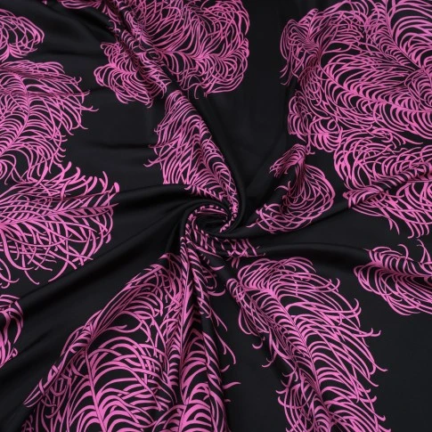 Poczuj luksus w dotyku z naszą wyjątkową tkaniną – markowy jedwab twill 100%, który łączy włoską elegancję z nowoczesnym, artystycznym designem. Na tle głębokiej czerni rozpościerają się ekspresyjne motywy piór w intensywnym odcieniu fuksji – dynamiczne, lekkie i niezwykle kobiece. To sygnowany jedwab, który przyciąga wzrok i emanuje klasą w każdym detalu.