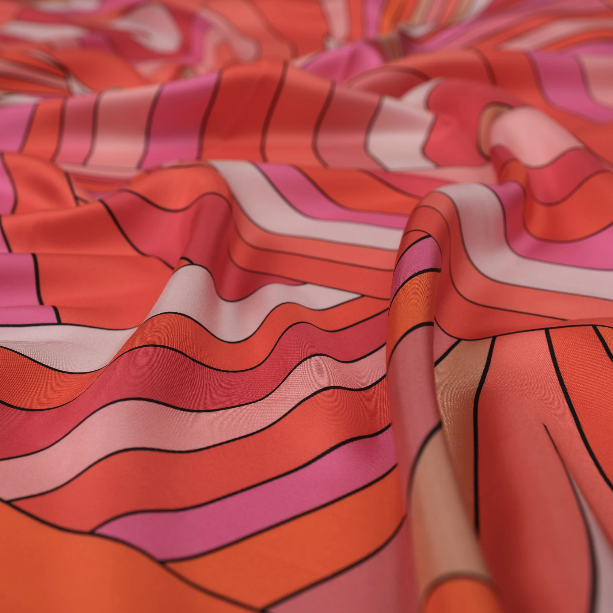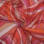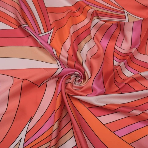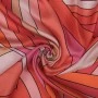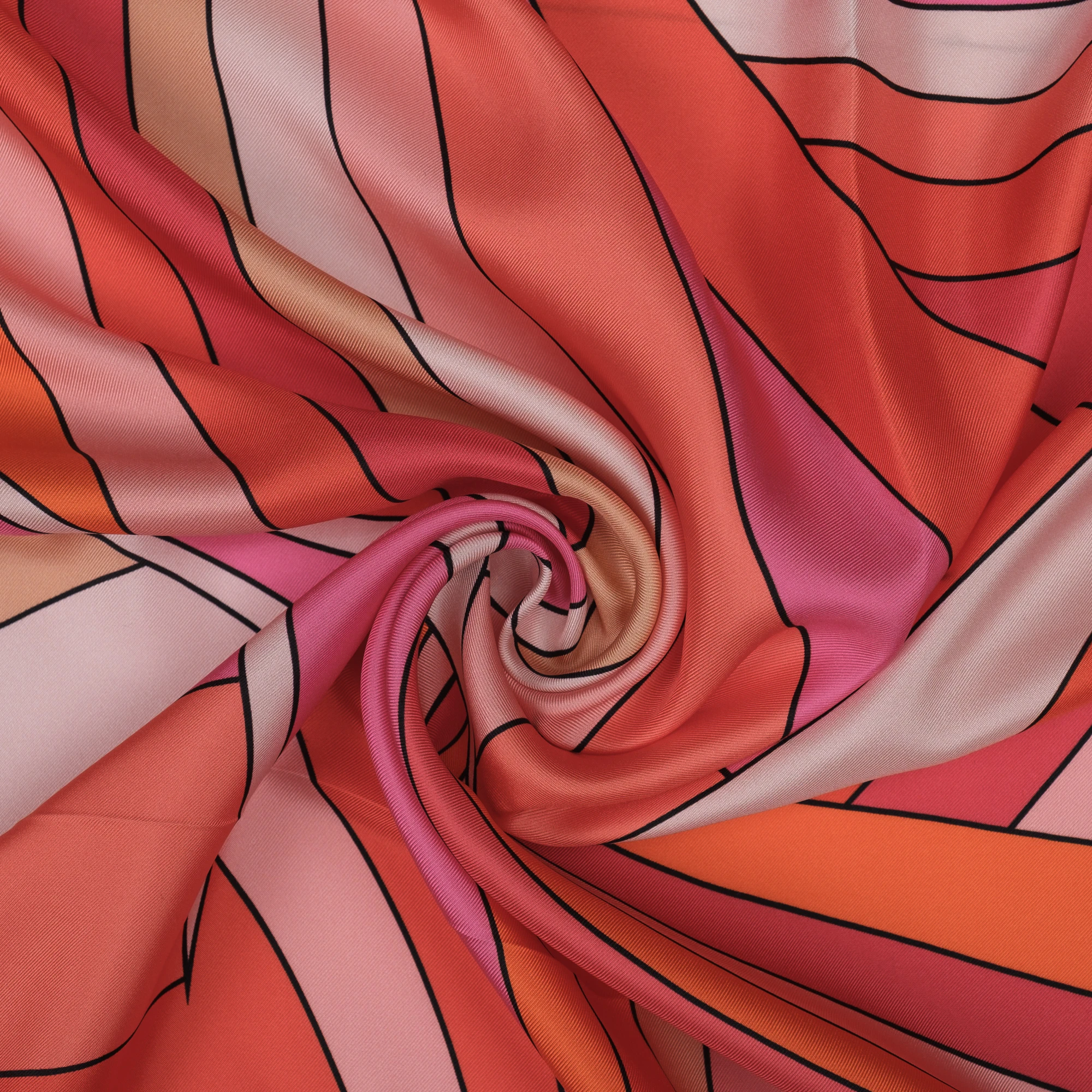Ten włoski jedwab o subtelnym skośnym splocie urzeka swoją miękkością i lekkością. Soczyste odcienie koralu, różu, czerwieni i brzoskwini harmonijnie przenikają się w geometrycznym, falistym wzorze – tworząc efekt ruchu i głębi.