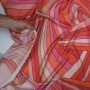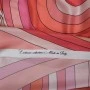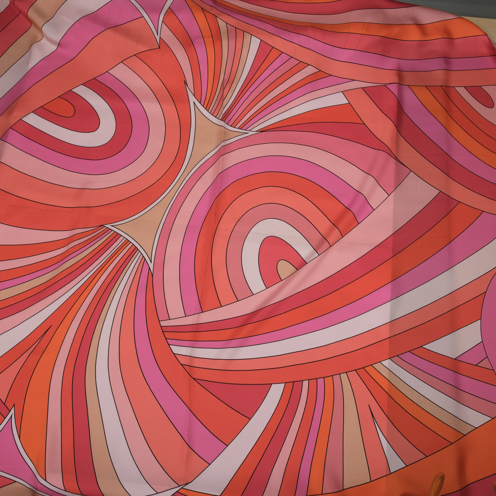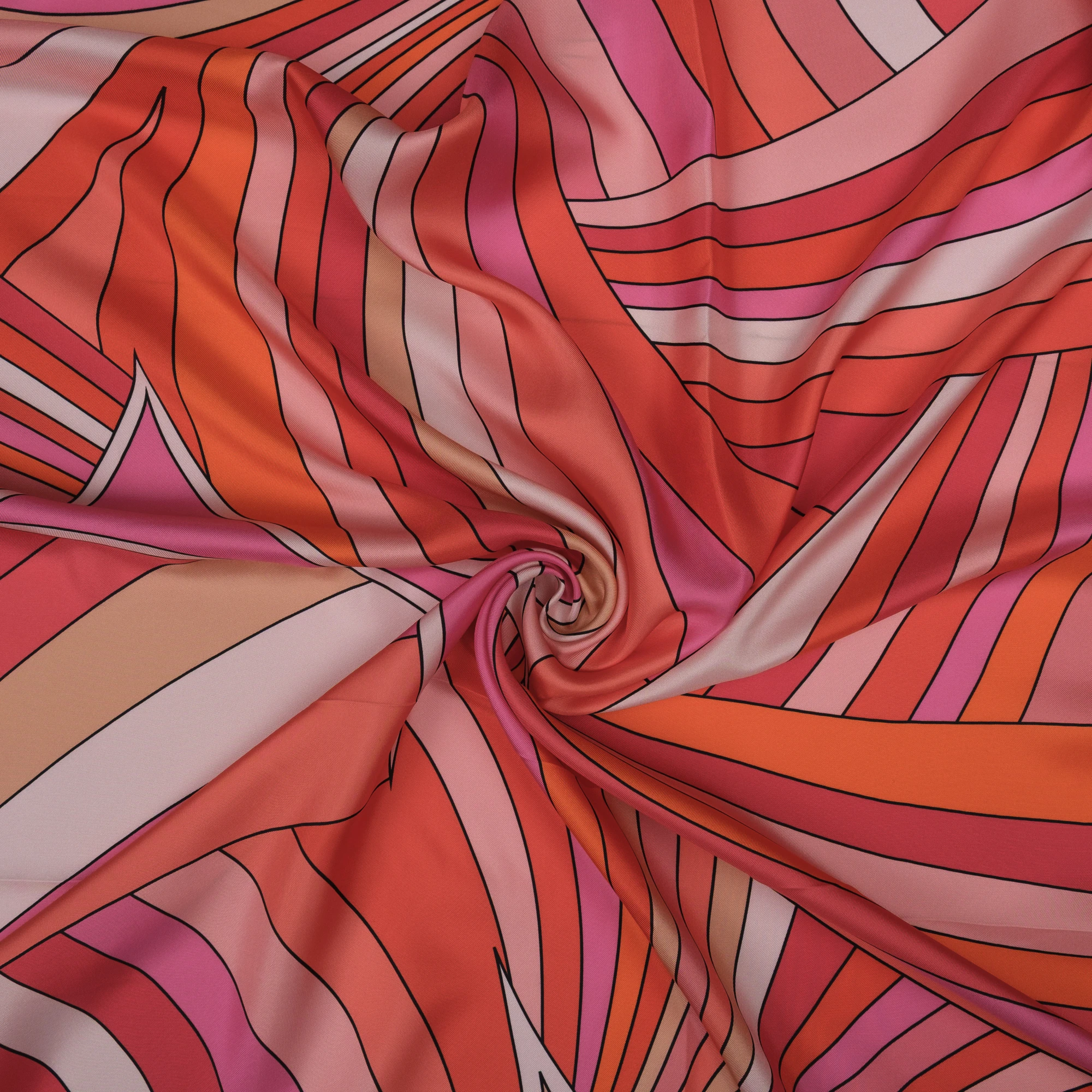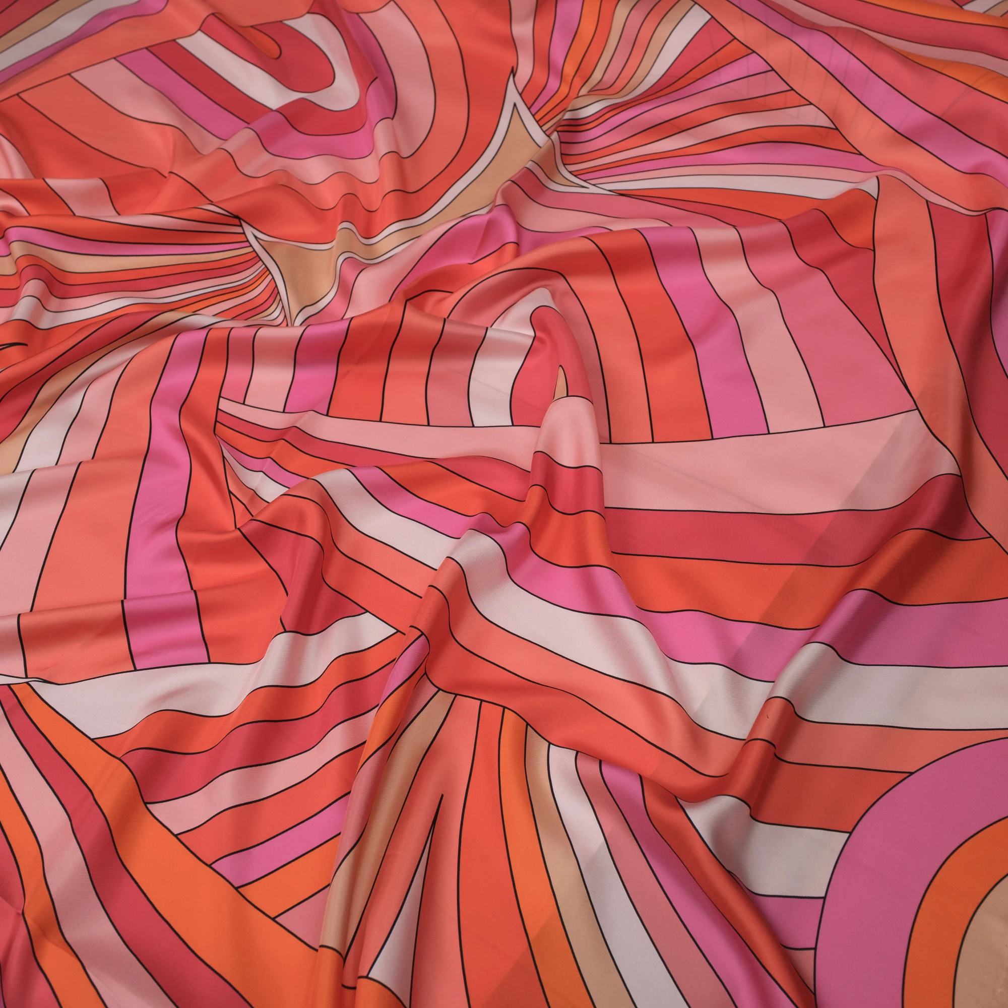 Ten włoski jedwab o subtelnym skośnym splocie urzeka swoją miękkością i lekkością. Soczyste odcienie koralu, różu, czerwieni i brzoskwini harmonijnie przenikają się w geometrycznym, falistym wzorze – tworząc efekt ruchu i głębi.