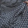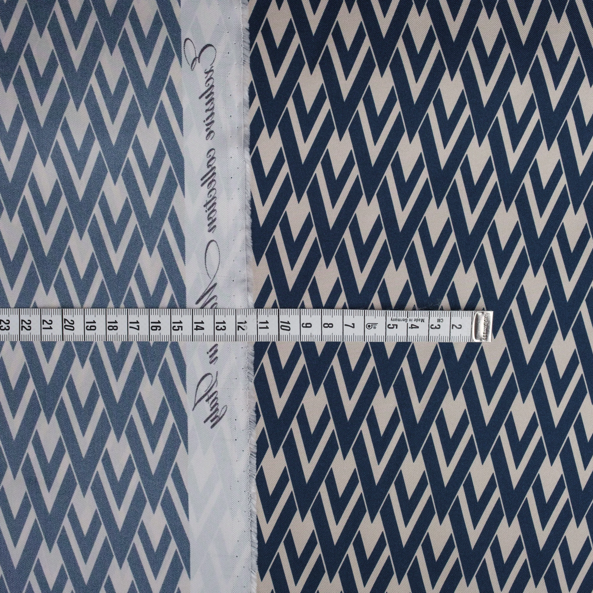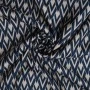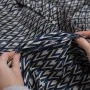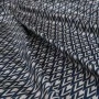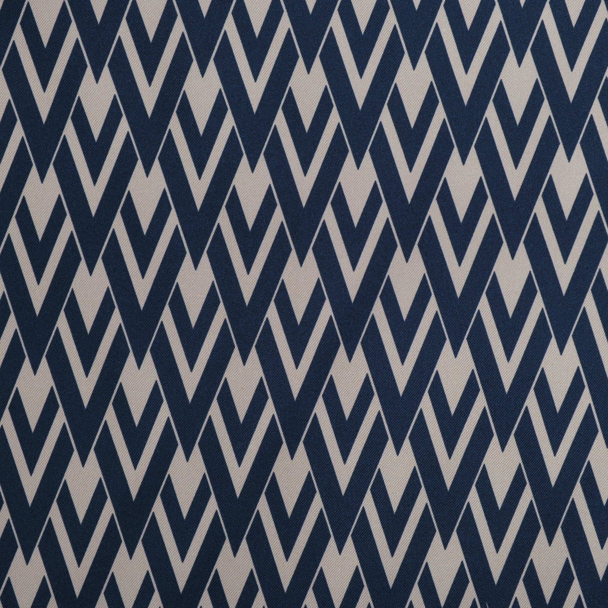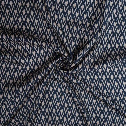 Wyrazisty, geometryczny wzór w odcieniach granatu i złamanej bieli nadaje materiałowi nowoczesny, a zarazem ponadczasowy charakter. Regularny, dynamiczny motyw doskonale prezentuje się zarówno w większych formach, jak i w detalach.