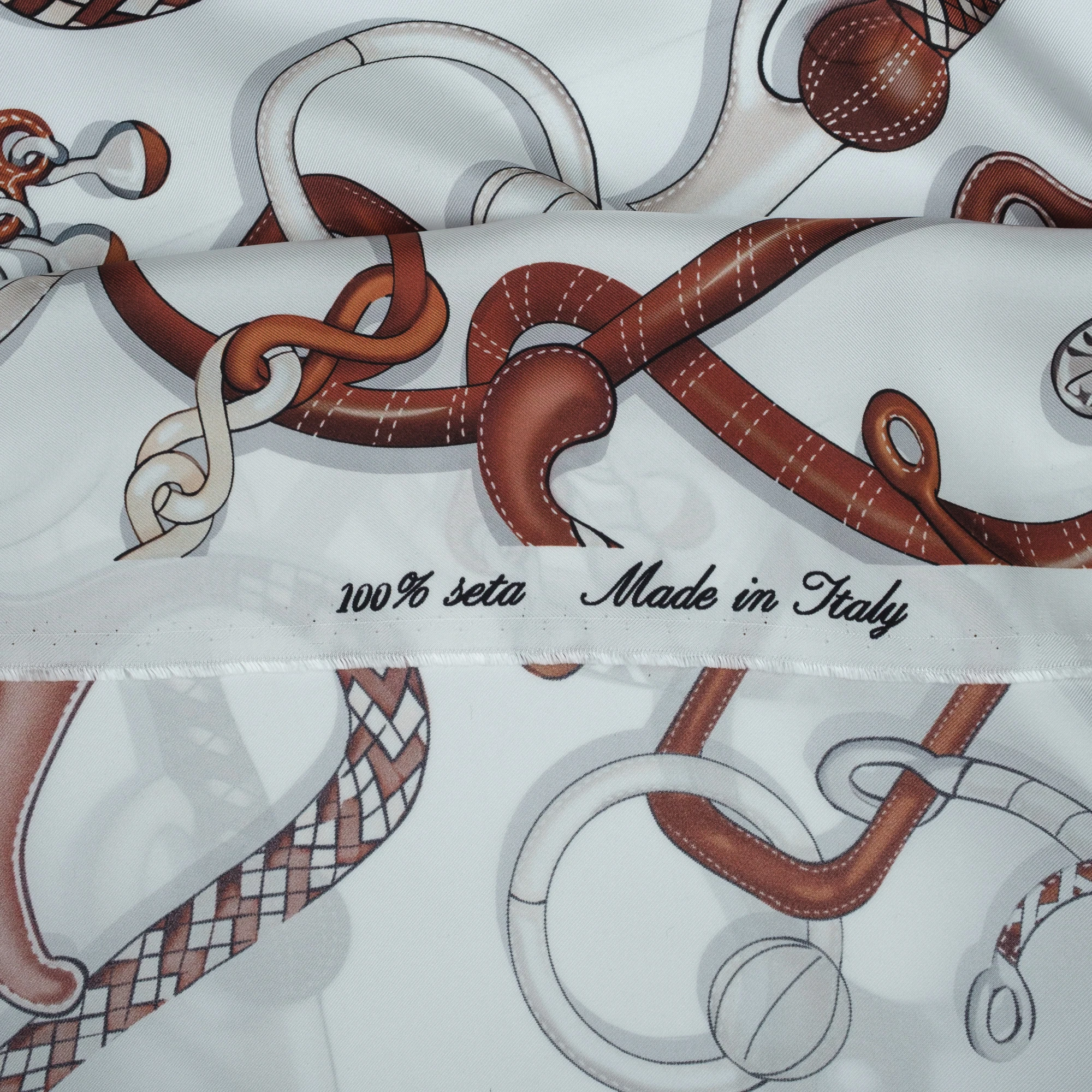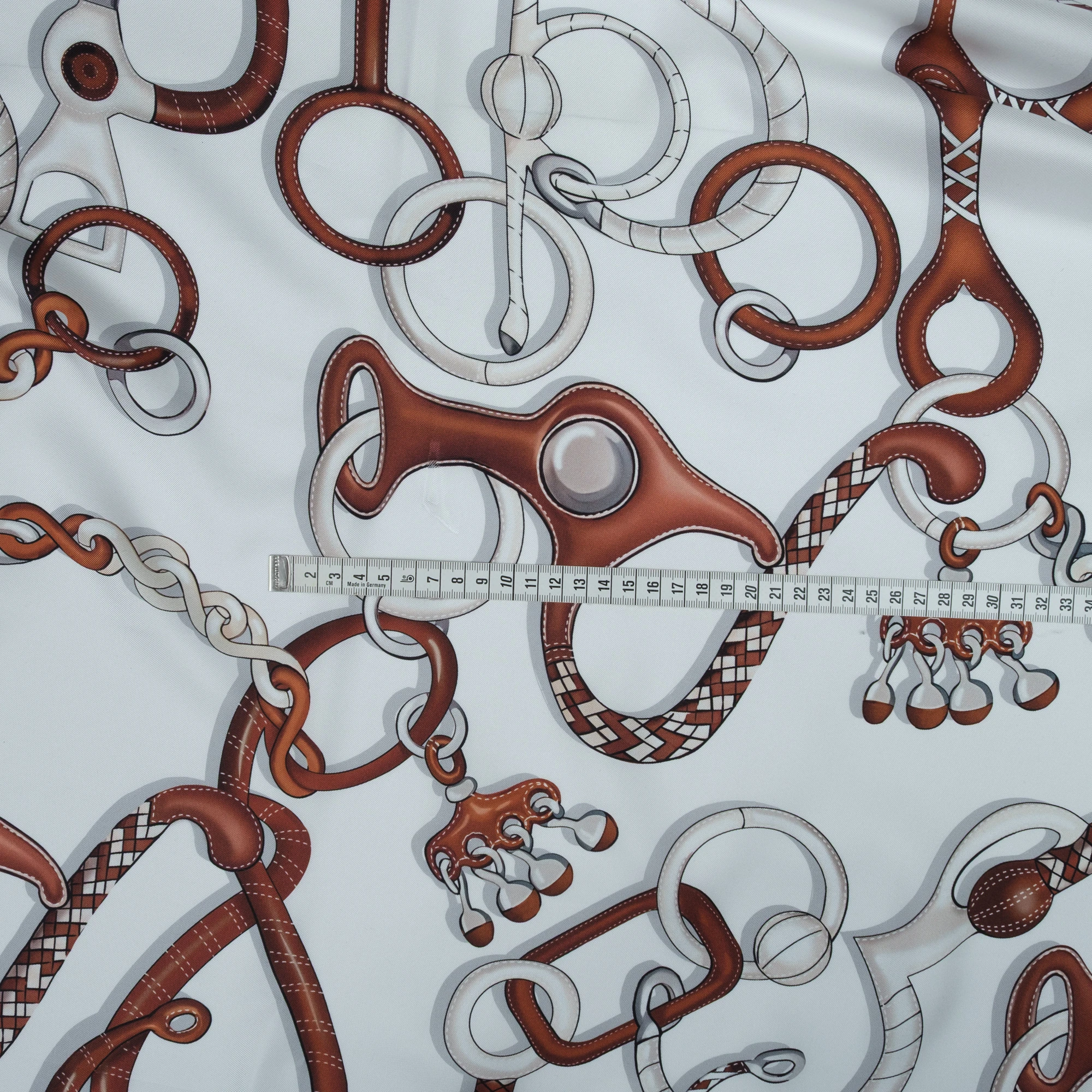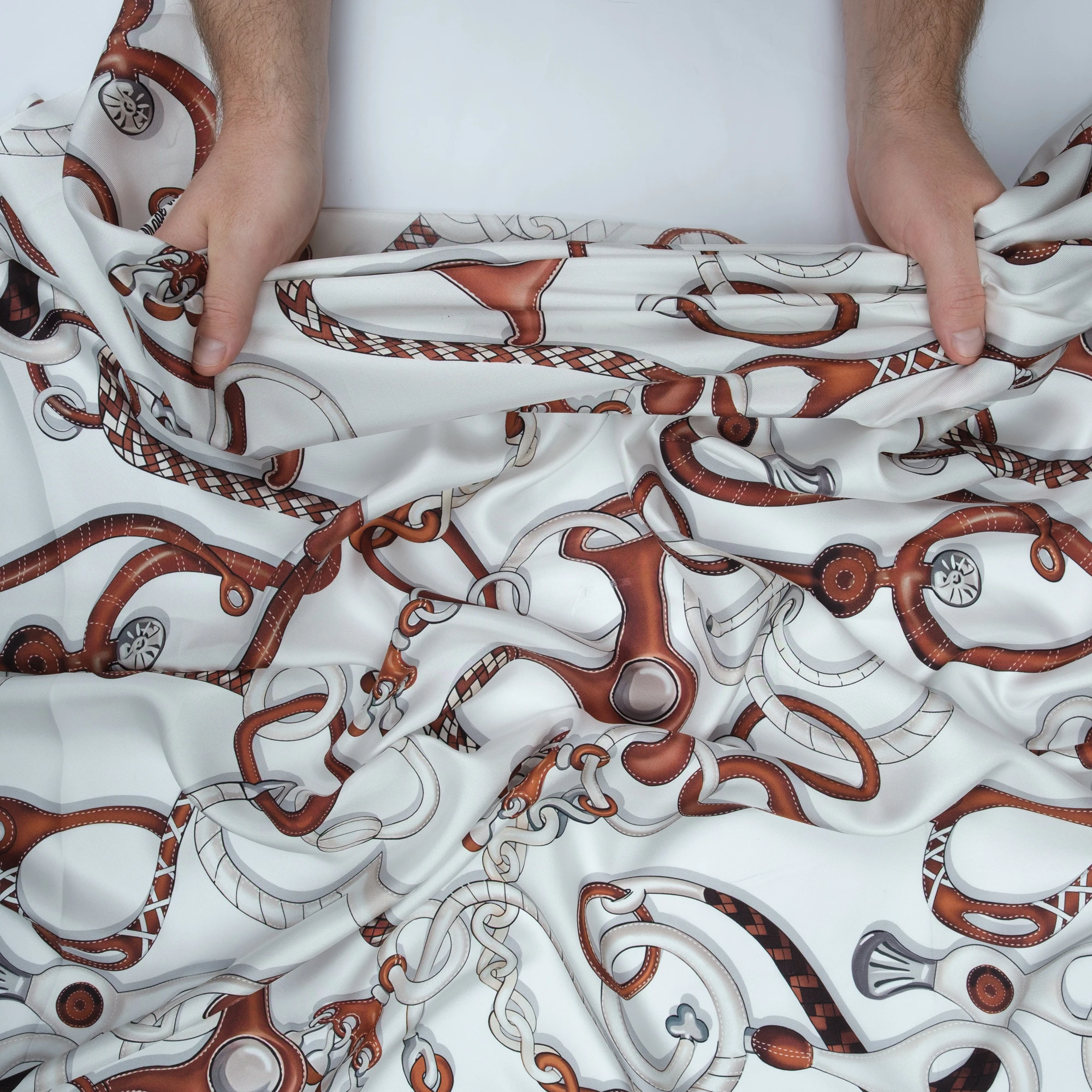 Poznaj esencję ponadczasowej elegancji — luksusowy jedwab twill z motywem inspirowanym światem jeździectwa i włoską modą. Na tle w odcieniu szlachetnej bieli pojawiają się efektowne, czekoladowo-brązowe i karmelowe elementy przypominające skórzane paski, sprzączki i łańcuchy, tworząc kompozycję pełną detalu i klasy.