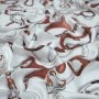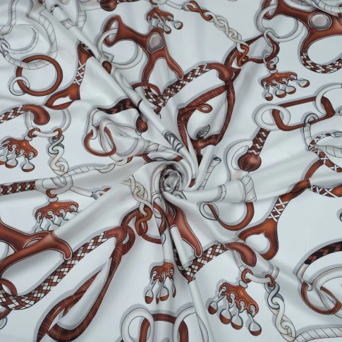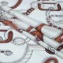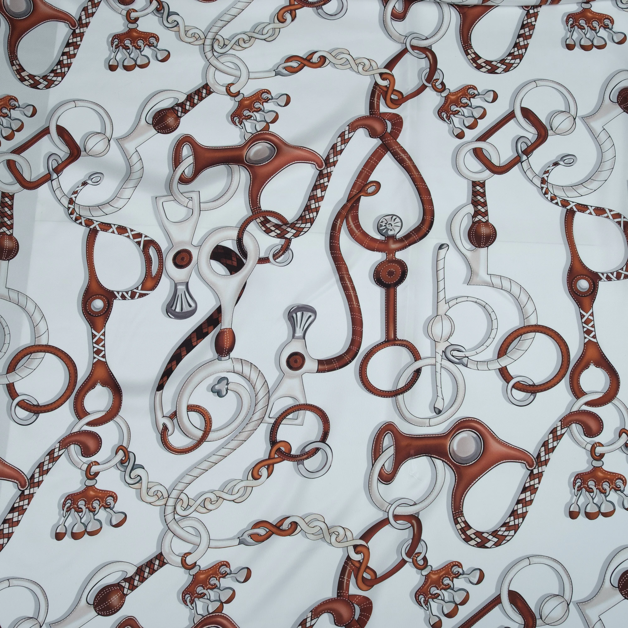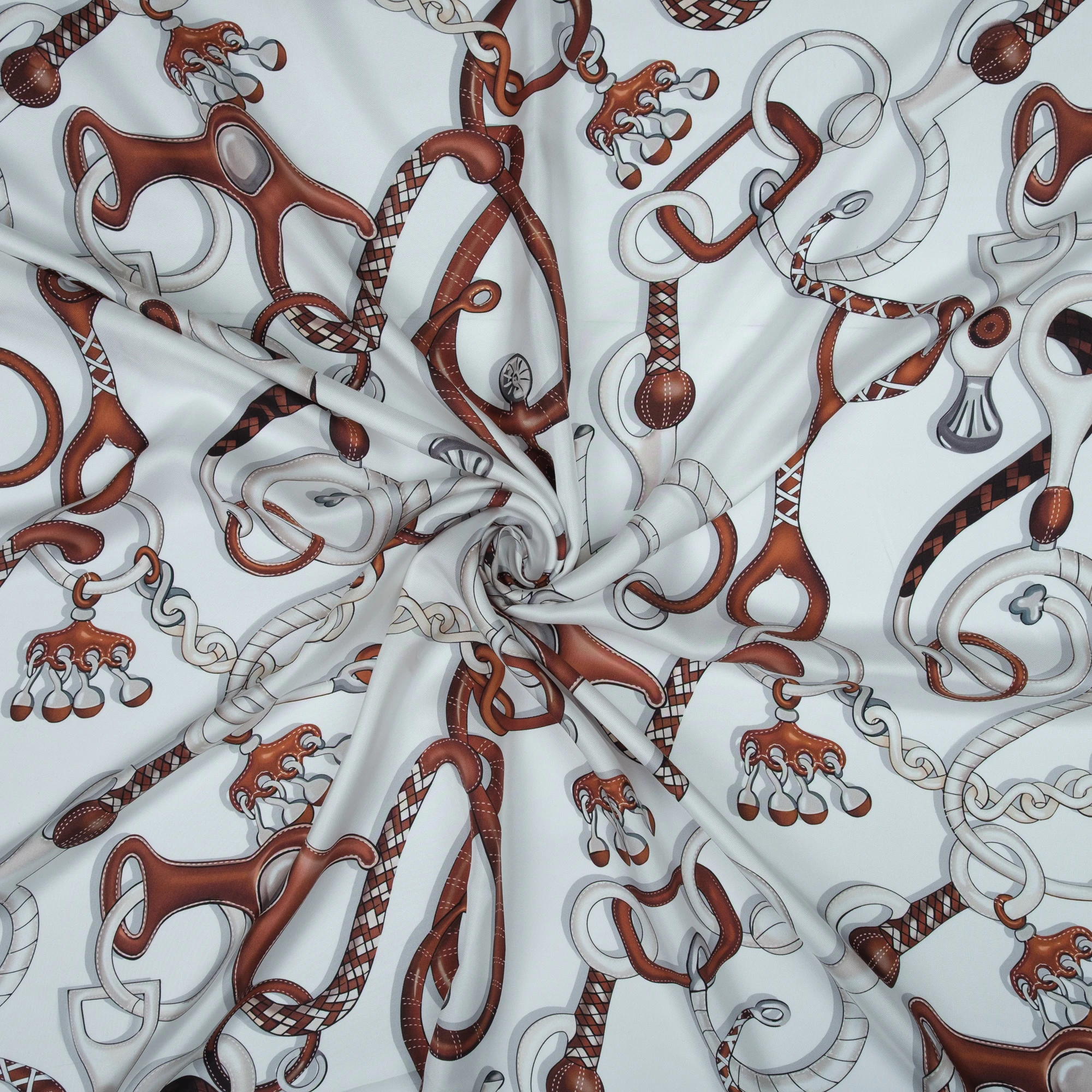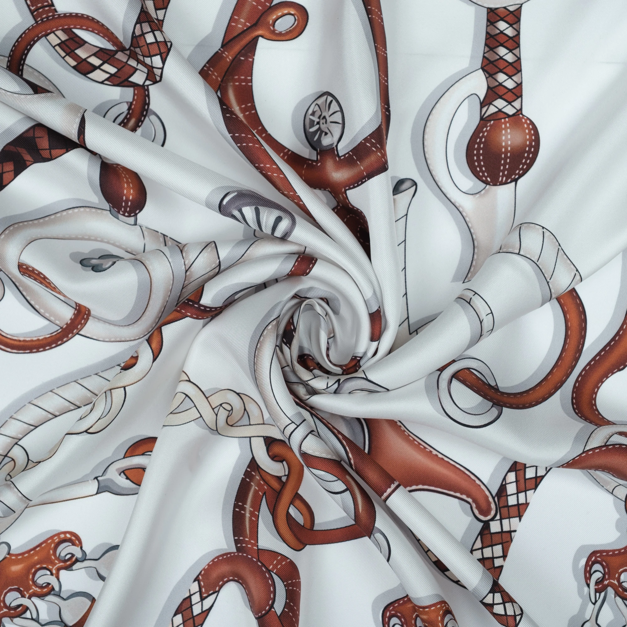 Poznaj esencję ponadczasowej elegancji — luksusowy jedwab twill z motywem inspirowanym światem jeździectwa i włoską modą. Na tle w odcieniu szlachetnej bieli pojawiają się efektowne, czekoladowo-brązowe i karmelowe elementy przypominające skórzane paski, sprzączki i łańcuchy, tworząc kompozycję pełną detalu i klasy.