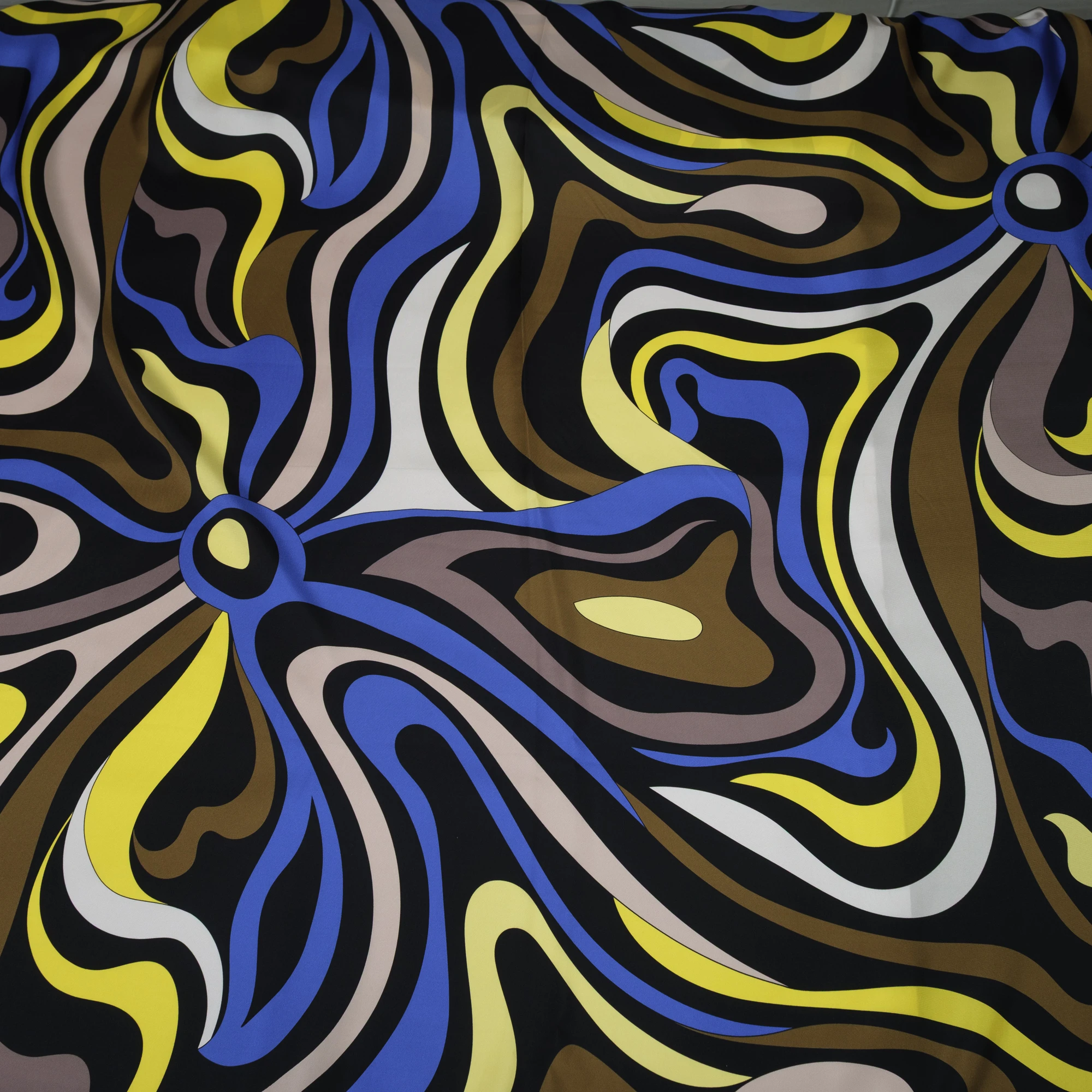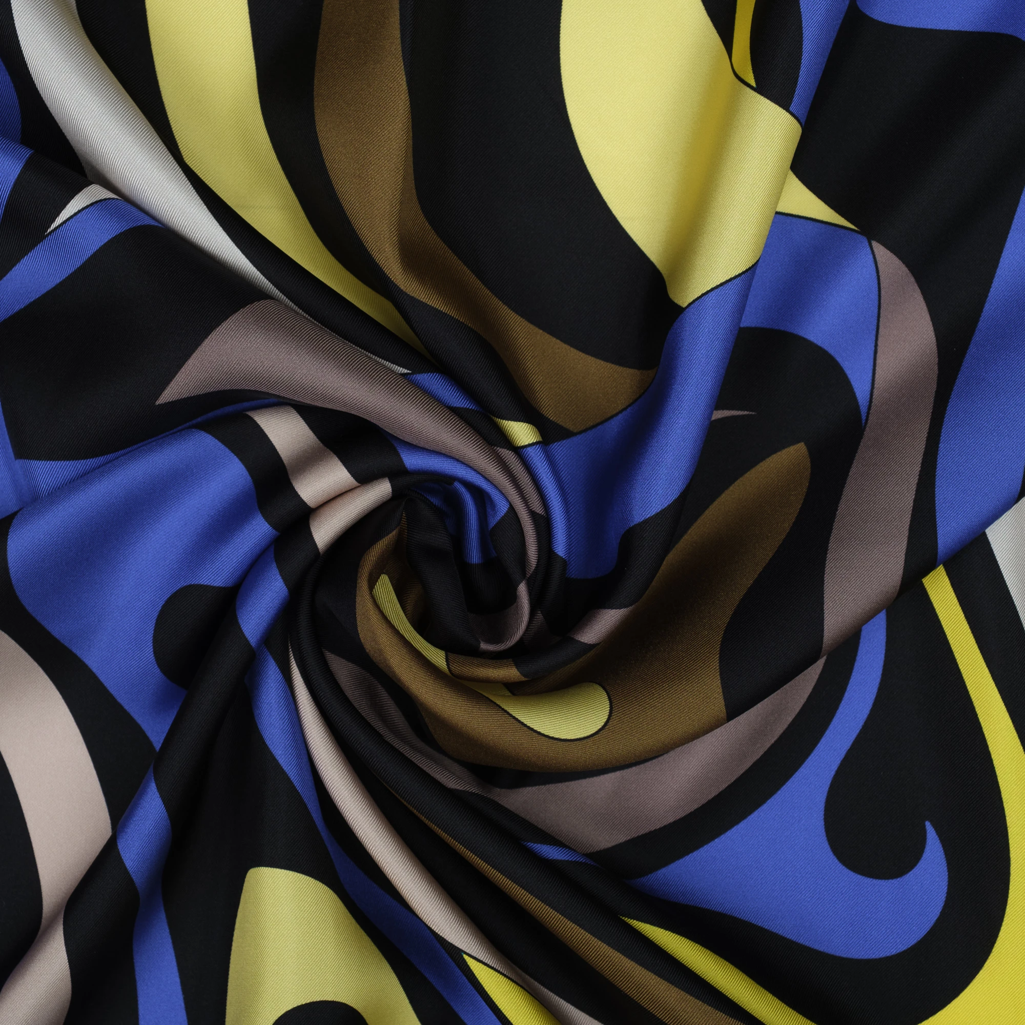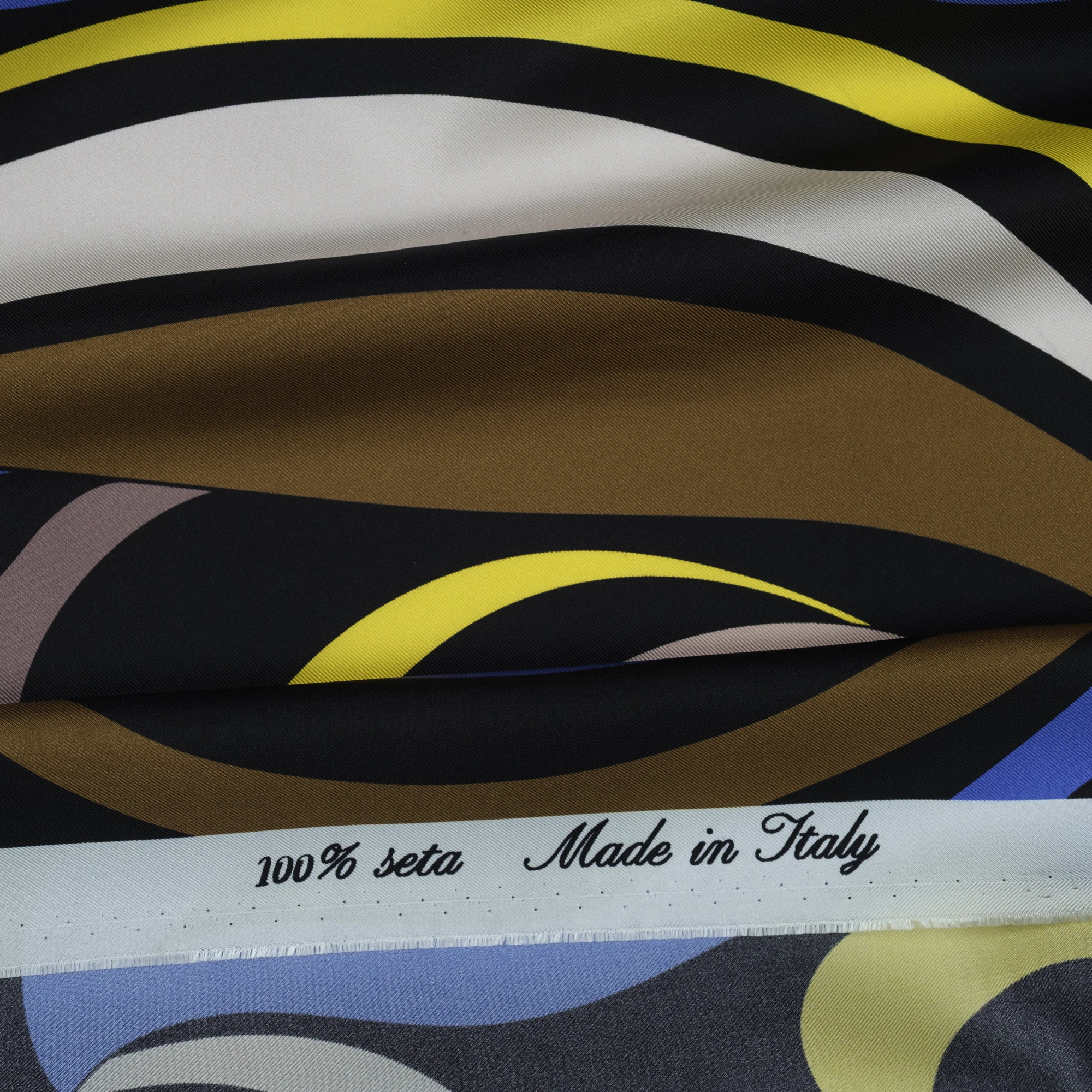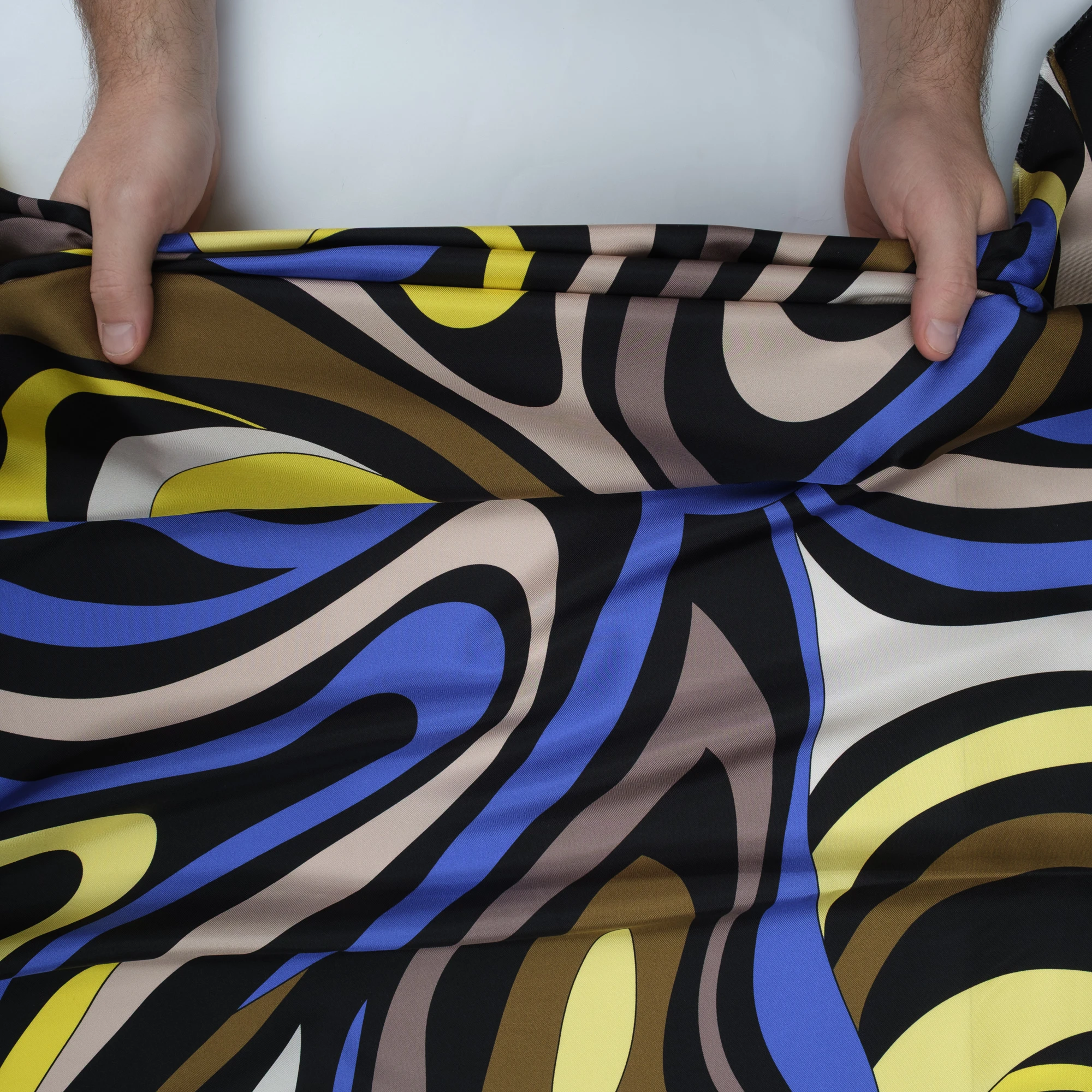 Zanurz się w świecie włoskiego luksusu z wyjątkową tkaniną, jaką jest markowy jedwab twill – esencja klasy, kreatywności i najwyższej jakości. Ten sygnowany jedwab zachwyca wyrazistym, artystycznym wzorem w odcieniach żółci, błękitu, brązu i czerni, które tworzą dynamiczną, geometryczną kompozycję inspirowaną modą z włoskich domów couture.