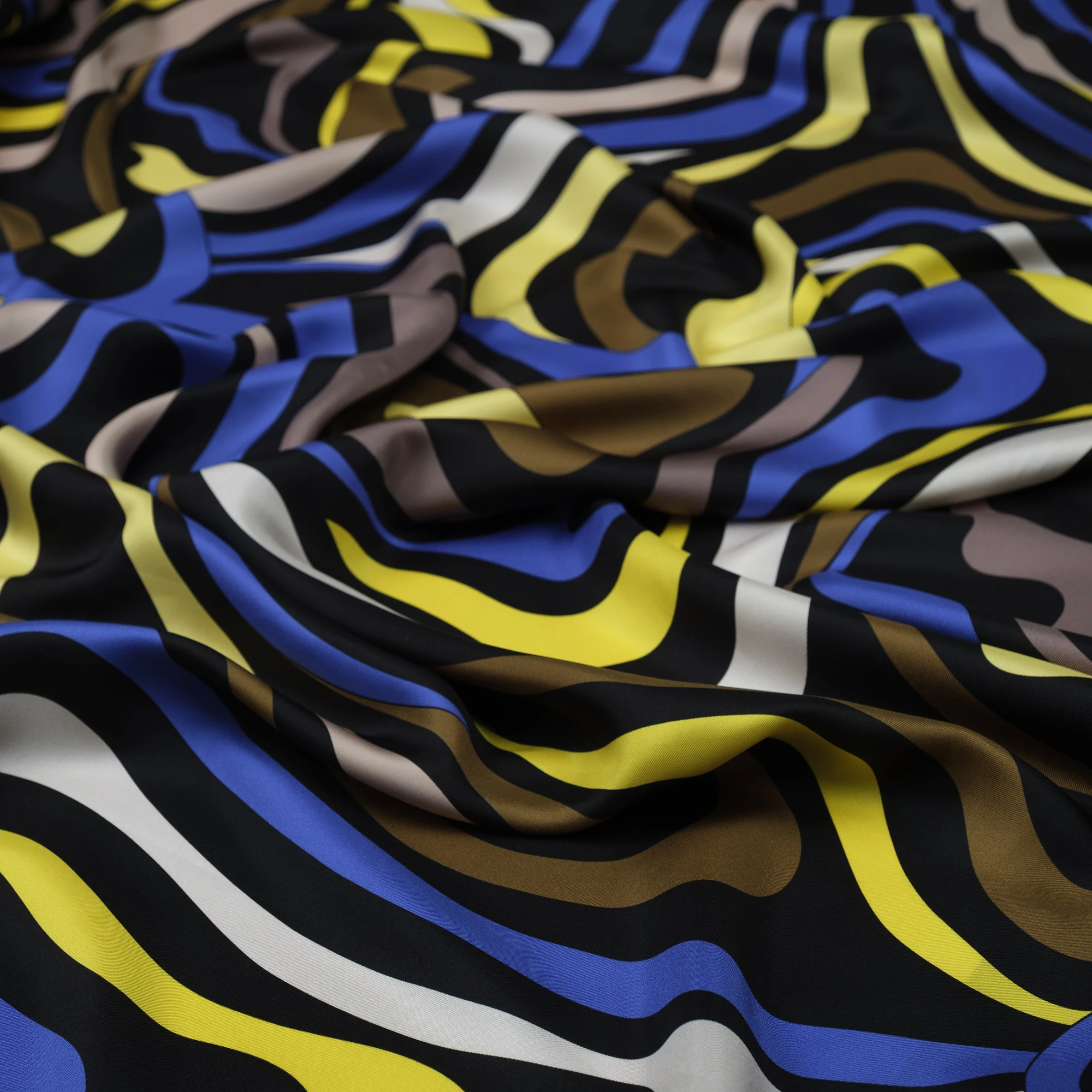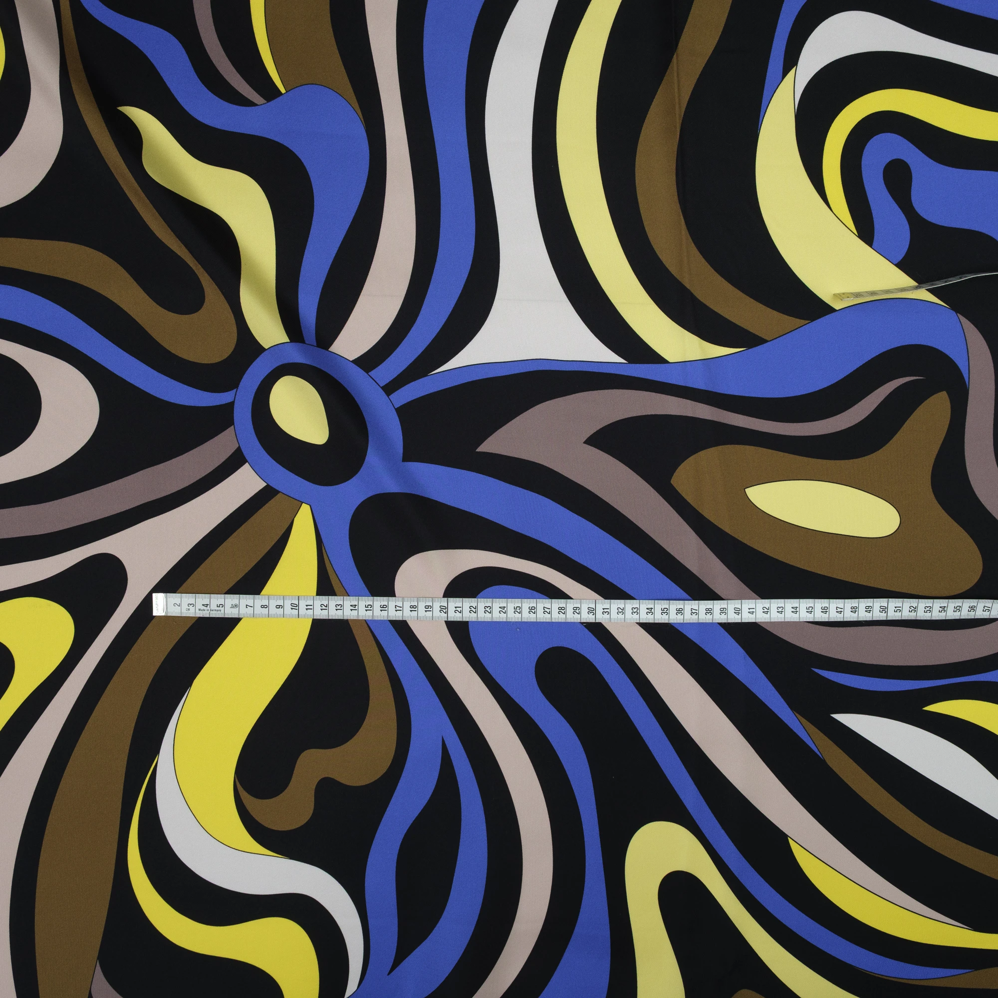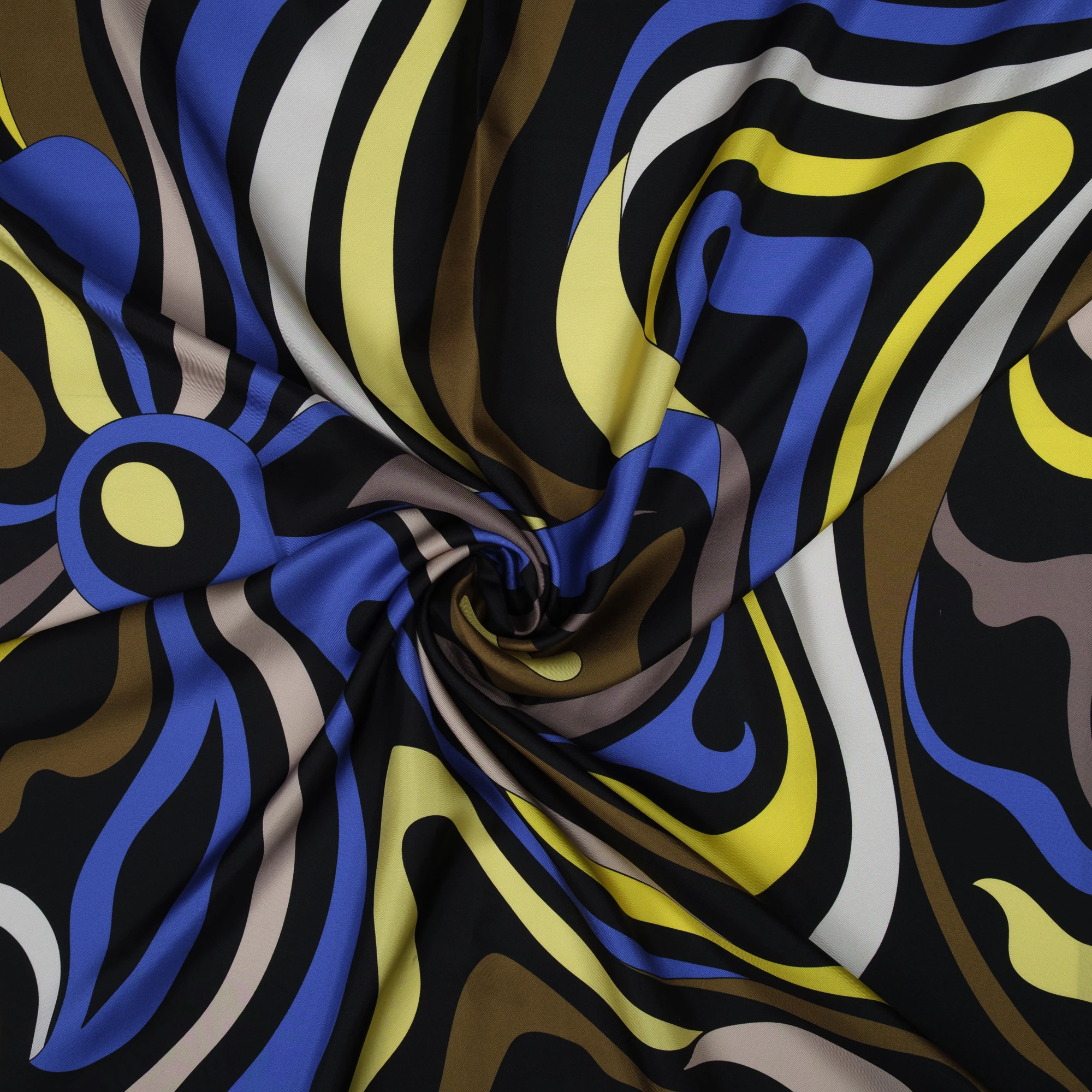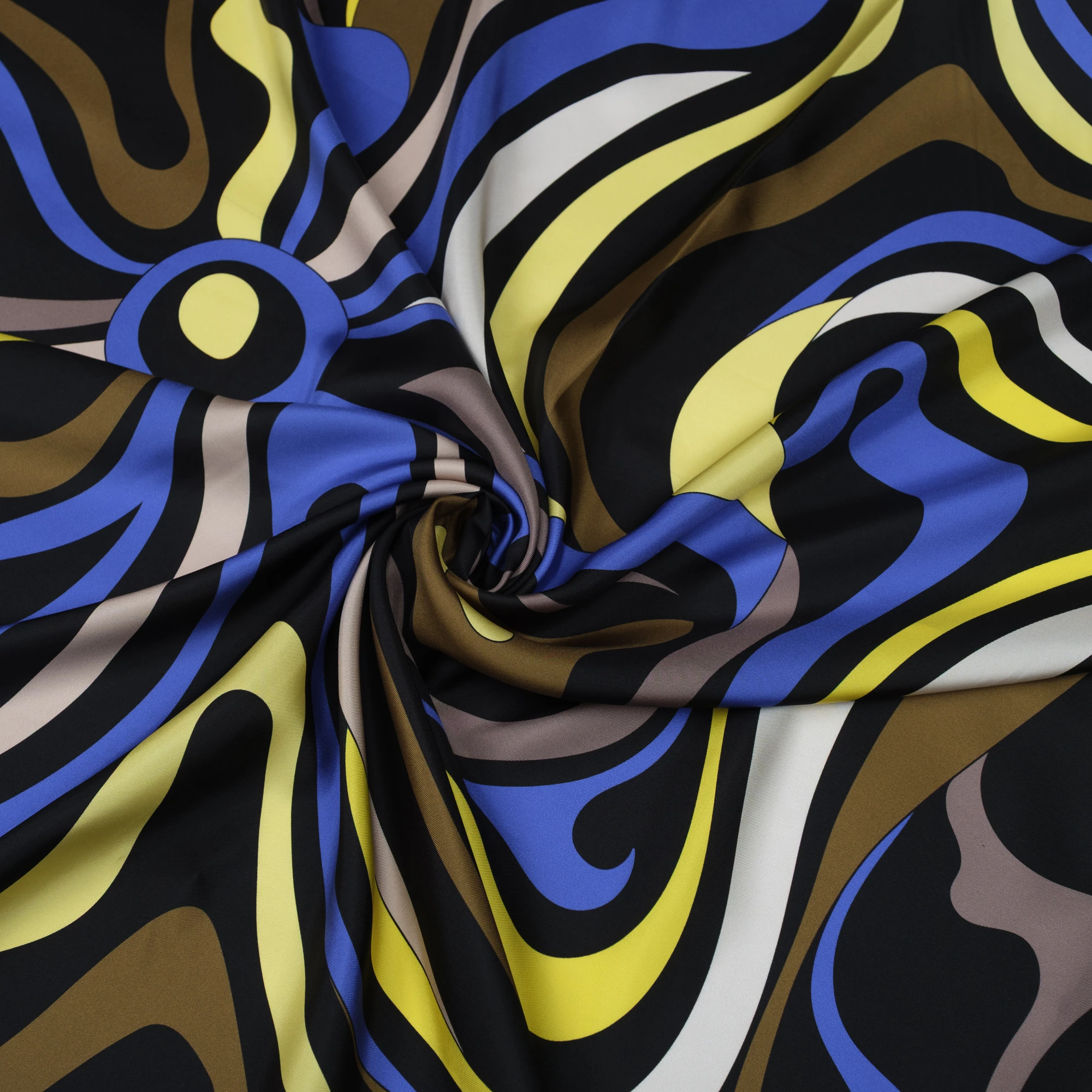 Zanurz się w świecie włoskiego luksusu z wyjątkową tkaniną, jaką jest markowy jedwab twill – esencja klasy, kreatywności i najwyższej jakości. Ten sygnowany jedwab zachwyca wyrazistym, artystycznym wzorem w odcieniach żółci, błękitu, brązu i czerni, które tworzą dynamiczną, geometryczną kompozycję inspirowaną modą z włoskich domów couture.
