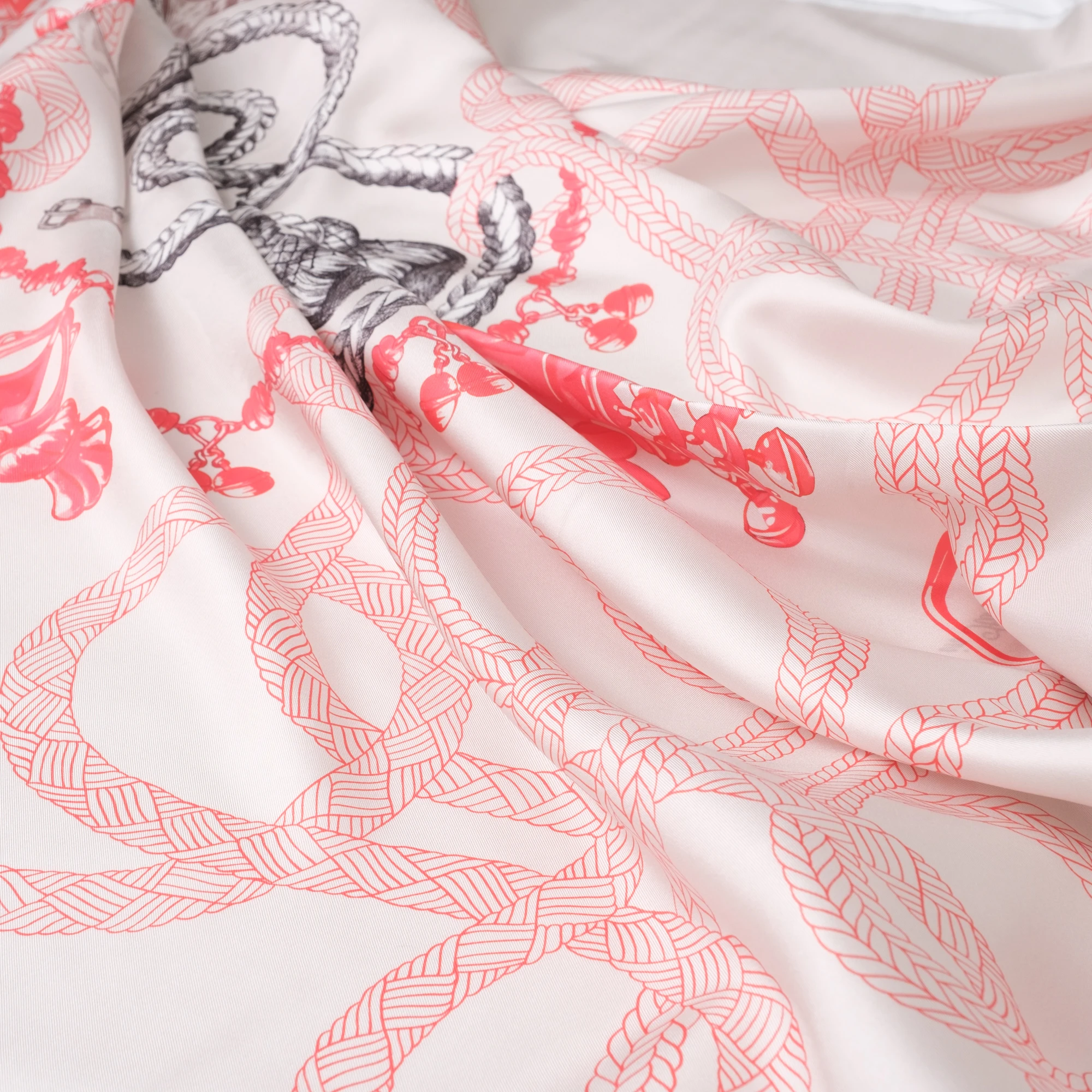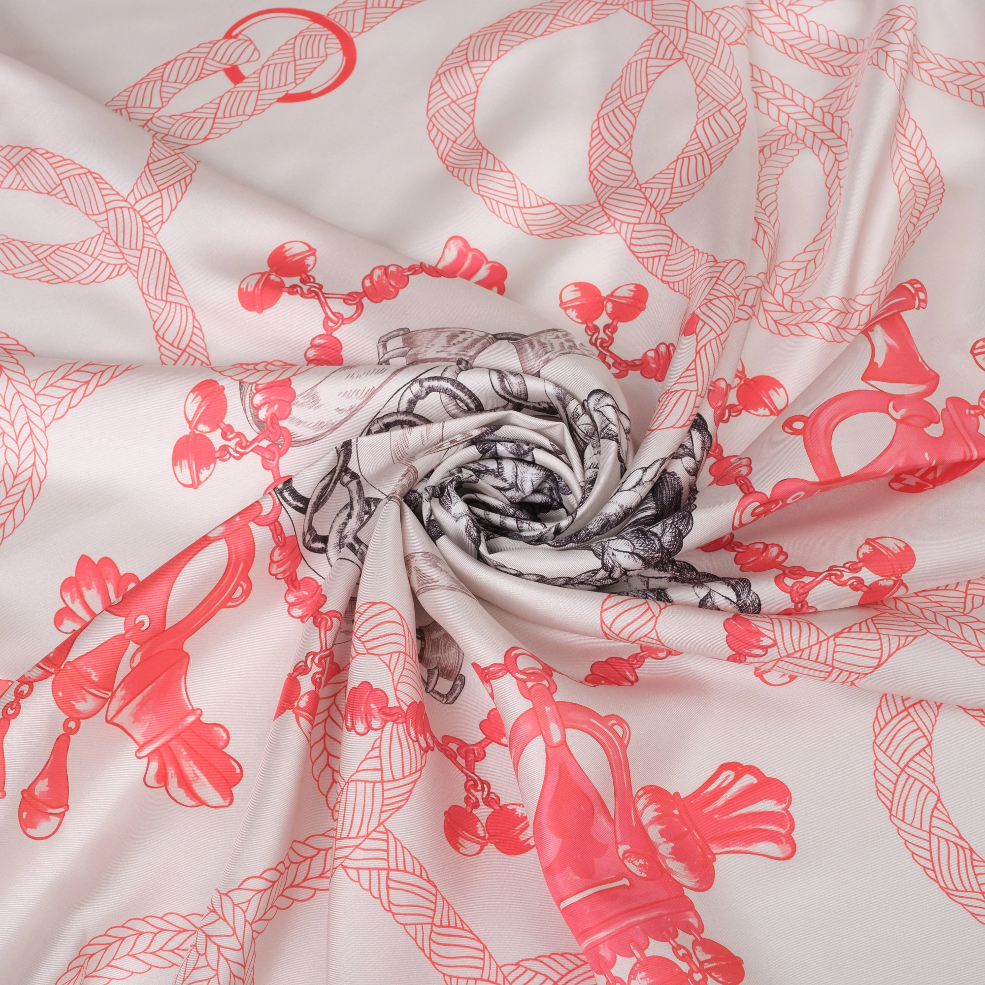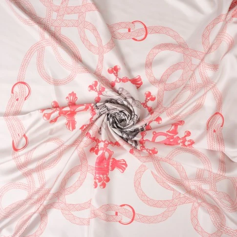 Na jasnym, kremowym tle rozciąga się wyrazista kompozycja inspirowana motywami jeździeckimi – splecione liny, elementy uprzęży oraz dekoracyjne detale w odcieniach czerwieni i szarości. Panelowy układ wzoru pozwala na tworzenie przemyślanych, designerskich form, w których nadruk staje się kluczowym elementem projektu.