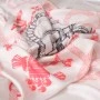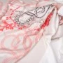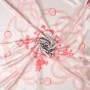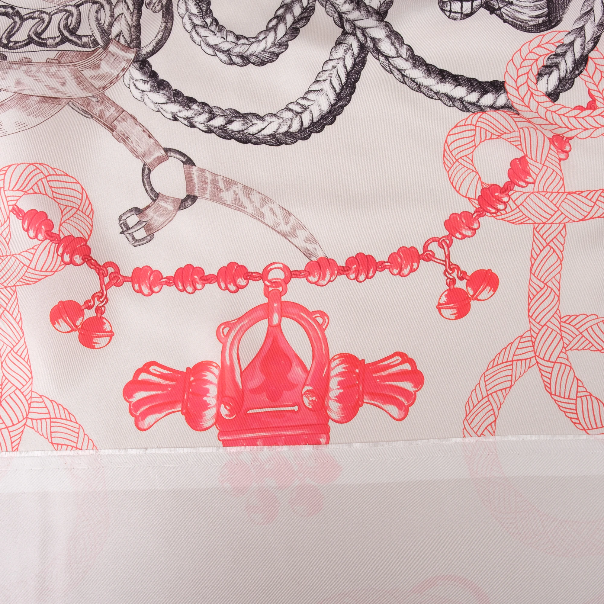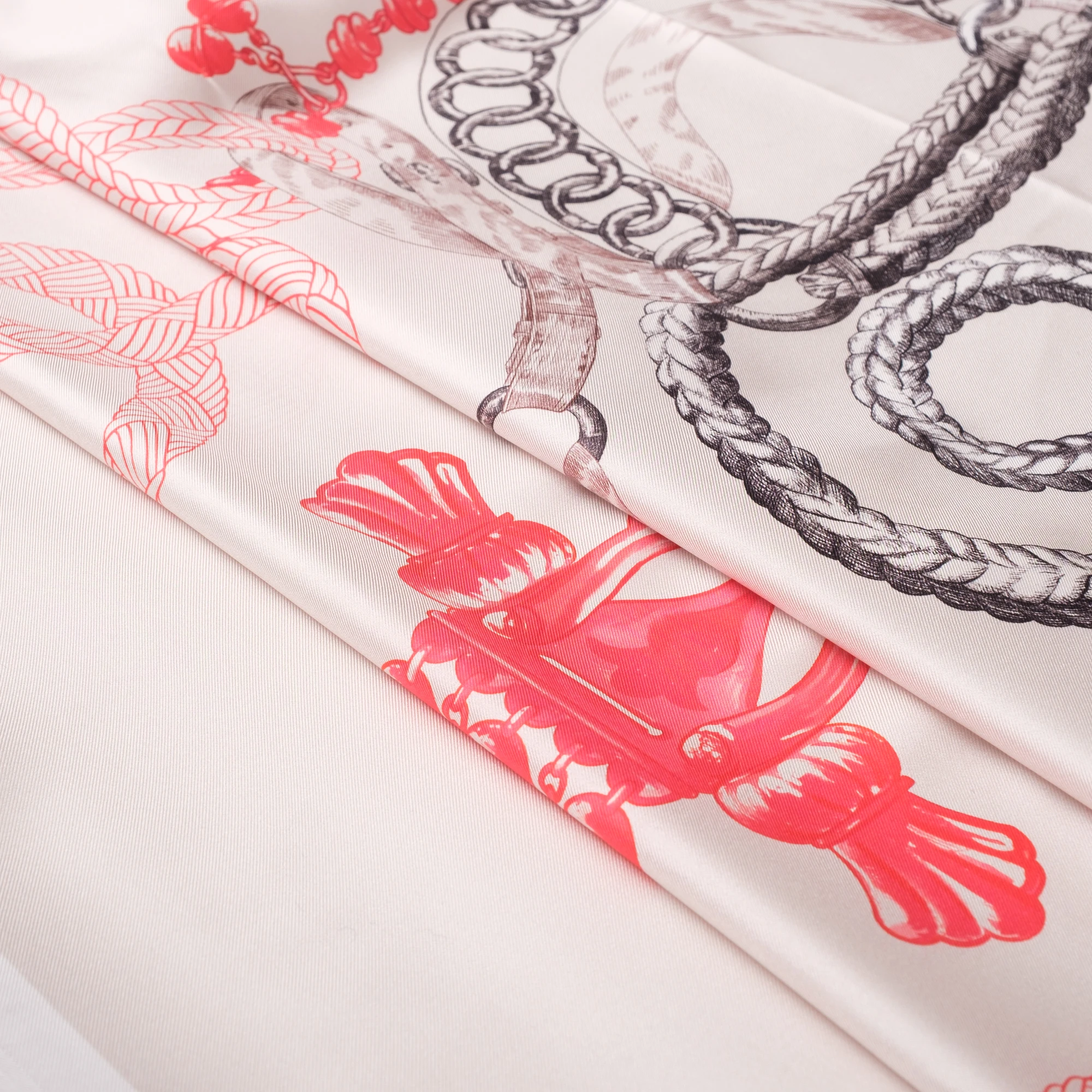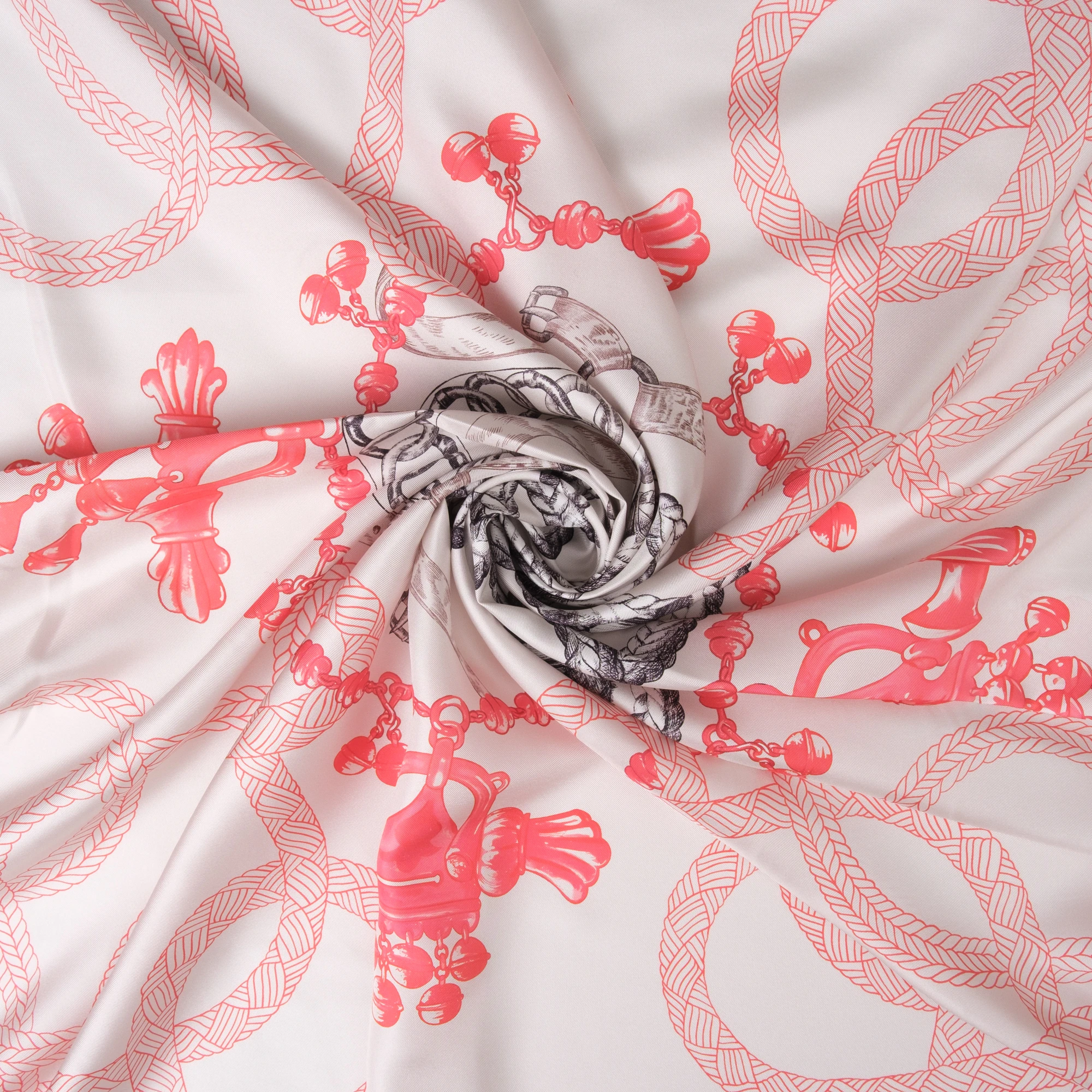 Na jasnym, kremowym tle rozciąga się wyrazista kompozycja inspirowana motywami jeździeckimi – splecione liny, elementy uprzęży oraz dekoracyjne detale w odcieniach czerwieni i szarości. Panelowy układ wzoru pozwala na tworzenie przemyślanych, designerskich form, w których nadruk staje się kluczowym elementem projektu.