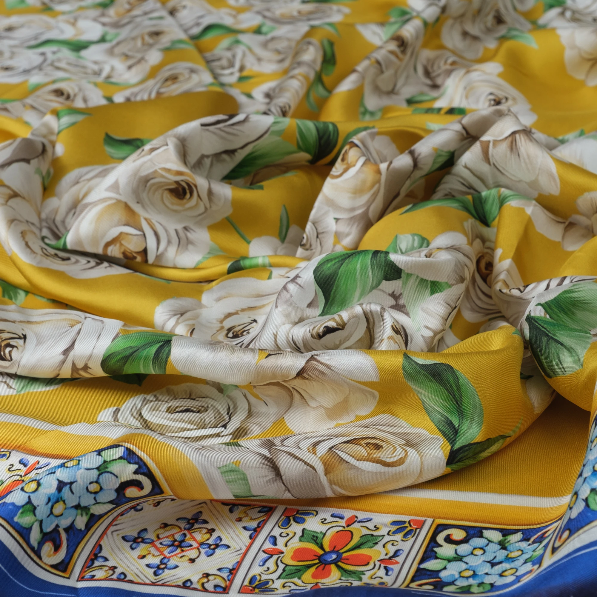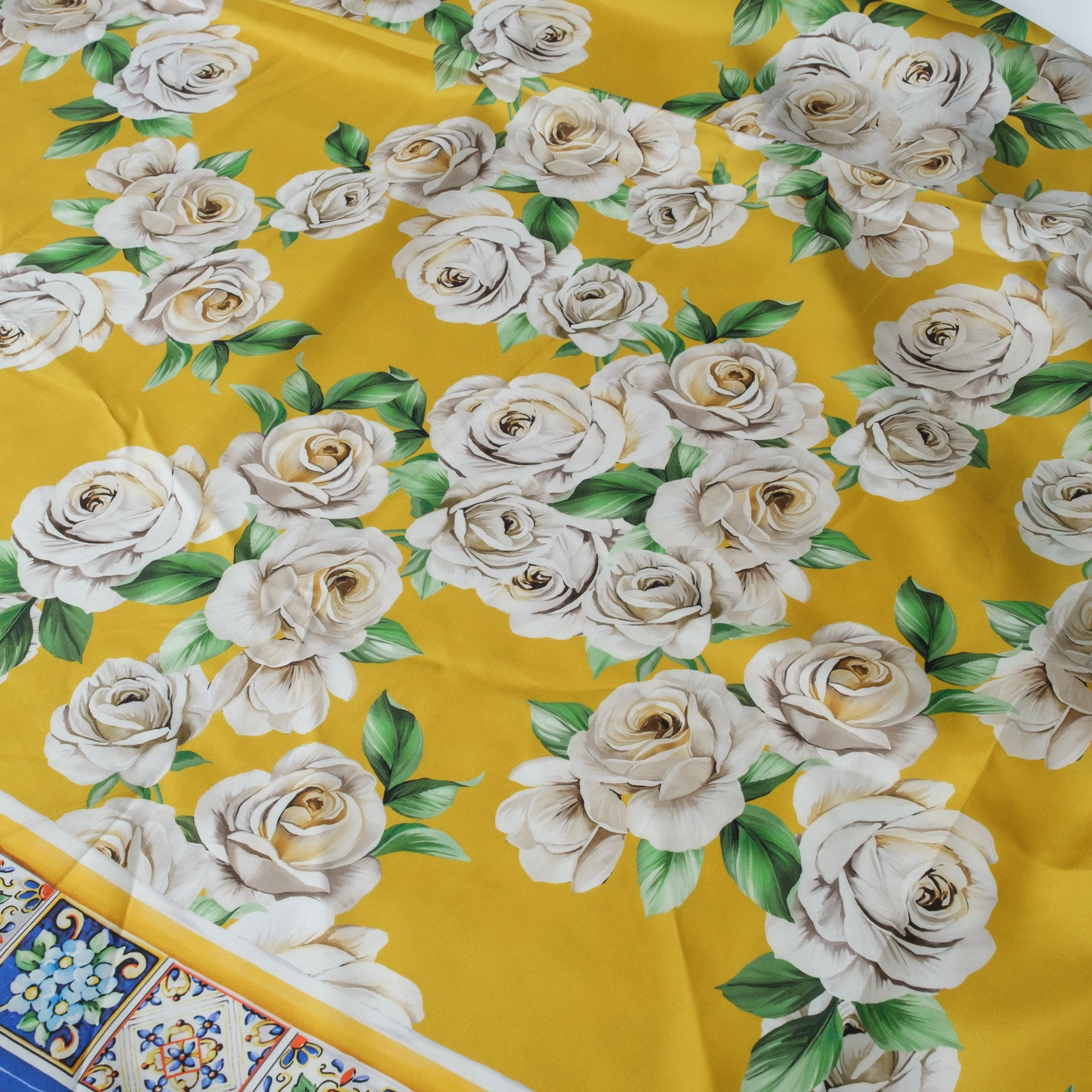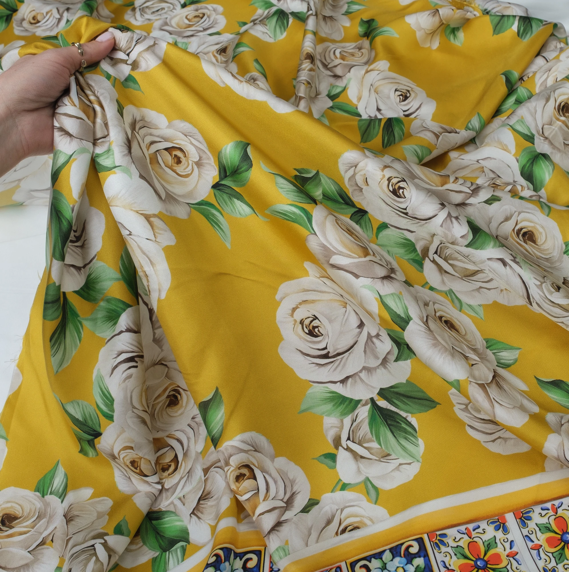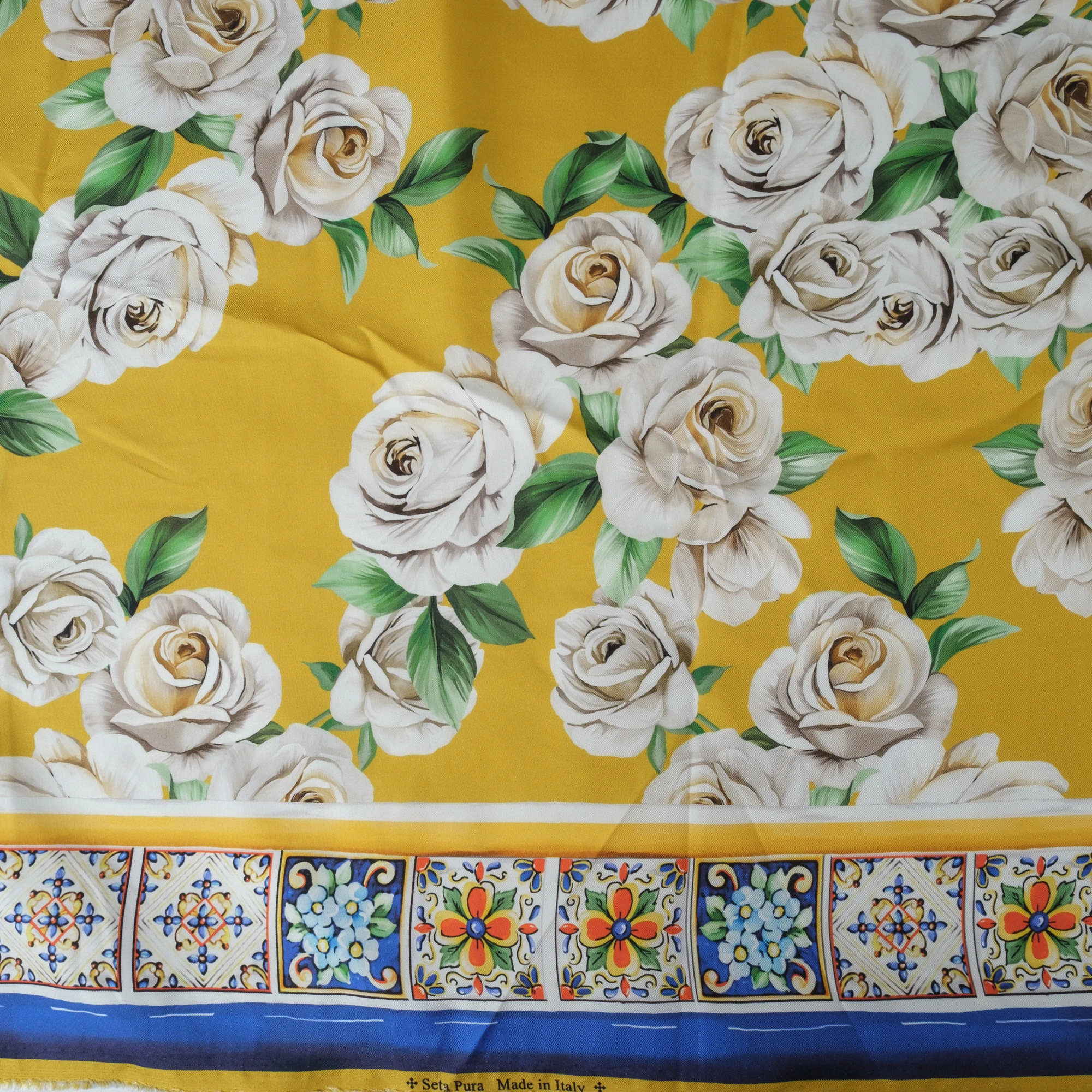 Wyrazista, słoneczna baza w odcieniu intensywnej żółci stanowi idealne tło dla dużych, romantycznych motywów róż w kremowo-beżowej tonacji, uzupełnionych świeżą zielenią liści. Całość dopełnia dekoracyjny, bordiurowy pas inspirowany ornamentyką śródziemnomorską – z geometryczno-kwiatowymi wzorami w odcieniach błękitu, czerwieni i złamanej bieli, który dodaje tkaninie unikatowego, artystycznego wyrazu.