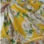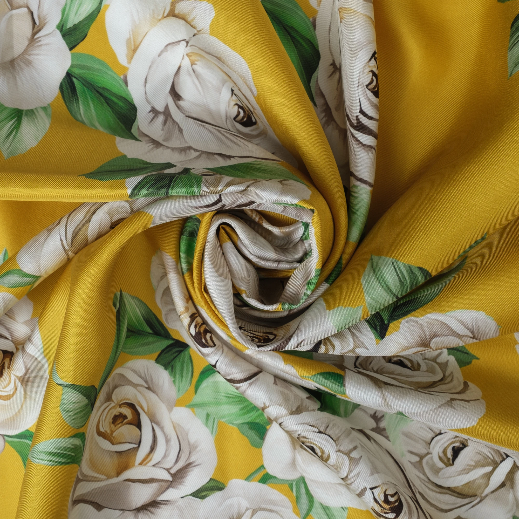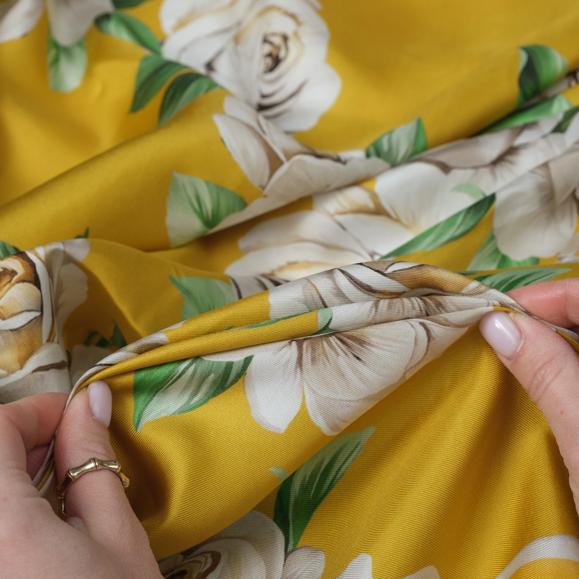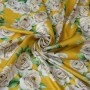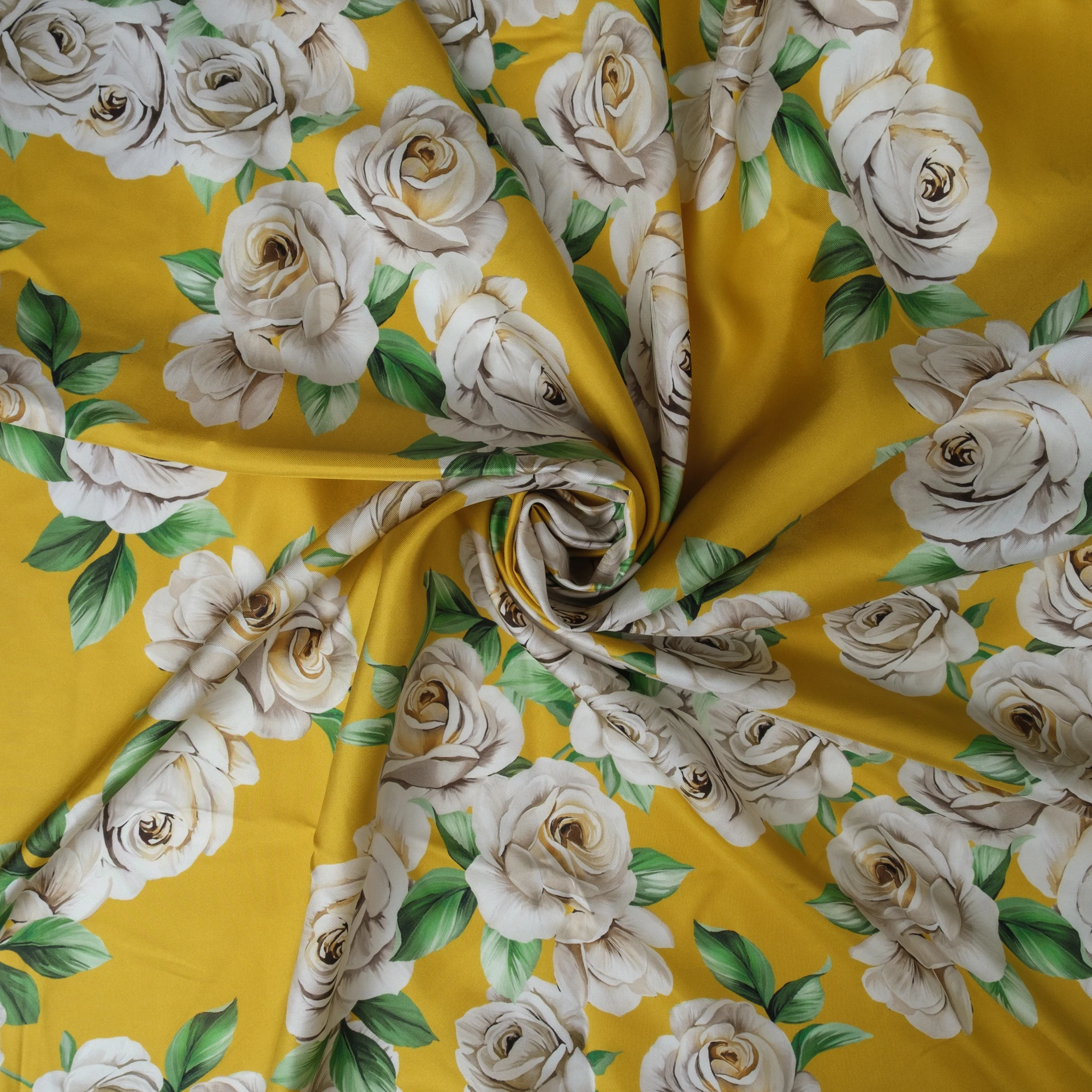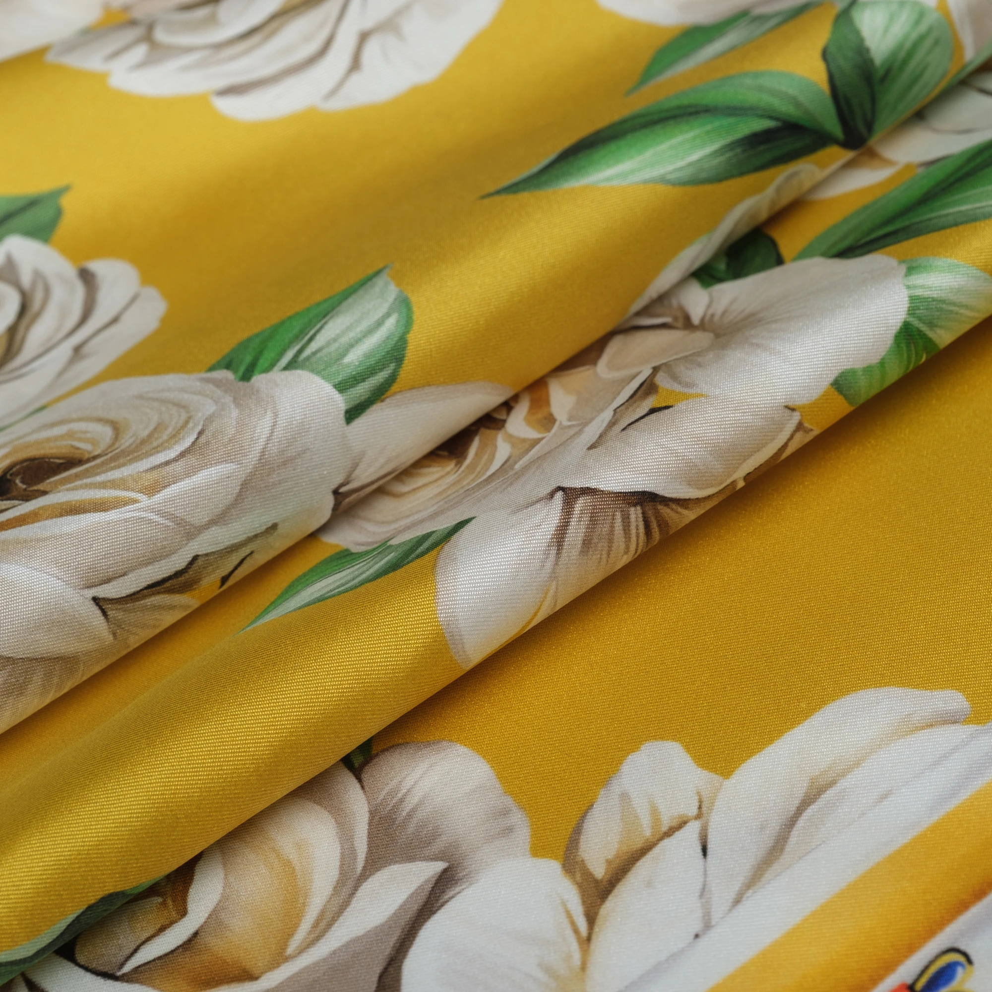 Wyrazista, słoneczna baza w odcieniu intensywnej żółci stanowi idealne tło dla dużych, romantycznych motywów róż w kremowo-beżowej tonacji, uzupełnionych świeżą zielenią liści. Całość dopełnia dekoracyjny, bordiurowy pas inspirowany ornamentyką śródziemnomorską – z geometryczno-kwiatowymi wzorami w odcieniach błękitu, czerwieni i złamanej bieli, który dodaje tkaninie unikatowego, artystycznego wyrazu.