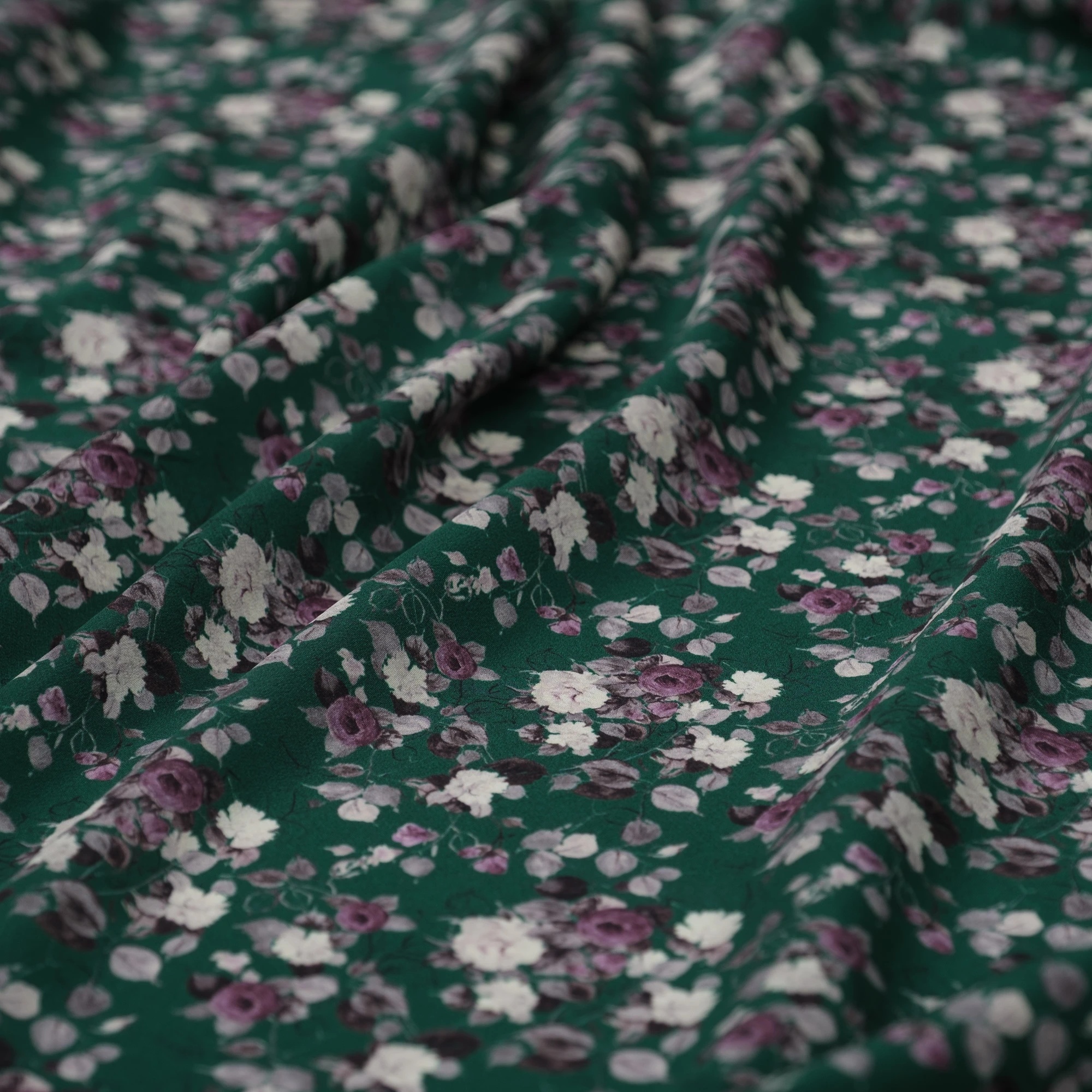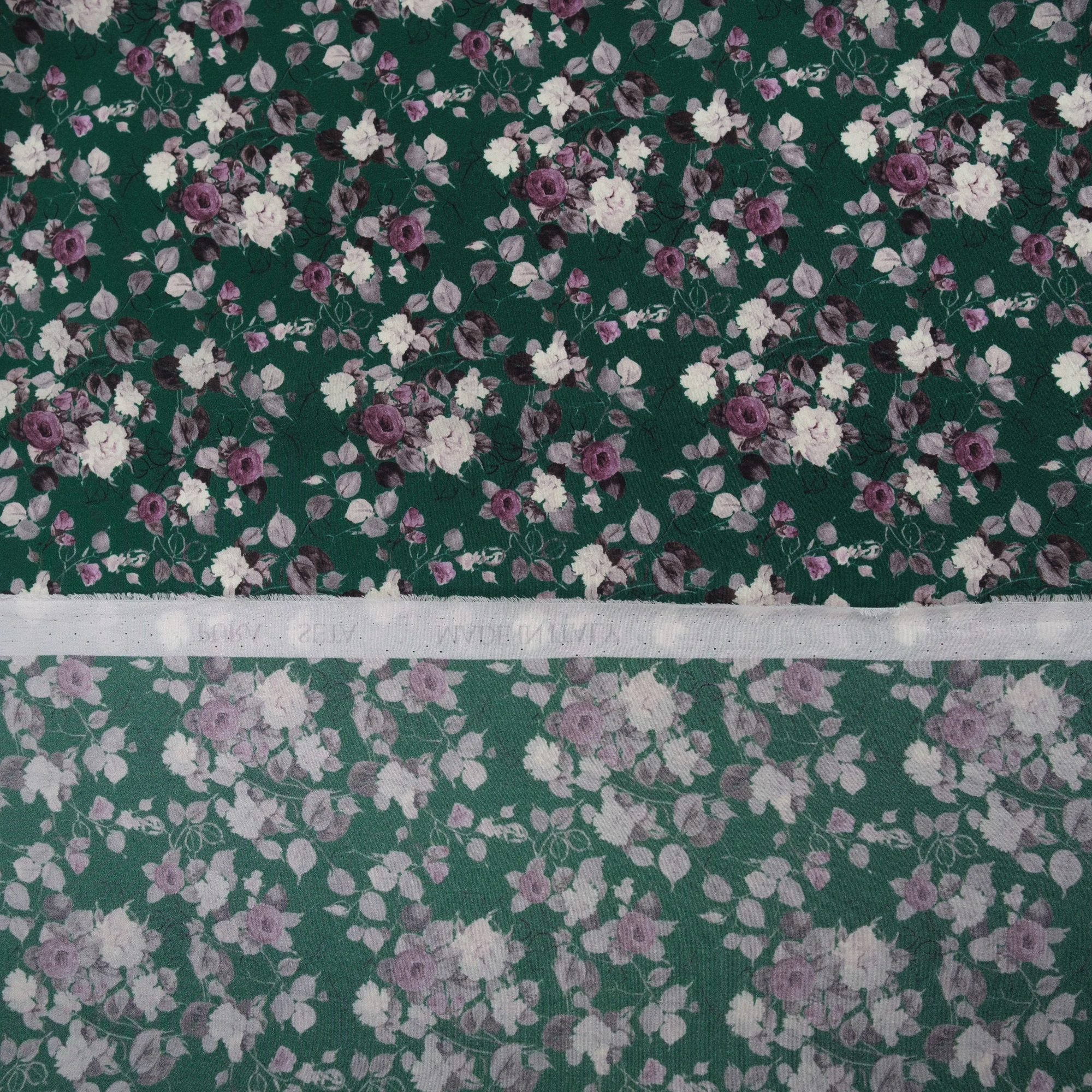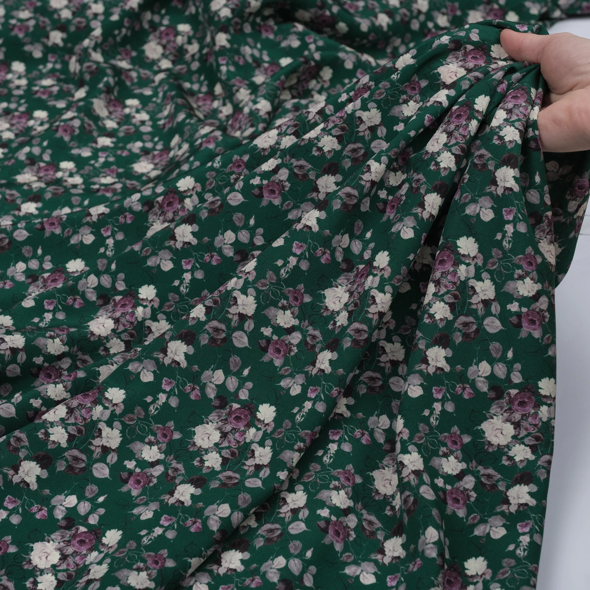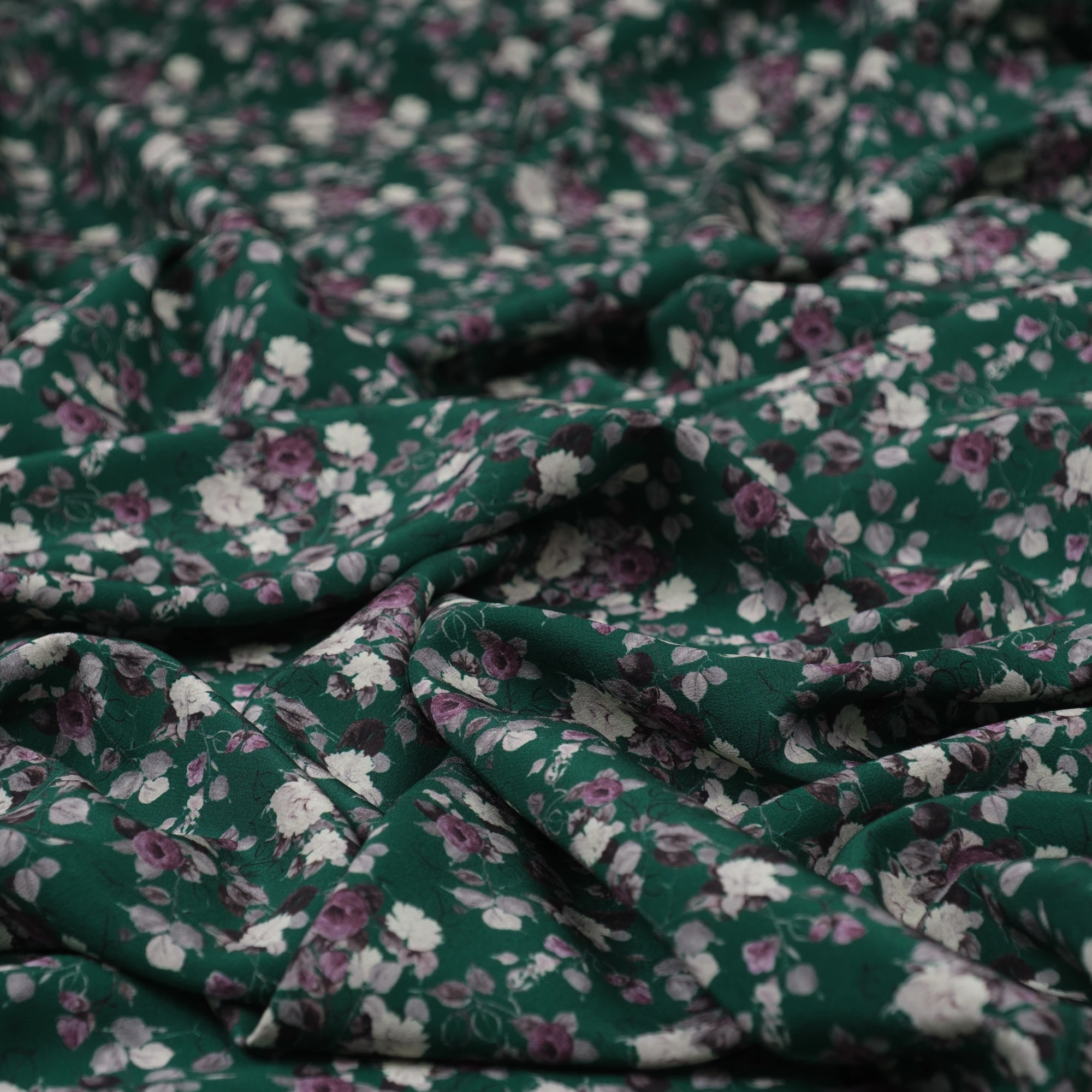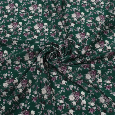 Luksusowa krepa jedwabna 100% o wyjątkowo miękkim chwycie i delikatnej fakturze. Wzór w drobne kwiaty w odcieniach fioletu, bieli i różu na tle butelkowej zieleni nadaje tkaninie elegancji i romantycznego charakteru. Doskonale sprawdzi się na sukienki, bluzki, koszule, spódnice czy chusty. Naturalny jedwab włoski charakteryzuje się doskonałą przewiewnością i subtelnym, matowym połyskiem.
