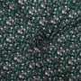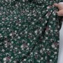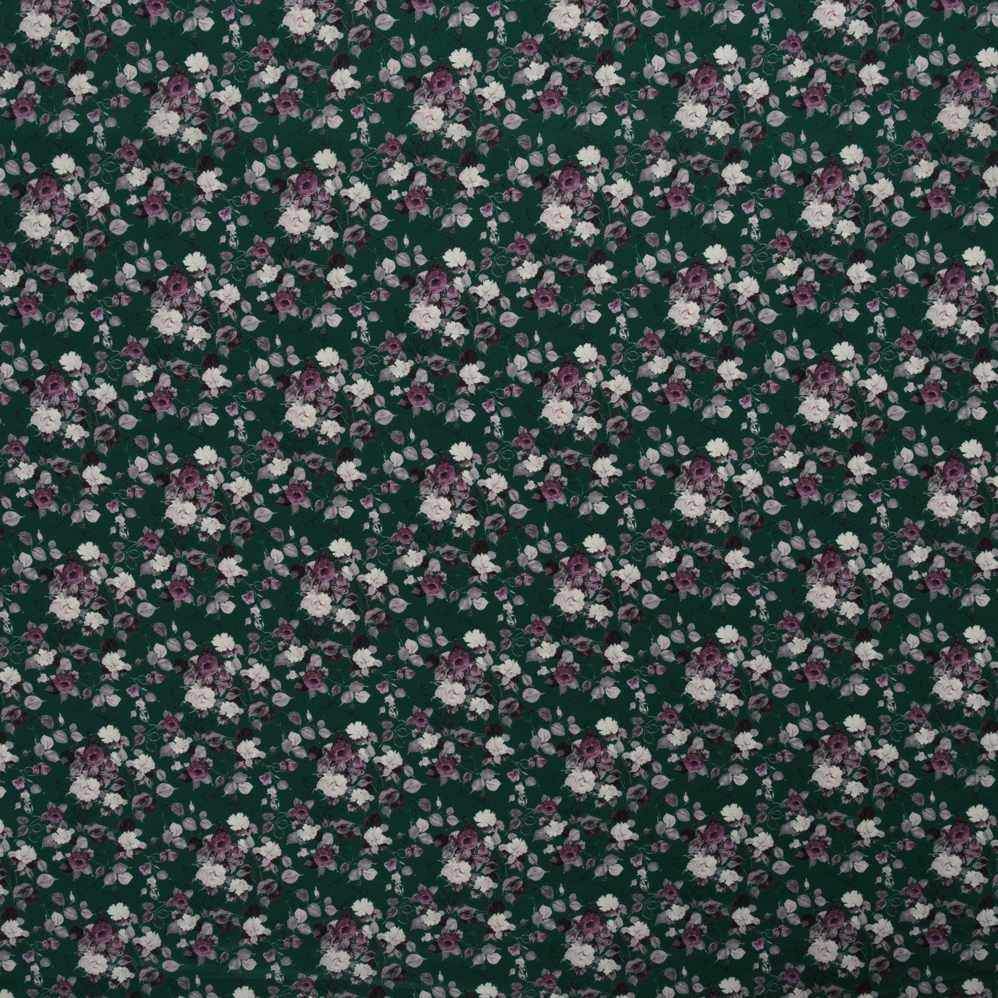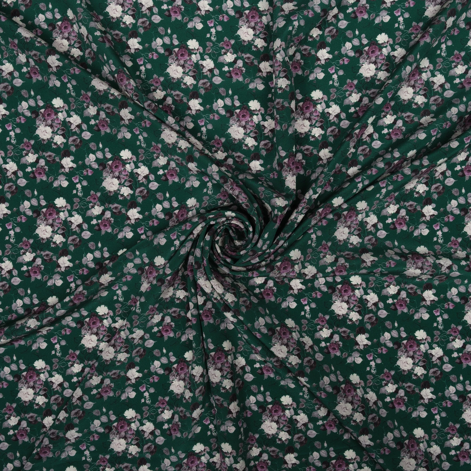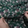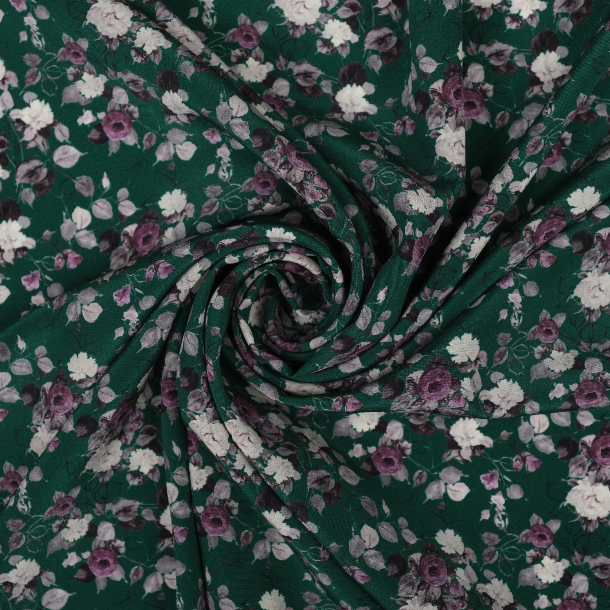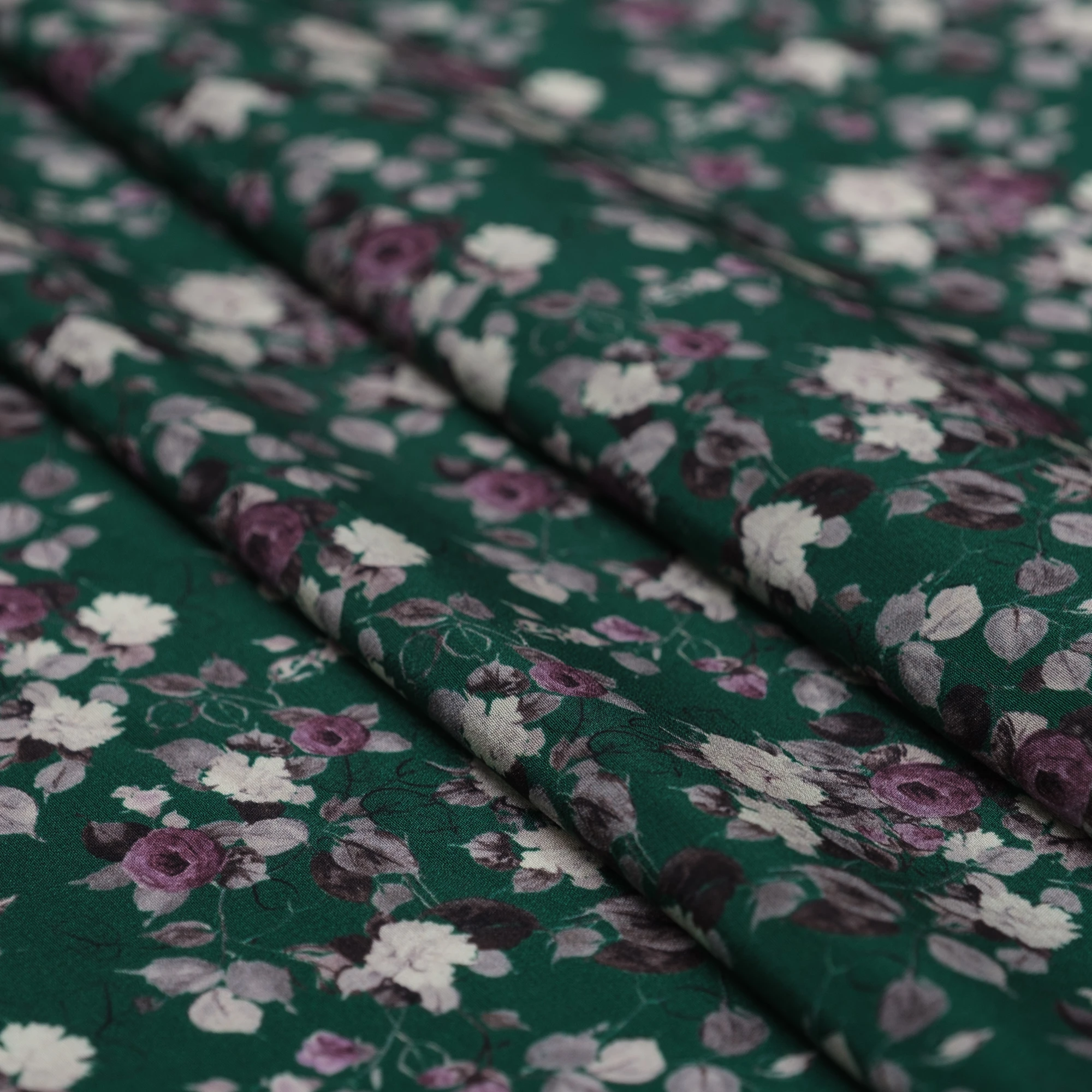 Luksusowa krepa jedwabna 100% o wyjątkowo miękkim chwycie i delikatnej fakturze. Wzór w drobne kwiaty w odcieniach fioletu, bieli i różu na tle butelkowej zieleni nadaje tkaninie elegancji i romantycznego charakteru. Doskonale sprawdzi się na sukienki, bluzki, koszule, spódnice czy chusty. Naturalny jedwab włoski charakteryzuje się doskonałą przewiewnością i subtelnym, matowym połyskiem.