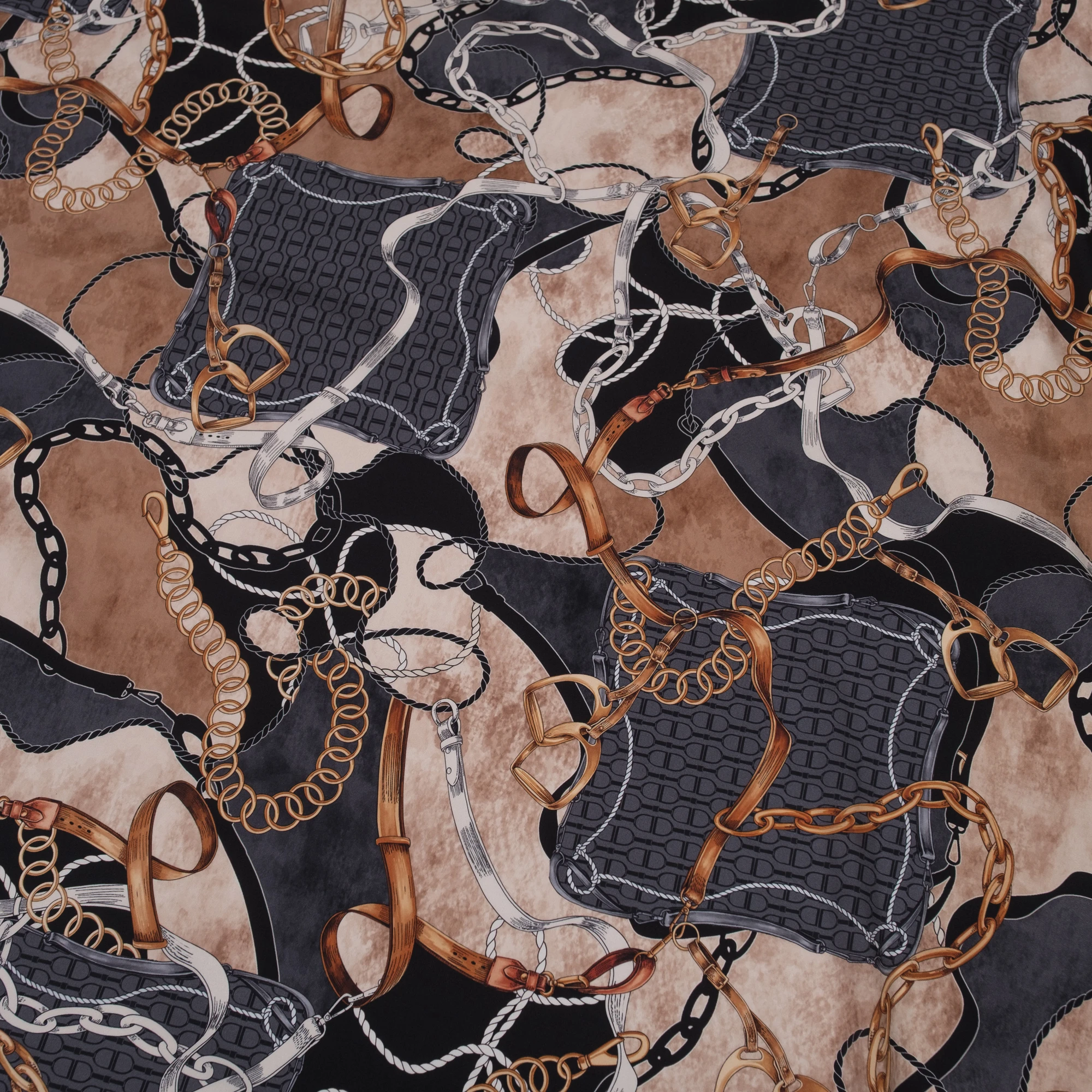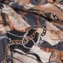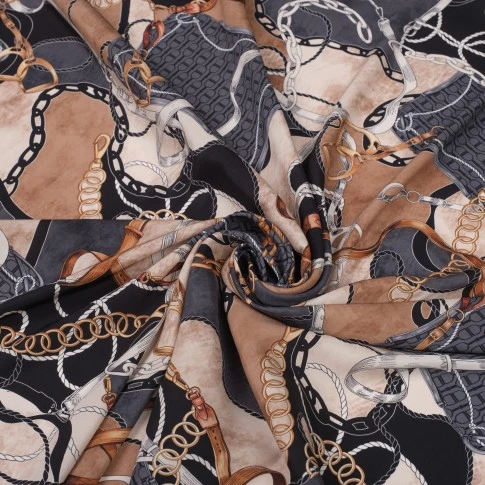 Luksusowa satyna jedwabna z elastanem o wyjątkowym, eleganckim wzorze inspirowanym motywem łańcuchów i skórzanych pasków, nadrukowanym na matowej stronie. Wykonana z 95% naturalnego jedwabiu i 5% elastanu, zachwyca miękkością, subtelnym połyskiem i delikatną elastycznością. To ekskluzywna tkanina jedwabna z Włoch, idealna na sukienki, bluzki, koszule, spódnice czy luksusowe dodatki.