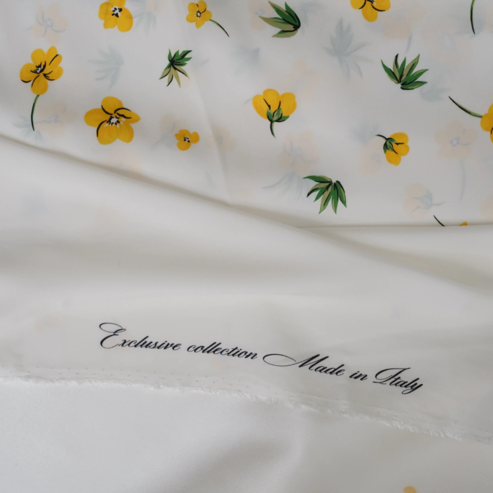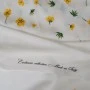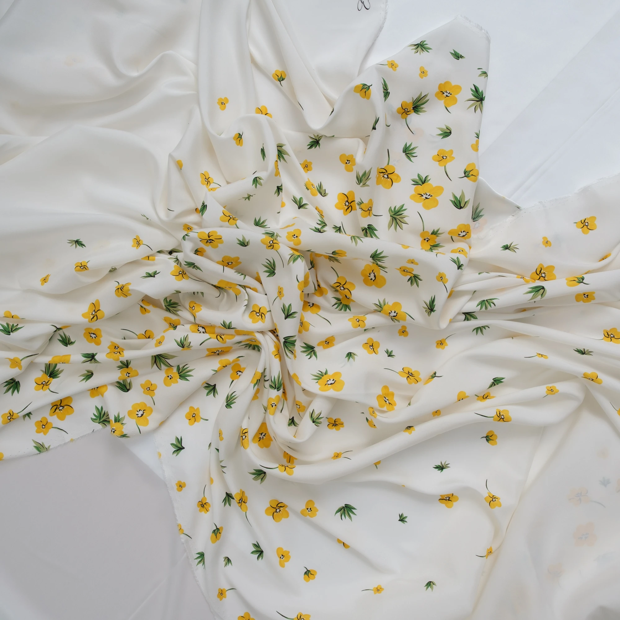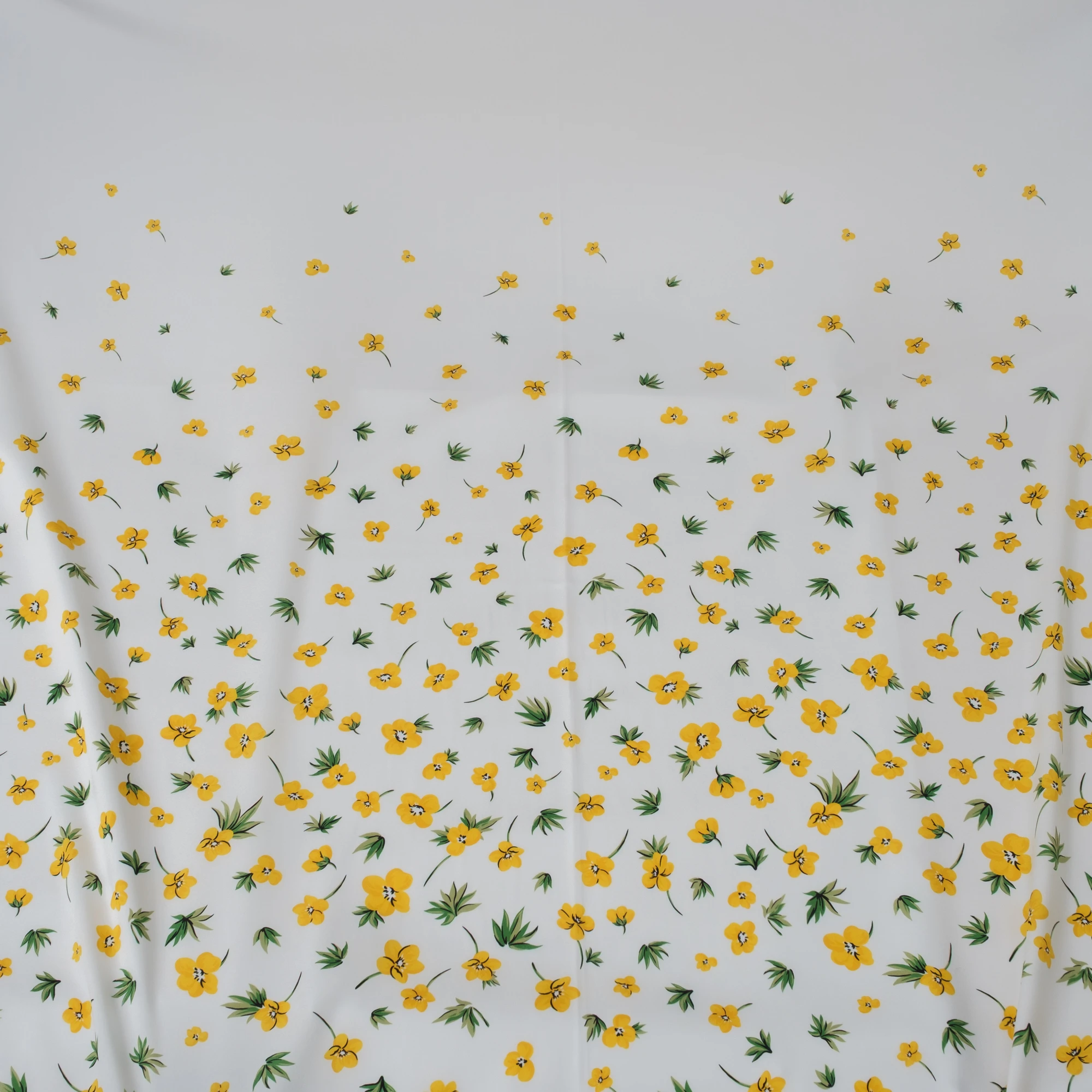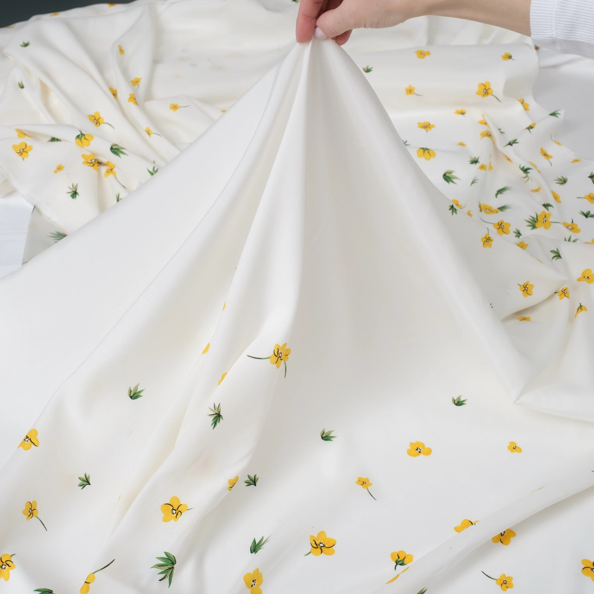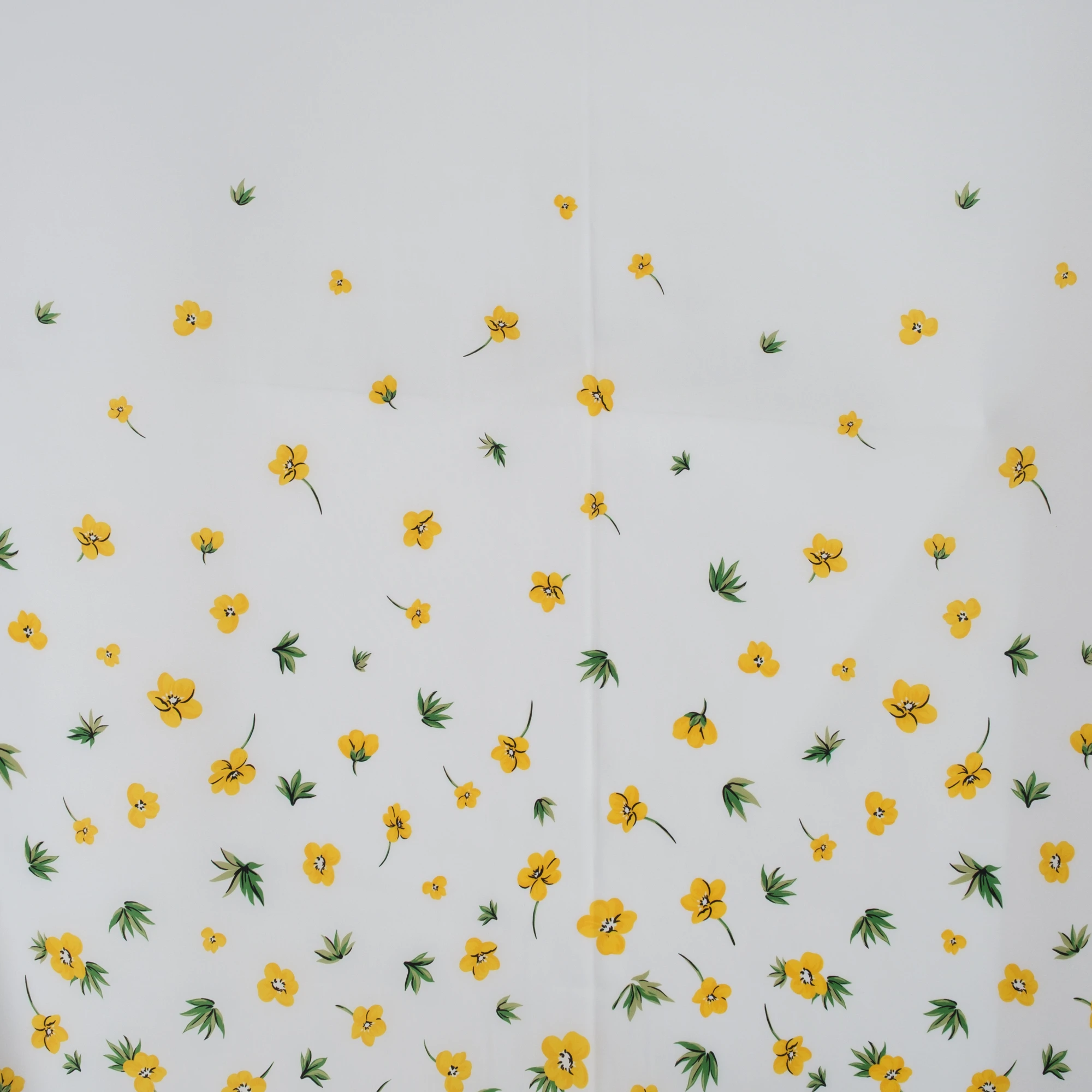 Ekskluzywny panel z elastycznej satyny jedwabnej o wymiarach 130 × 140 cm, zaprojektowany z myślą o wyjątkowych, dopracowanych projektach. Na jasnym, eleganckim tle rozmieszczony został delikatny, kwiatowy motyw w odcieniach żółci i zieleni, który subtelnie zagęszcza się ku dołowi, tworząc efekt naturalnej kompozycji.