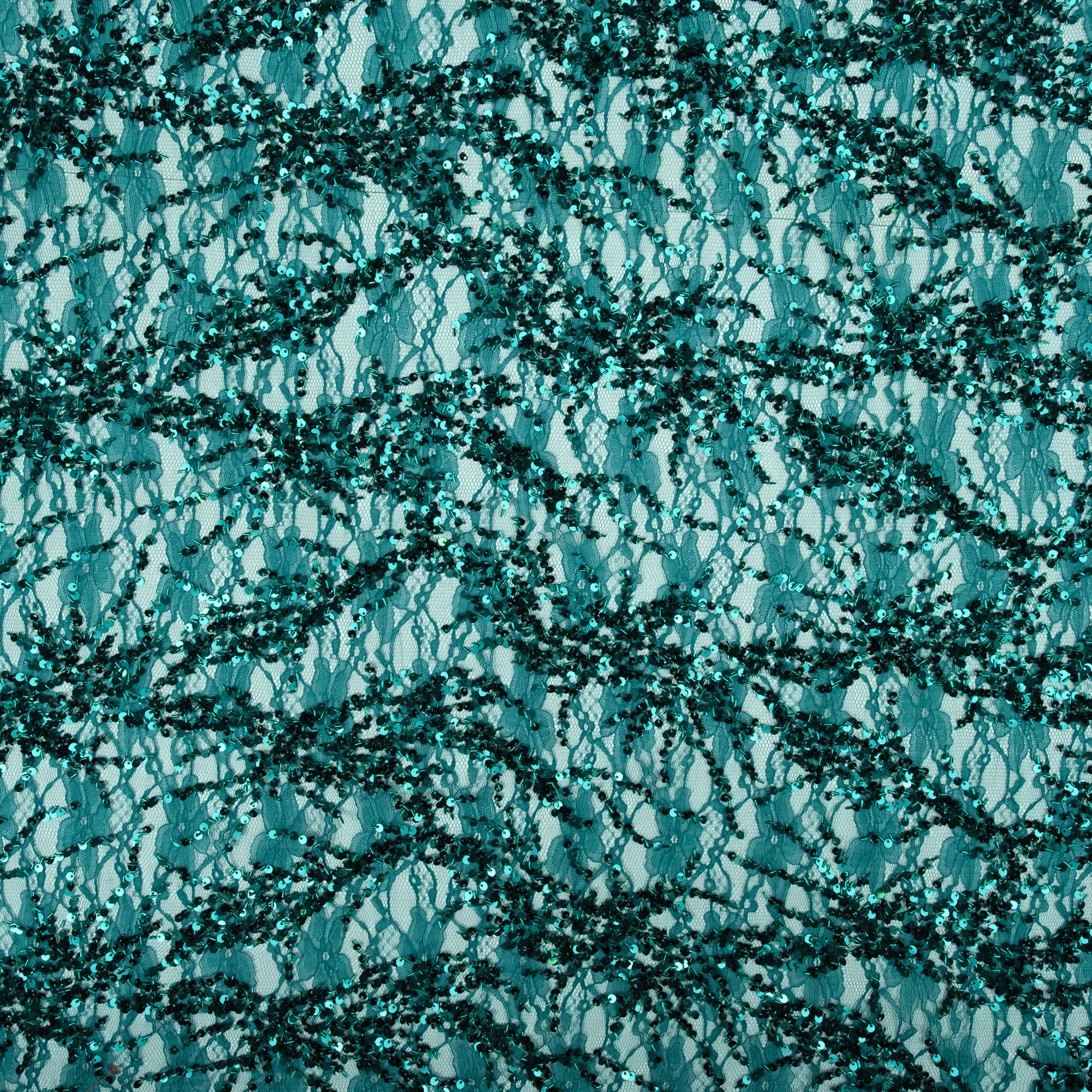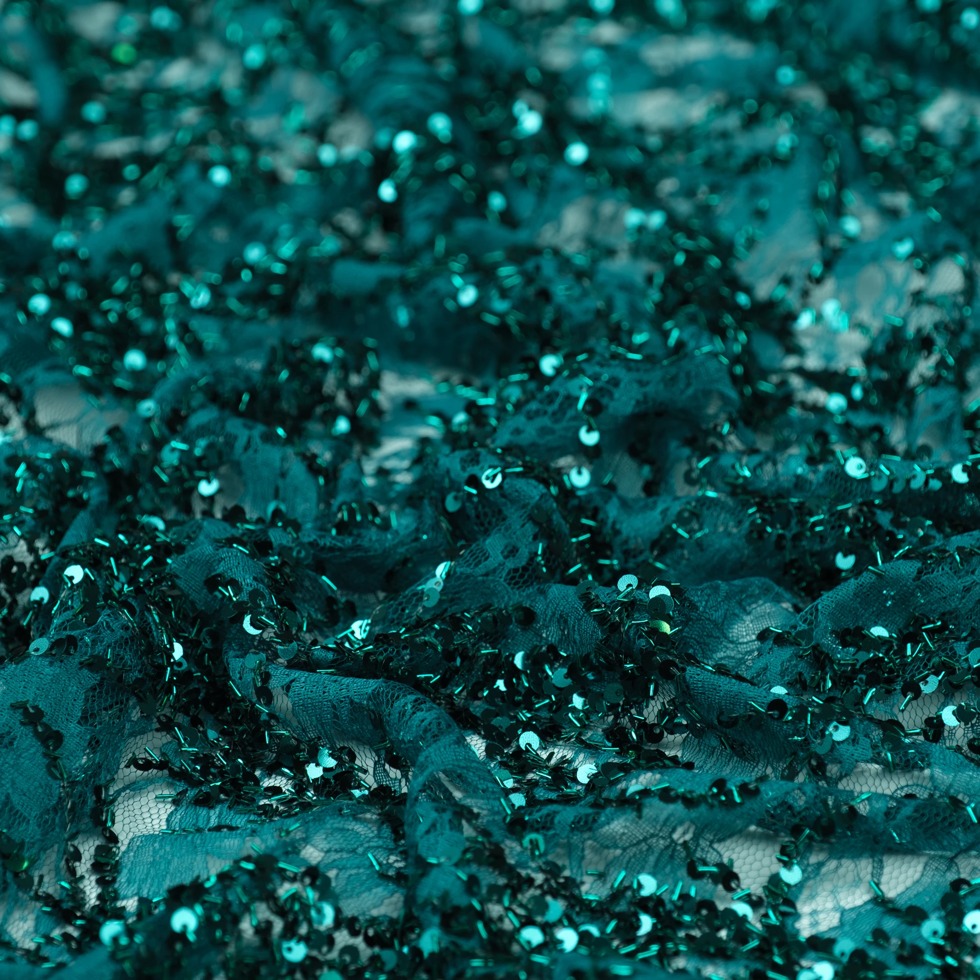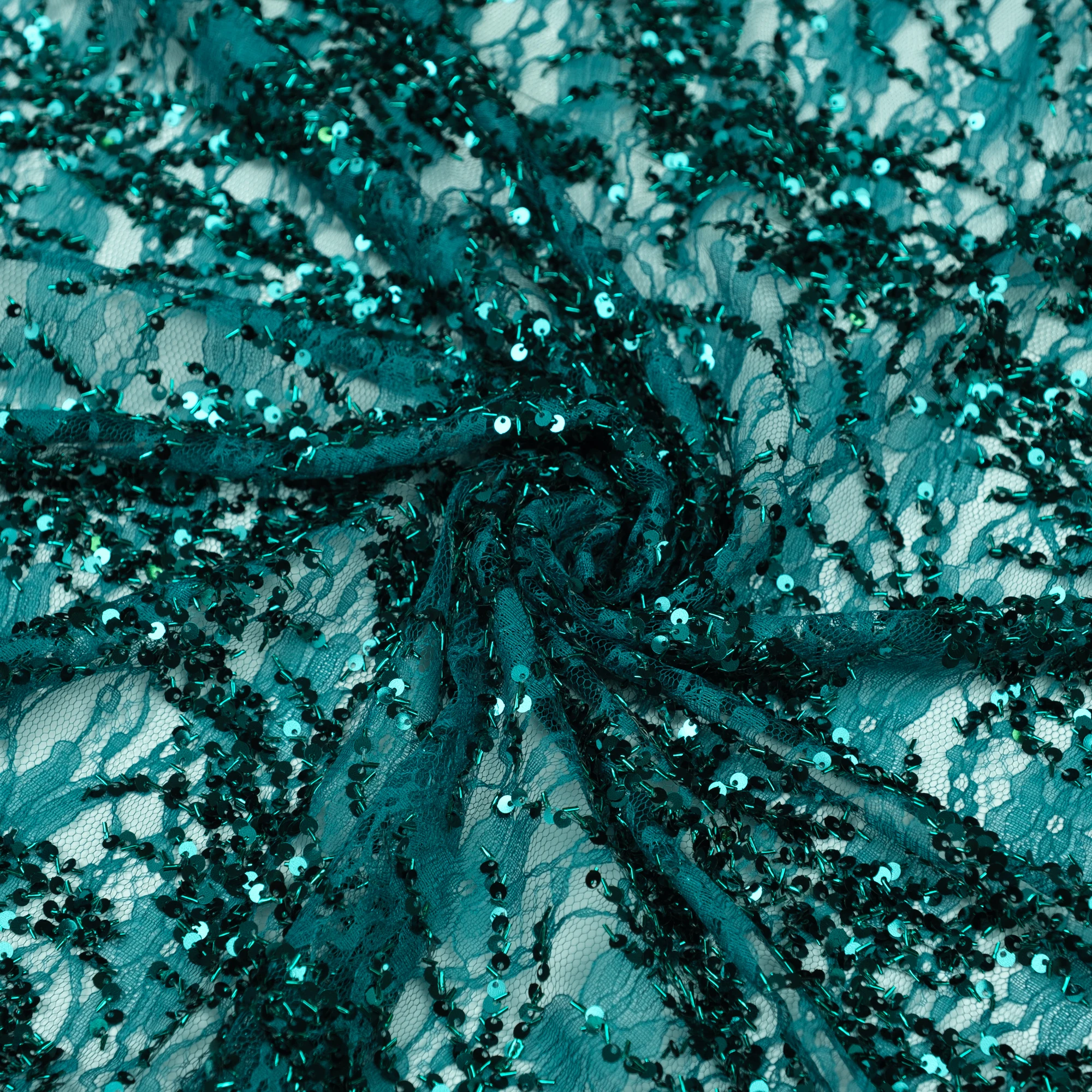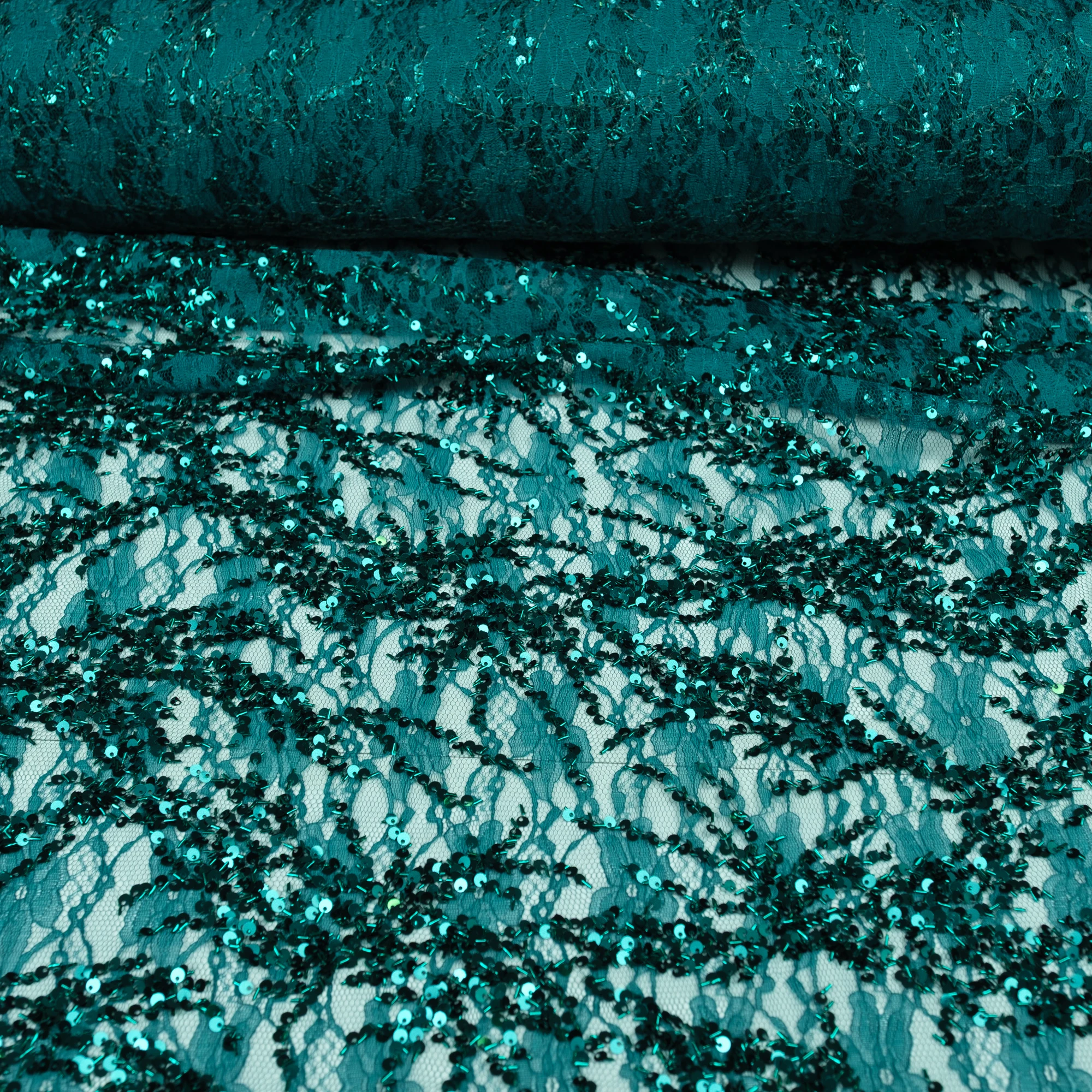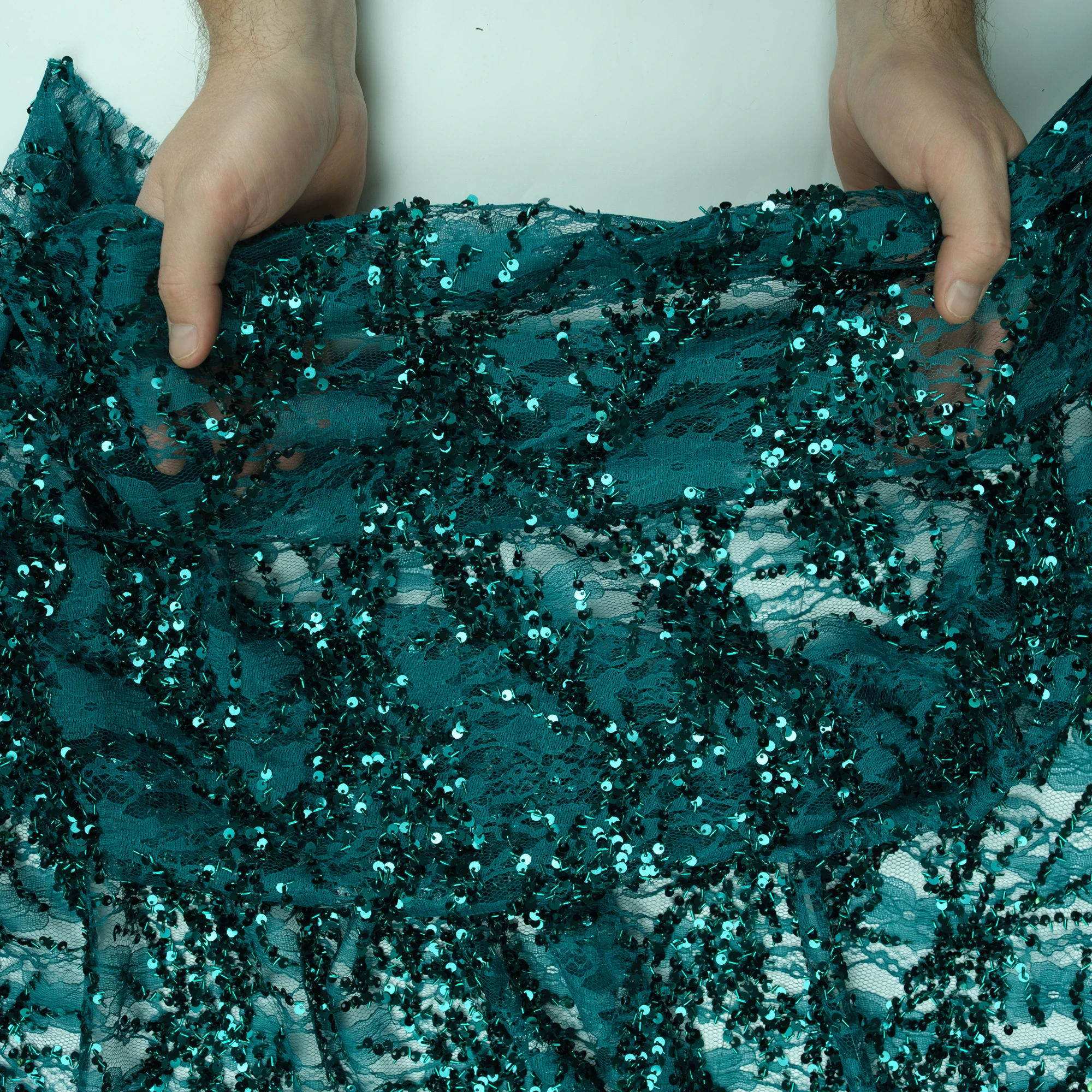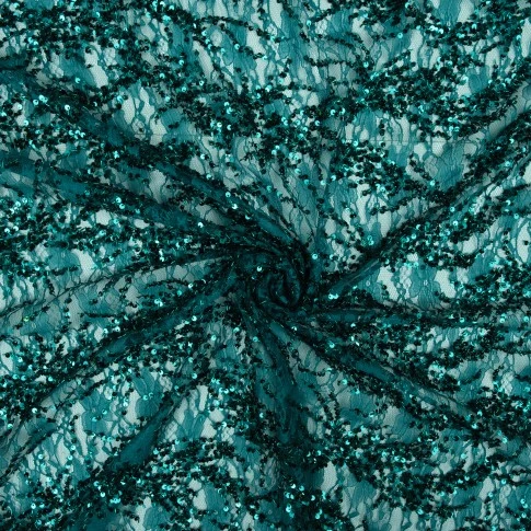 Zjawiskowa tkanina koronkowa z cekinami w kolorze szmaragdowym to propozycja dla osób ceniących elegancję i blask. Wykonana z wysokiej jakości materiałów łączy w sobie delikatność koronki z efektem glamour, dzięki drobnym, połyskującym cekinom rozmieszczonym na całej powierzchni materiału.