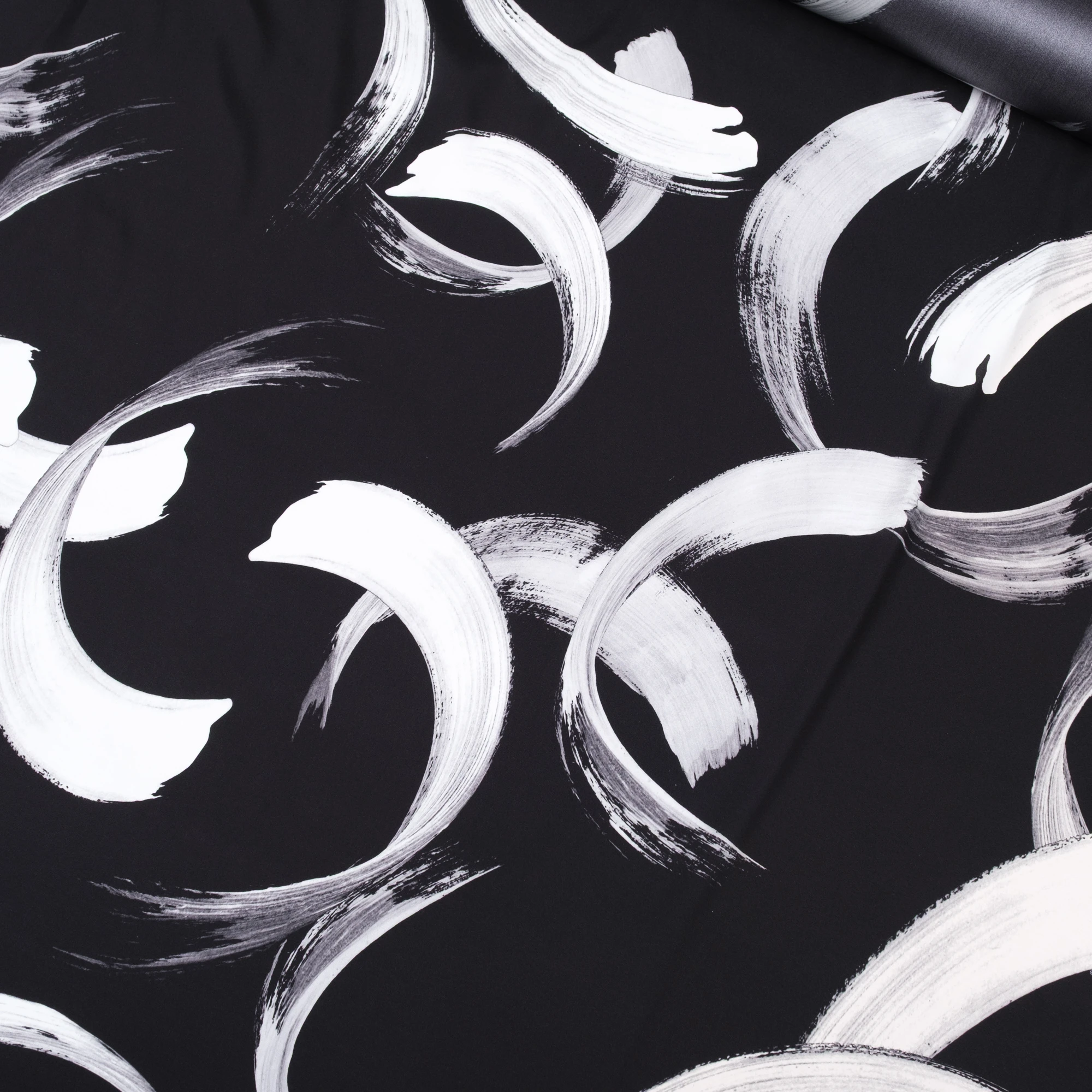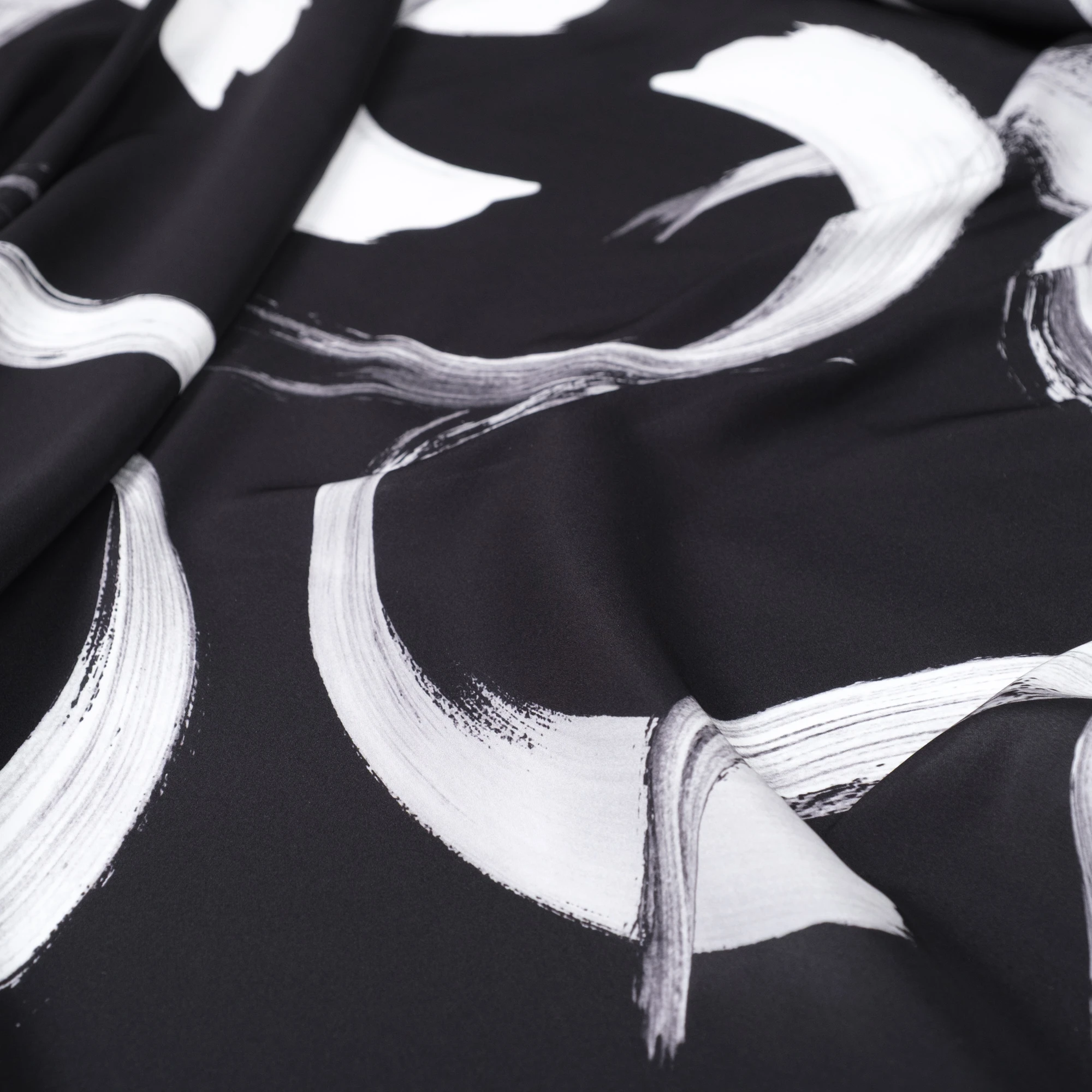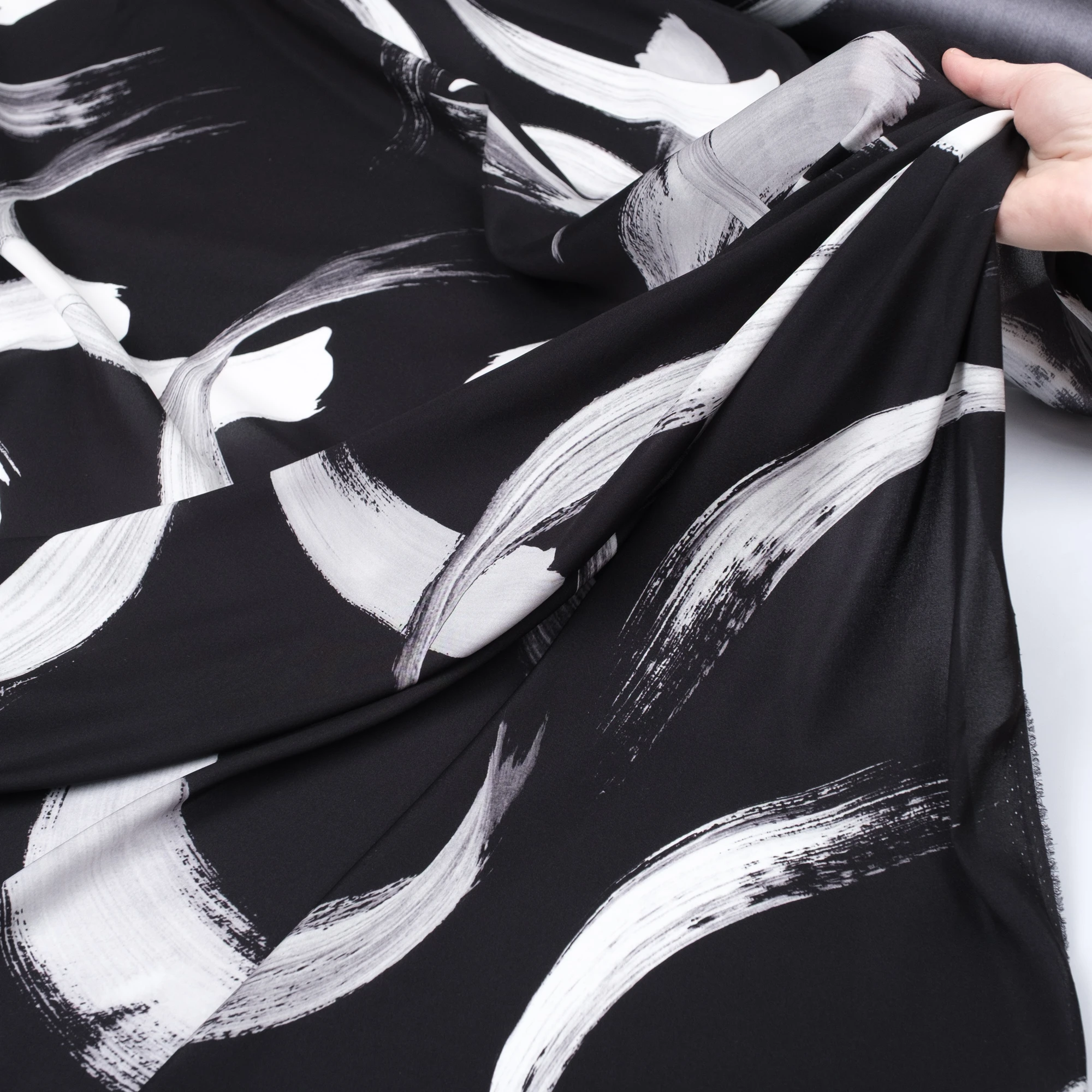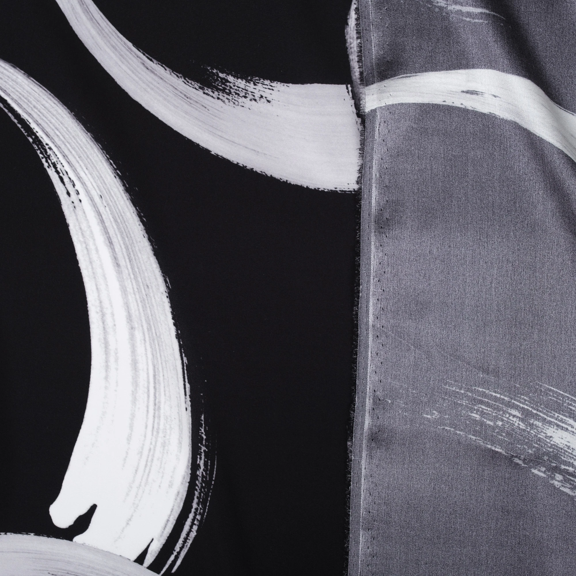 Elegancka satyna jedwabna najwyższej jakości, sprowadzona z Włoch. Tkanina zachwyca artystycznym, nowoczesnym wzorem przypominającym pociągnięcia pędzla w odcieniach czerni, bieli i szarości nadrukowanym na matowej stronie. Miękka, delikatna, a jednocześnie lekko elastyczna dzięki dodatkowi elastanu – doskonale dopasowuje się do sylwetki.