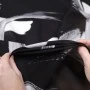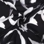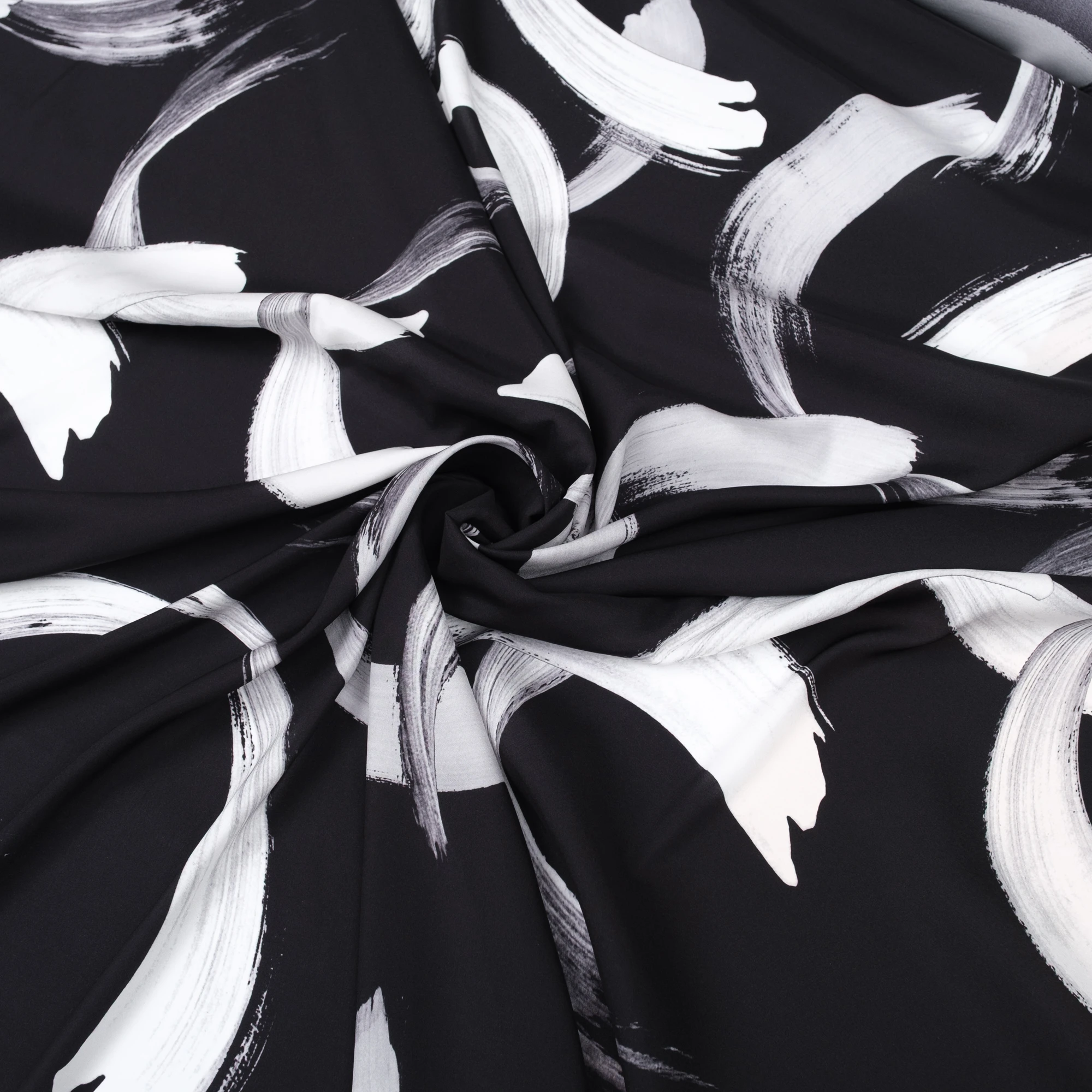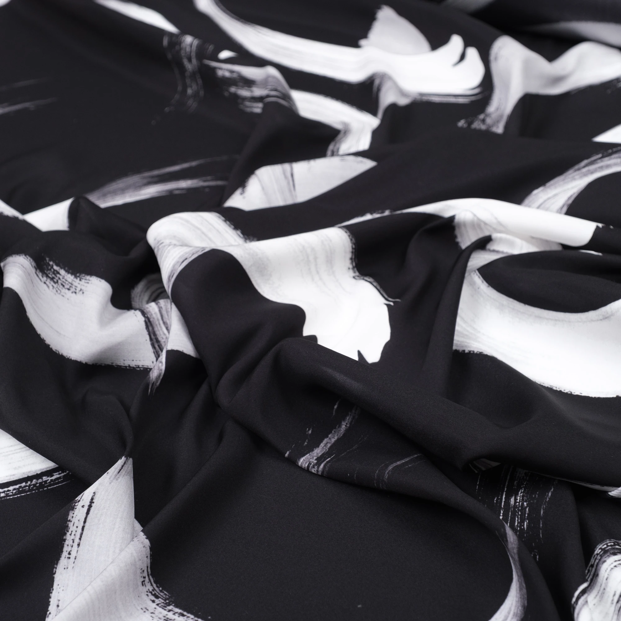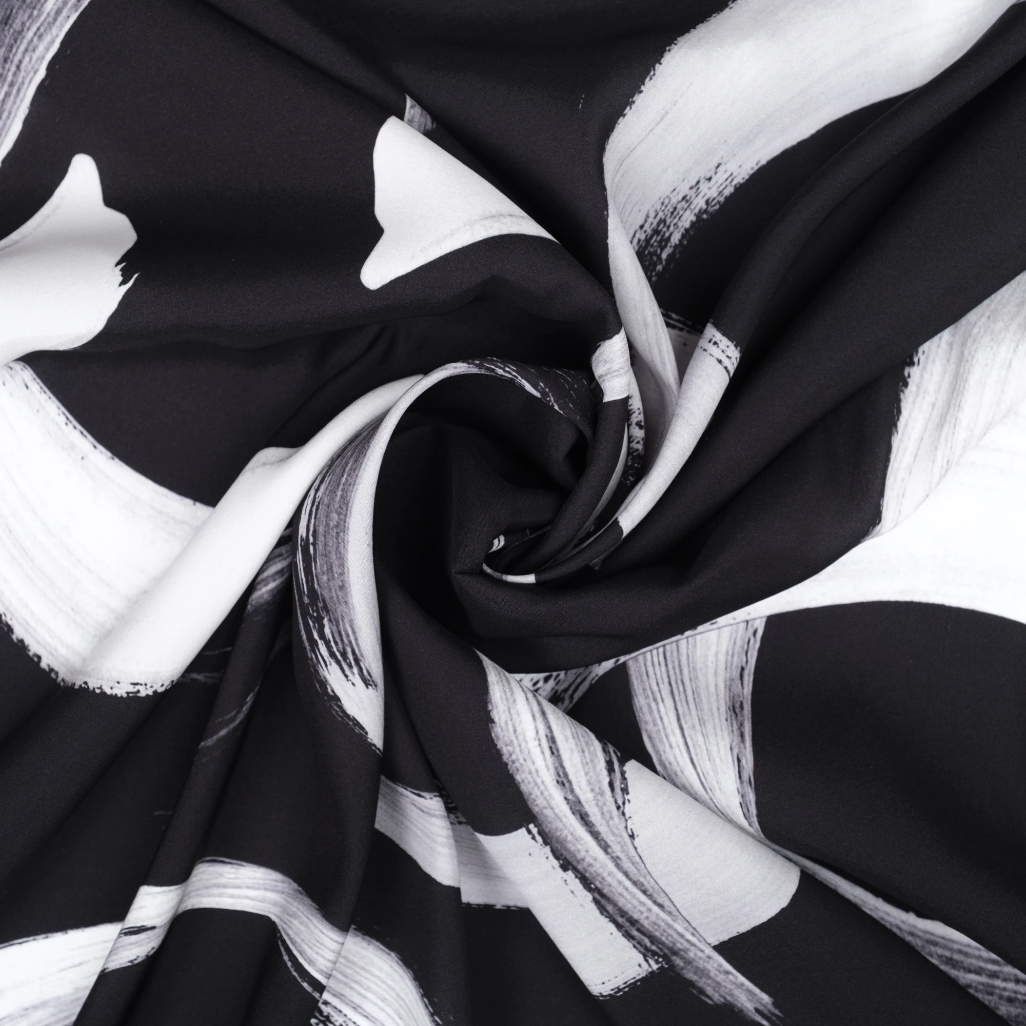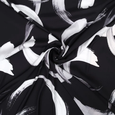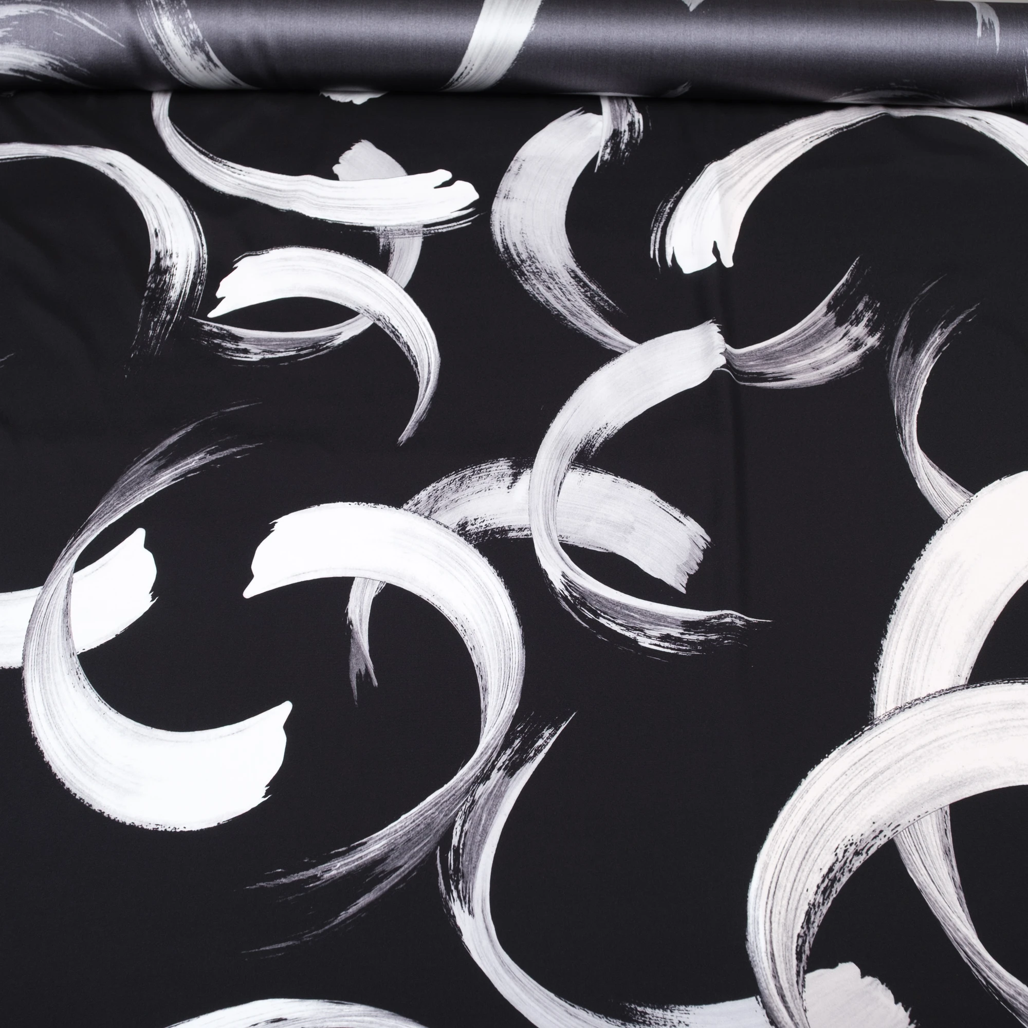 Elegancka satyna jedwabna najwyższej jakości, sprowadzona z Włoch. Tkanina zachwyca artystycznym, nowoczesnym wzorem przypominającym pociągnięcia pędzla w odcieniach czerni, bieli i szarości nadrukowanym na matowej stronie. Miękka, delikatna, a jednocześnie lekko elastyczna dzięki dodatkowi elastanu – doskonale dopasowuje się do sylwetki.