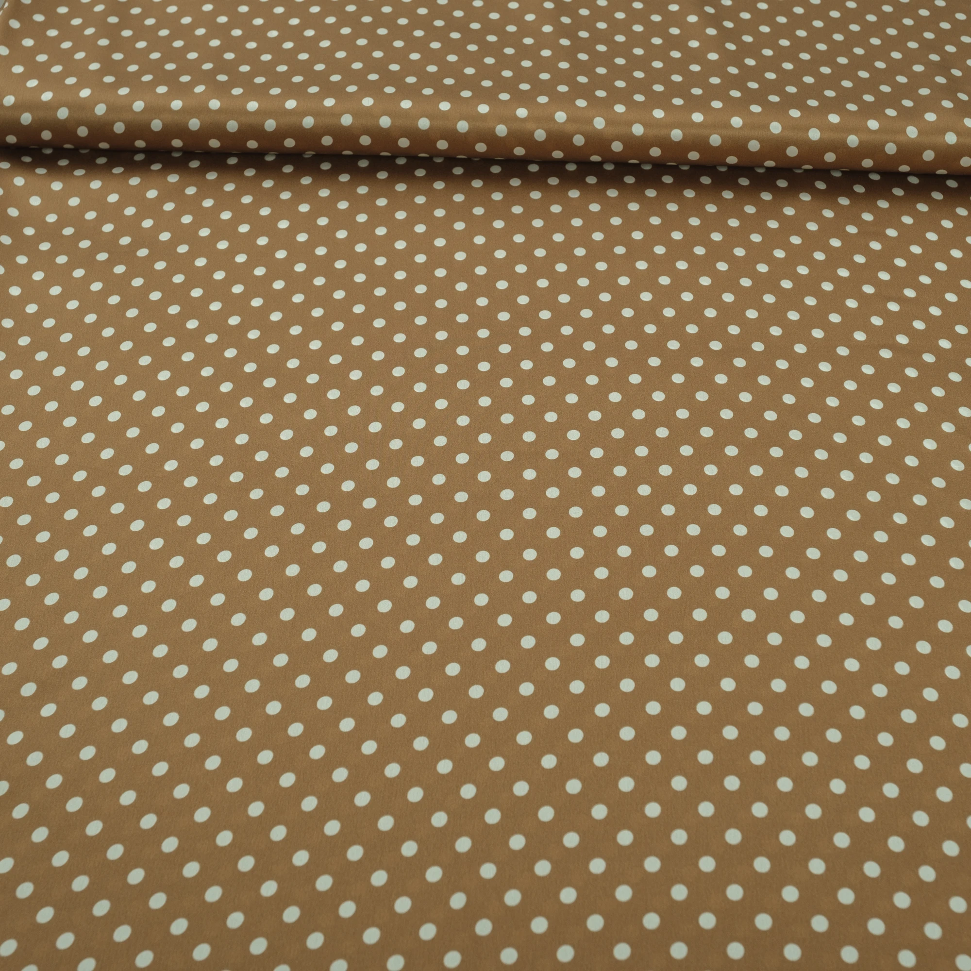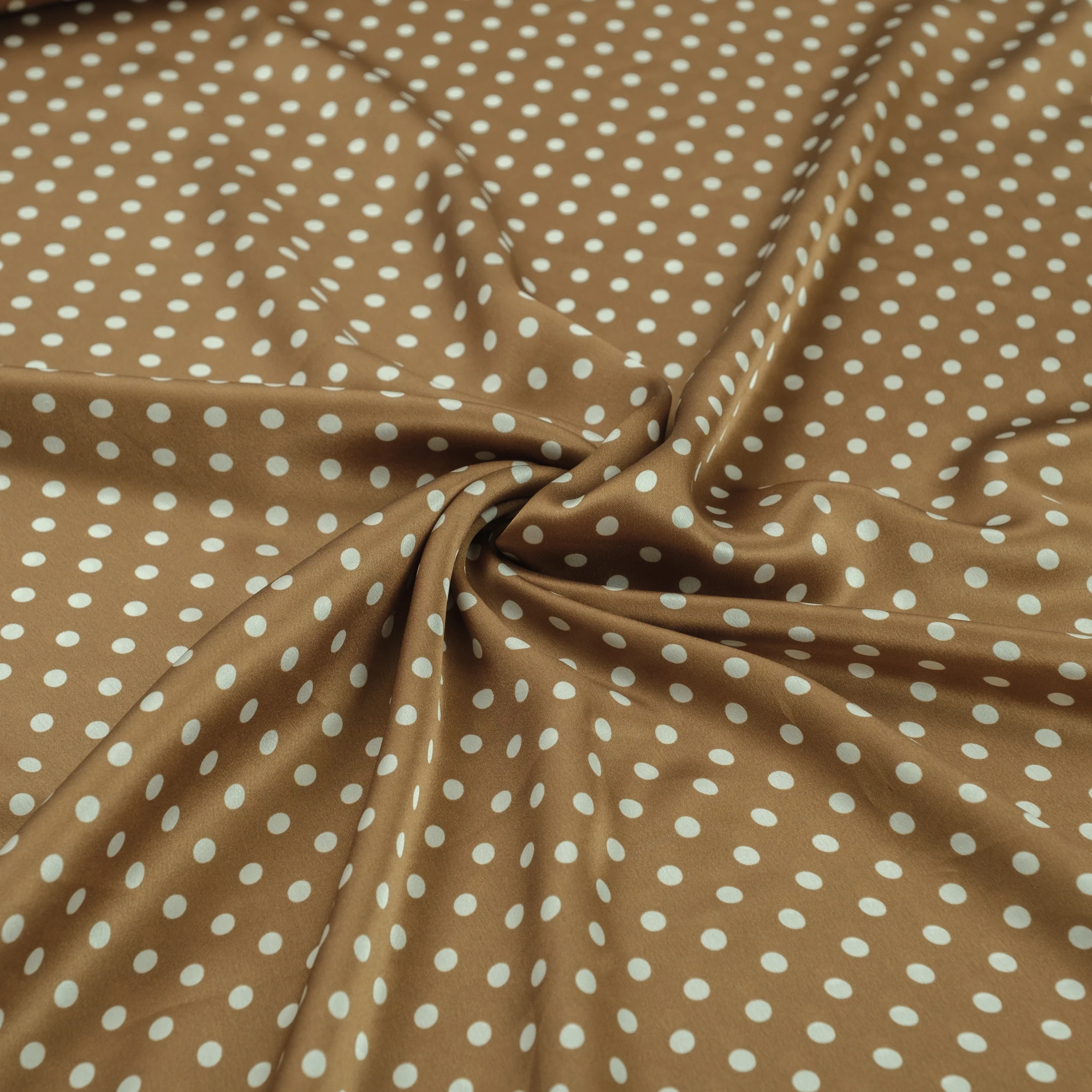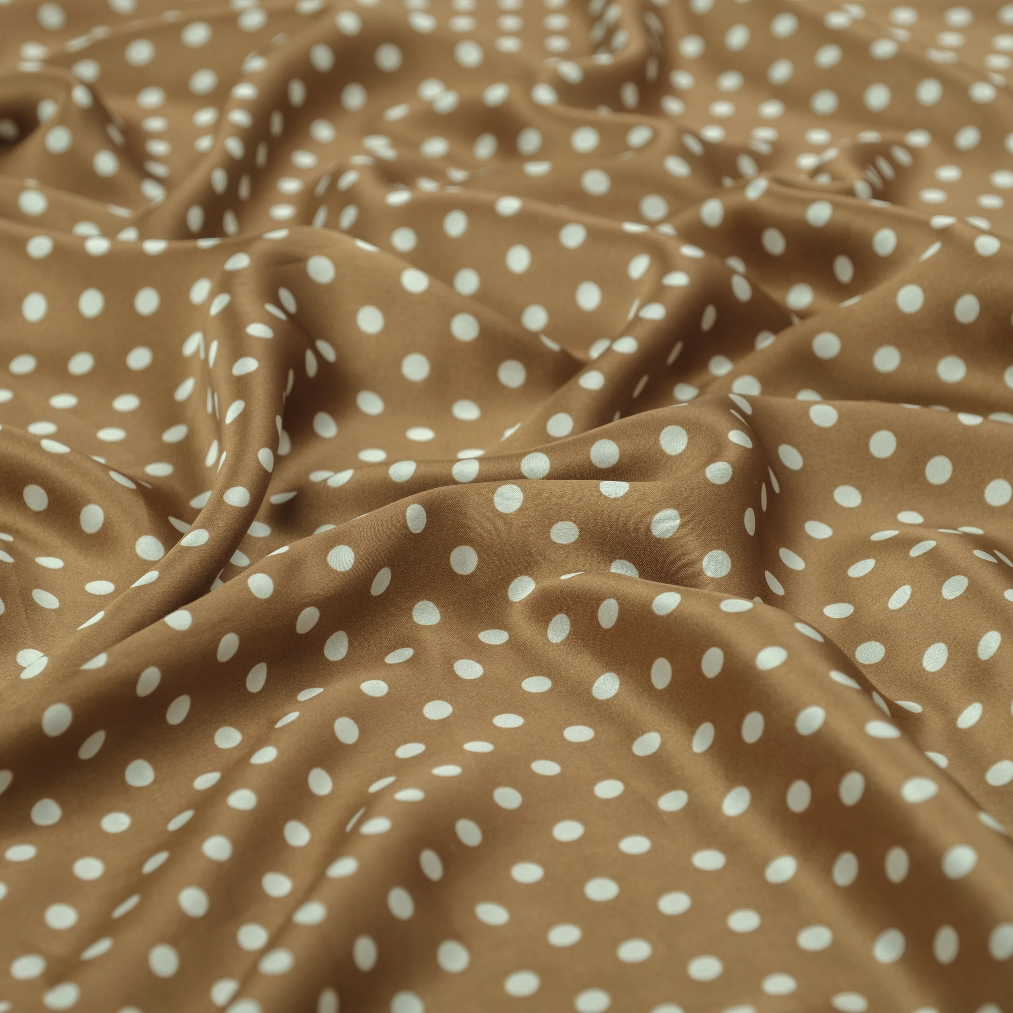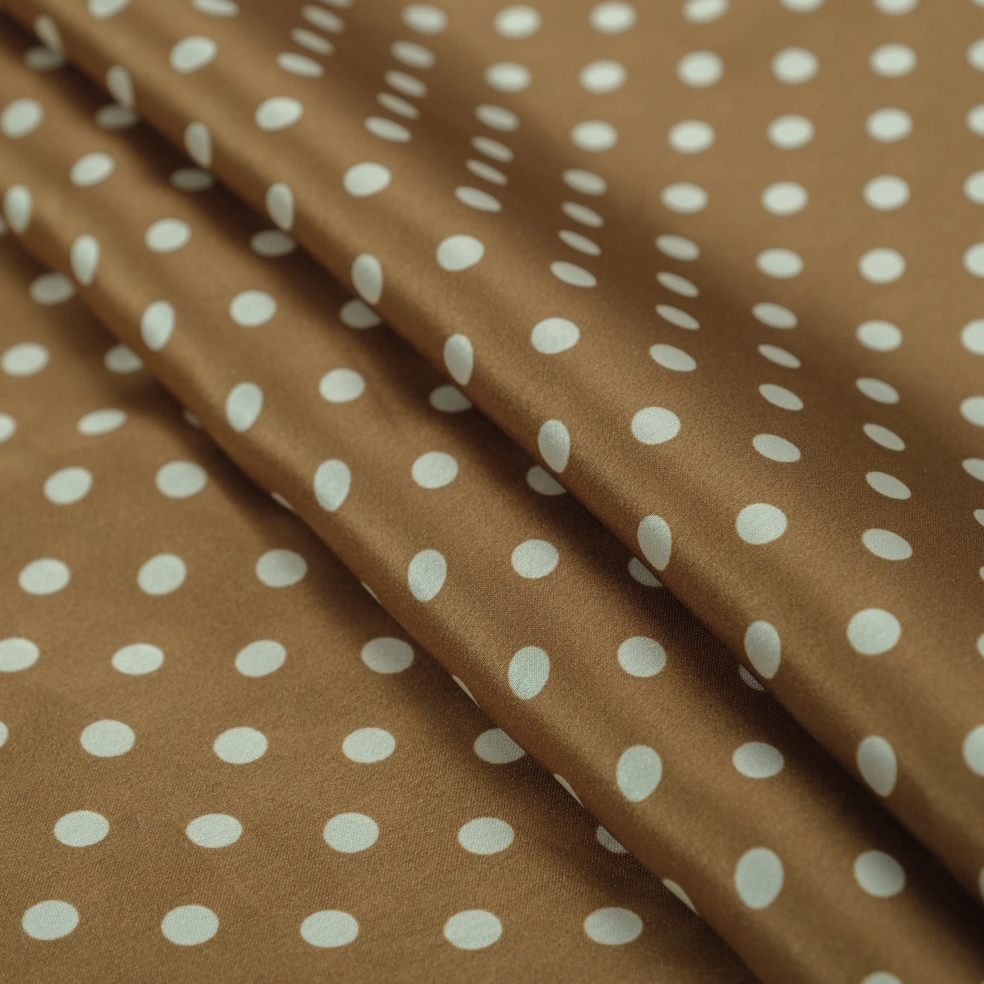 Luksusowy włoski jedwab w groszki. Urocza satyna jedwabna elastyczna w groszki na ciepłym, cynamonowym tle to wspomnienie lat 50. W Stanach Zjednoczonych nie było wówczas kobiety, która nie miałaby sukienki w ten wzór. Groszki są dość małe, luźno rozrzucone po błyszczącej tafli jedwabiu. Jedwab satynowy jest lekki i zwiewny, bardzo cienki, ale nieprześwitujący. Wierzch tkaniny satynowej jedwabnej jest gładki i śliski, szlachetnie połyskujący, natomiast spód jest biały i matowy, naturalnie przyjemny w kontakcie ze skórą.
