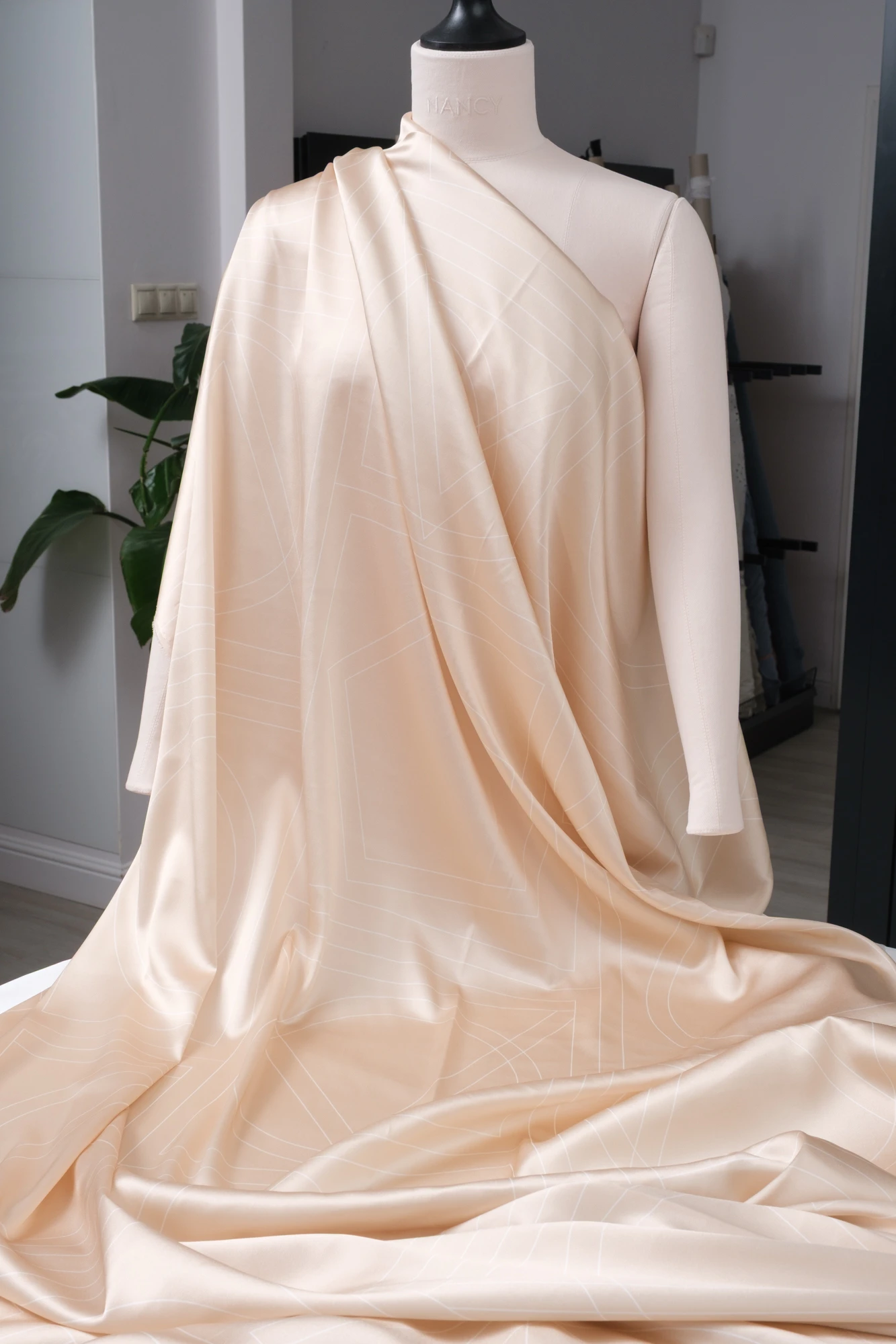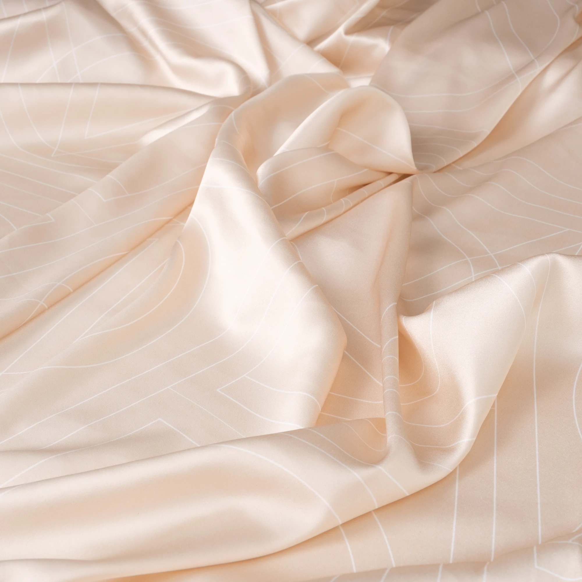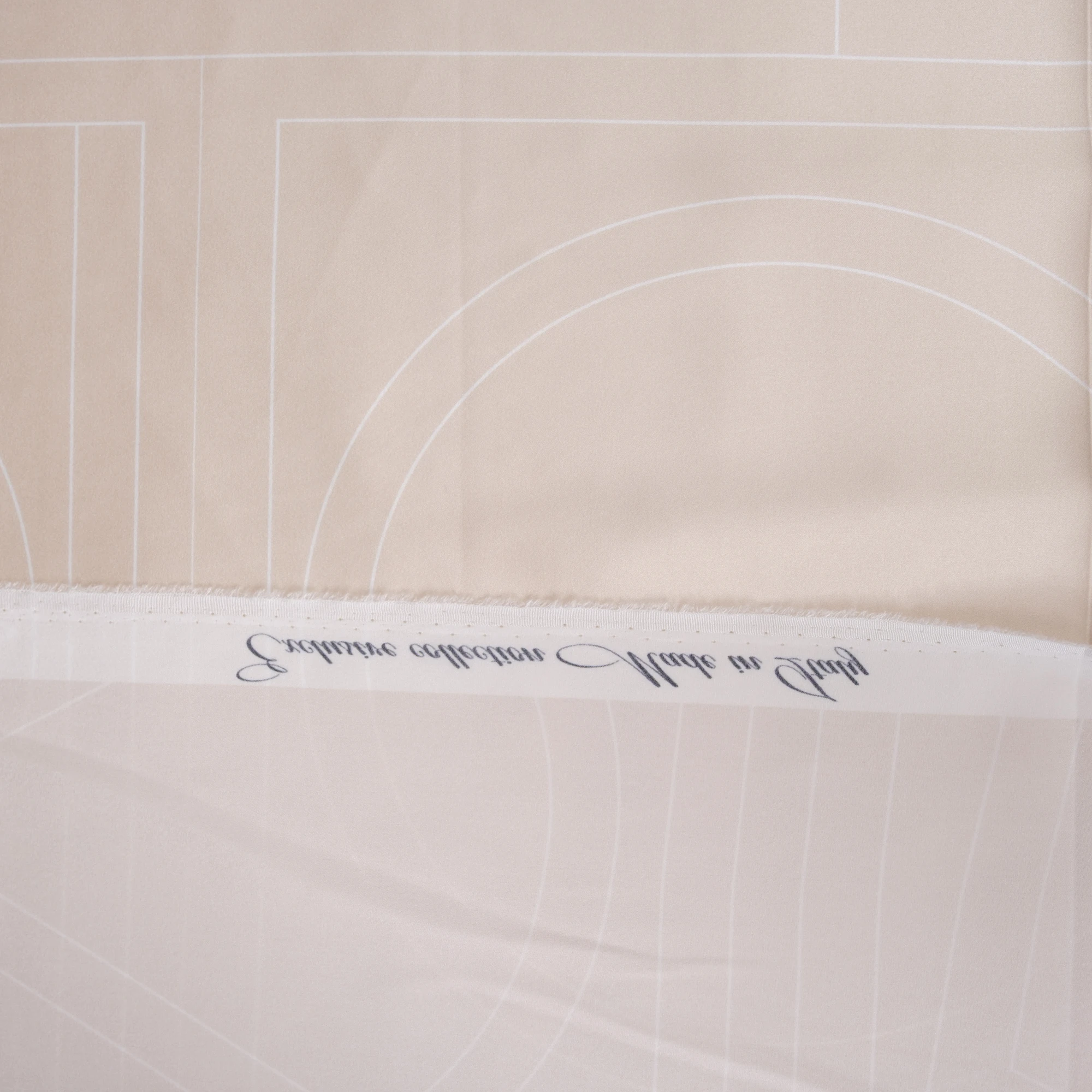 Bazą jest klasyczny odcien szampański beż – lekki, nowoczesny, a jednocześnie ponadczasowy. Minimalistyczny, geometryczny print w postaci cienkich, jasnych linii tworzy harmonijną kompozycję inspirowaną okręgami i prostymi formami. Wzór dodaje tkaninie współczesnego charakteru i sprawia, że idealnie sprawdzi się w projektach o czystej, architektonicznej estetyce.