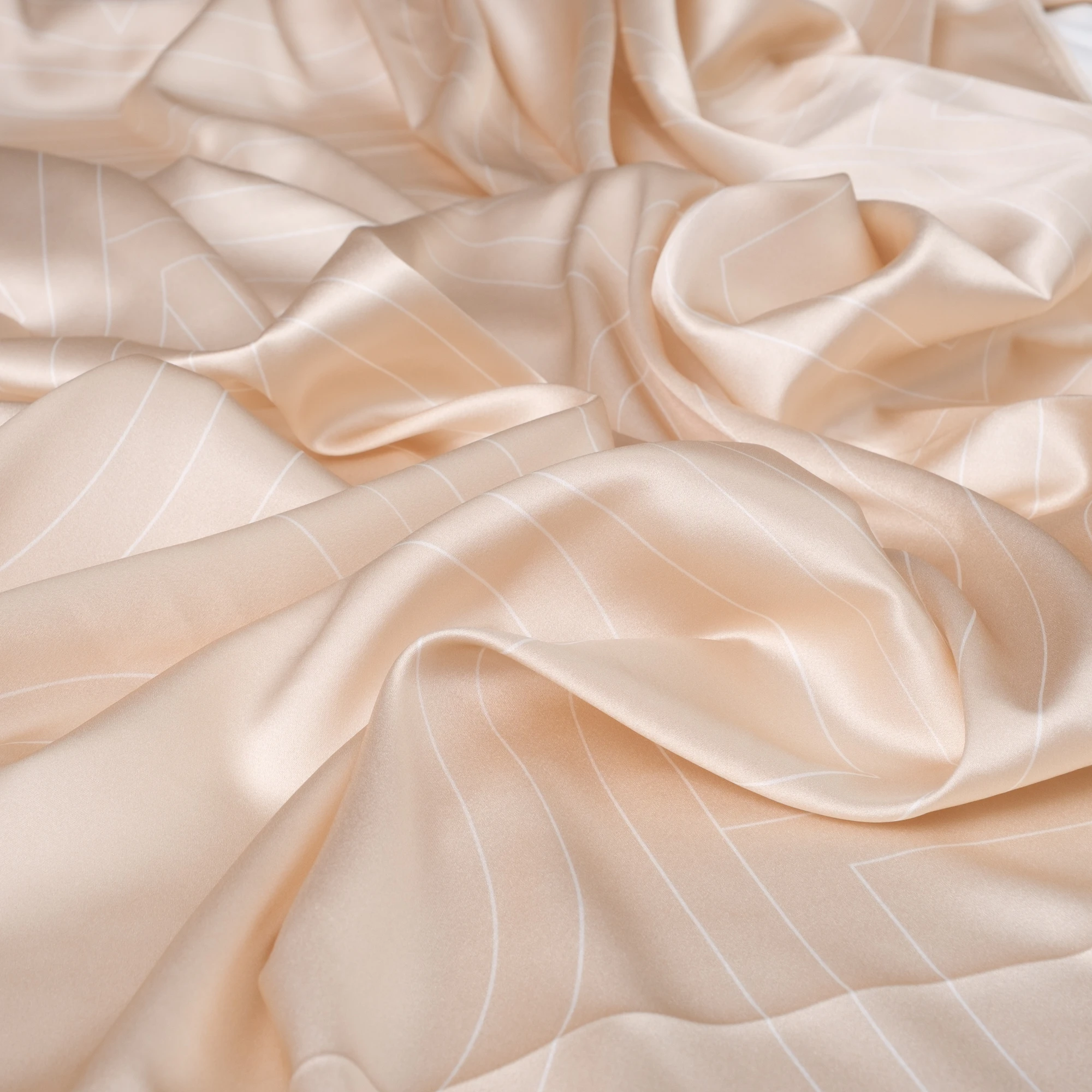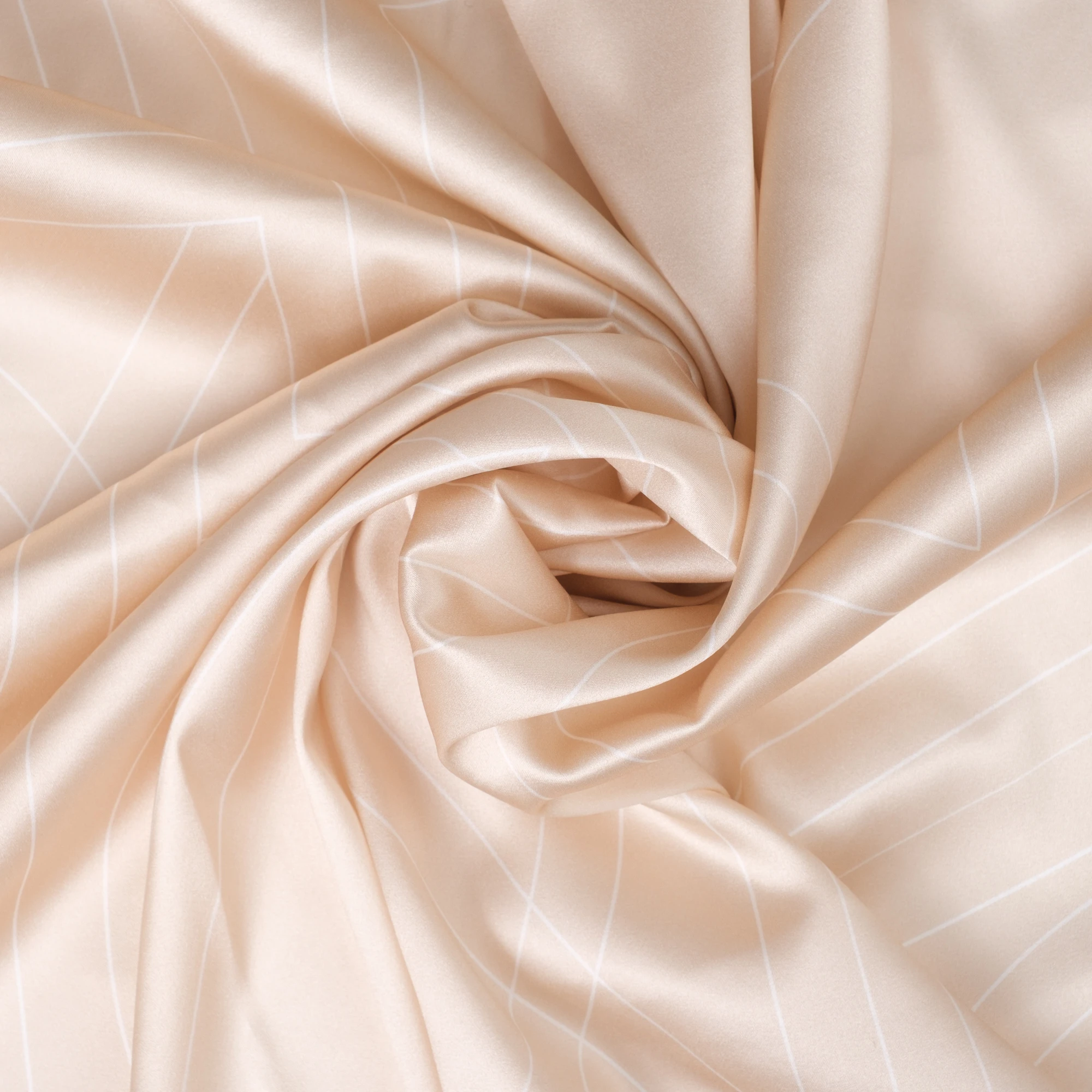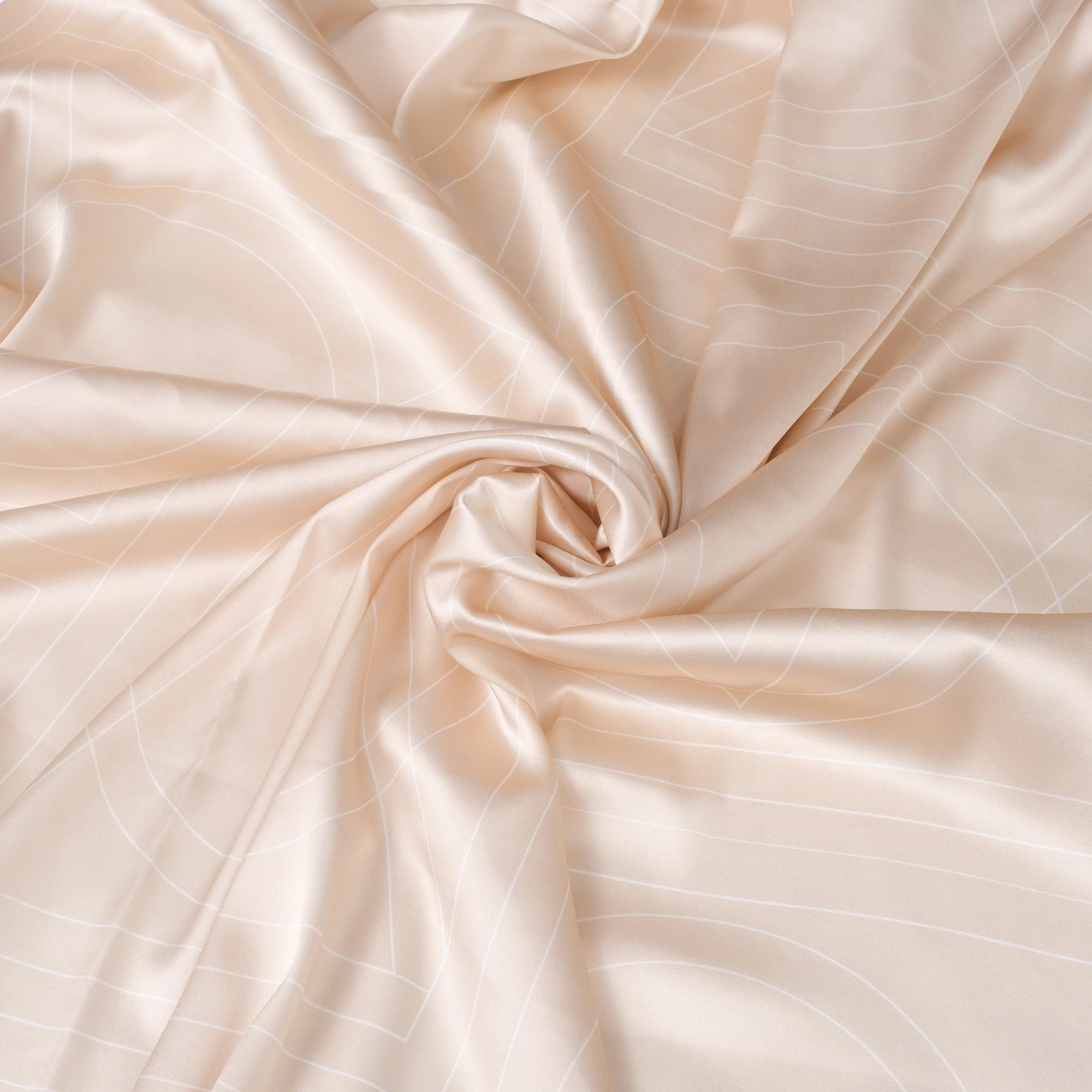Bazą jest klasyczny odcien szampański beż – lekki, nowoczesny, a jednocześnie ponadczasowy. Minimalistyczny, geometryczny print w postaci cienkich, jasnych linii tworzy harmonijną kompozycję inspirowaną okręgami i prostymi formami. Wzór dodaje tkaninie współczesnego charakteru i sprawia, że idealnie sprawdzi się w projektach o czystej, architektonicznej estetyce.