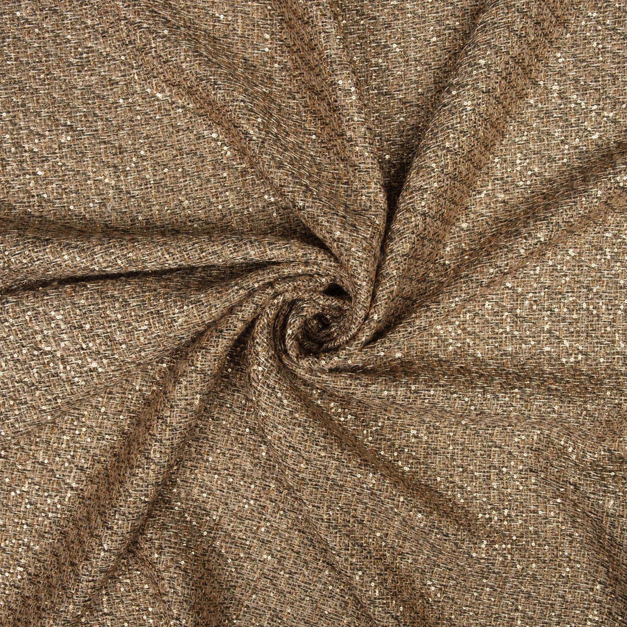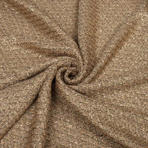 Luksusowa tkanina typu chanelka w odcieniu złotym z delikatnie połyskującymi cekinami to kwintesencja stylu i elegancji. Materiał zachwyca strukturą o charakterystycznym splocie chanel, a subtelny metaliczny połysk dodaje mu klasy i wyjątkowego blasku.