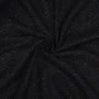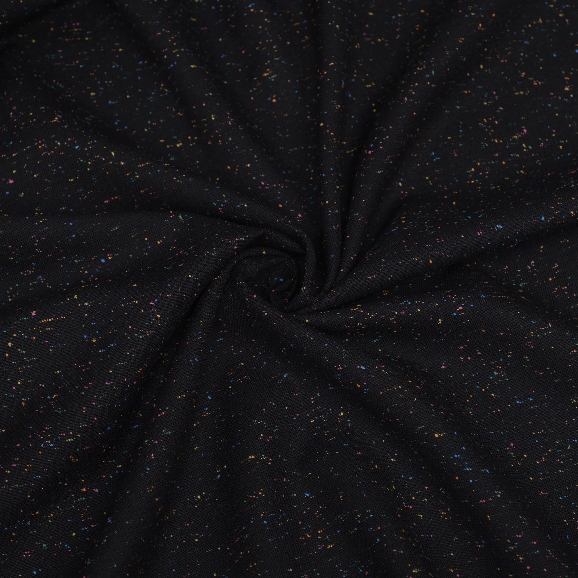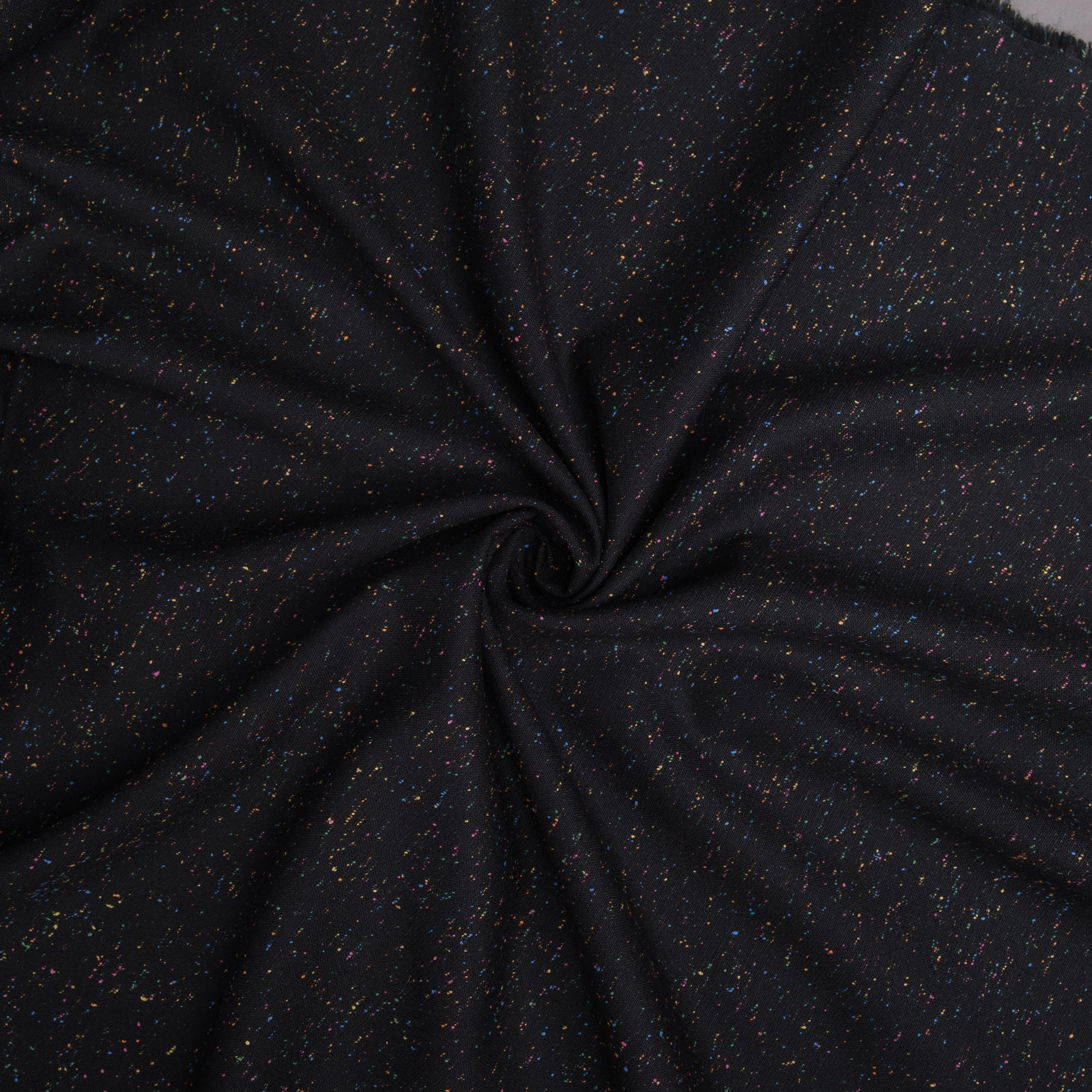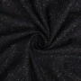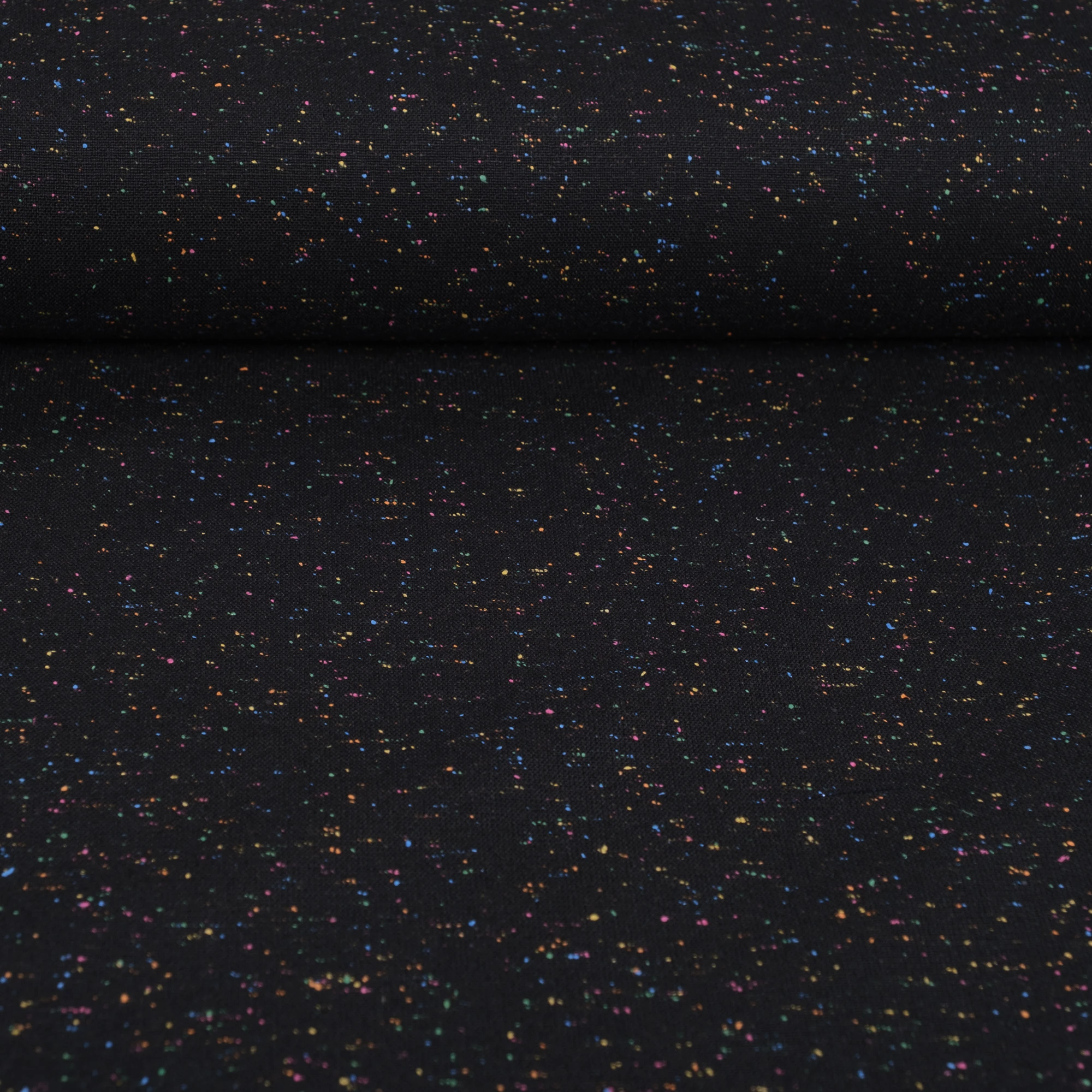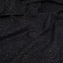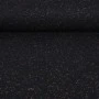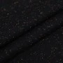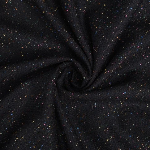 Tkanina jest miękka, sprężysta i przyjemna w dotyku, a jednocześnie odpowiednio mięsista. Dobrze się układa, zachowując formę – idealna do projektów wymagających struktury i eleganckiego wykończenia. Kolorowe drobinki w odcieniach różu, zieleni, żółci i niebieskiego delikatnie przełamują klasyczną czerń, nadając materiałowi nowoczesnego akcentu.