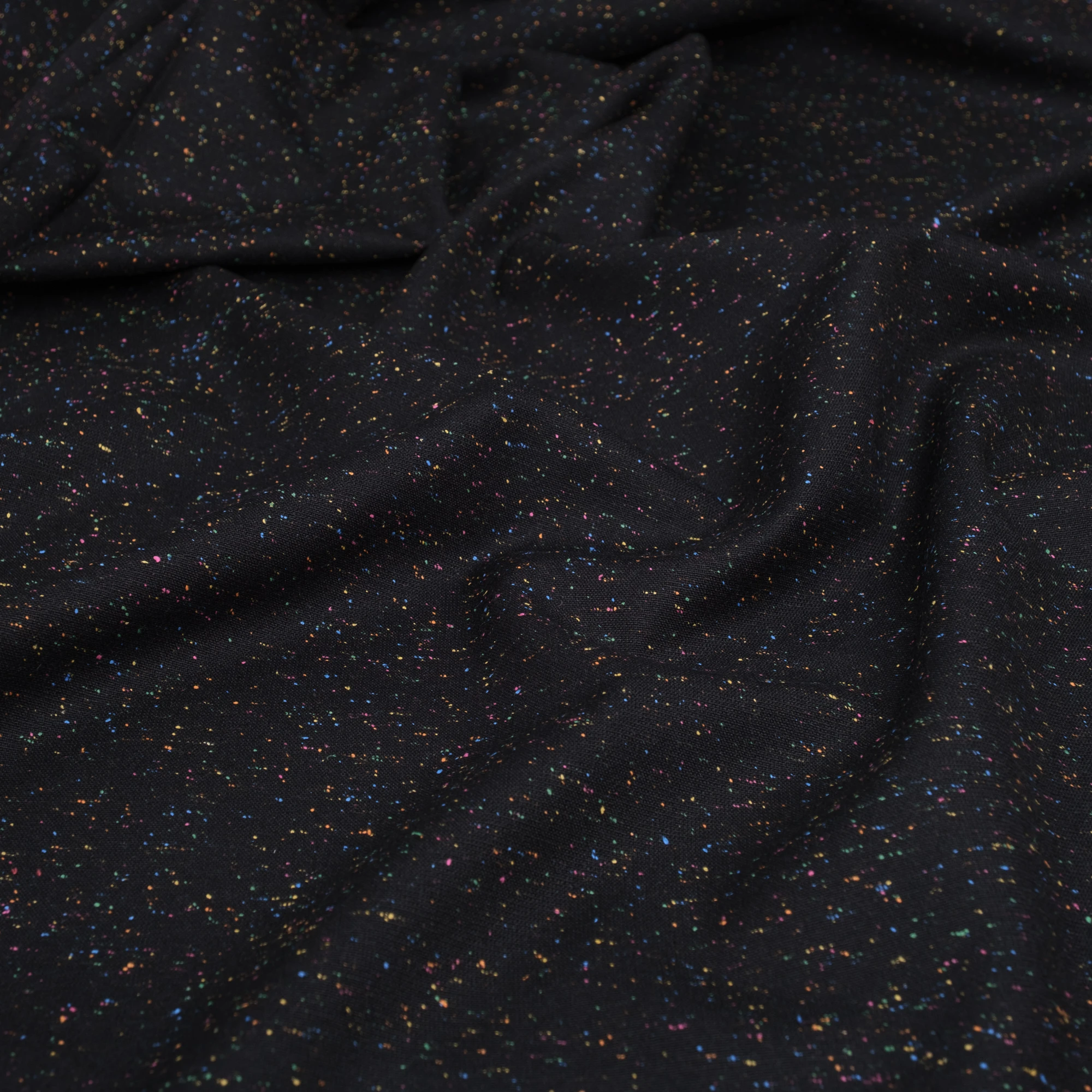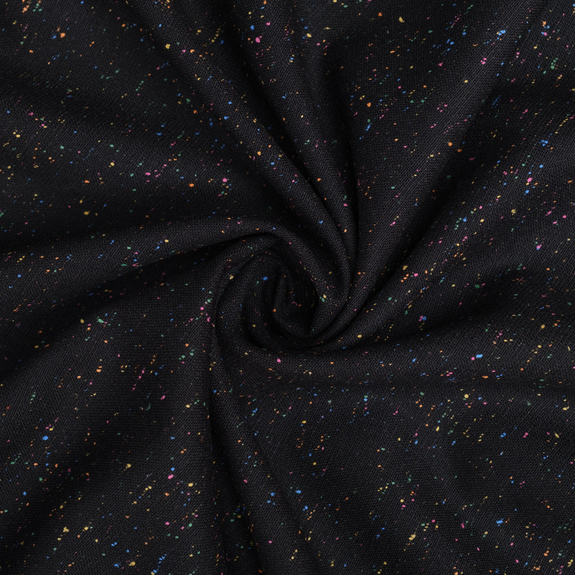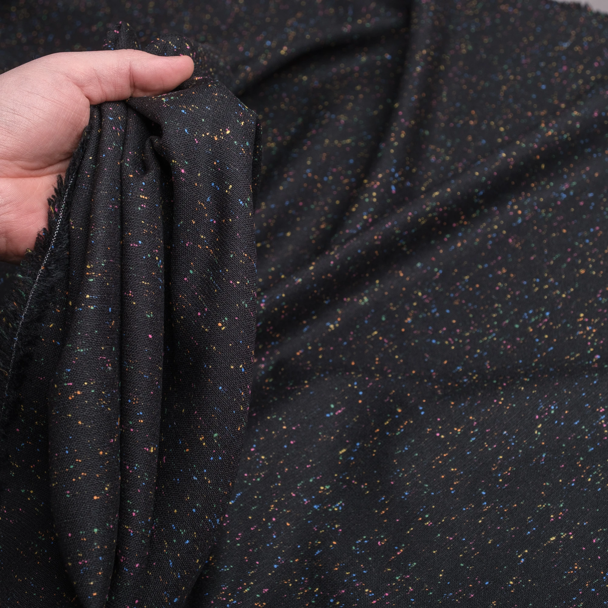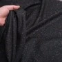 Szlachetna tkanina tweedowa wykonana z naturalnej wełny. Materiał o zwartej, wyraźnej strukturze i charakterystycznym, lekko ziarnistym splocie. Na głębokim, czarnym tle widoczne są drobne, wielobarwne wtrącenia przędzy (tzw. fleck), które nadają całości subtelnej dynamiki i modowego charakteru.