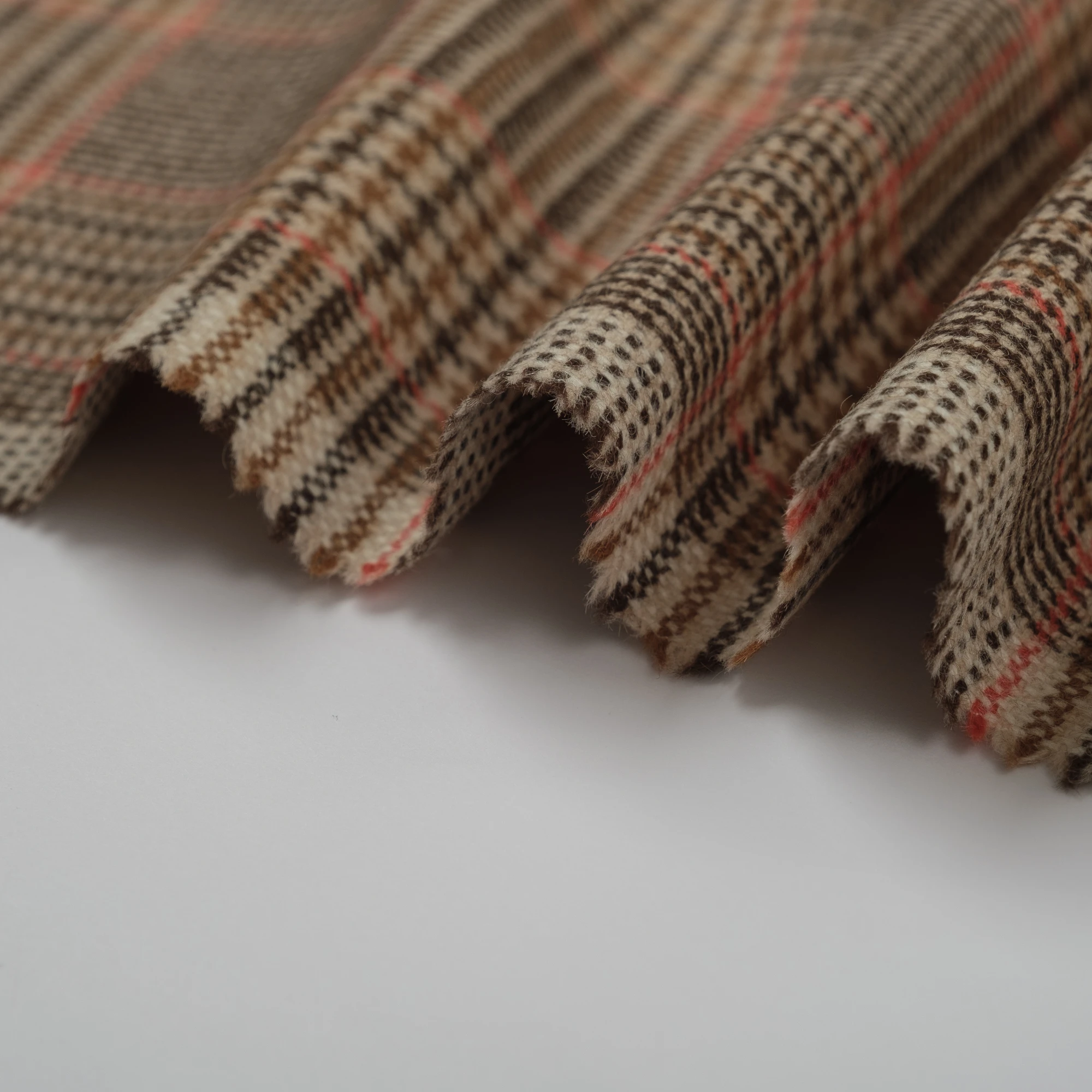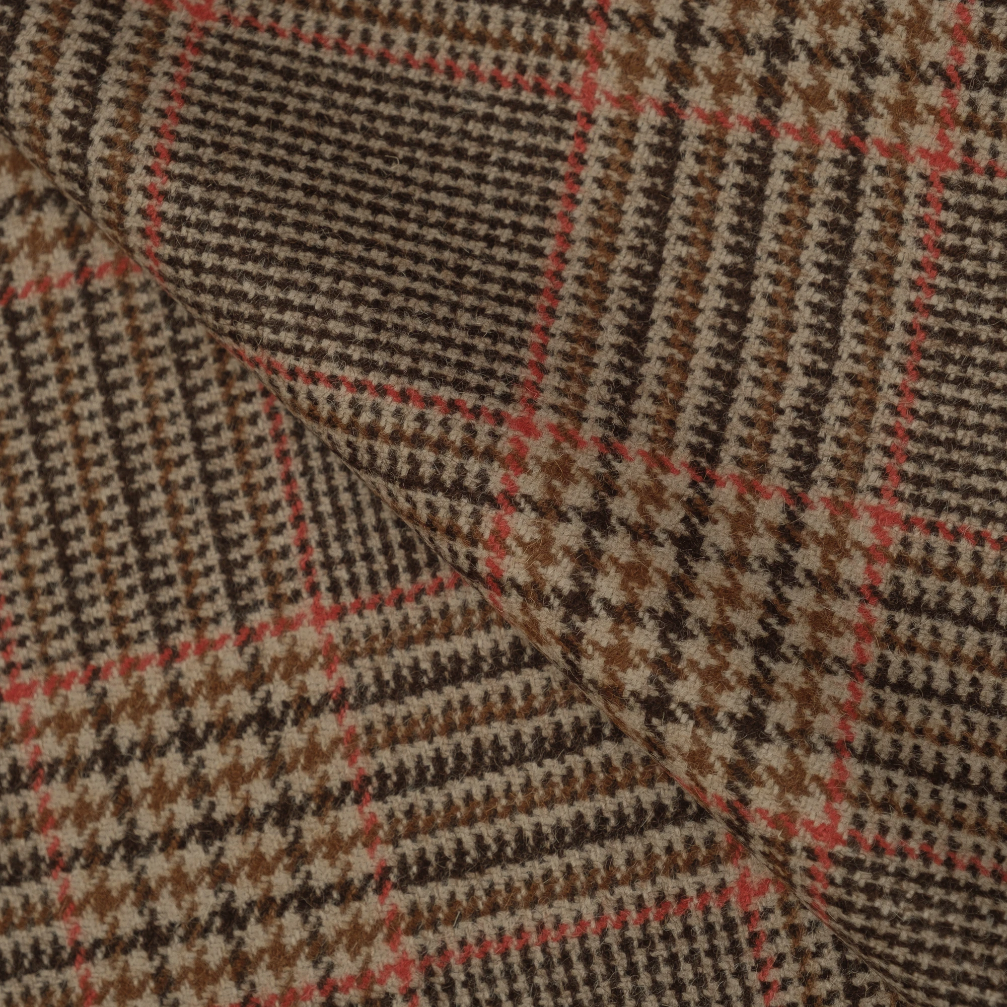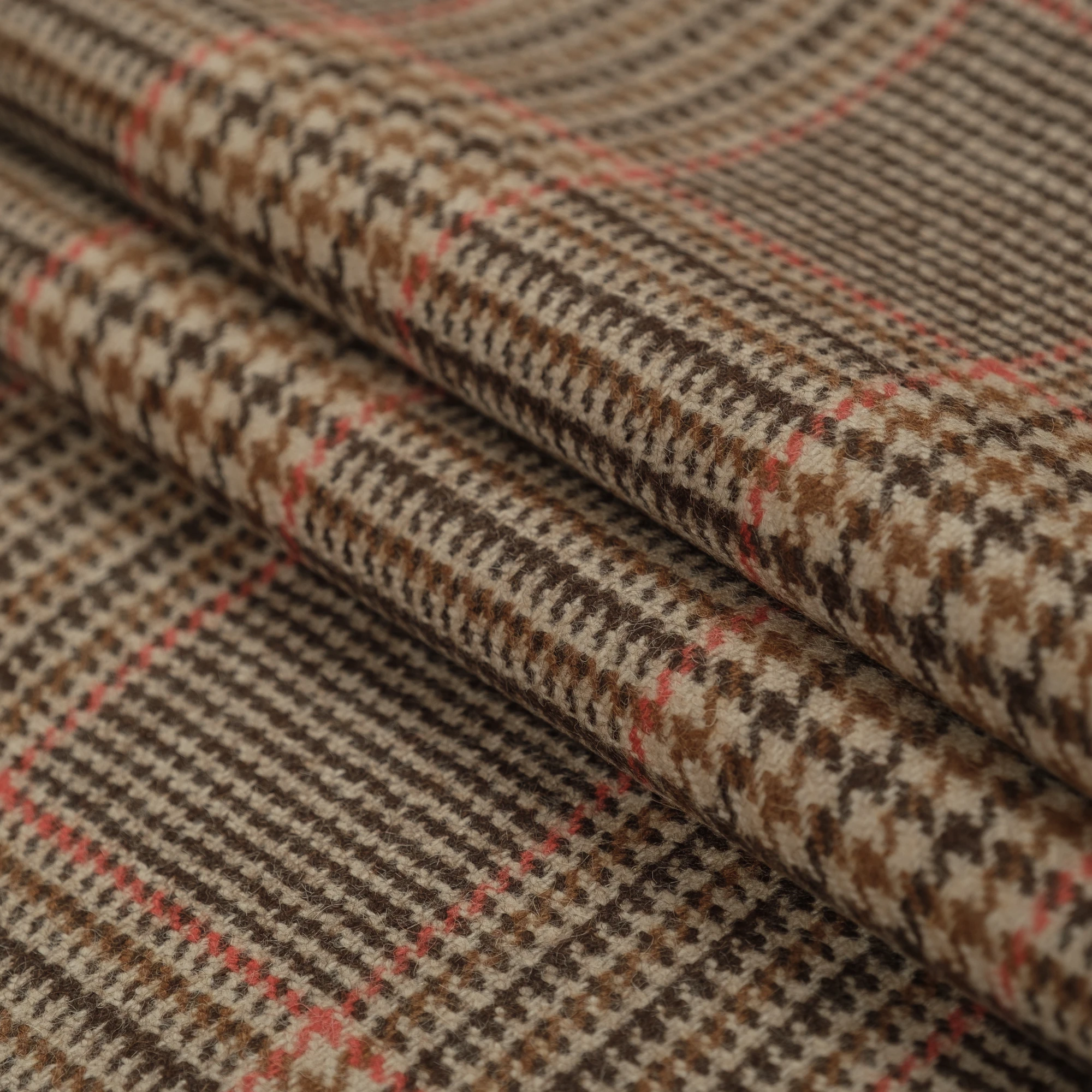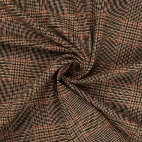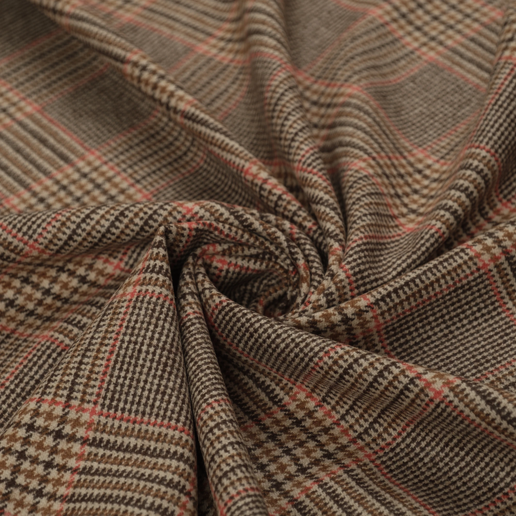 Elegancka włoska tkanina wełniana w odcieniach beżu i brązu z delikatnym akcentem czerwonej nici. Naturalna i ciepła tkanina nie rozciąga się, ale ze względu na splot lekko pracuje, nie krępując ruchów. Tkanina o szlachetnym, eleganckim wykończeniu. Pod tkaniny wełniane zalecamy zastosowanie podszewki.