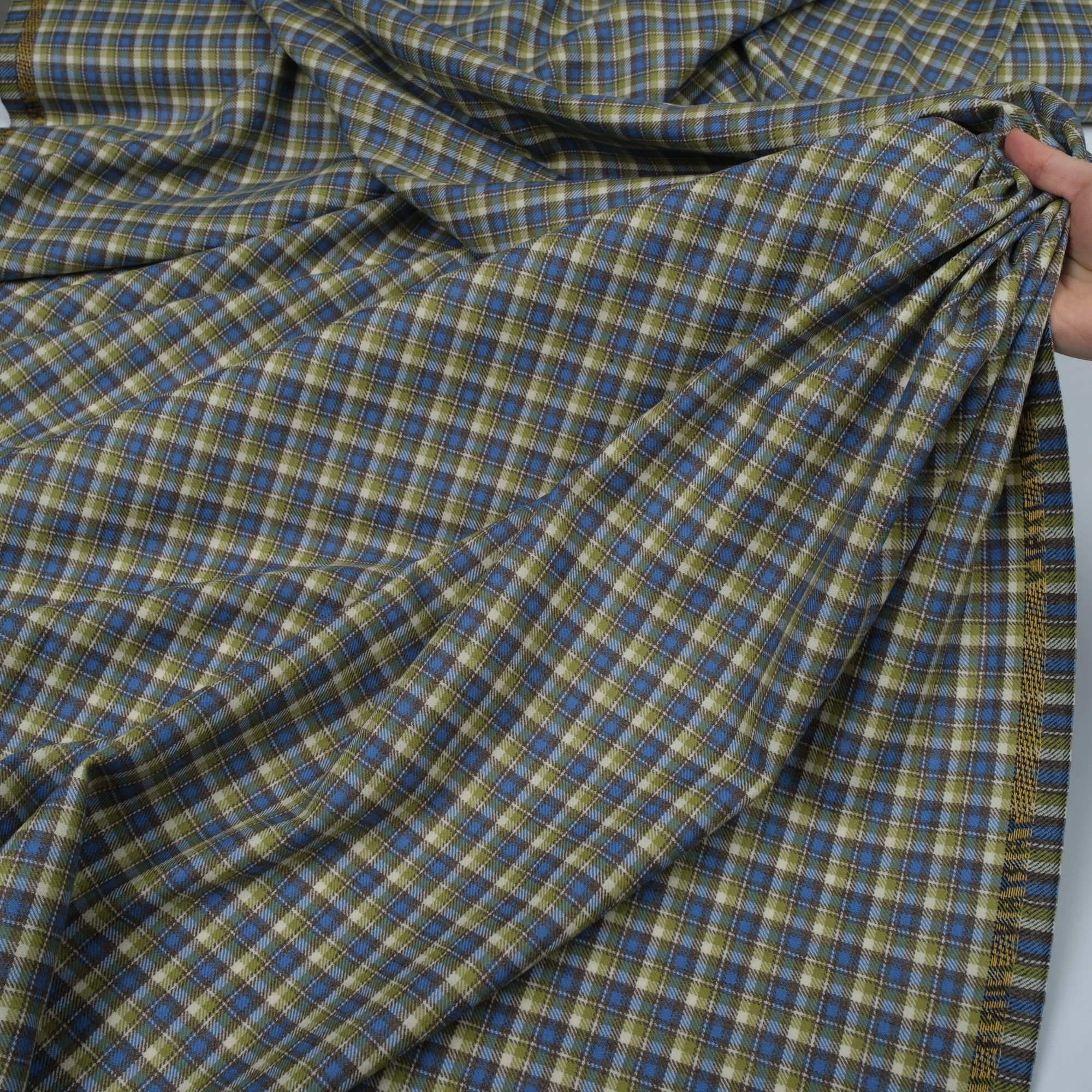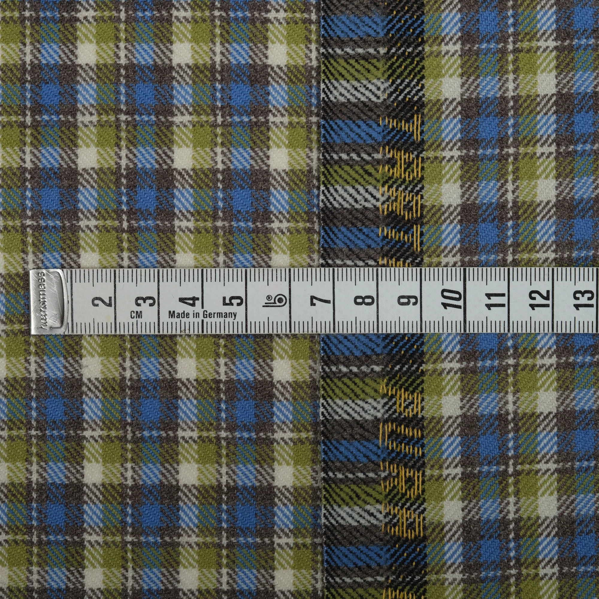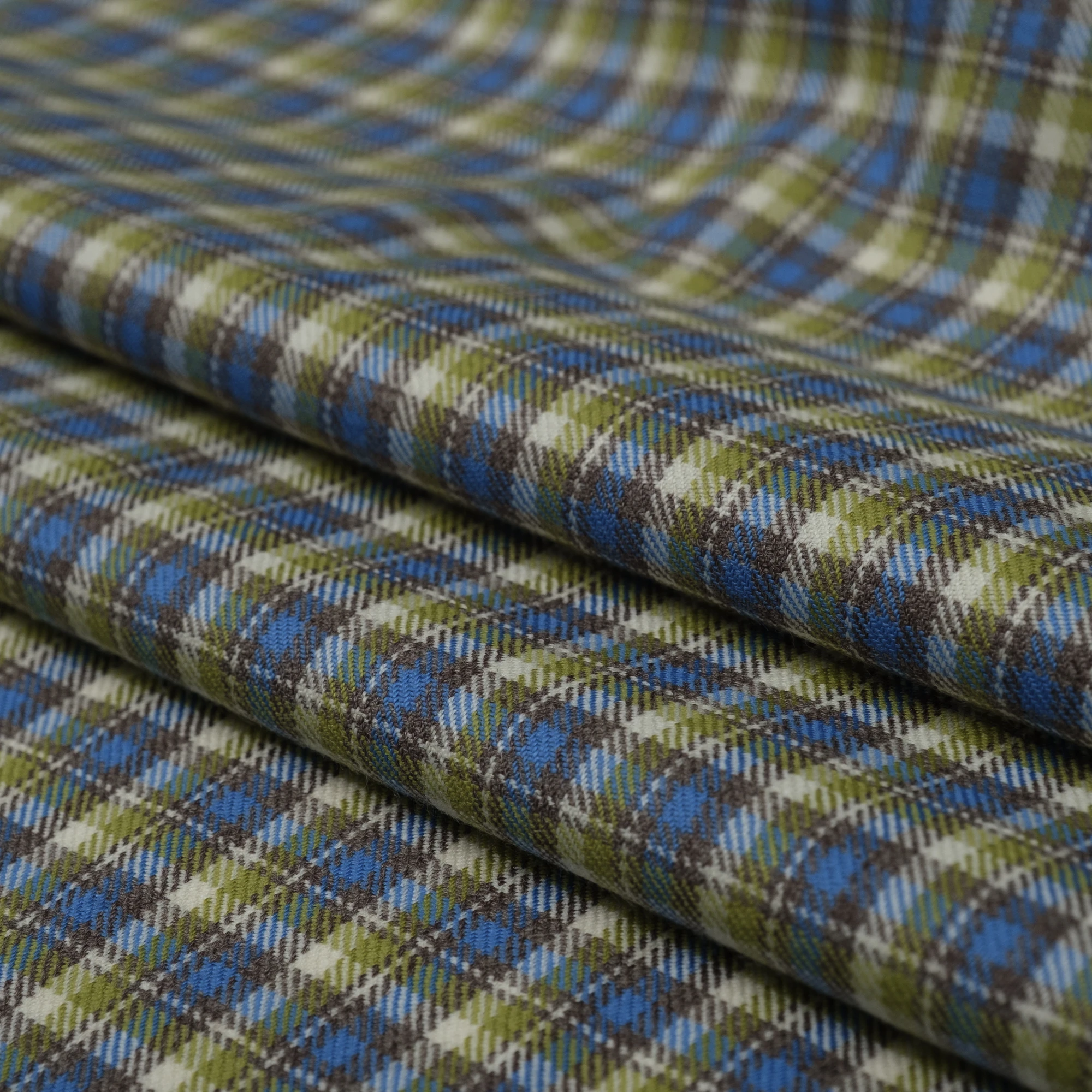 Elegancka włoska tkanina wełniana kostiumowa z gustownym wzorem kratki w odcieniach beżu, niebieskiego, zielonego. Kostiumowa tkanina wełniana  została utkana splotem skośnym, inaczej zwanym diagonalnym. Budowa ta gwarantuje tkaninie strukturę wyrazistych prążków nachylonych pod kątem 45°, widocznych po obydwu stronach materiału. Zastosowany splot powoduje, że nasza 100% wełna kostiumowa cechuje się większą trwałością a także jest bardziej odporna na przetarcia i rozdarcia. Najwyższa jakość owczej wełny jest poparta sygnaturą na boku panelu: „Pura lana vergine made in Italy”.  Stylowa wełna na żakiet w kratkę made in Italy jest dwustronna, nie prześwituje oraz jest odporna na zagniecenia. To materiał średniej grubości, dość miękki i przytulny  w dotyku. Za sprawą splotu delikatnie pracuje po szerokości materiału, a jej powierzchnia pozostawia szlachetne, matowe wykończenie.