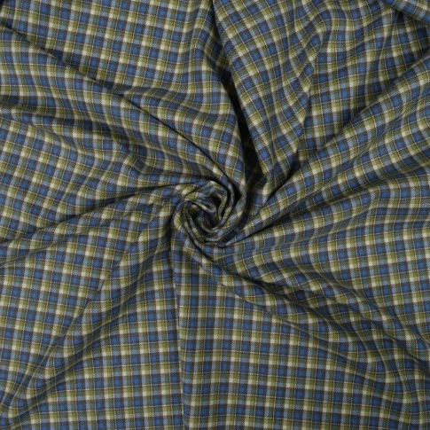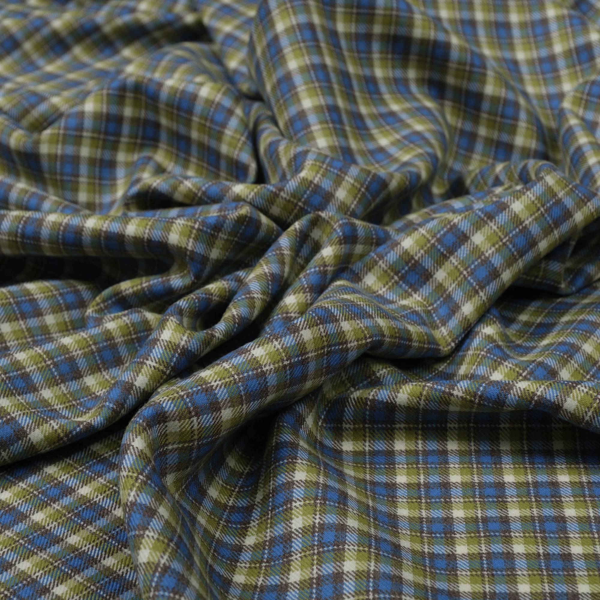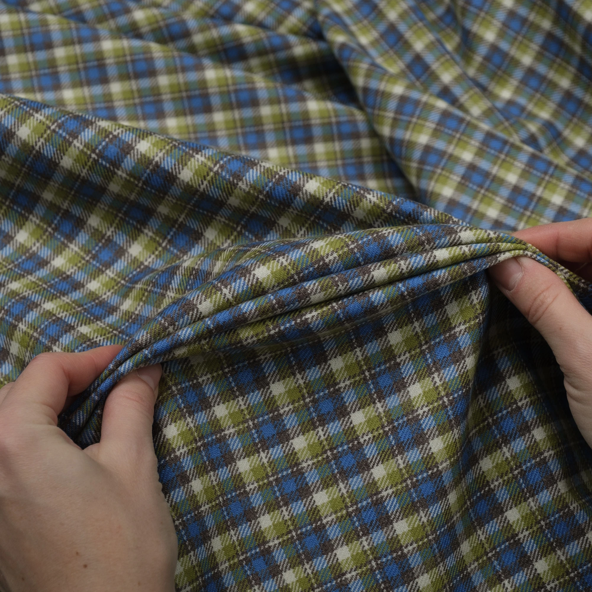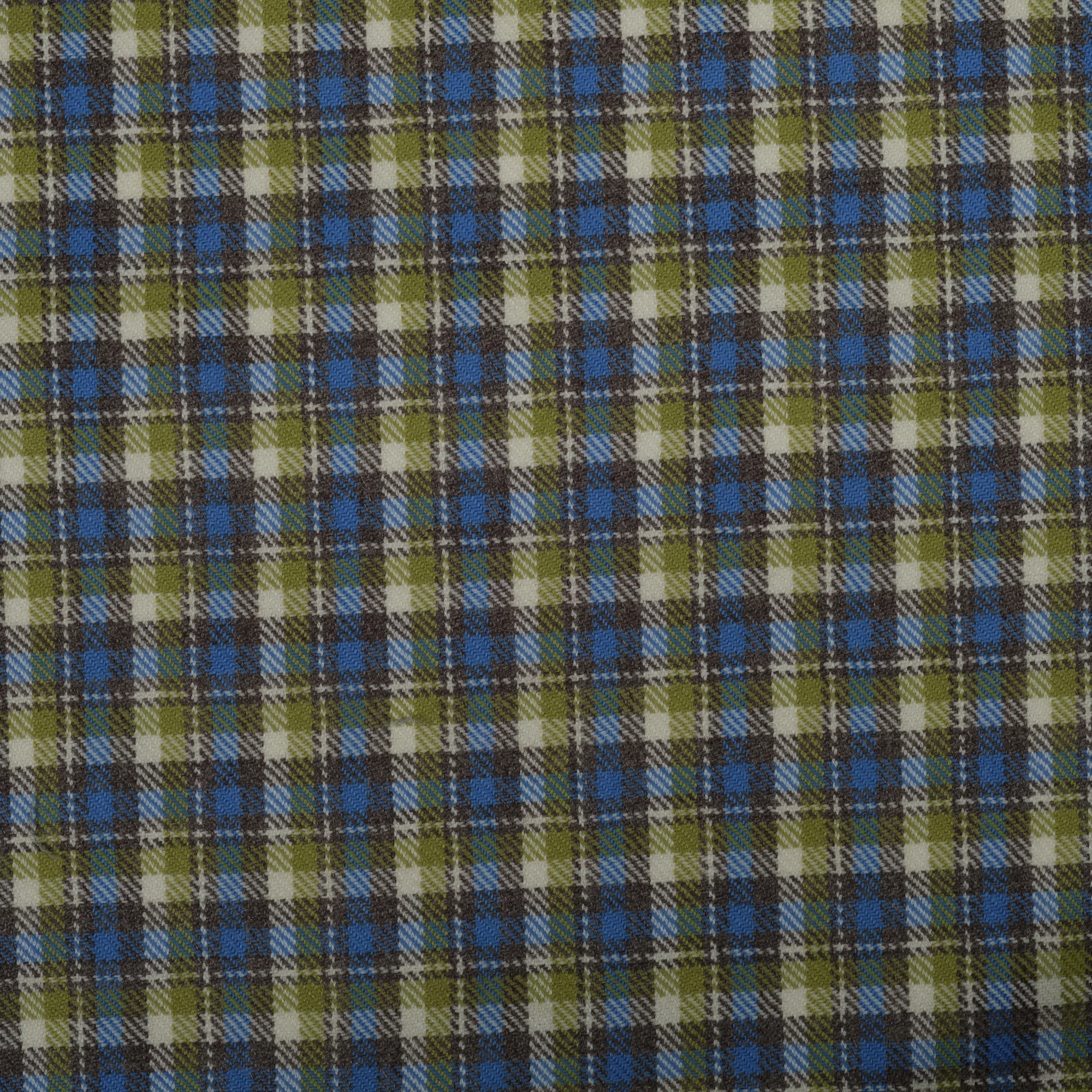 Elegancka włoska tkanina wełniana kostiumowa z gustownym wzorem kratki w odcieniach beżu, niebieskiego, zielonego. Kostiumowa tkanina wełniana  została utkana splotem skośnym, inaczej zwanym diagonalnym. Budowa ta gwarantuje tkaninie strukturę wyrazistych prążków nachylonych pod kątem 45°, widocznych po obydwu stronach materiału. Zastosowany splot powoduje, że nasza 100% wełna kostiumowa cechuje się większą trwałością a także jest bardziej odporna na przetarcia i rozdarcia. Najwyższa jakość owczej wełny jest poparta sygnaturą na boku panelu: „Pura lana vergine made in Italy”.  Stylowa wełna na żakiet w kratkę made in Italy jest dwustronna, nie prześwituje oraz jest odporna na zagniecenia. To materiał średniej grubości, dość miękki i przytulny  w dotyku. Za sprawą splotu delikatnie pracuje po szerokości materiału, a jej powierzchnia pozostawia szlachetne, matowe wykończenie.
