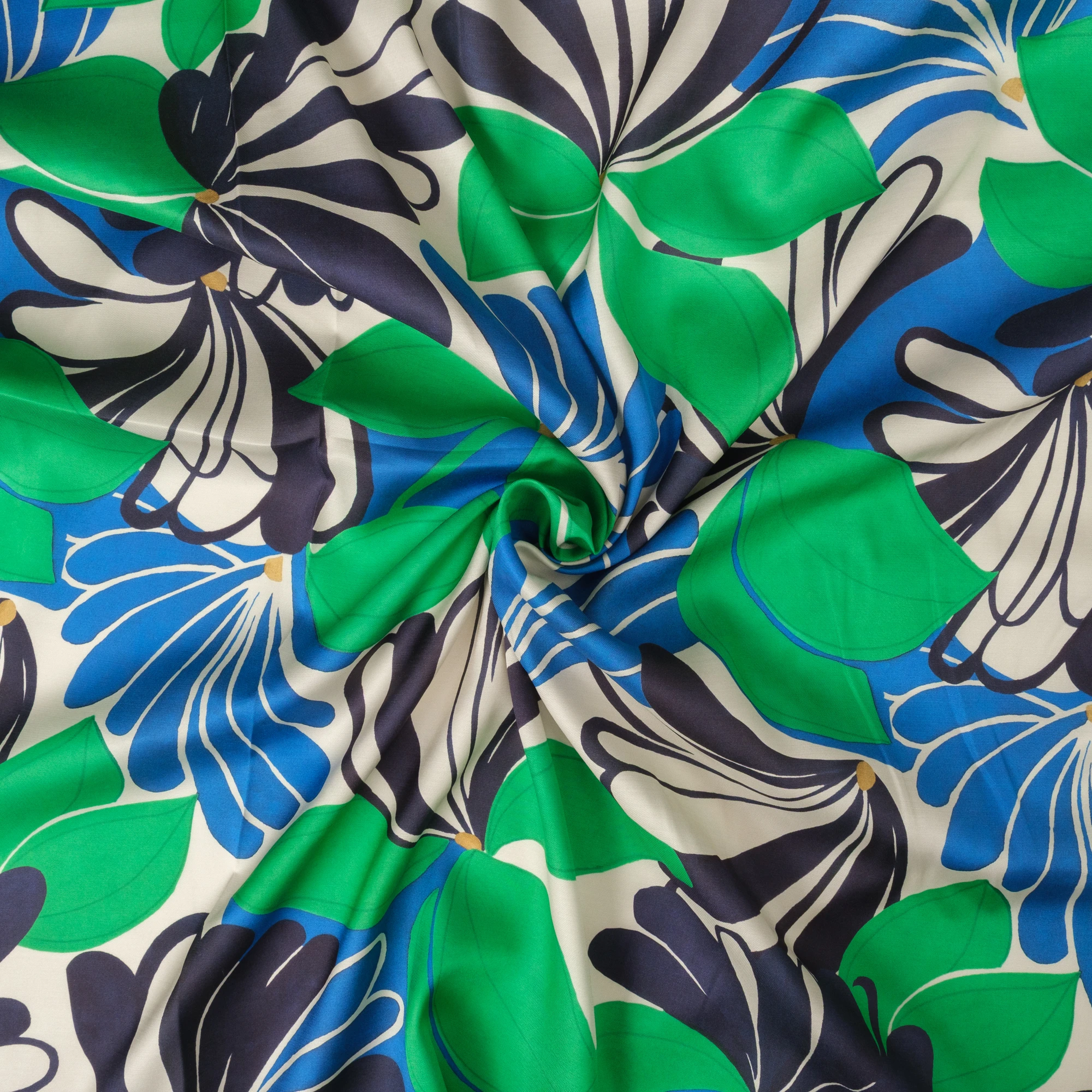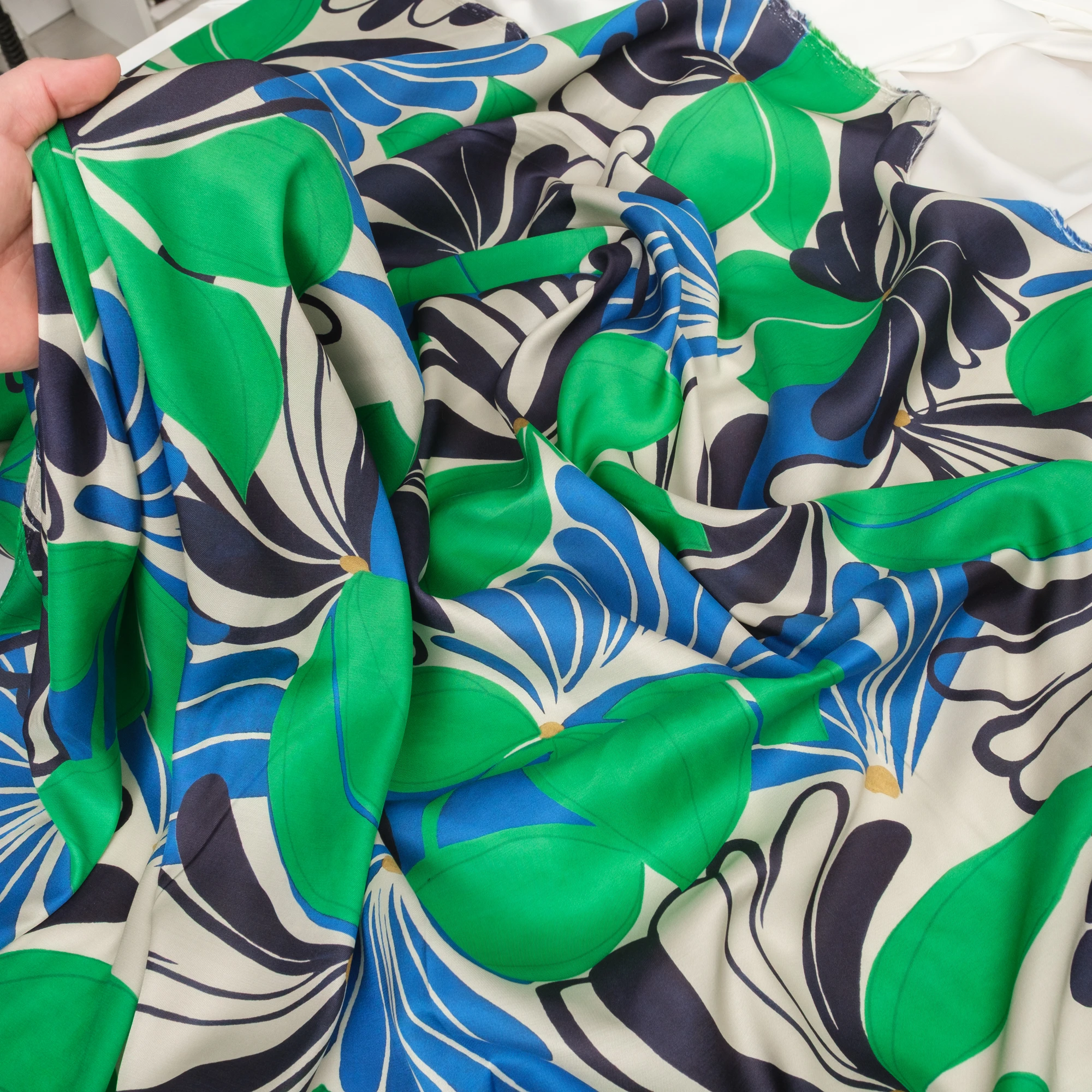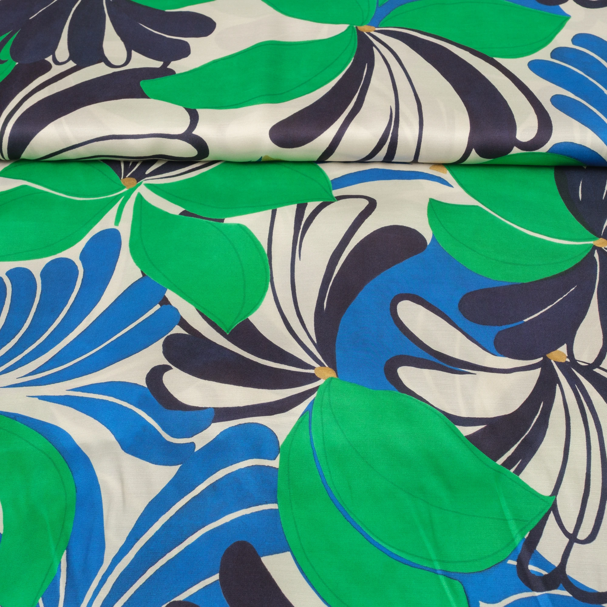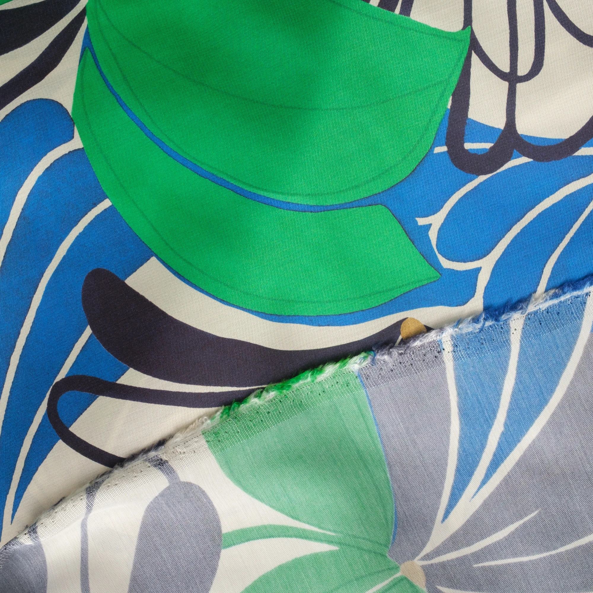 Na jasnym, kremowym tle rozpościera się dynamiczny, roślinny wzór – duże, stylizowane kwiaty i liście w intensywnych odcieniach zieleni, kobaltu i granatu. Kontrastowa kolorystyka nadaje tkaninie nowoczesny, świeży charakter, idealny do wyrazistych projektów.