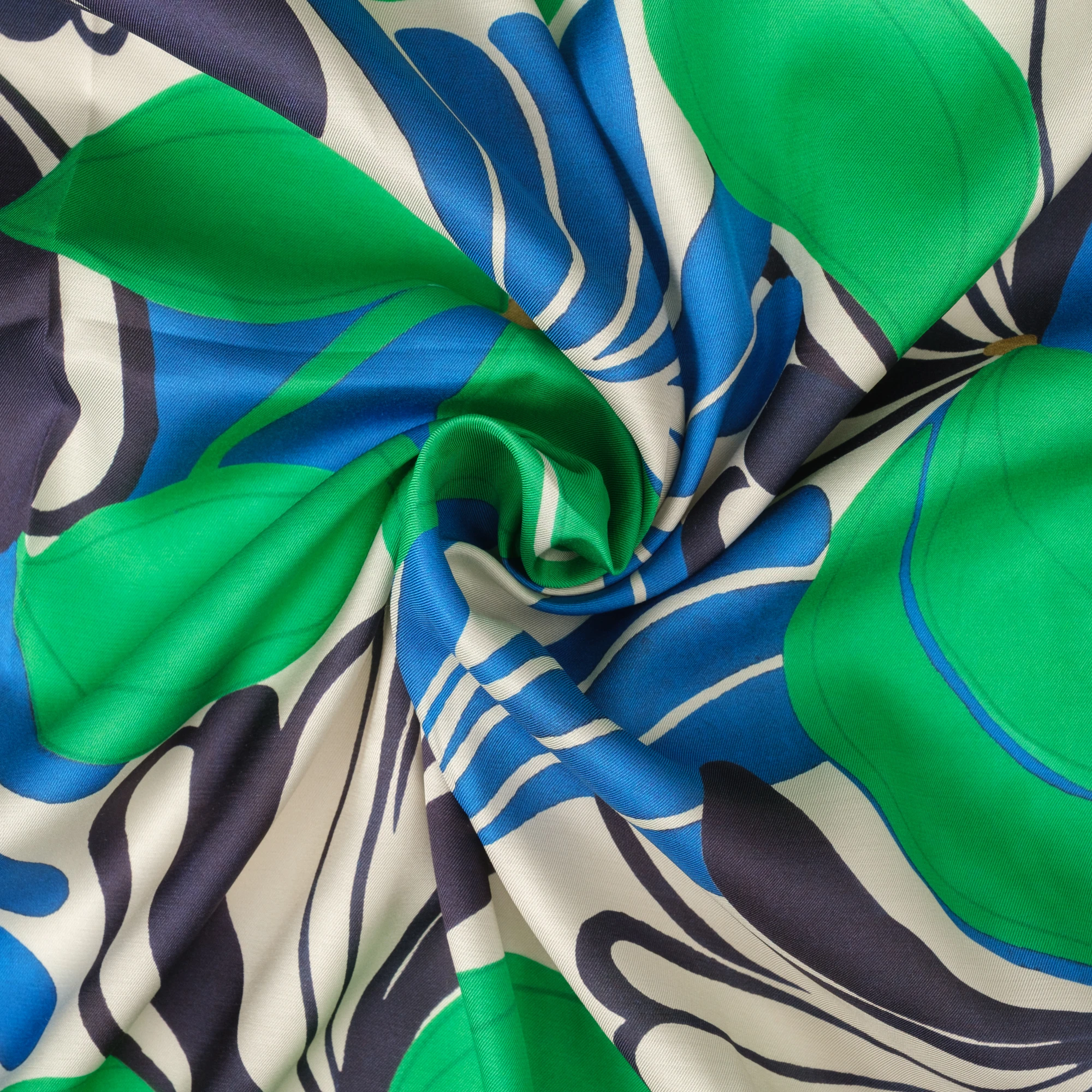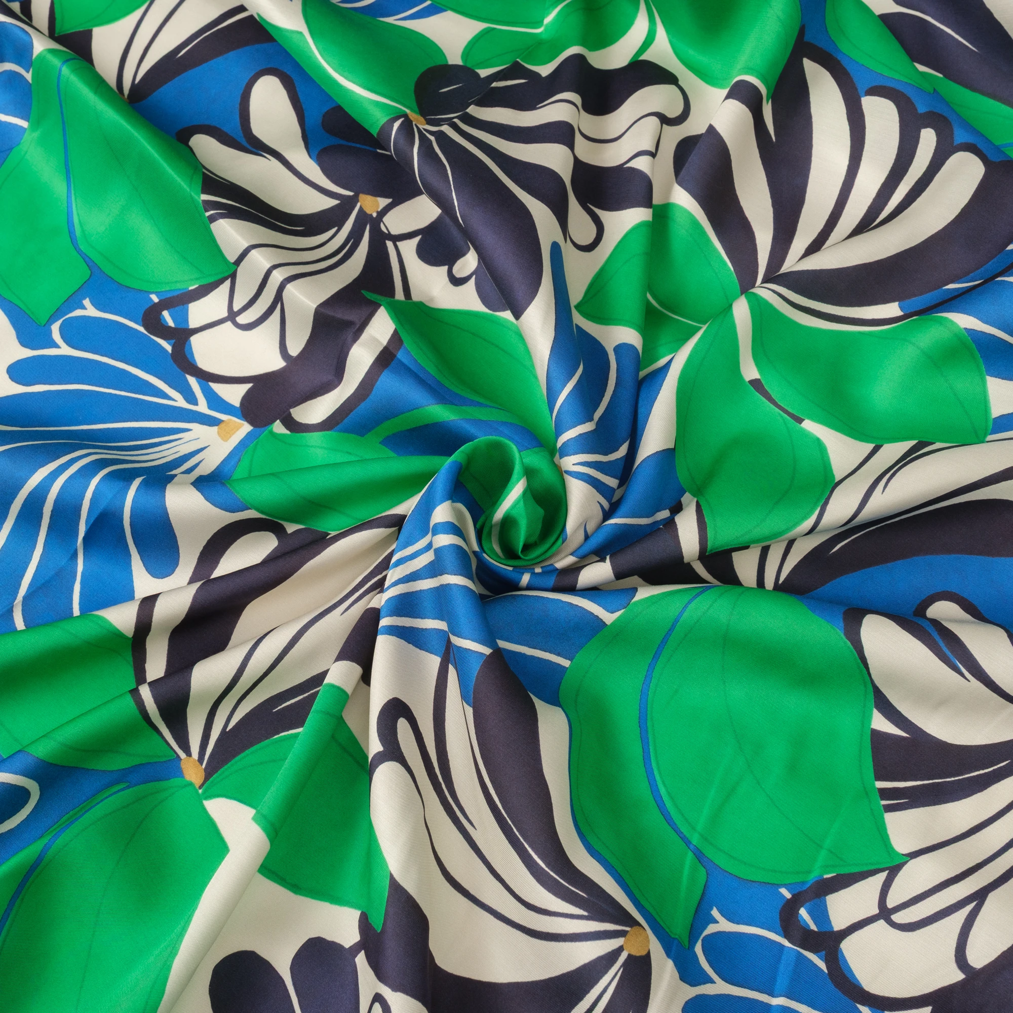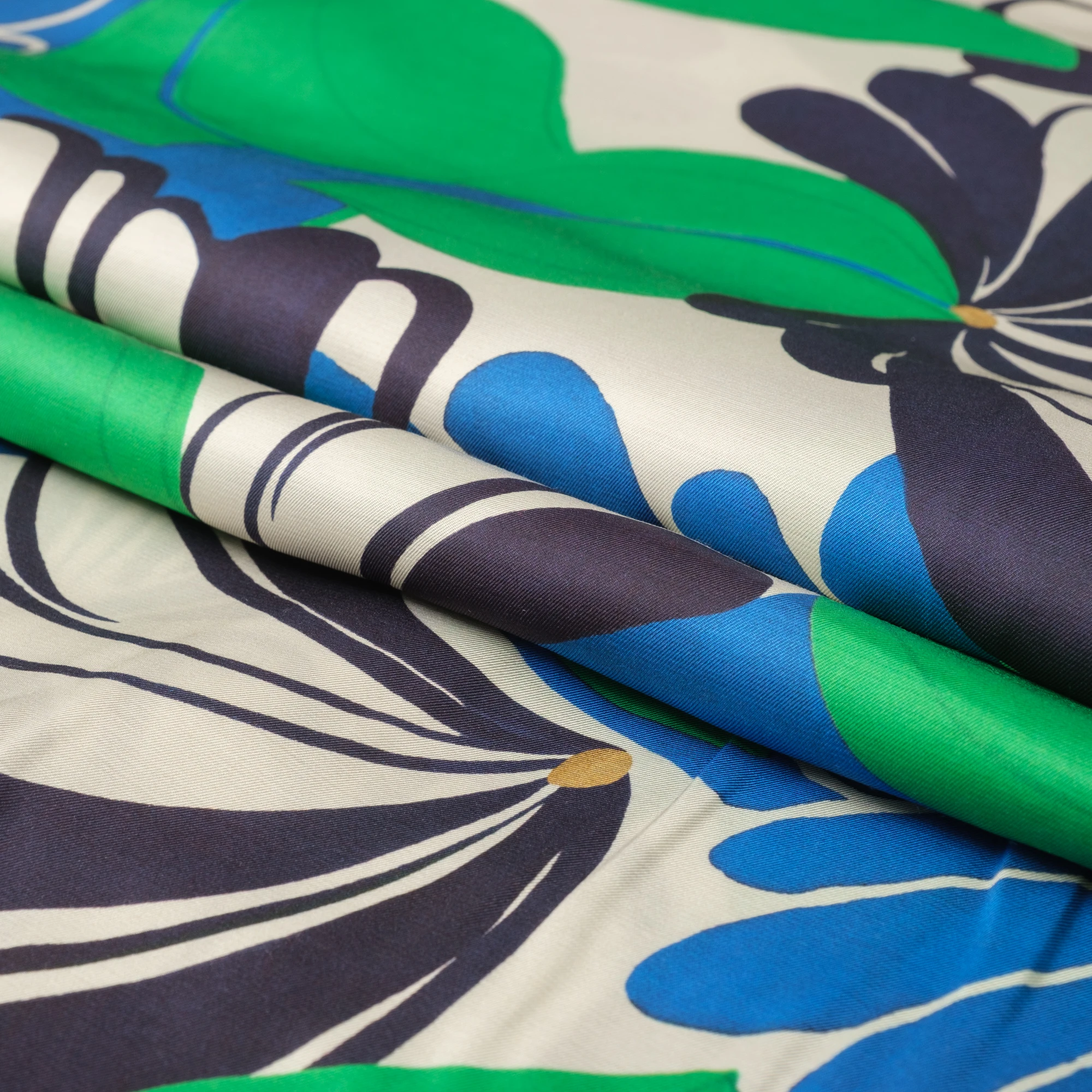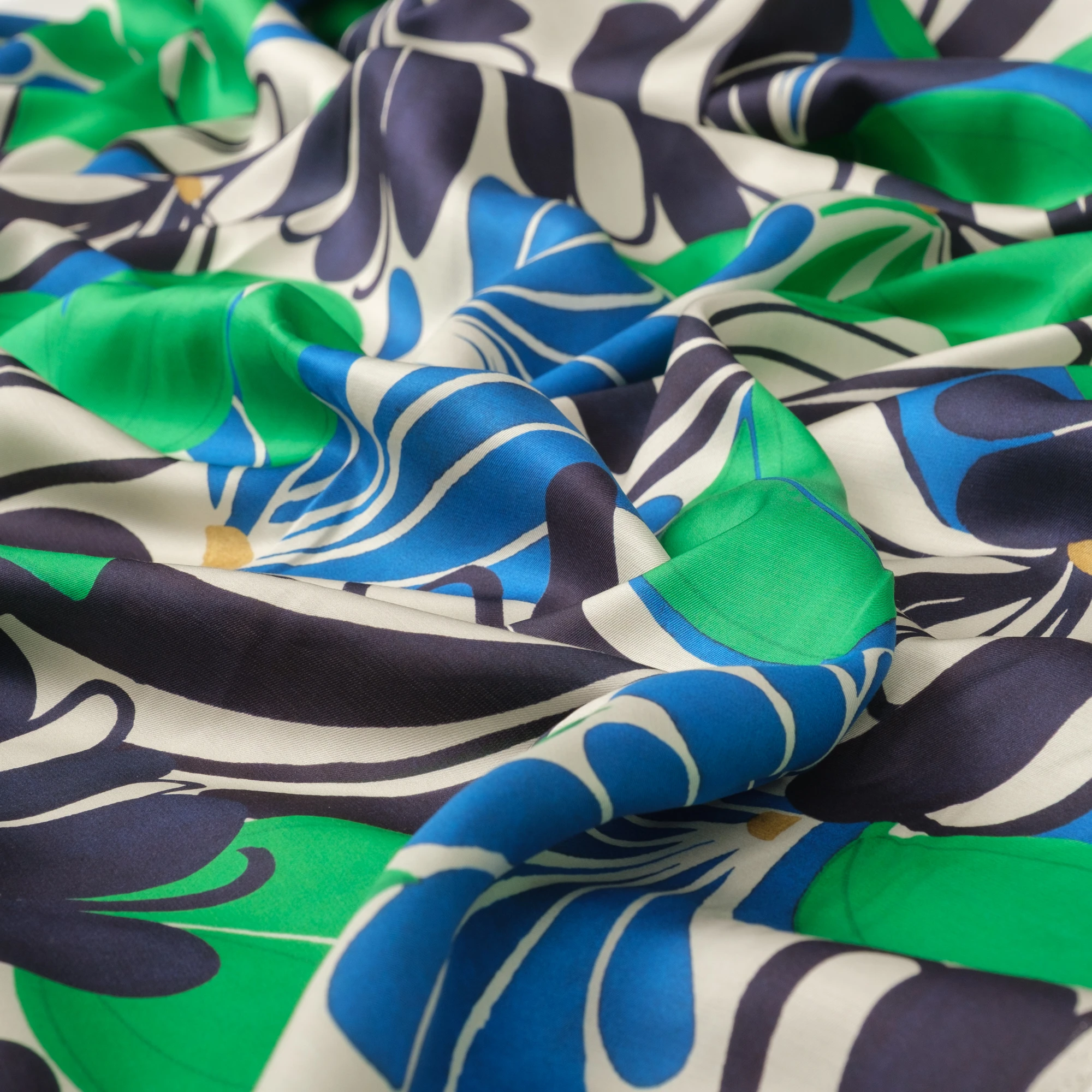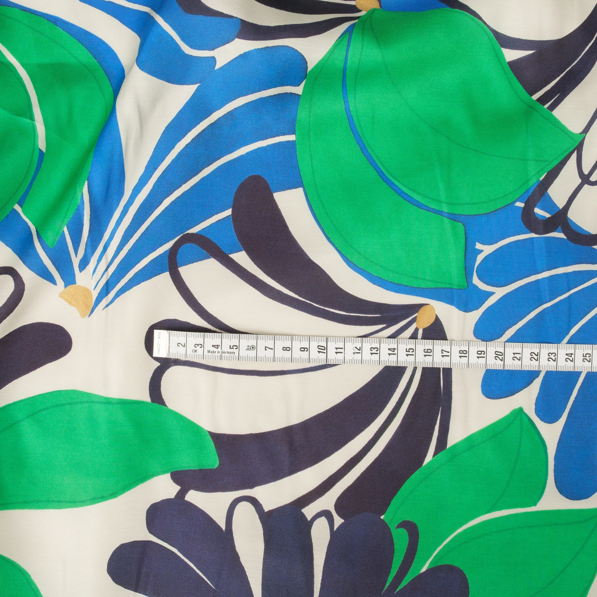 Na jasnym, kremowym tle rozpościera się dynamiczny, roślinny wzór – duże, stylizowane kwiaty i liście w intensywnych odcieniach zieleni, kobaltu i granatu. Kontrastowa kolorystyka nadaje tkaninie nowoczesny, świeży charakter, idealny do wyrazistych projektów.