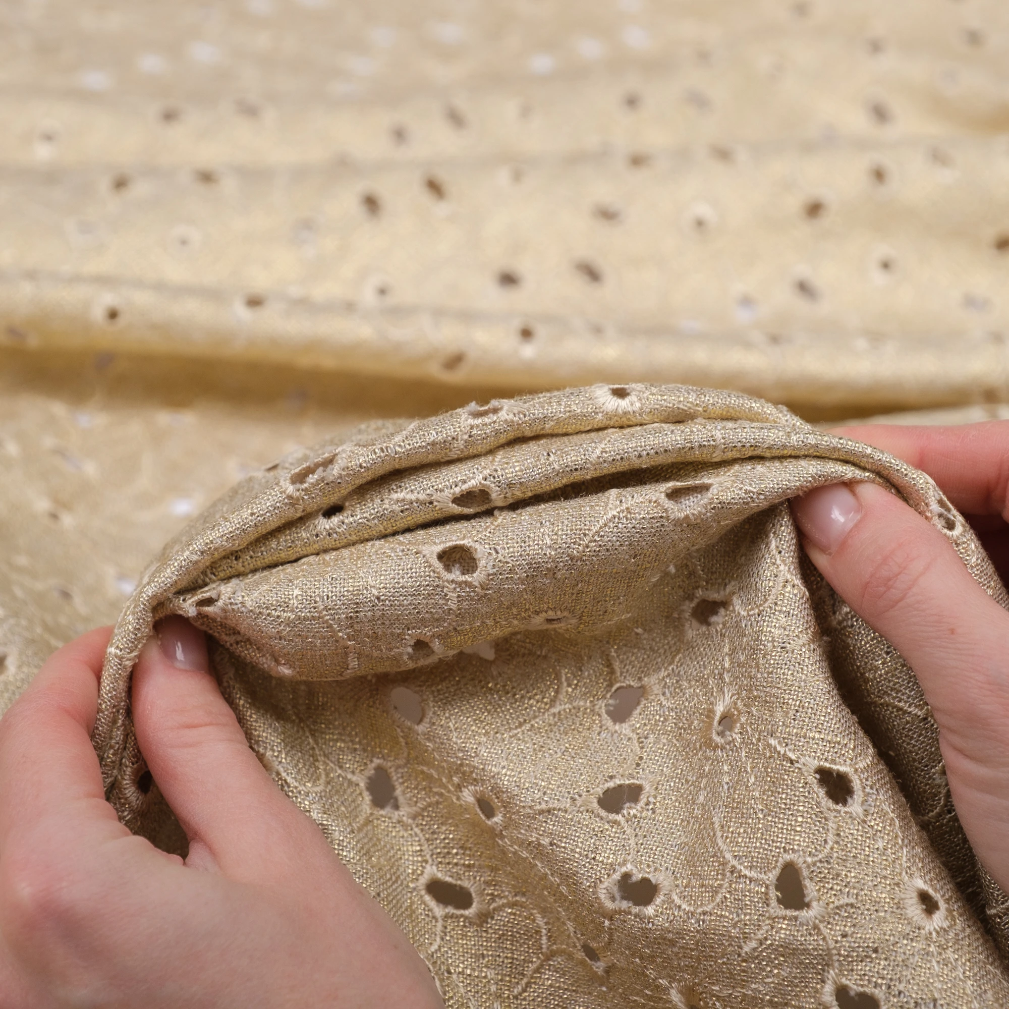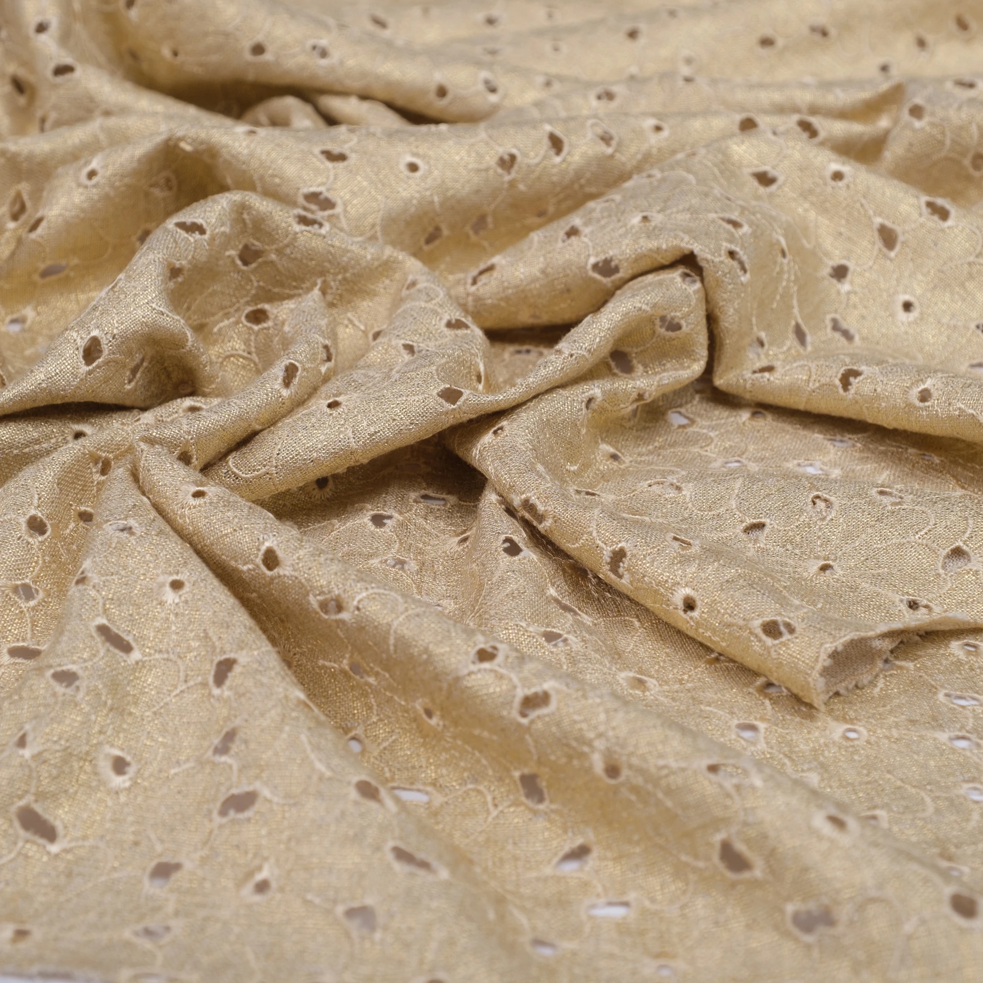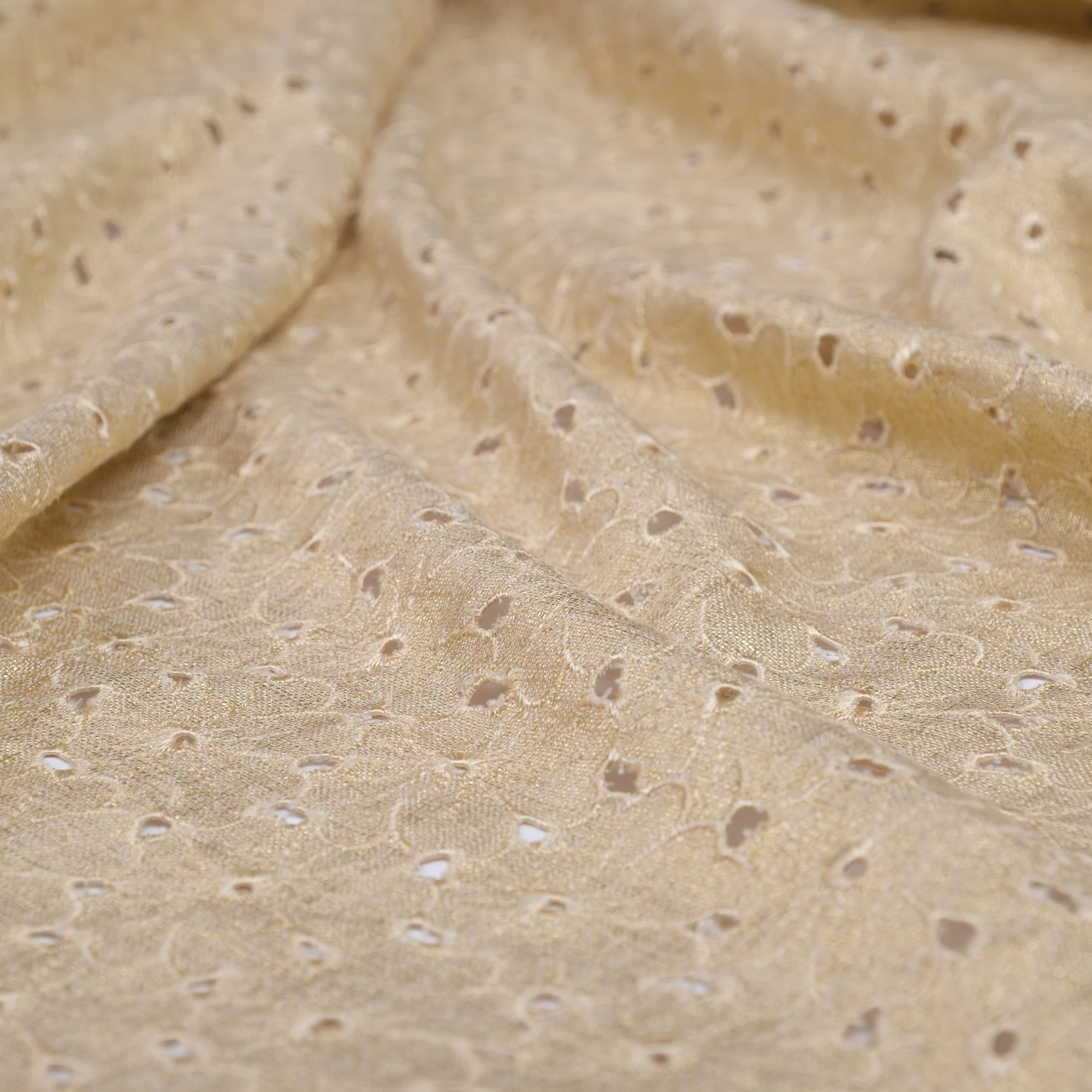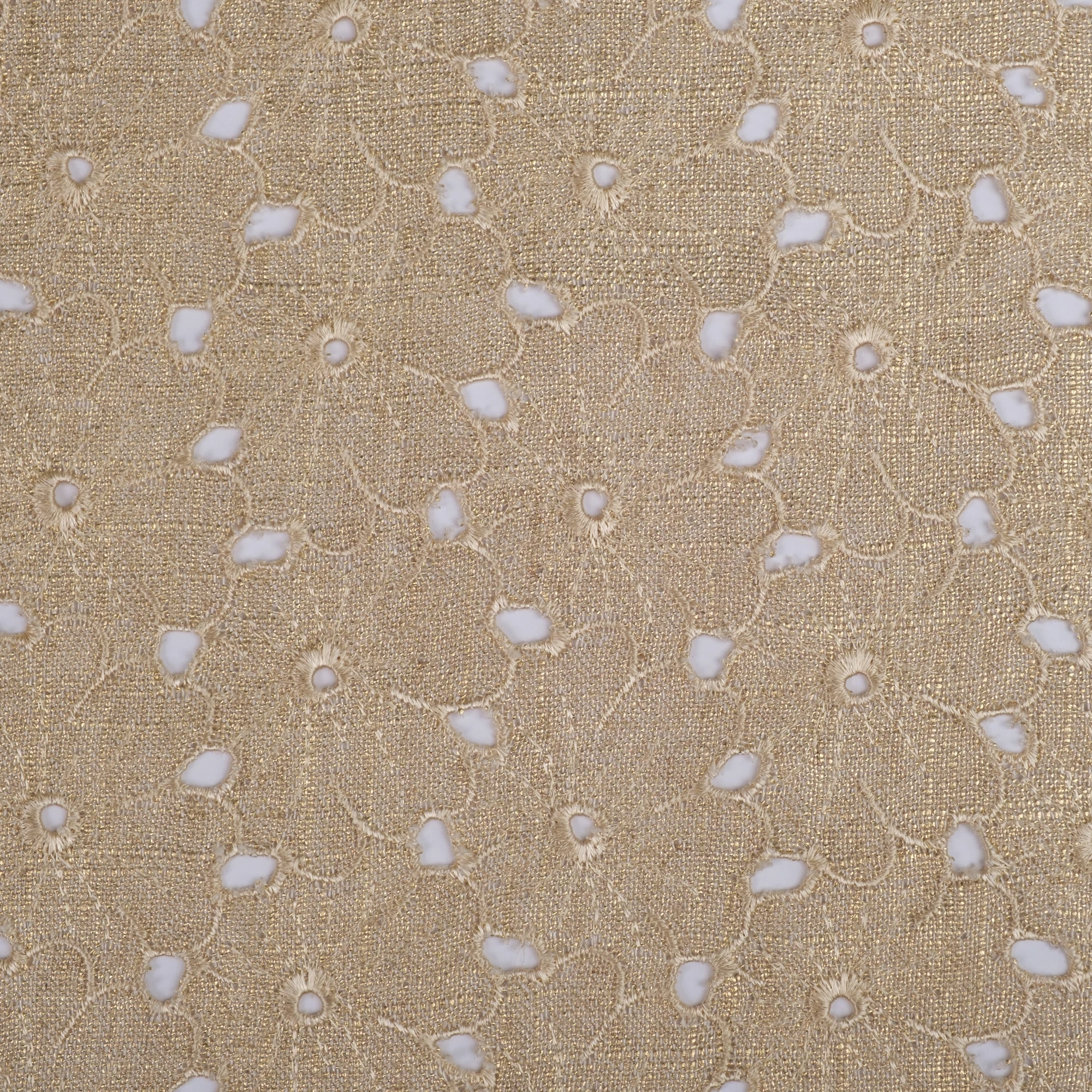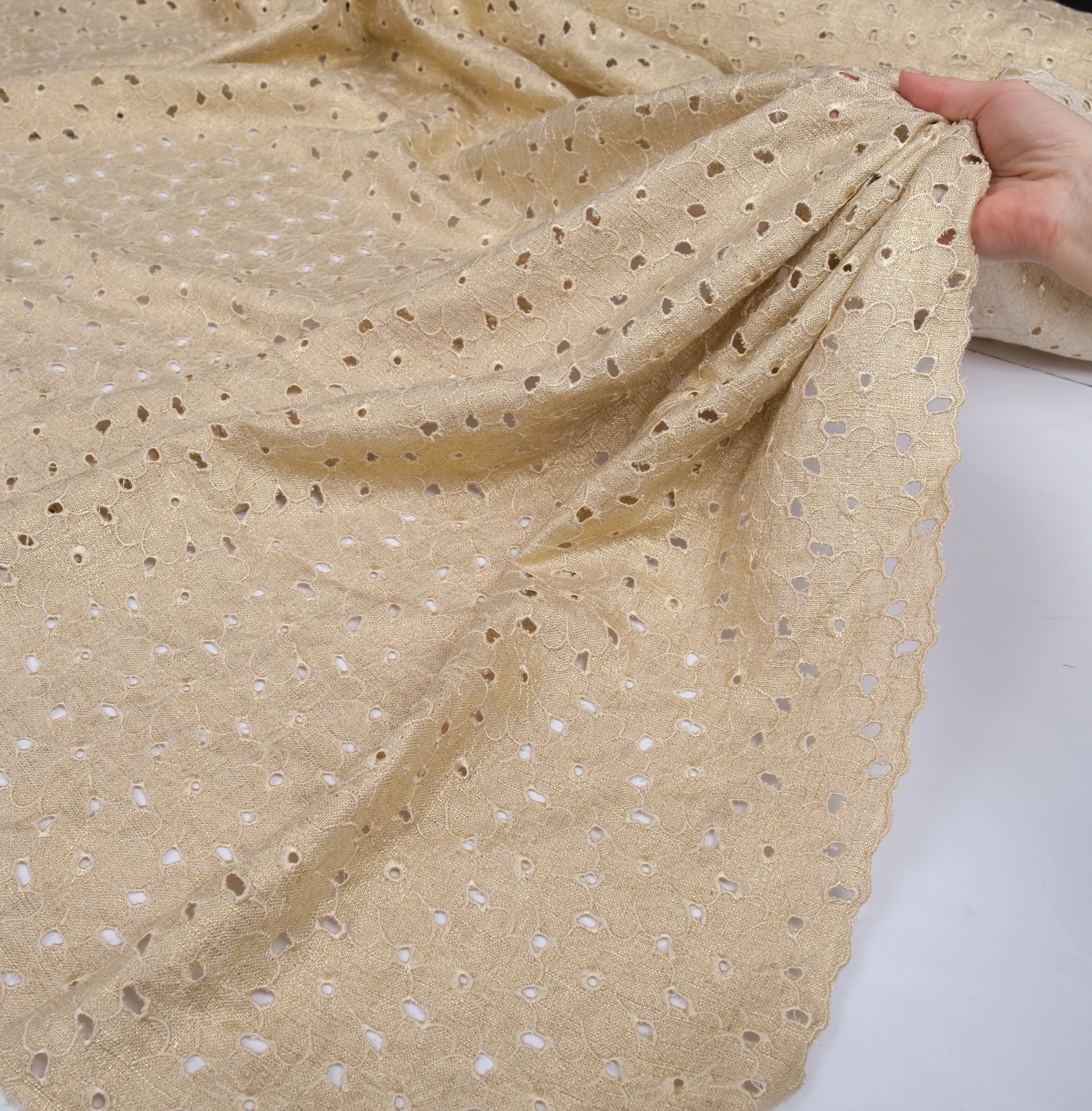 Lekka, naturalna tkanina łącząca przewiewność lnu z miękkością i płynnością wiskozy, wzbogacona o dekoracyjny haft ażurowy oraz subtelne wykończenie laminato. Delikatny, złocisty połysk nadaje materiałowi elegancki, świetlisty charakter i pięknie podkreśla jego strukturę.