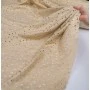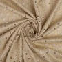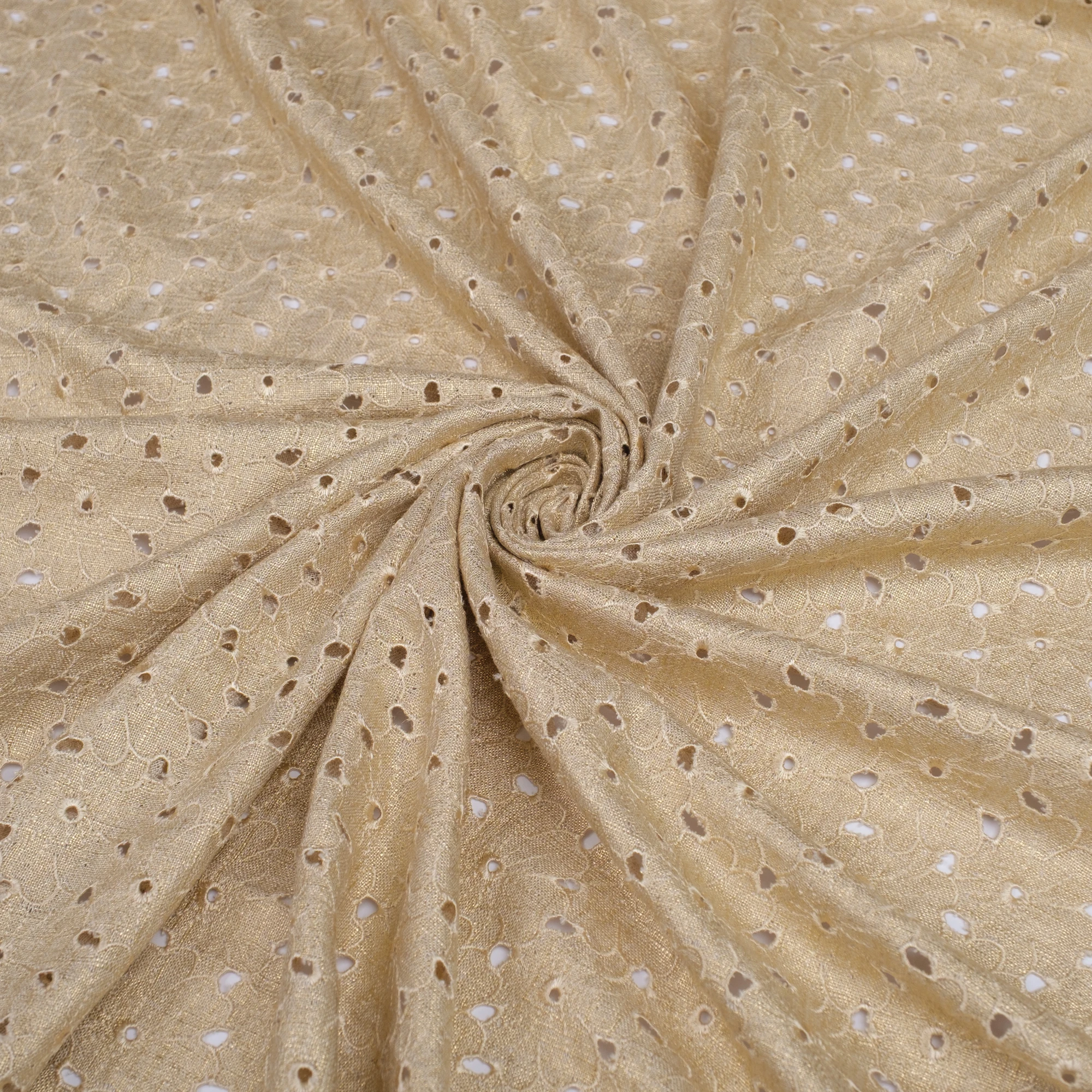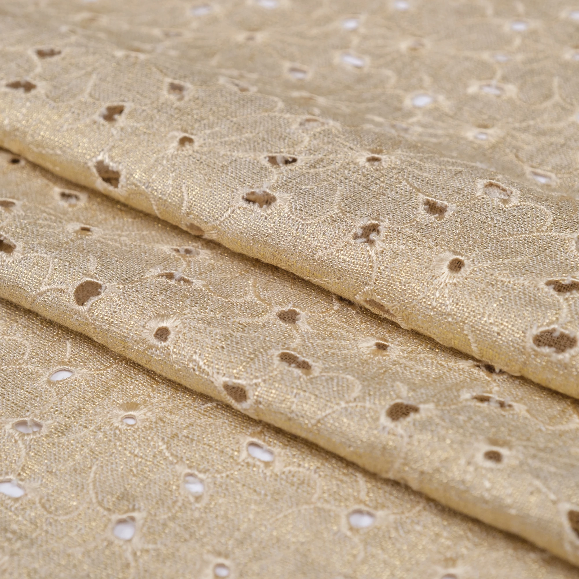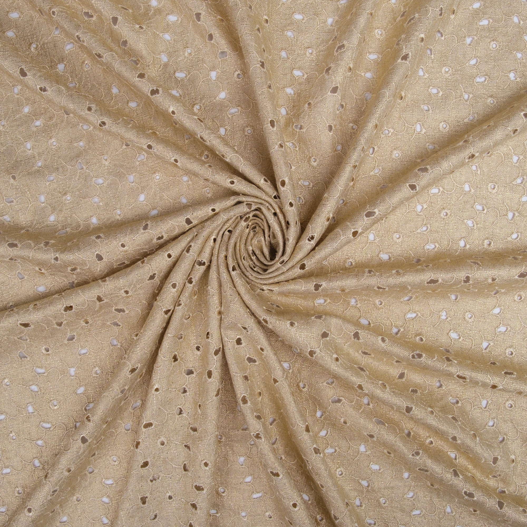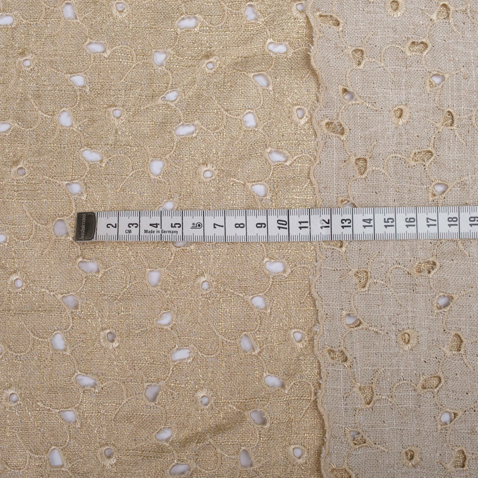 Lekka, naturalna tkanina łącząca przewiewność lnu z miękkością i płynnością wiskozy, wzbogacona o dekoracyjny haft ażurowy oraz subtelne wykończenie laminato. Delikatny, złocisty połysk nadaje materiałowi elegancki, świetlisty charakter i pięknie podkreśla jego strukturę.