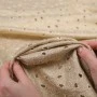 Powierzchnię zdobi drobny, regularny wzór perforacji tworzący efekt koronki, uzupełniony finezyjnym haftem. Całość utrzymana jest w ciepłym, beżowo-złotym odcieniu, który w połączeniu z laminowaniem tworzy wyjątkowo szlachetny, letni look.