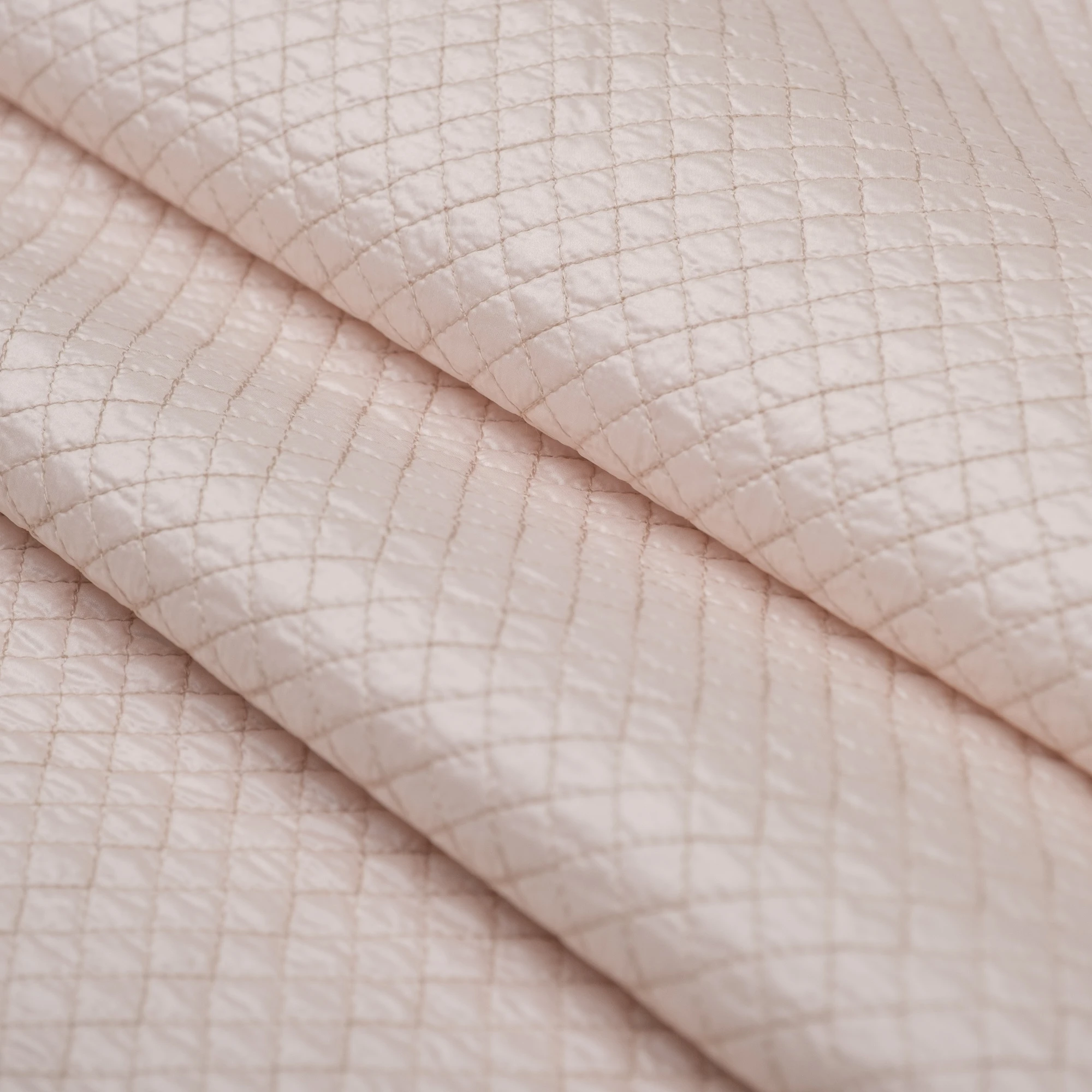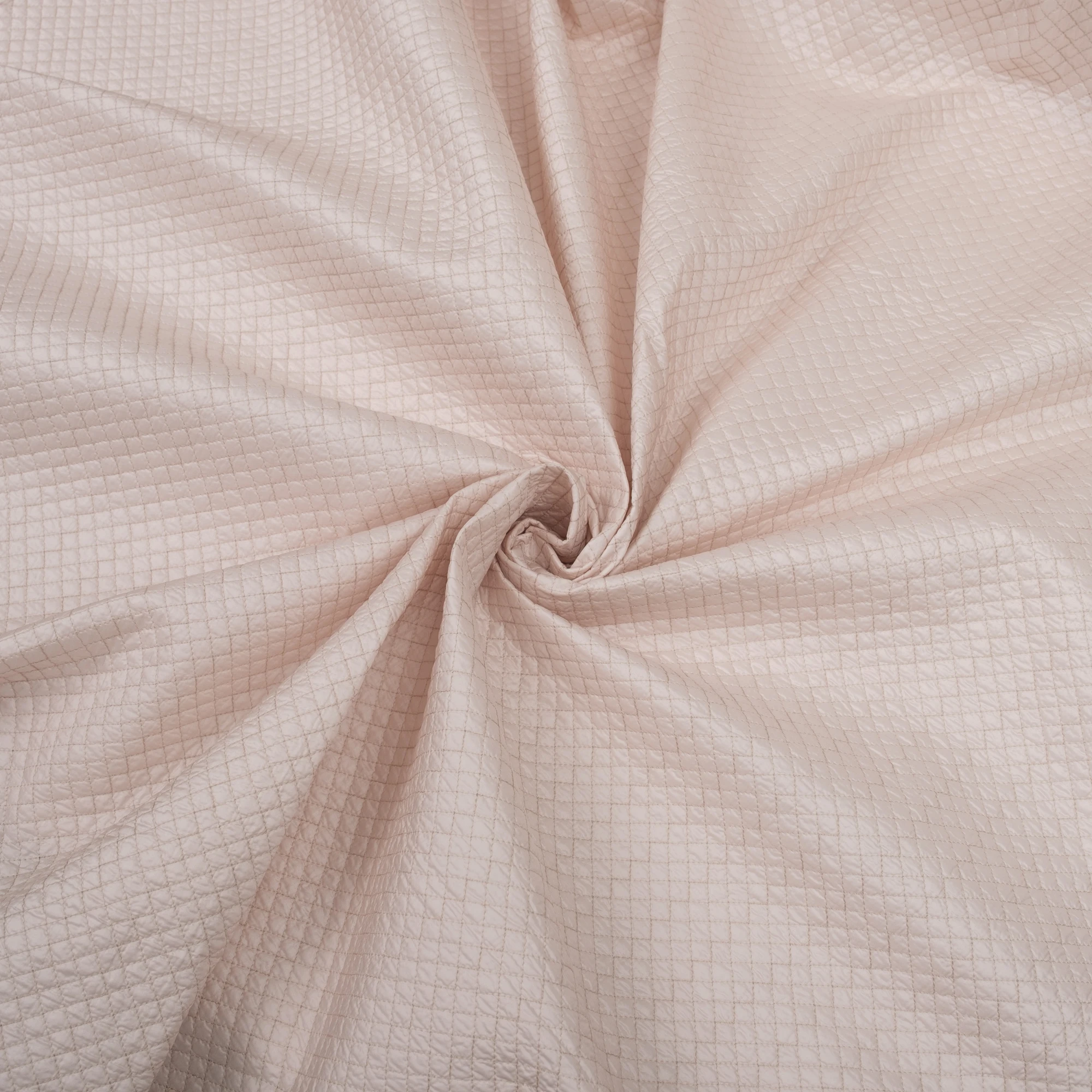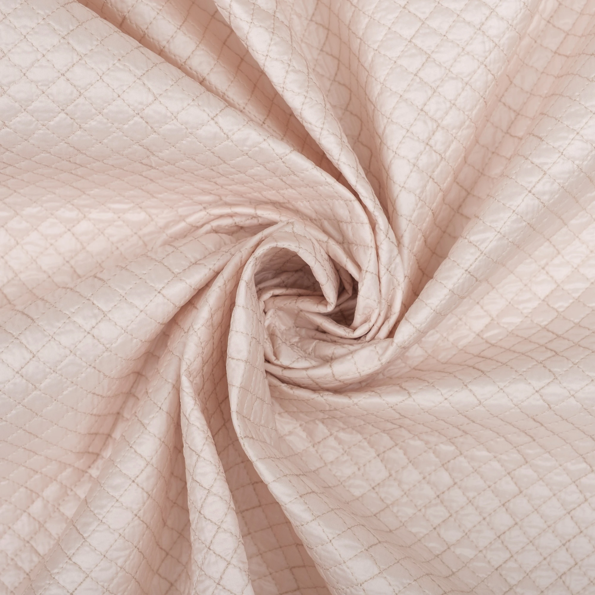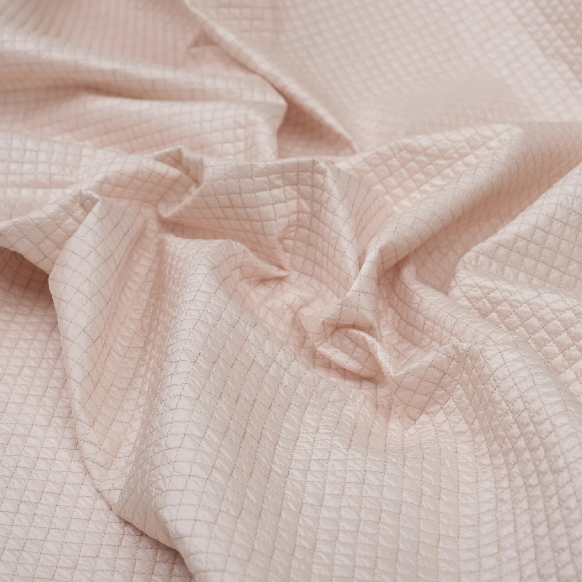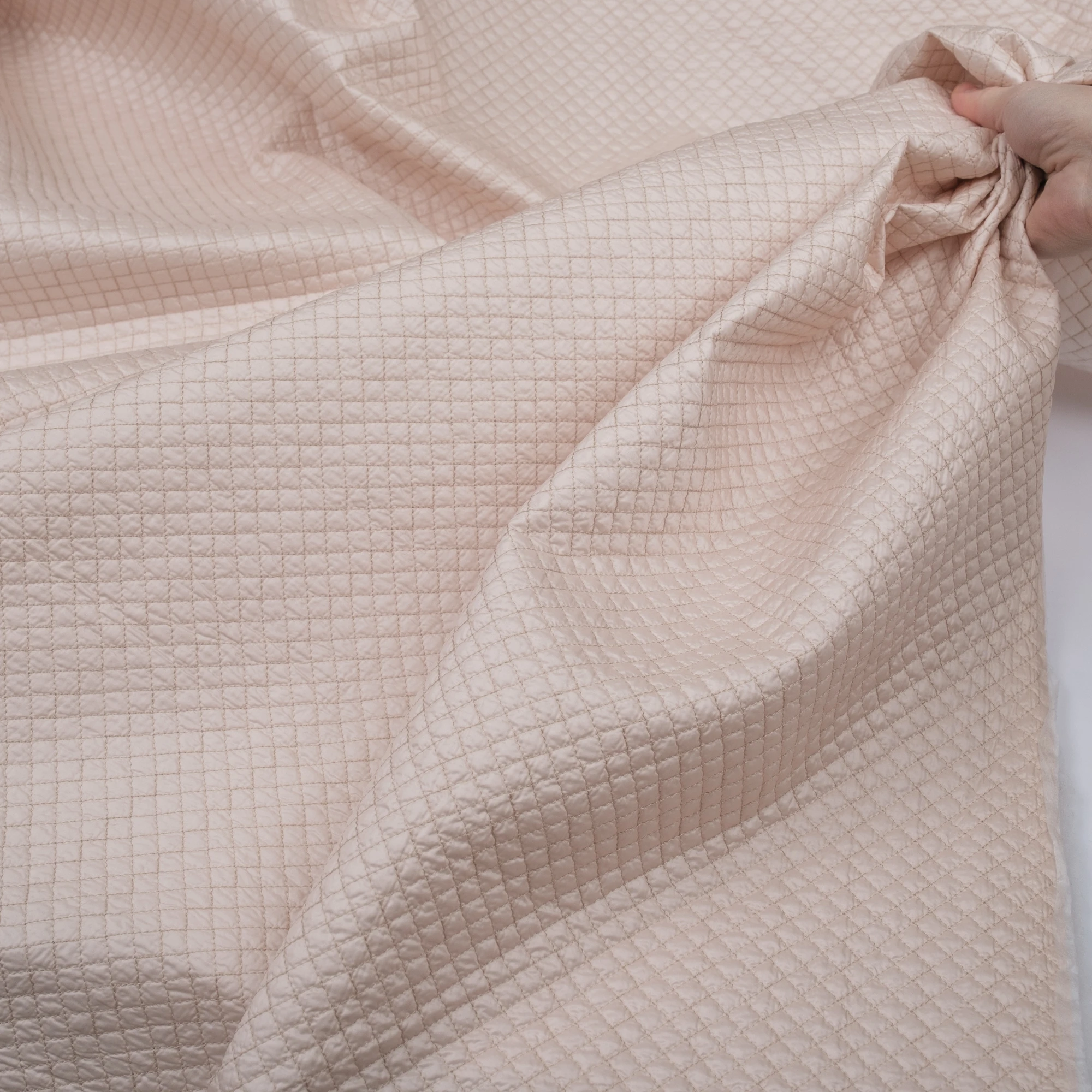 Włoska tkanina pikowana o delikatnej, jasnej kolorystyce i regularnym wzorze rombów, stworzona z myślą o nowoczesnych kurtkach i lekkiej odzieży wierzchniej. Powierzchnia materiału jest miękka i przyjemna w dotyku, a jednocześnie estetyczna i uporządkowana dzięki starannemu pikowaniu.
